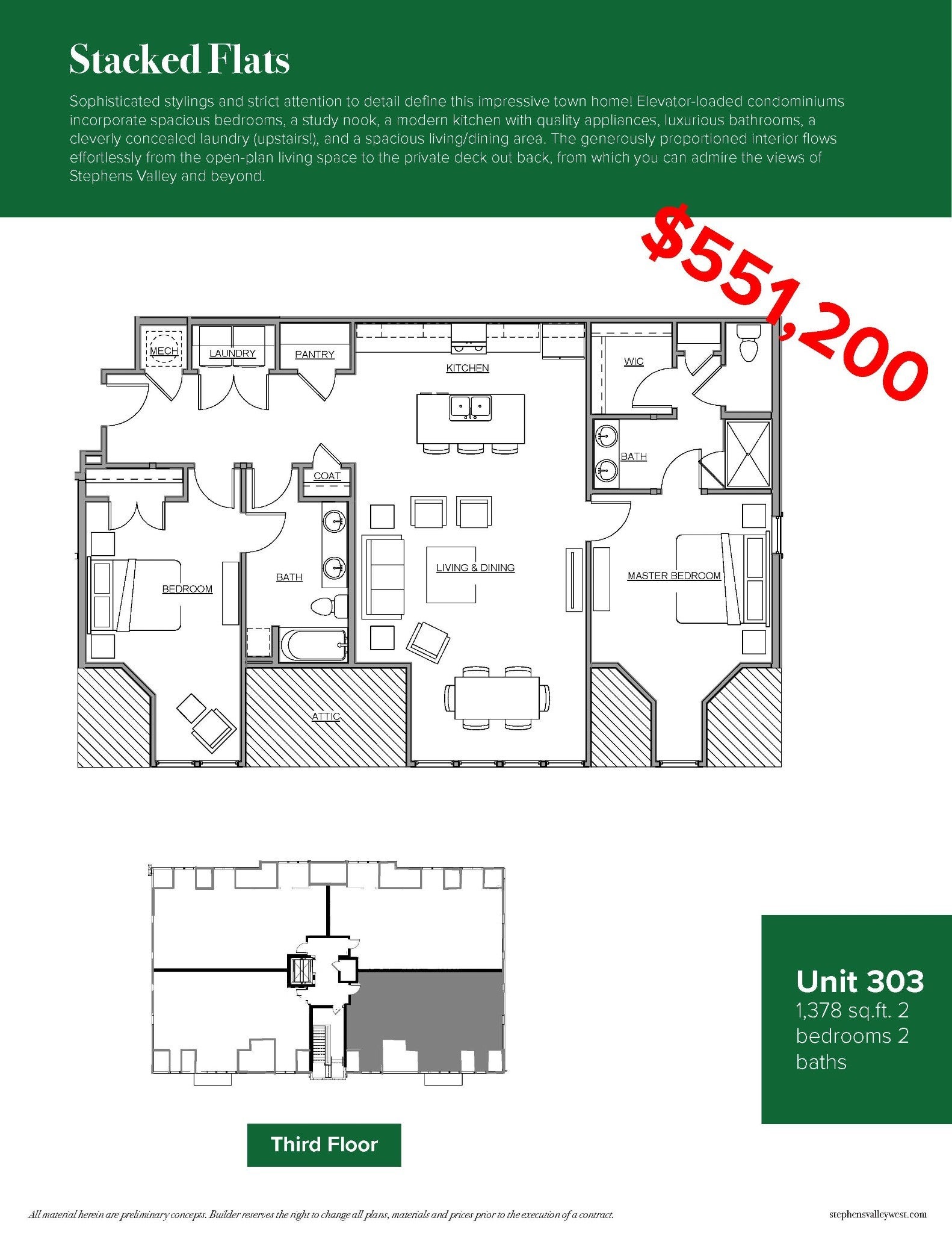 One-level living in desirable Stephens Valley West by Rochford Construction Company! Sophisticated style, smart floor plans, and comfortable living spaces are the foundations of condominium living in this community. Enjoy the beautiful views from your two-bedroom home with details including nine-foot ceilings, custom trim, and plenty of storage in sleek, quality cabinetry.