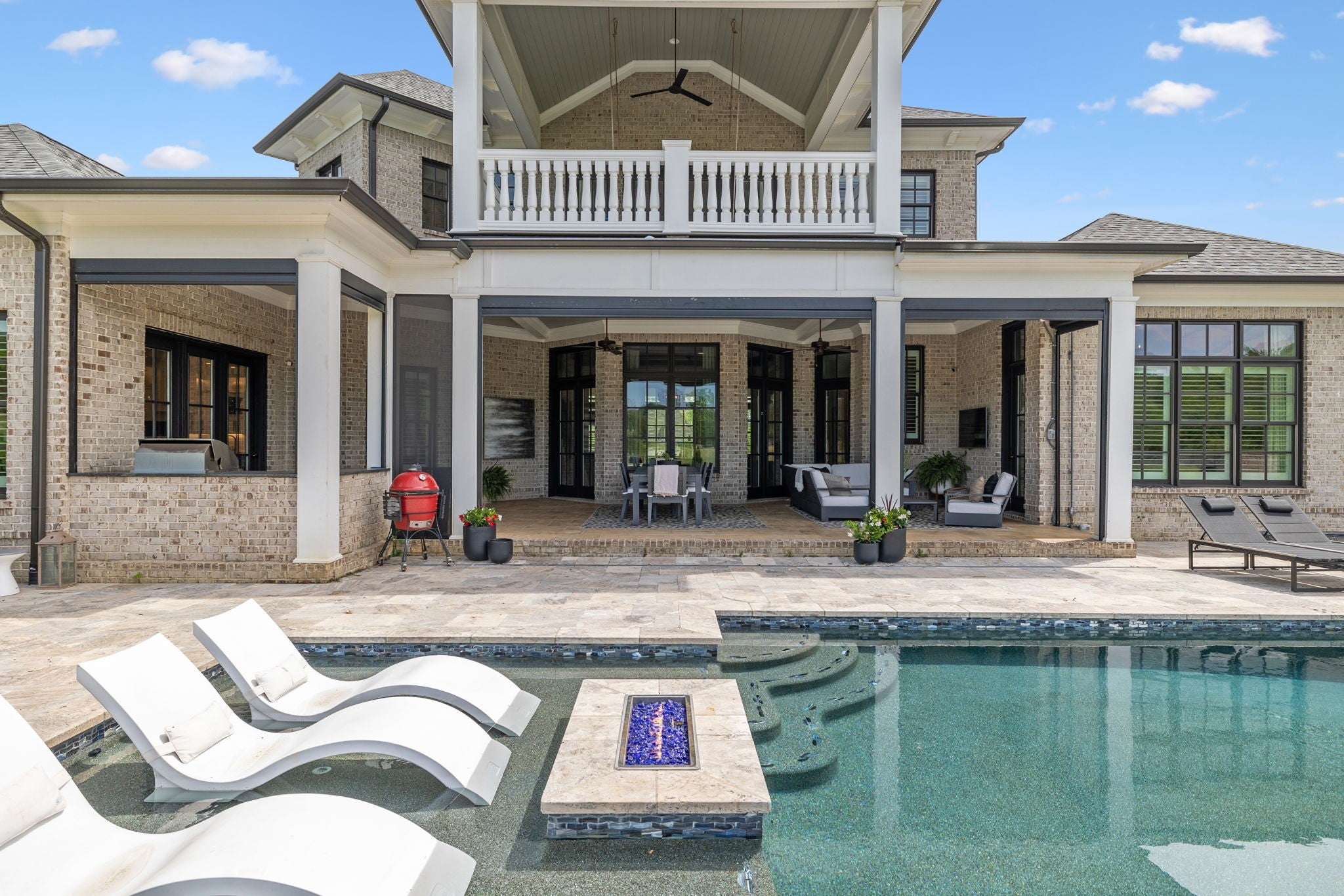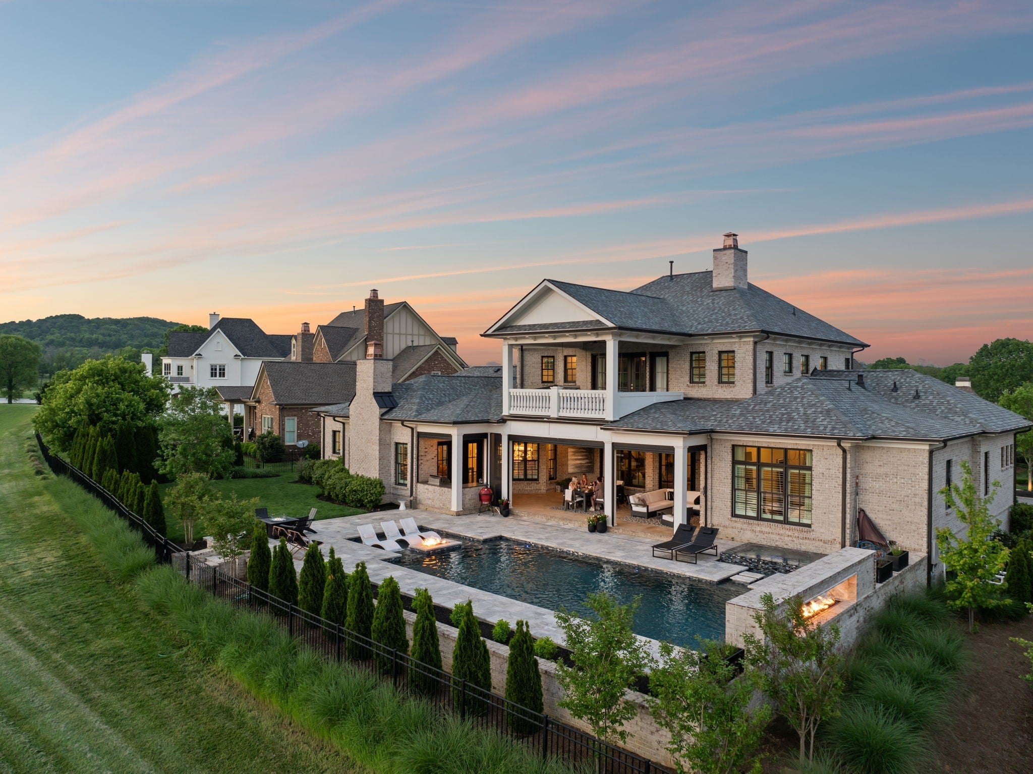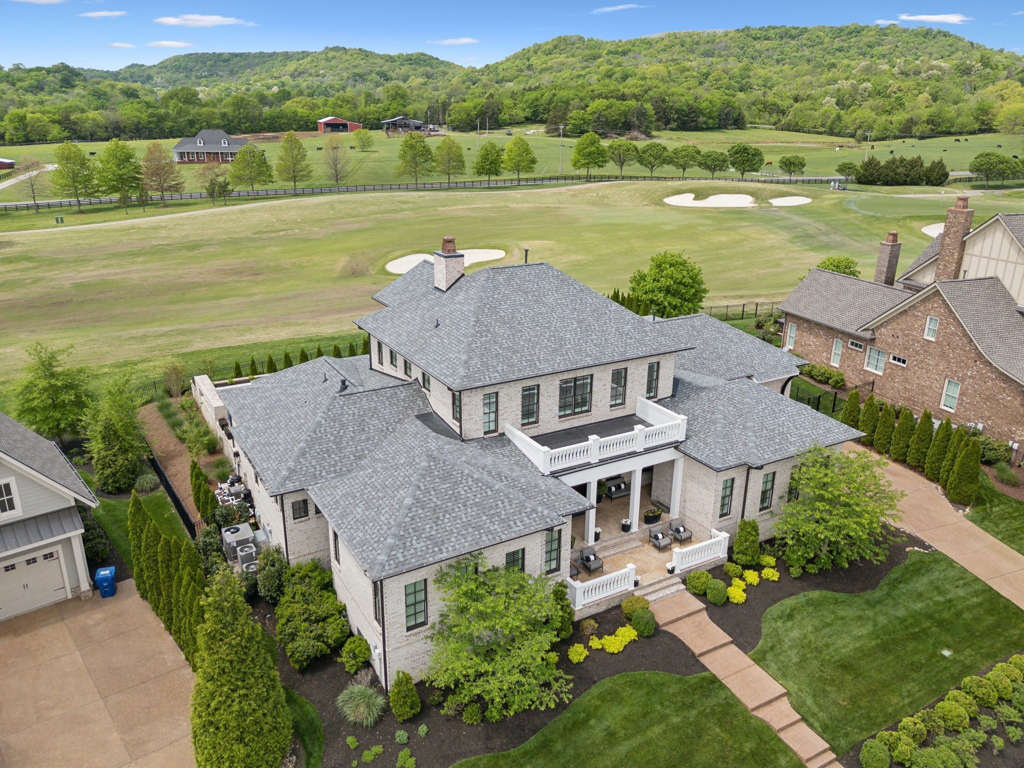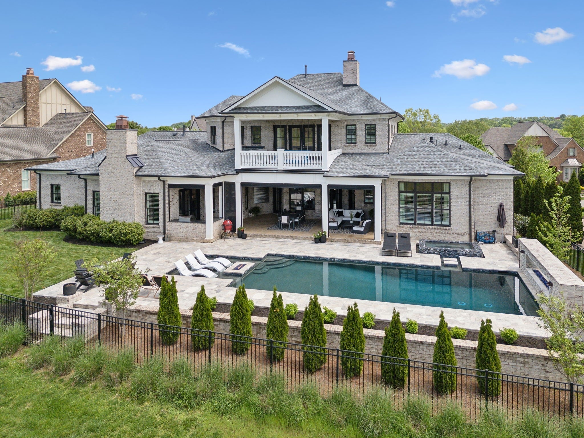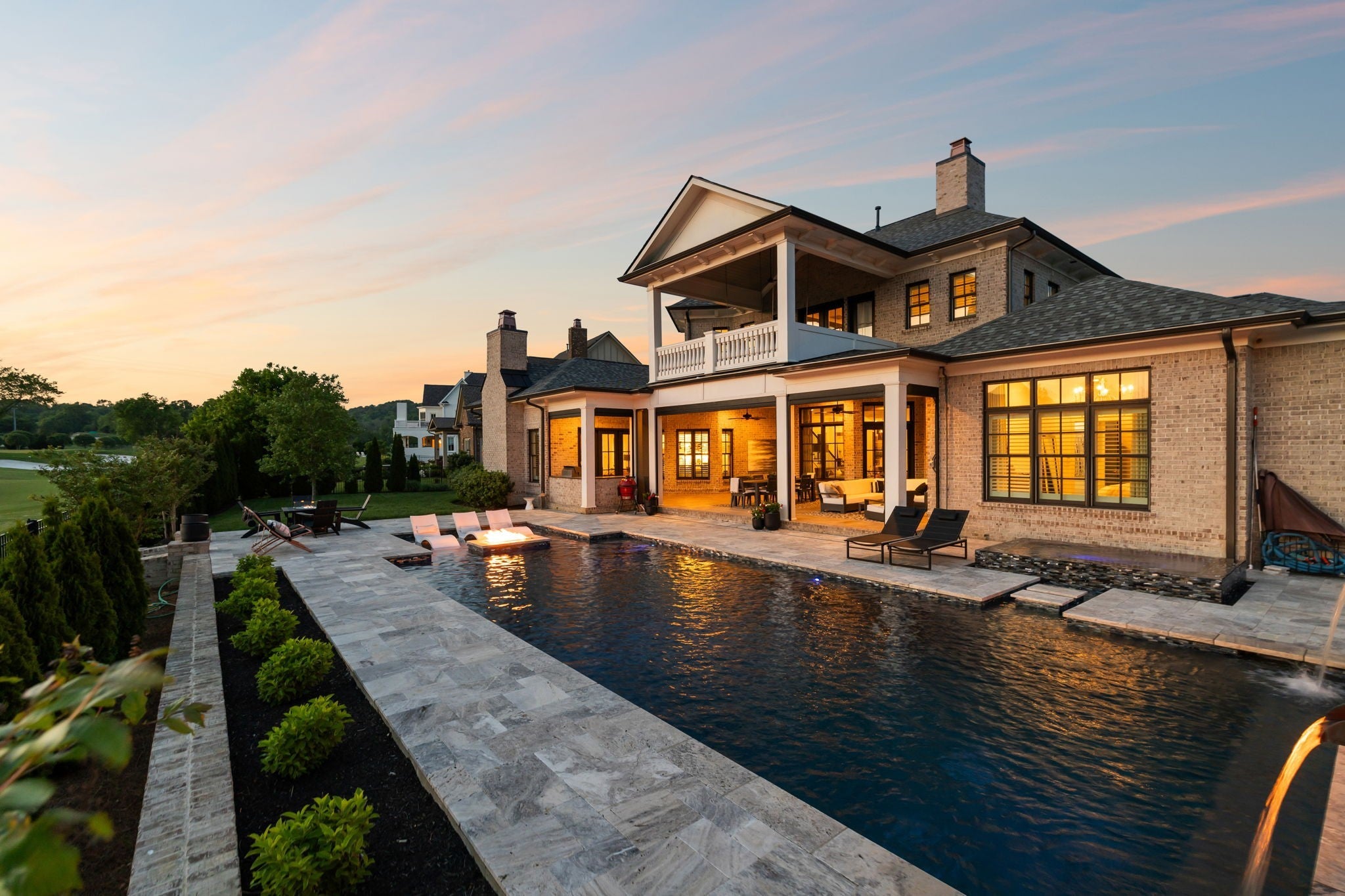 Luxury golf course living in The Grove—Middle Tennessee’s premier gated community offering resort-style amenities including clubhouse, fine dining, spa, pool, fitness center, and championship golf. This custom all-brick home for sale in The Grove College Grove TN sits on fairway #2 and showcases timeless design, modern luxury, and breathtaking views. Step inside to an open-concept living room with floor-to-ceiling tile fireplace, gas logs, and expansive golf course views. The gourmet chef’s kitchen is a centerpiece, boasting a quartz waterfall island, stainless steel appliances, ceiling-height custom cabinetry, pot filler, under-cabinet lighting, and hidden walk-in pantry. A second living area with wood-accented tray ceiling flows into a designer wet bar with wine display and dual beverage coolers—ideal for entertaining. The main level also features a formal dining room with butler’s pantry, private office with custom built-ins, spacious laundry room with island, and drop zone. The primary suite retreat overlooks the golf course with white brick accents, spa-inspired bath, soaking tub, dual vanities, and oversized dual-entry shower. Two additional en-suite bedrooms plus a powder room complete the main floor. Upstairs offers a fourth bedroom with full bath, flex office space, and large rec room with wet bar opening to a private balcony with hanging daybed and golf course views. Enjoy resort-style outdoor living with a screened porch featuring retractable screens, built-in outdoor kitchen, pool with sun shelf, tiled spa, fire pit, and lush fenced yard.
