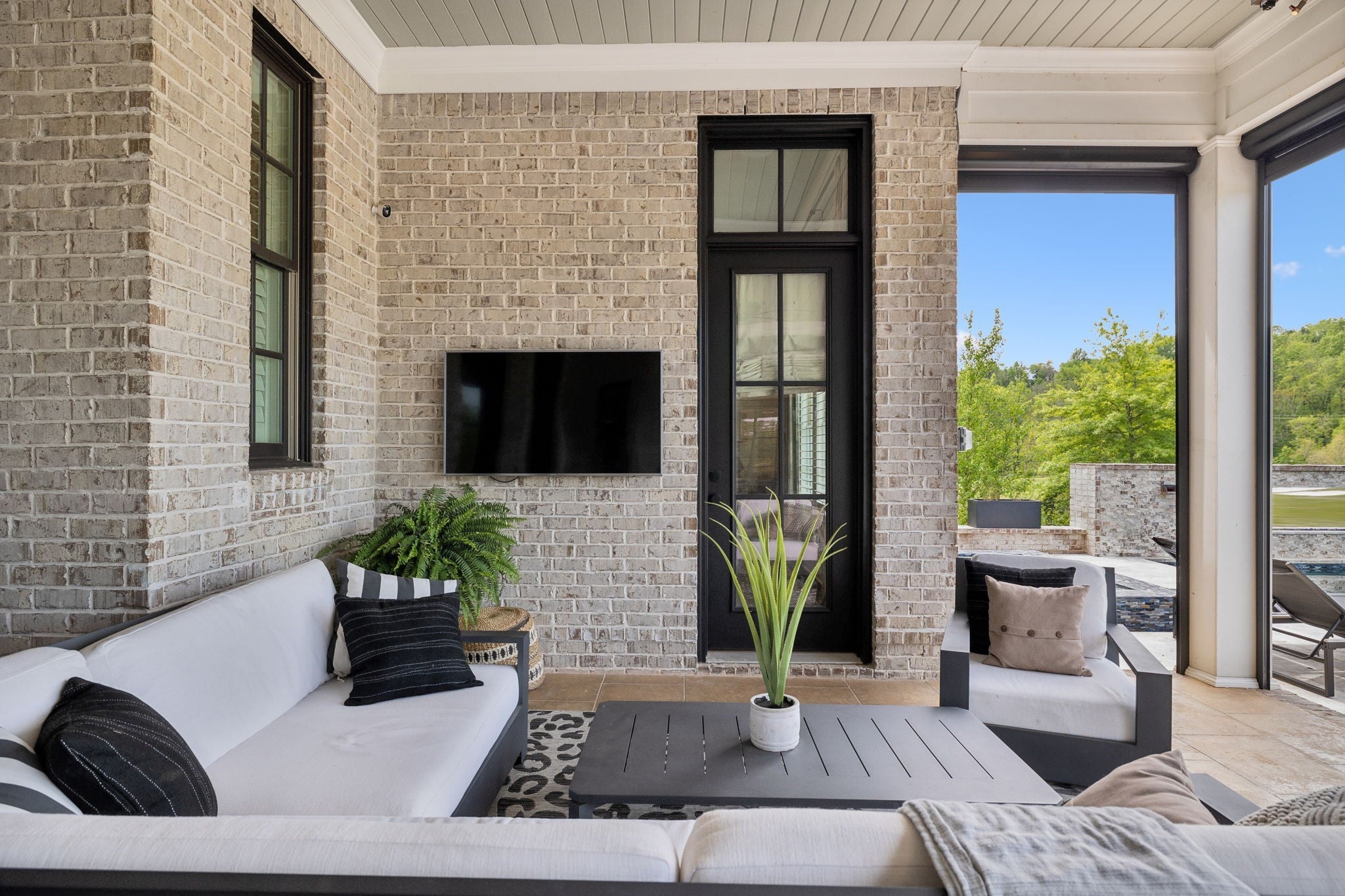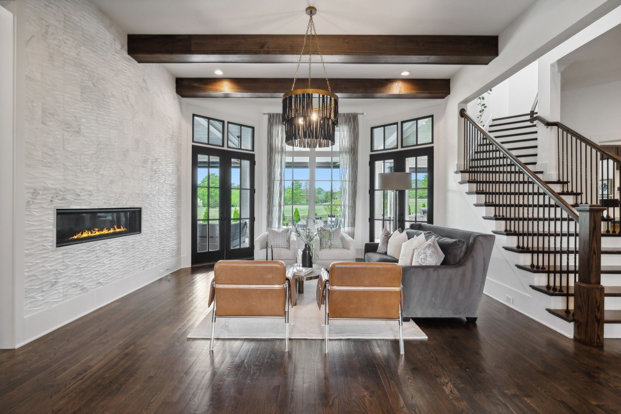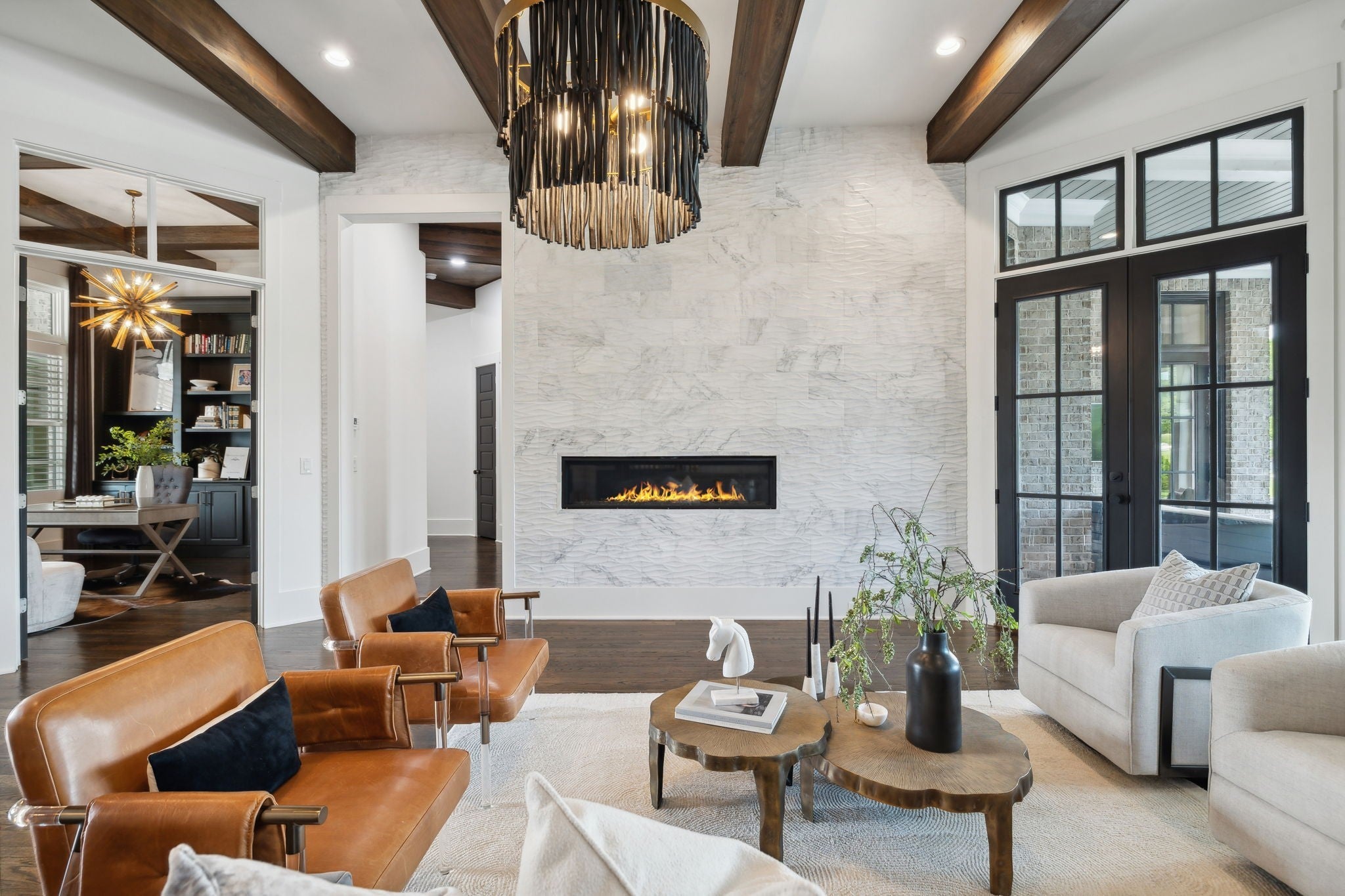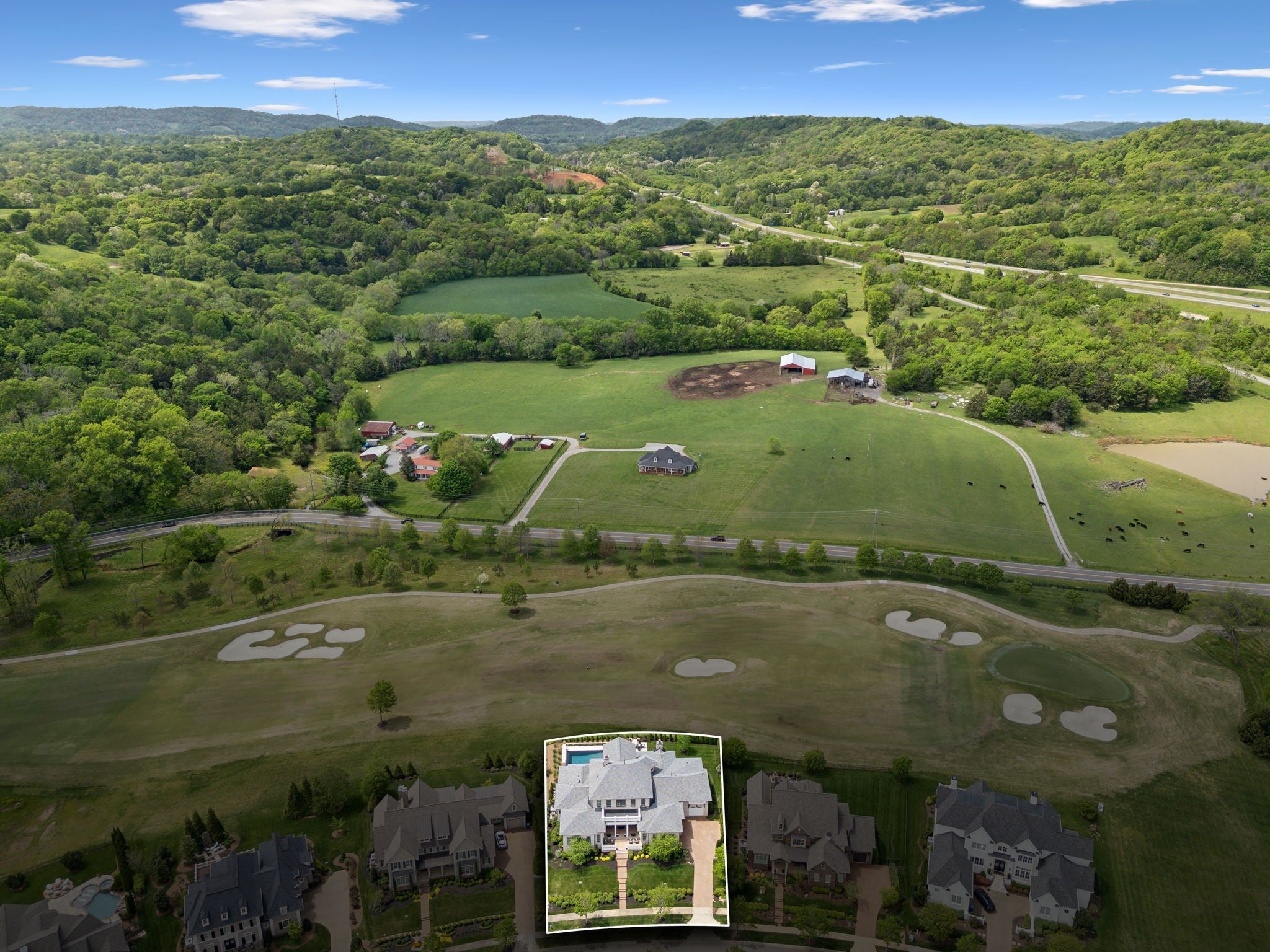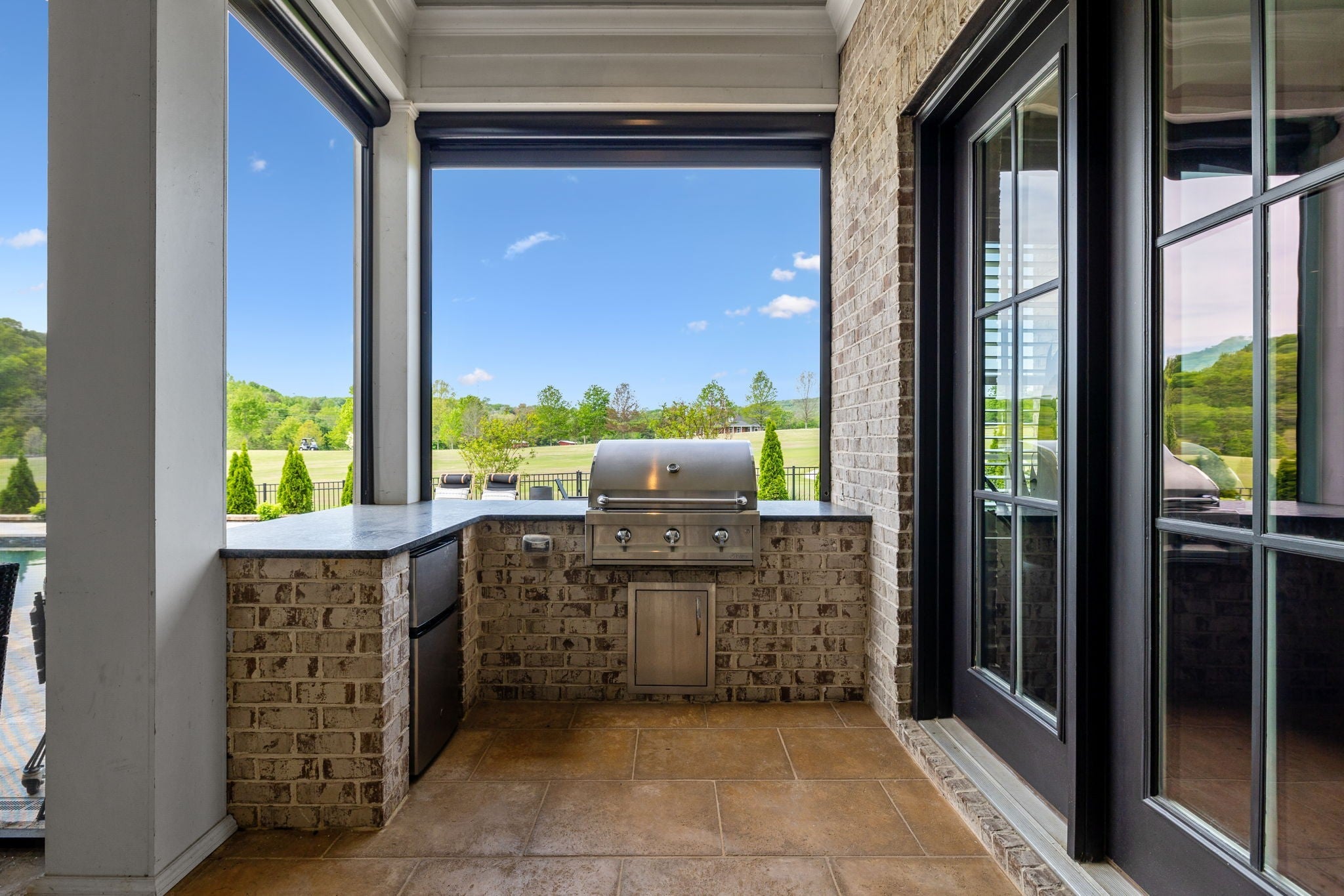 Luxury golf course living in The Grove—Middle Tennessee’s premier gated community offering resort-style amenities including clubhouse, fine dining, spa, pool, fitness center, and championship golf. This custom all-brick home for sale in The Grove College Grove TN sits on fairway #2 and showcases timeless design, modern luxury, and breathtaking views. Step inside to an open-concept living room with floor-to-ceiling tile fireplace, gas logs, and expansive golf course views. The gourmet chef’s kitchen is a centerpiece, boasting a quartz waterfall island, stainless steel appliances, ceiling-height custom cabinetry, pot filler, under-cabinet lighting, and hidden walk-in pantry. A second living area with wood-accented tray ceiling flows into a designer wet bar with wine display and dual beverage coolers—ideal for entertaining. The main level also features a formal dining room with butler’s pantry, private office with custom built-ins, spacious laundry room with island, and drop zone. The primary suite retreat overlooks the golf course with white brick accents, spa-inspired bath, soaking tub, dual vanities, and oversized dual-entry shower. Two additional en-suite bedrooms plus a powder room complete the main floor. Upstairs offers a fourth bedroom with full bath, flex office space, and large rec room with wet bar opening to a private balcony with hanging daybed and golf course views. Enjoy resort-style outdoor living with a screened porch featuring retractable screens, built-in outdoor kitchen, pool with sun shelf, tiled spa, fire pit, and lush fenced yard.