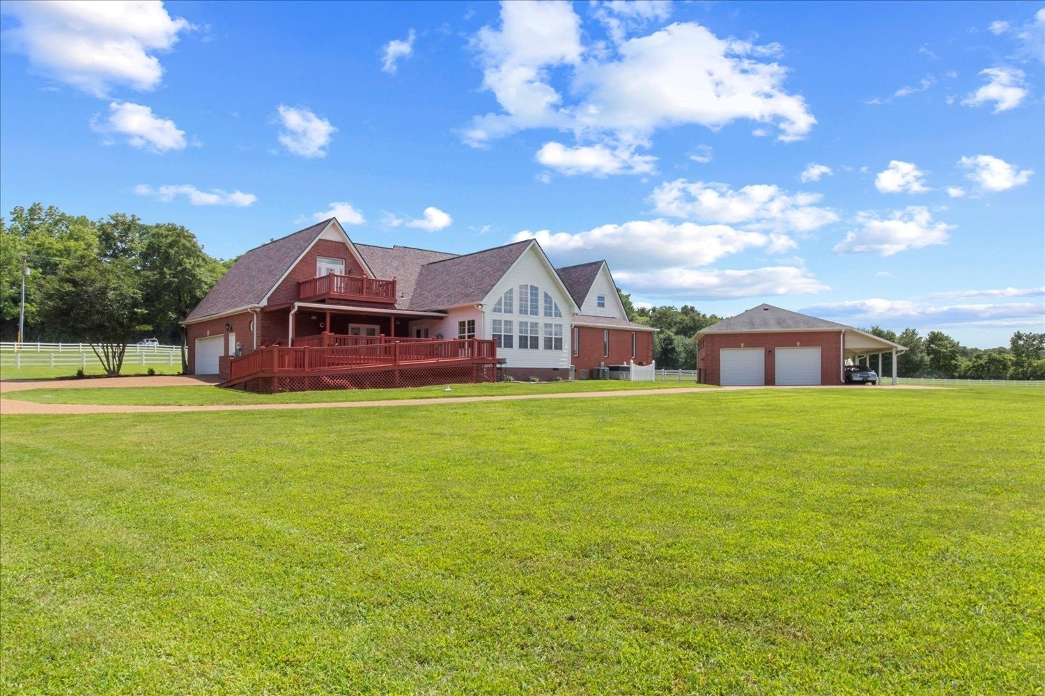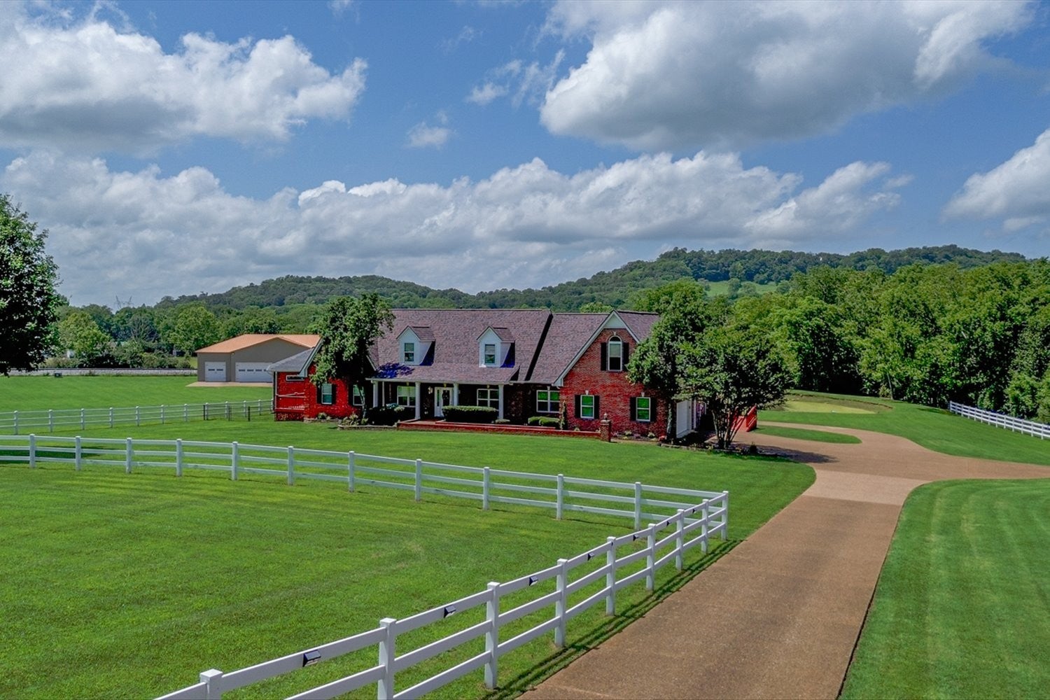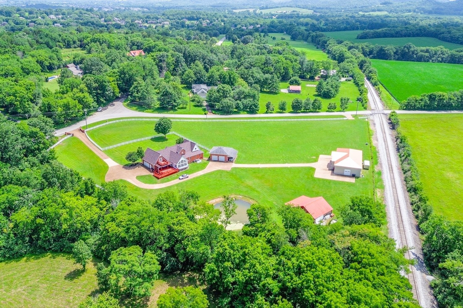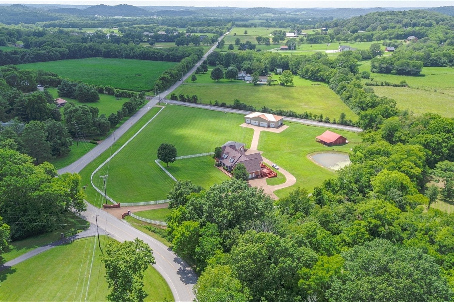 Stunning 5.75-acre estate just minutes from Historic Downtown Franklin. This 5,313 sq. ft. all-brick home offers 4 bedrooms, 3.5 baths, and two primary suites for multi-generational living. The remodeled first-floor primary bath features dual vanities and a custom tile shower. Gourmet kitchen with cherry cabinetry, granite, stainless appliances, and walk-in pantry opens to a sunroom with countryside views. Outdoor living includes tiered decks, a pond, and fenced pastures. Car enthusiasts will love the 3,400 sq. ft. climate-controlled garage/man cave with car lift, full bath, plus a 3-car detached garage and 2-car attached garage. Two-stall barn with tack room and hay loft. Recent updates: roof (2022), tankless water heater, hardwoods, built-ins, and EV supercharger.