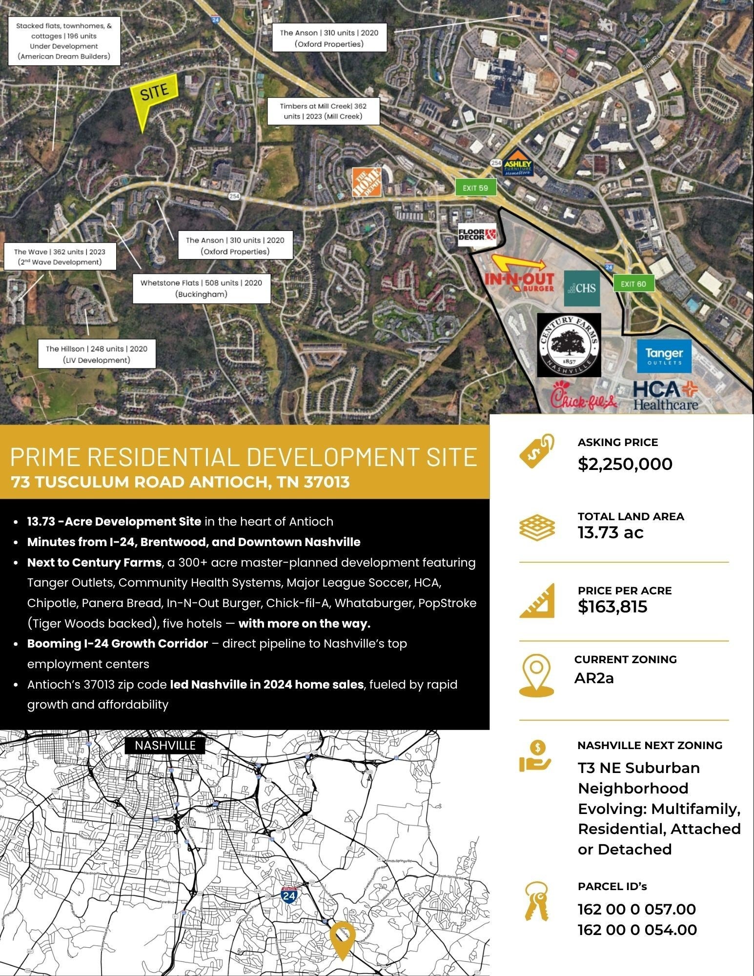 Prime +/-13.735 acre residential development opportunity in the heart of Antioch, just minutes from I-24, Brentwood, and Downtown Nashville. Situated next to Century Farms—a transformative 300+ acre master-planned development featuring Tanger Outlets, Community Health Systems, Major League Soccer, HCA, Chipotle, Panera Bread, In-N-Out Burger, Chick-fil-A, Whataburger, PopStroke (Tiger Woods backed), five hotels, and more on the way. Located in the booming I-24 growth corridor, this site offers direct access to Nashville’s major employment centers. Antioch’s 37013 zip code led all of Nashville in home sales in 2024, driven by rapid population growth and continued housing demand. (Two Parcel's ID#'s: 162 00 0 057.00 & 162 00 0 054.00).