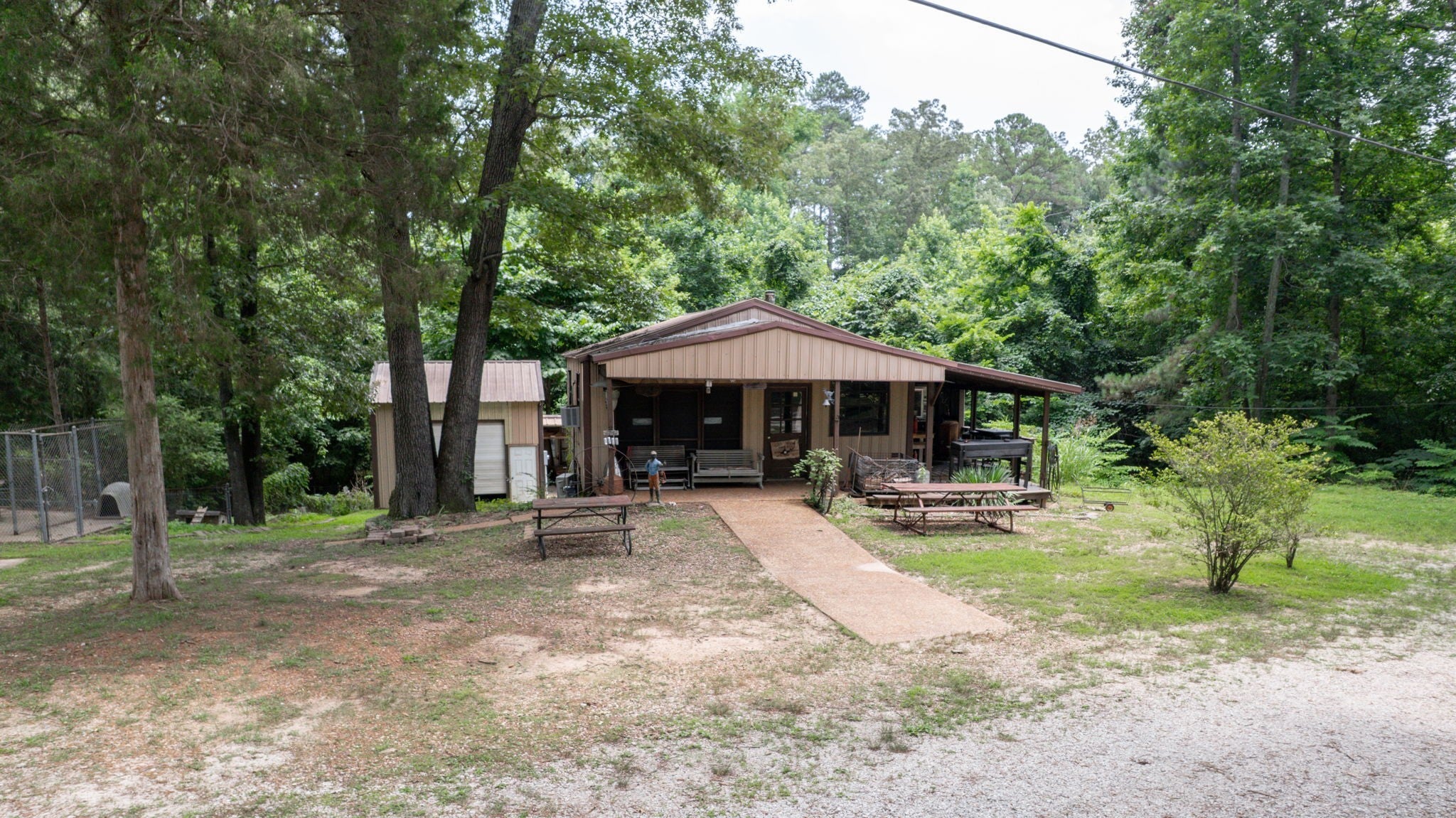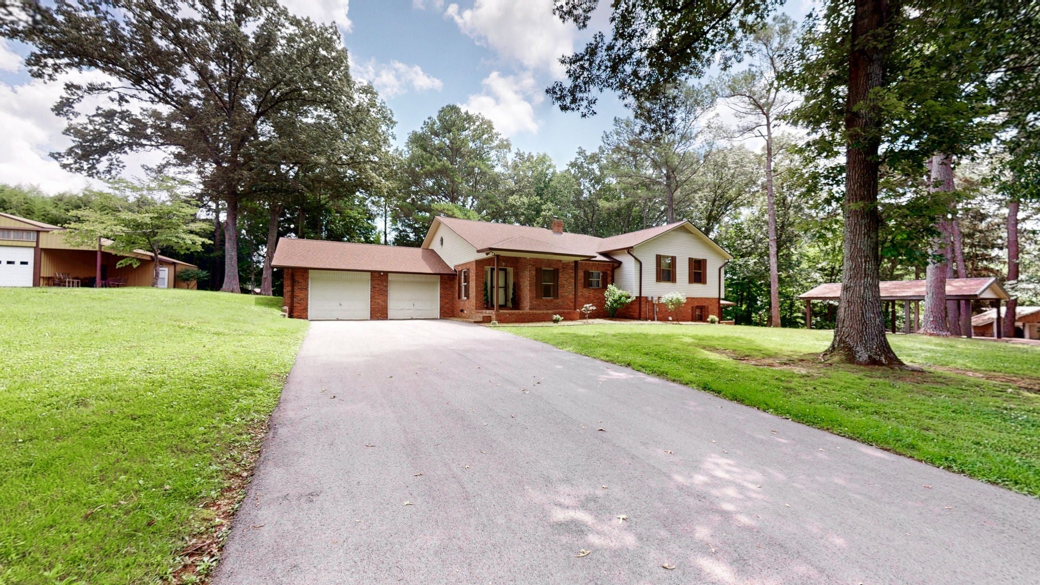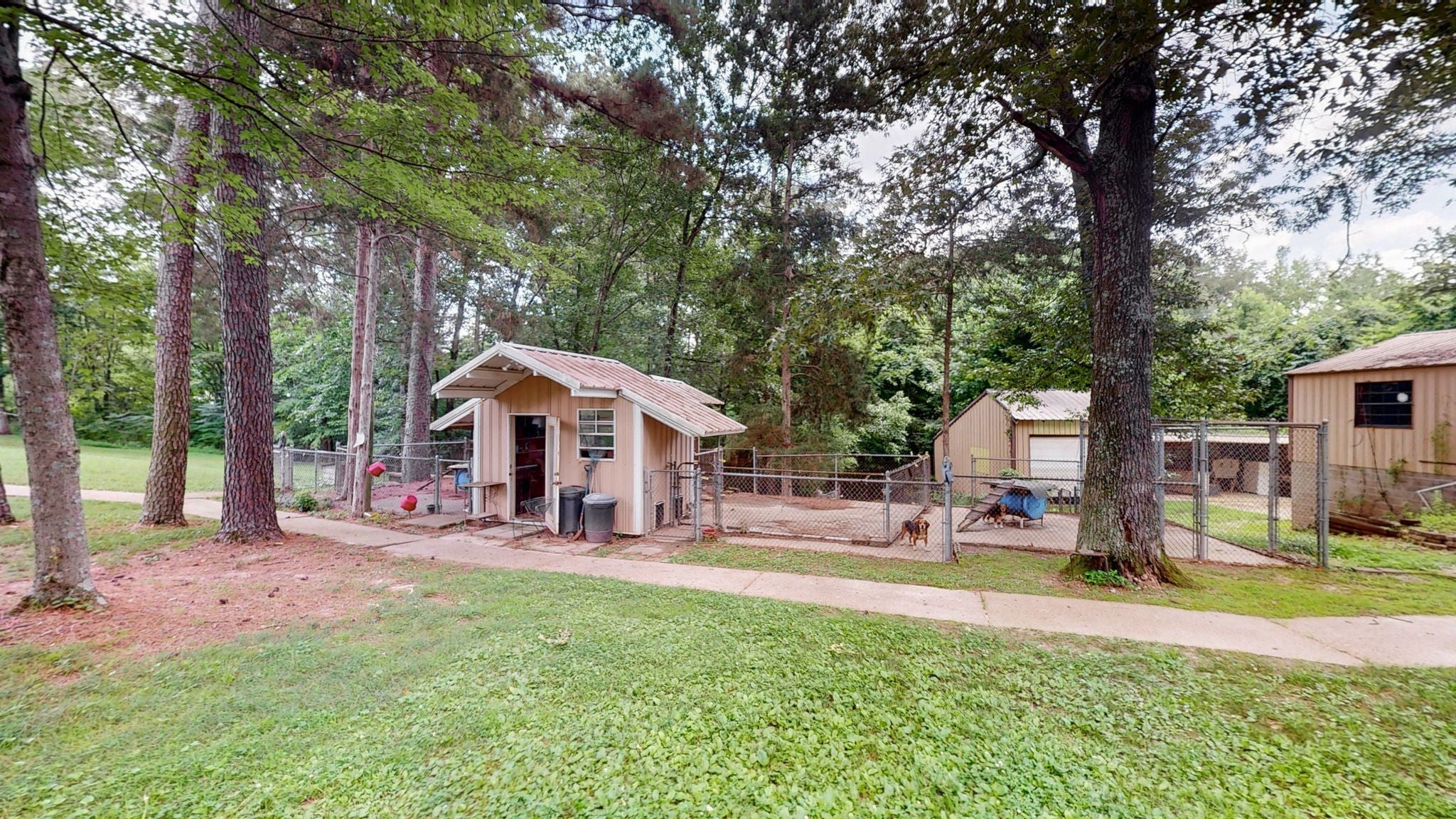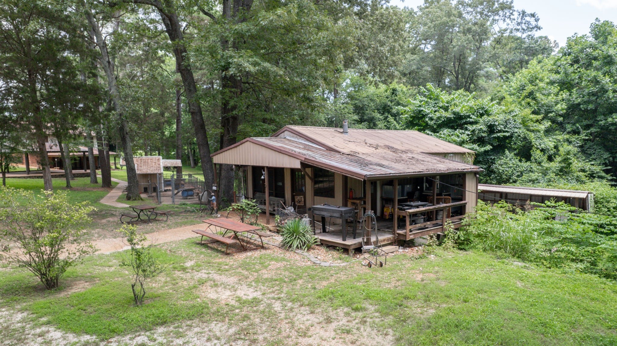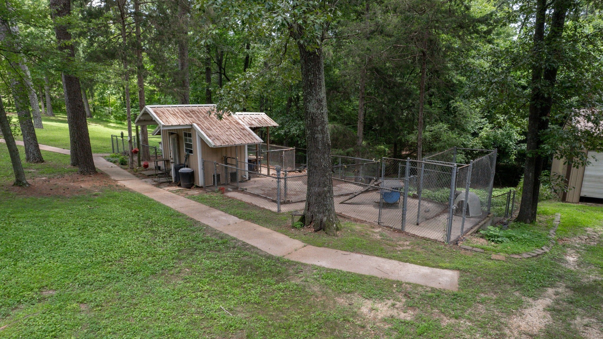 Secluded Paradise minutes from beautiful Kentucky Lake features approx. 20.8 ac +/-, immaculate 4 bedroom 3 bath home, finished basement, 9 ft, ceilings on main level of home with beautiful stone gas fireplace. Custom Kitchen on main level with granite counter tops, tile backsplash, eating bar, pantry area and ample cabinets with pull outs. Basement has additional full kitchen and dinette area off den area. 40x30 Metal building with propane tank & heat, finished 15x14 den featuring wood interior walls, stone & window unit. Add'l 30x24 Metal outbuilding with kitchen, oven, stove top, window unit, ductless h/c unit, flat screen tv, half bath, electric hot water tank, wood stove, roll up door, additional garage bay space & storage under, Additional Equipment shed located behind w/ even more storage space. Expansive dog runs, fenced area and dog shed/house. Mostly Locust Dr is a private Drive & will convey with sale. Neighbor to have easement to 160 Mostly Locust Dr.