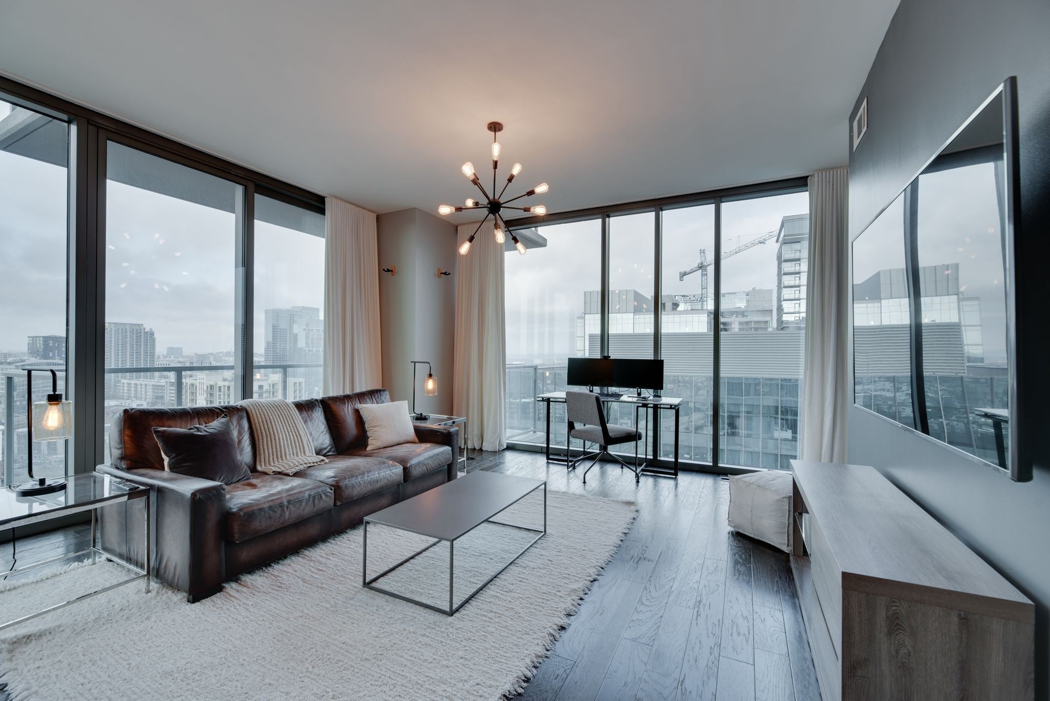 Furnished Corner Unit on 19th floor of 1212 Building. 2 bedroom, 2 bathroom condo with floor to ceiling windows providing sweeping views of the city. 2 included parking spots and storage unit. Building amenities include 24/7 security, concierge, fitness center, saltwater swimming pool, hot tub, two owner lounges, two guest suites, and dog park. Steps from everything Gulch and Downtown
