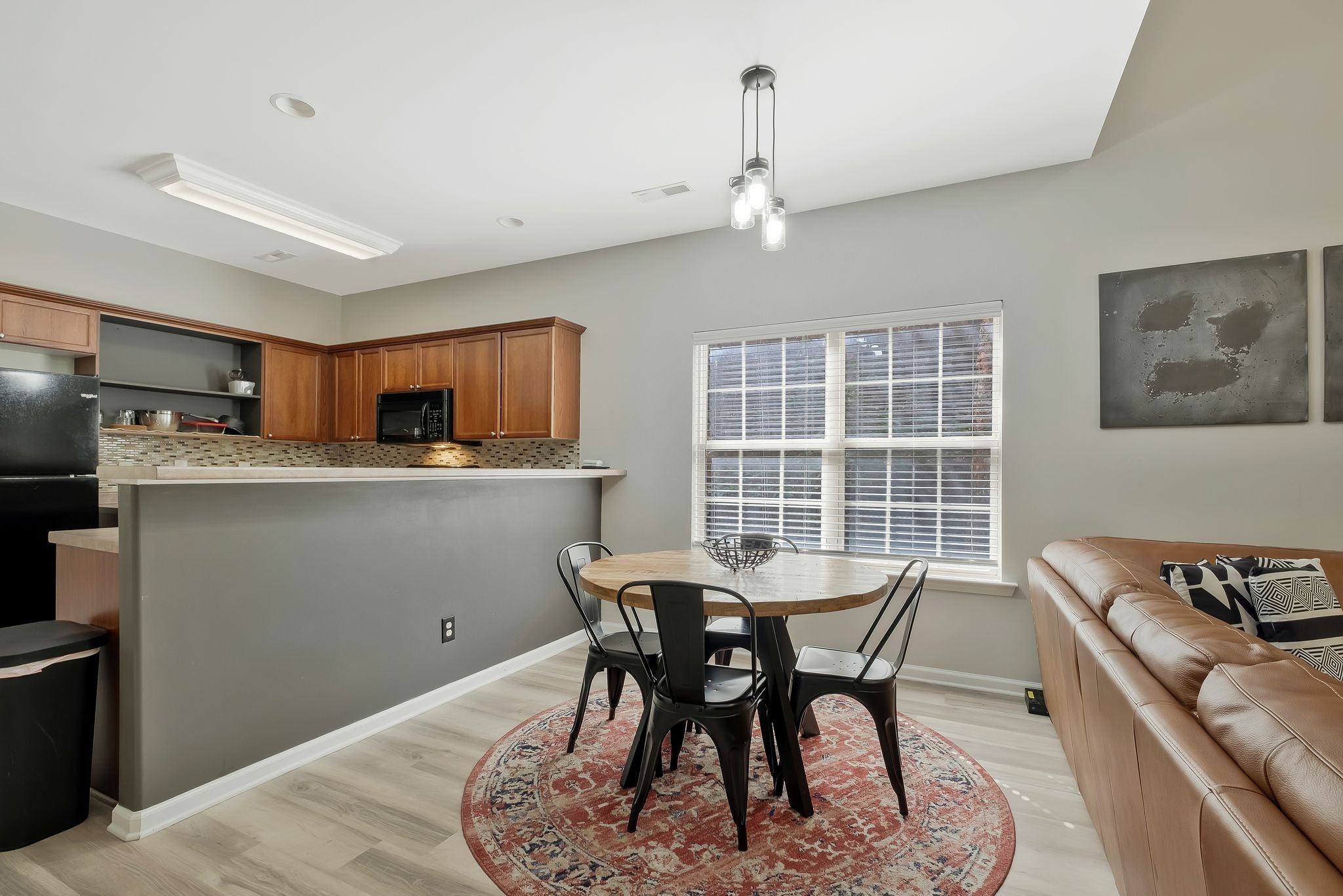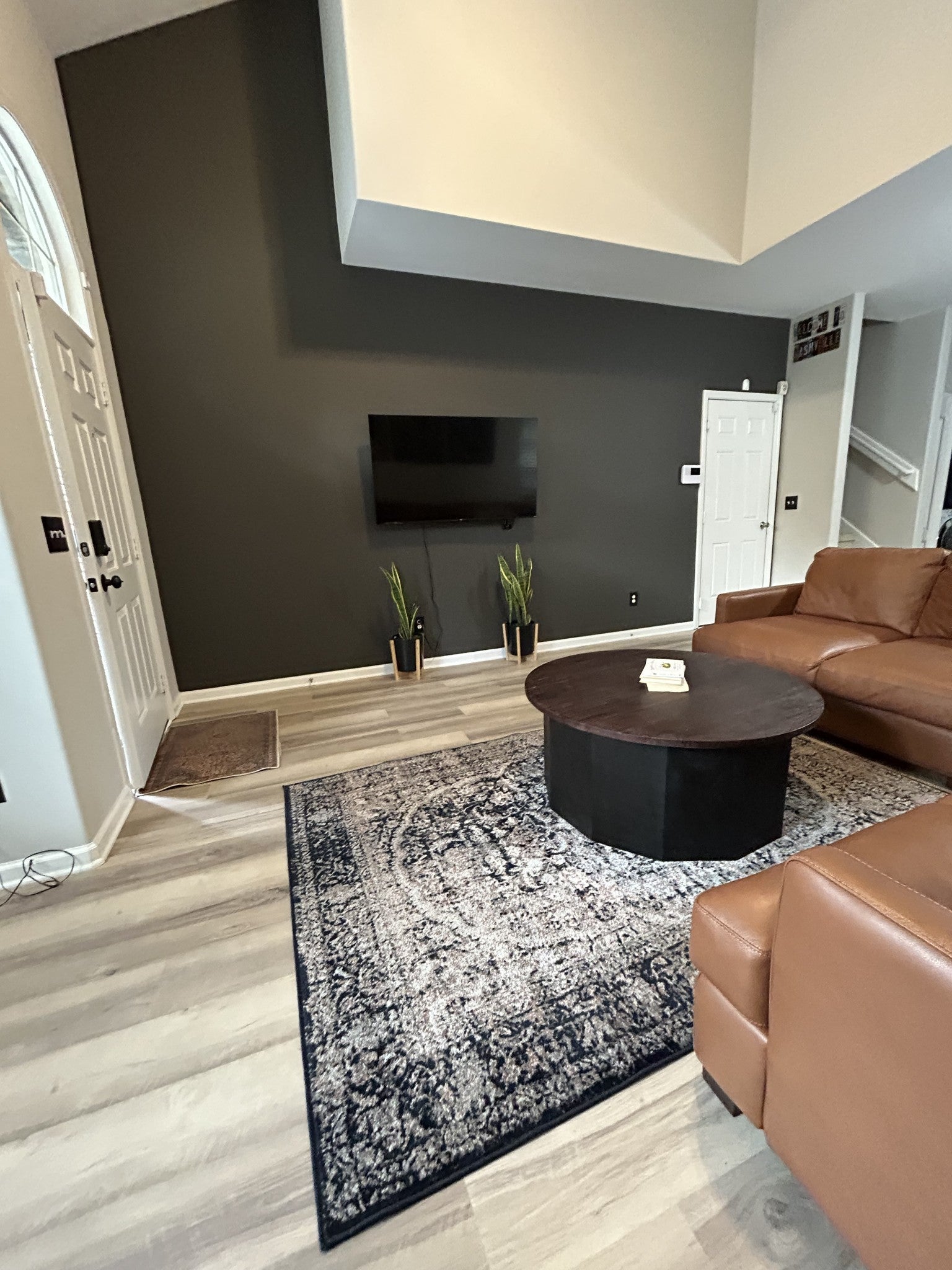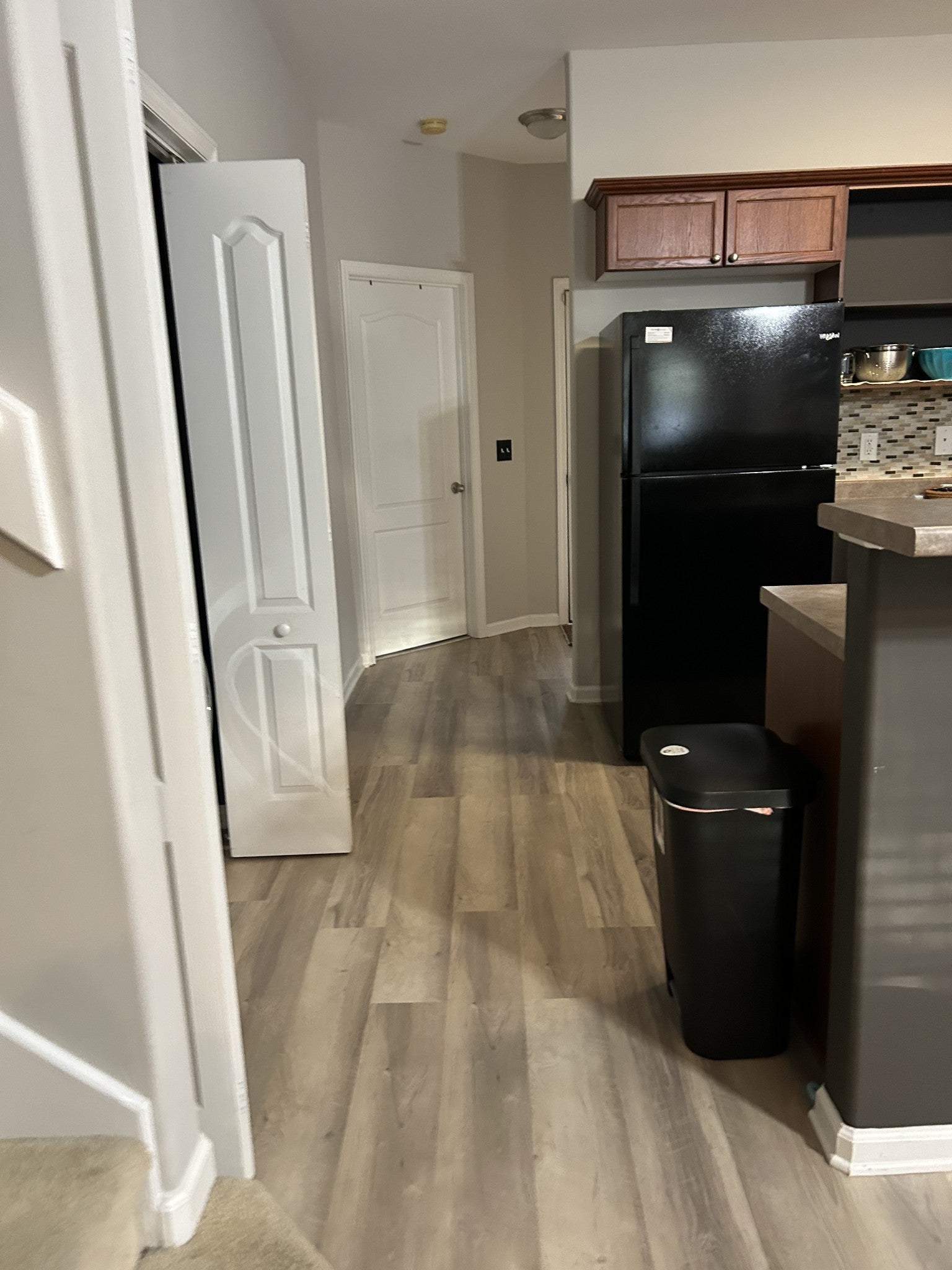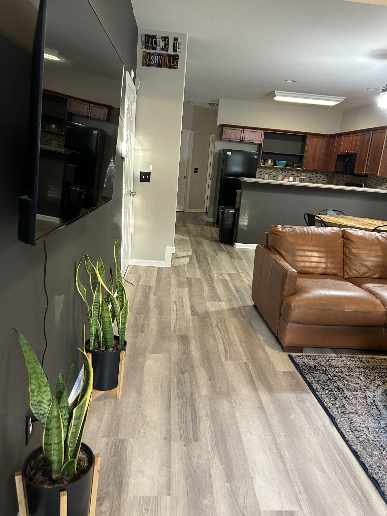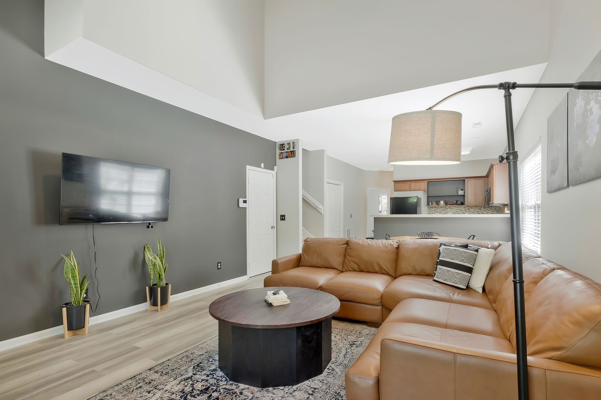 This beautiful town home features an open concept, new laminate floors on the first floor in the LR, Kitchen and Half Bath, updated paint throughout and new carpet in the master suite. It is an end unit with a private treed backyard. The covered deck area is ideal for relaxing or entertaining. The upstairs has a den with nook for a desk, full bath and extra large bedroom suite. Other features: large closets, storage space and flat screen TVs in LR and two bedrooms remain.