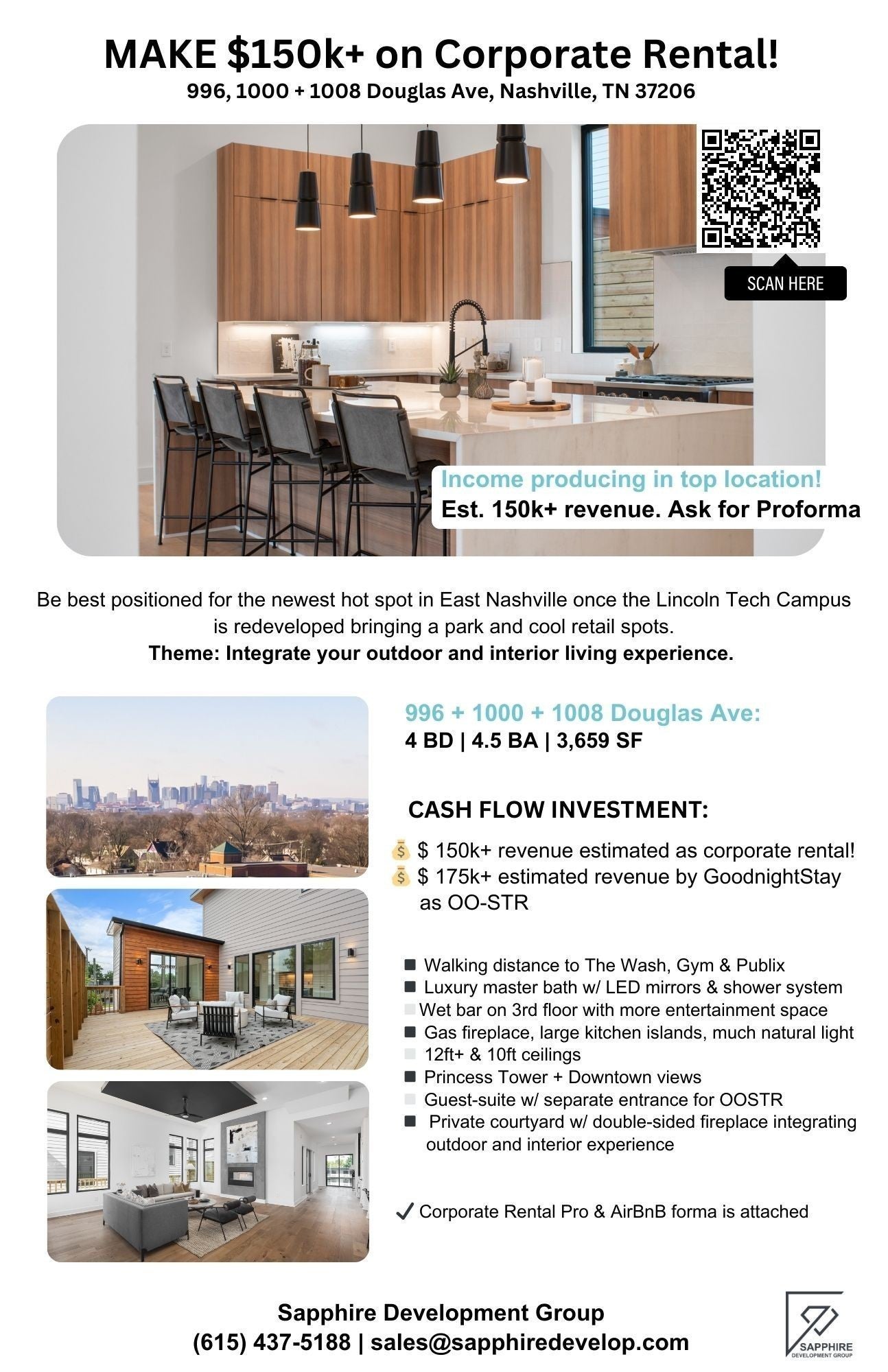 Investor Opportunity: invest in East Nashville, ideal for 1031 exchange, midterm, or LT rentals. This rare offering includes 996, 1000, and 1008 Douglas, each 3,659 sq ft with 4 beds, 4 baths, designer finishes, skyline-facing rooftop decks, and guest suites with private entrances. Individual MLS numbers are as follows: 1008 Douglas Ave: MLS - 2905060, 1000 Douglas Ave: MLS - 2887167, 996 Douglas Ave: MLS - 2905059 Located in the historic Greenwood neighborhood: walkable, charming, and minutes from Downtown, these homes are located directly across from the future brand-new park, restaurants, and retail, which are part of the $100M+ Lincoln Tech redevelopment. Est. Midterm rental revenue: $135K+ per home annually; LT revenue: 105k. In 2024, a furnished lease offer of $12.5K/month was received for a 2-month stay. With their flexible use potential and strong rental demand, these properties are well-positioned for excellent near-term income and long-term value. Equity upside: Direct comp at 1010 Douglas closed at $1.588M. With development accelerating nearby, we anticipate significant equity growth over the next 3-5 years. Each home features 10–12 ft ceilings, a double-sided fireplace that opens to a private courtyard, a wine bar and wet bar for entertaining, and a rooftop Lookout Tower with panoramic views of downtown Nashville. Just a 5-minute walk to Publix, Orange Theory, and top local restaurants, this is one of East Nashville’s most livable and strategically positioned locations. Greenwood dates back to the late 1800s and continues to attract growth-minded residents and investors. Preferred lender offers a 1.5% rate buy down and free appraisal. Inquire for financials or schedule a private showing to explore this rare, luxe portfolio opportunity.