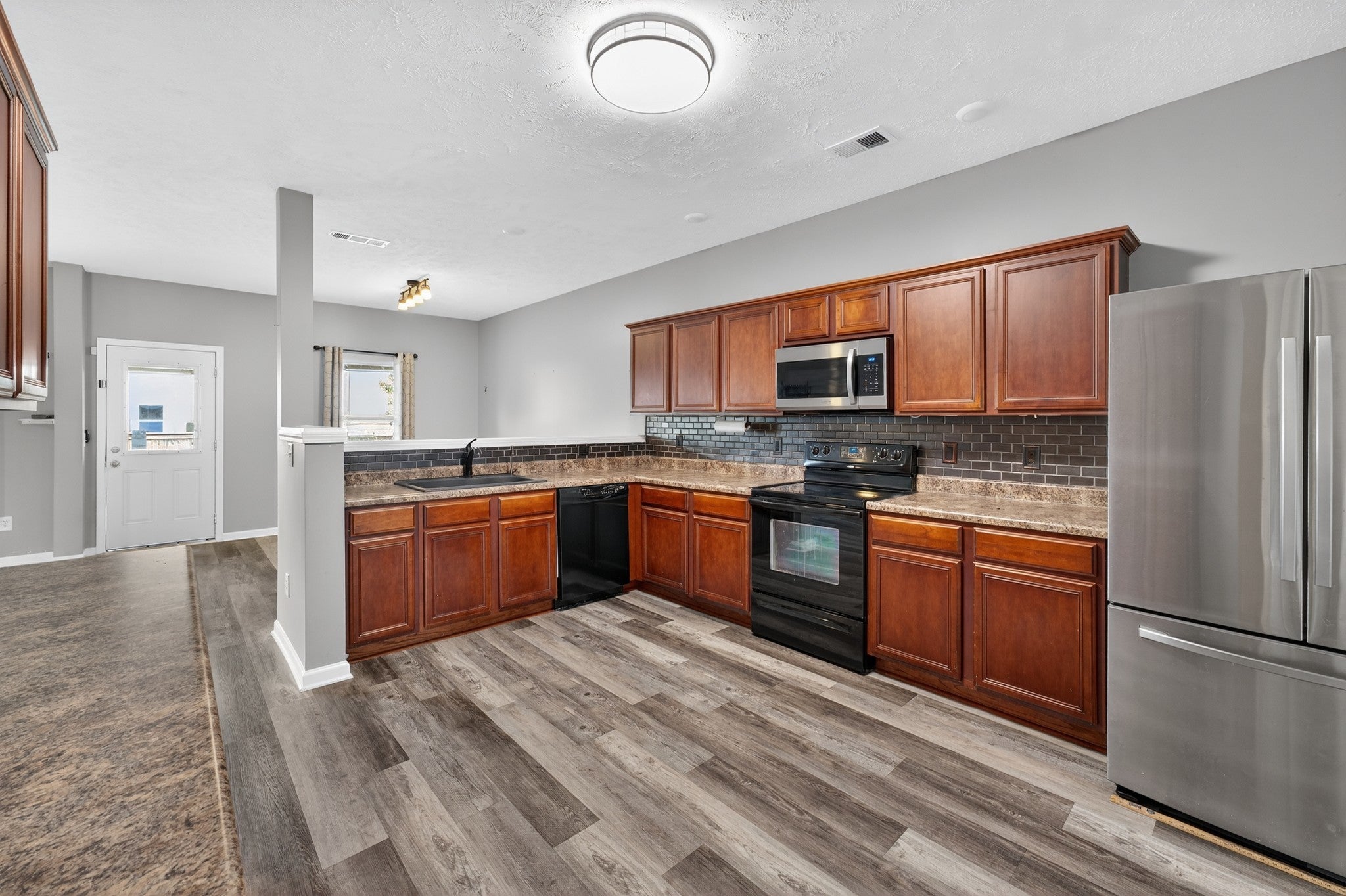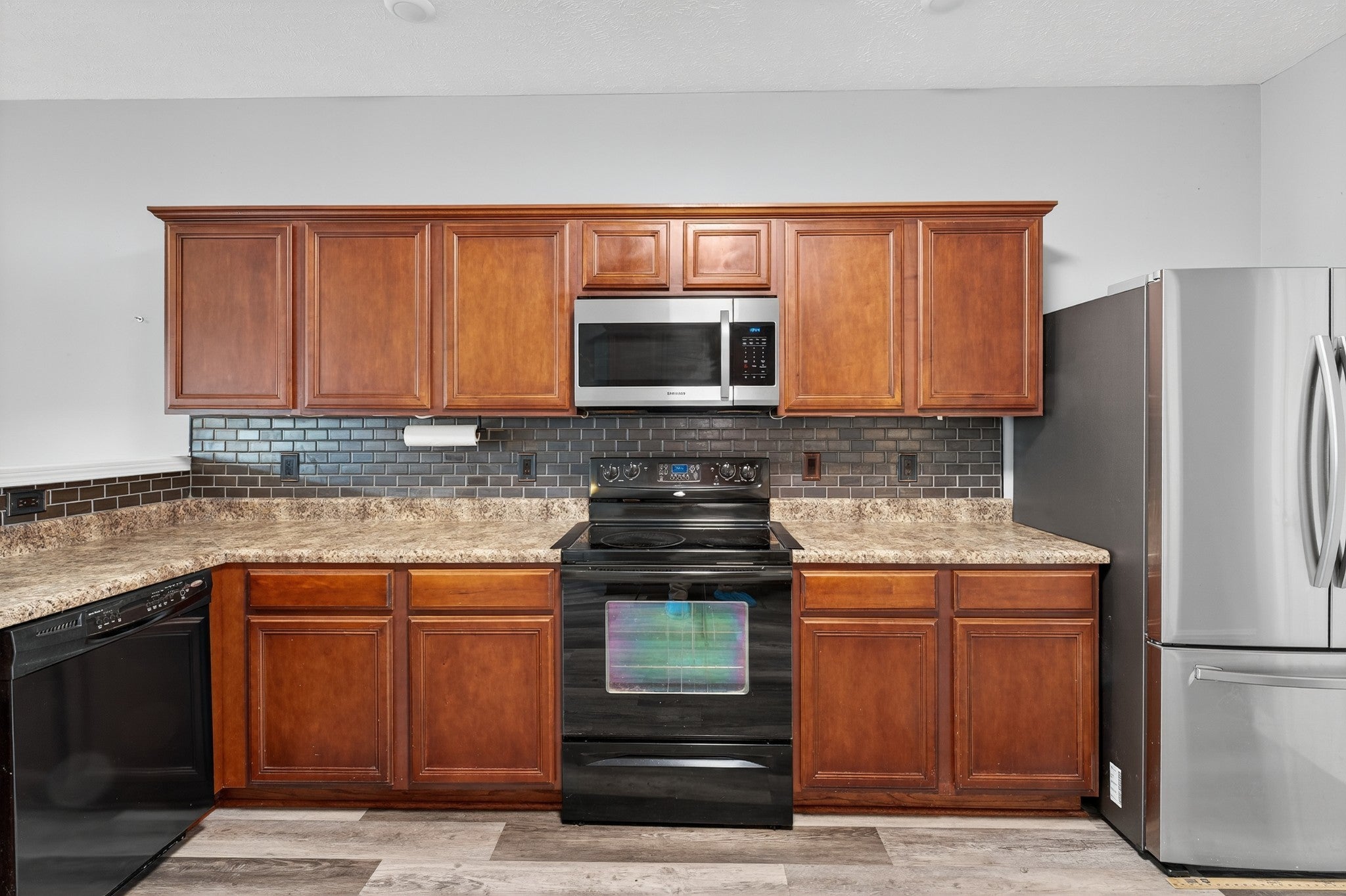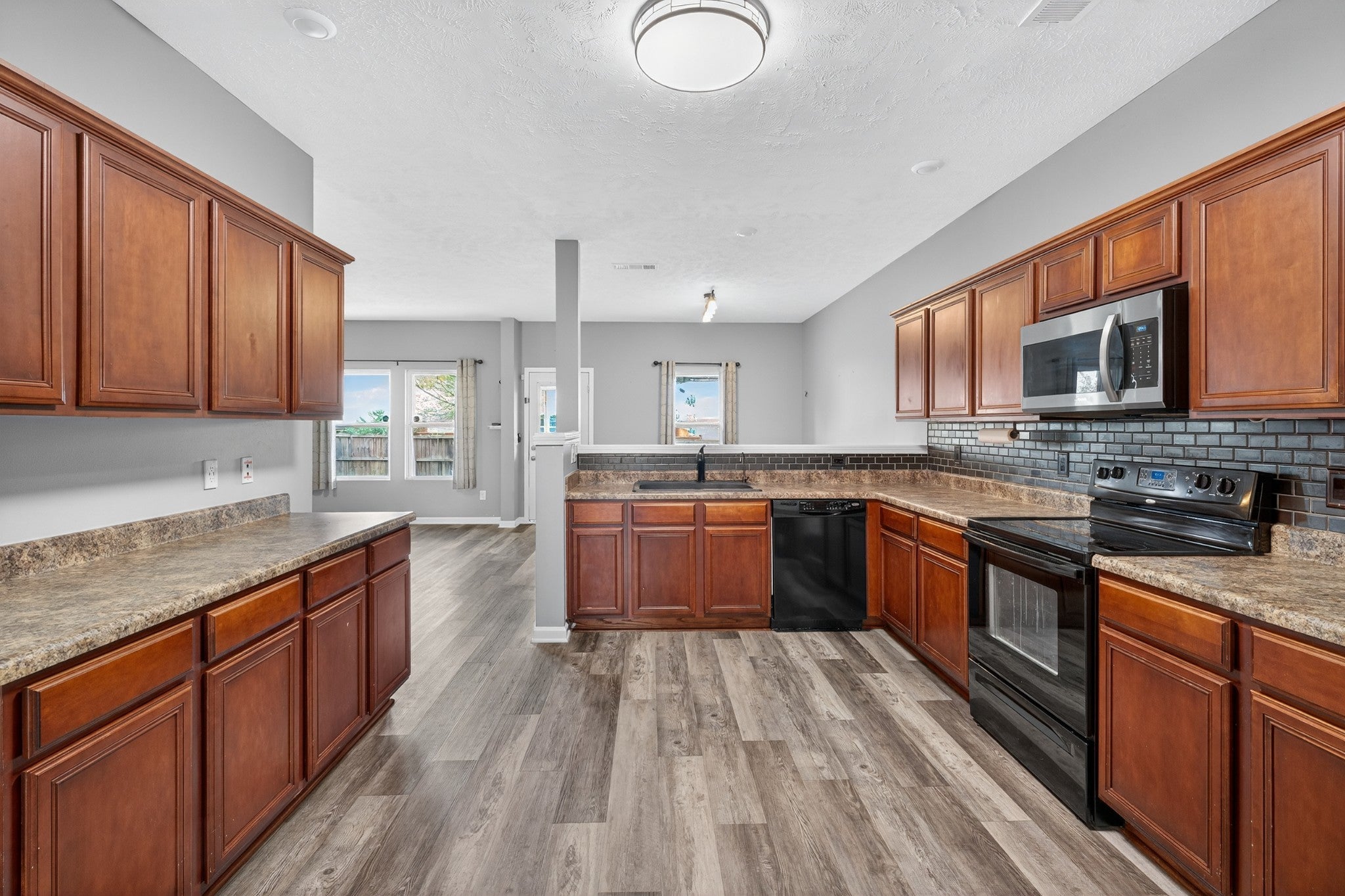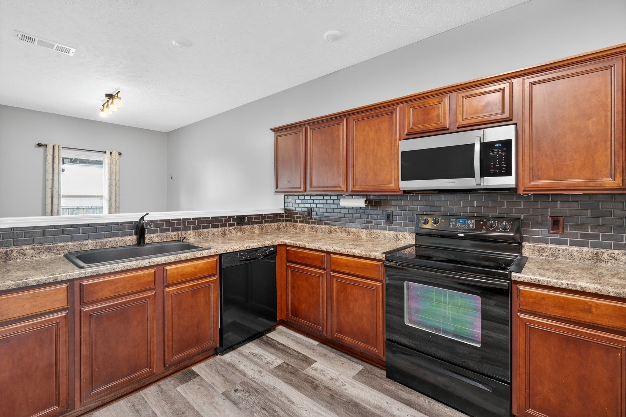 - Built-In Electric Oven, Cooktop, Dishwasher, Disposal, Microwave