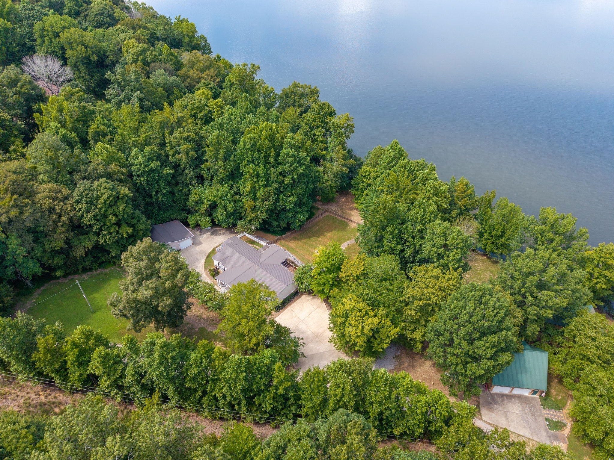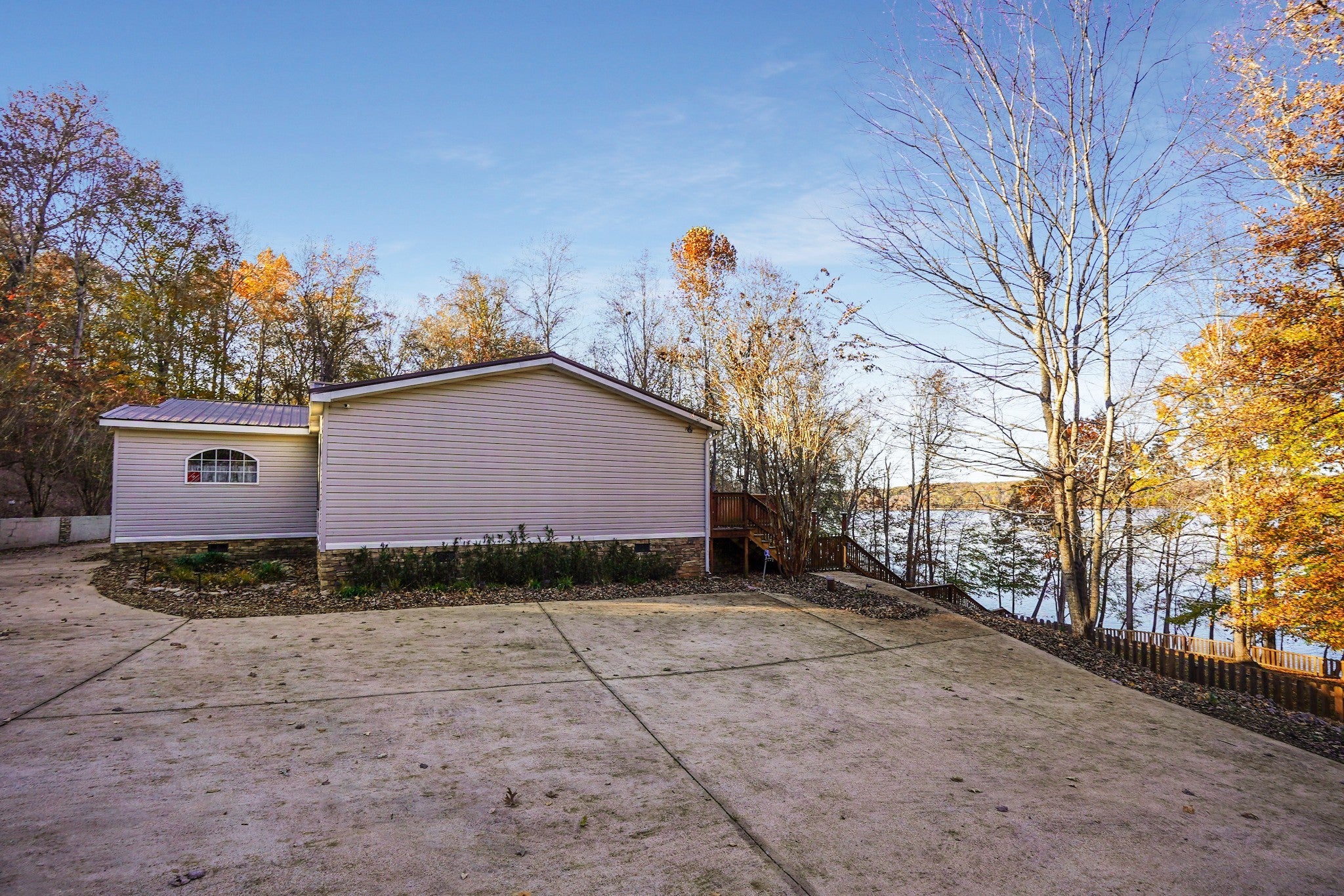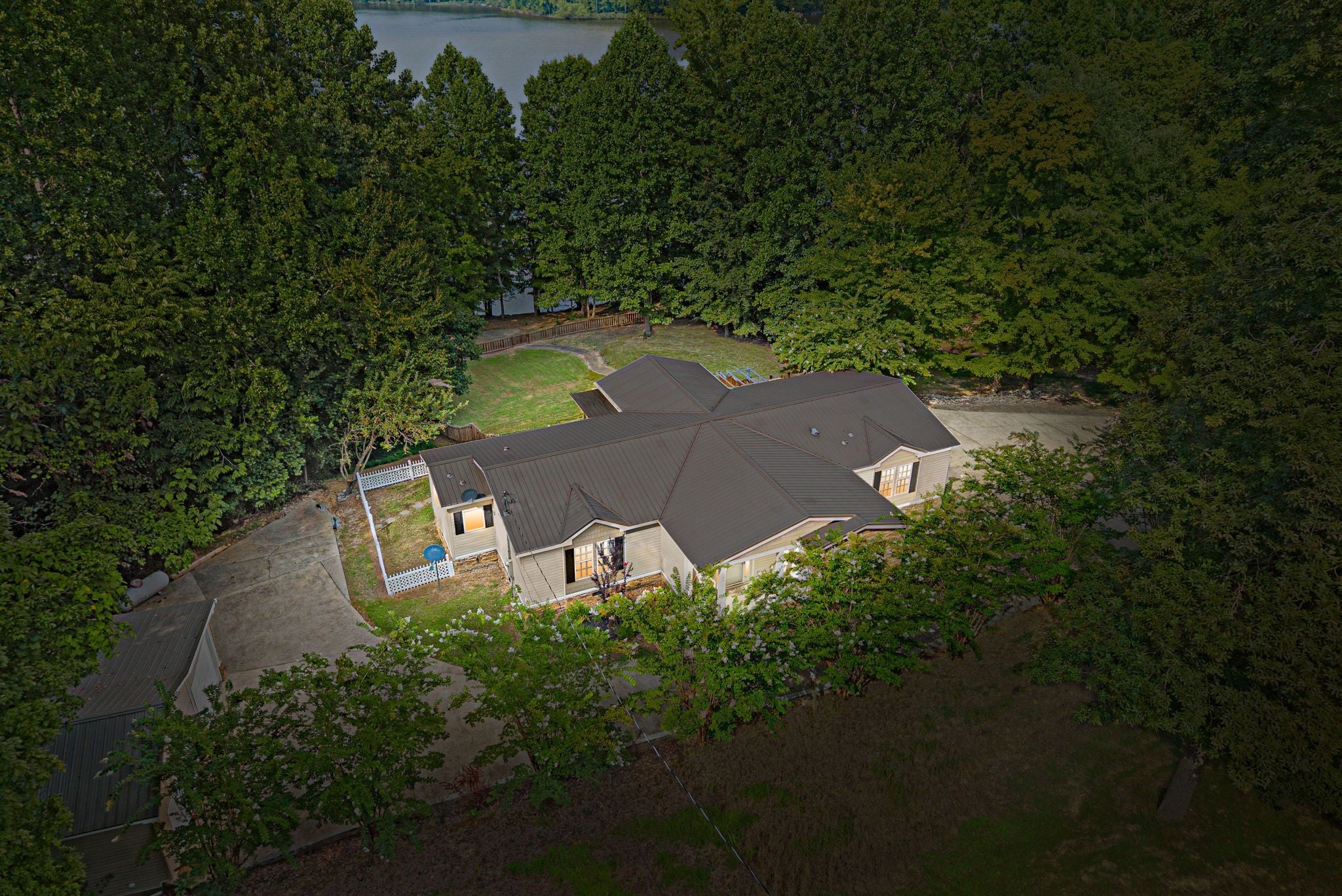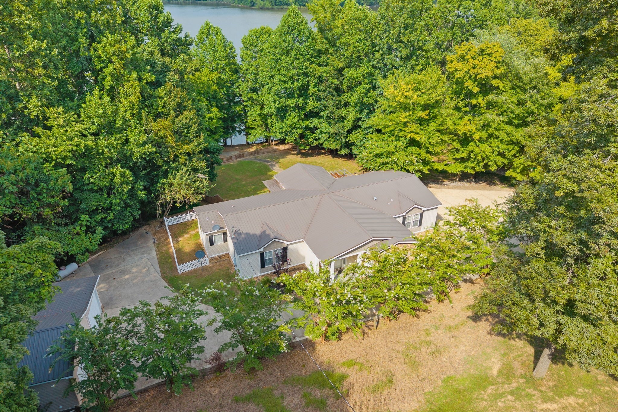 Escape to the tranquility of rural waterfront living! This beautiful home offers an open concept floor plan, precisely placed to enjoy the water view. Gathering room with side built in section with gas logs fireplace-divider bar to the spacious kitchen then leading to the dining room. Master bedroom features a spacious bath and walk in closet. Unique office space in the hallway leading to the 2 guest bedrooms. Laundry room offers a separate door to the back deck. Easy flow floor plan and spacious layout. The back deck is the spot with part covered and part open decking, firepit to the side and steps down to driveway or mid-deck and leading to the back lawn and walkway toward the water. Fenced back lawn is ready for the pets, You find a generous driveway space beyond the front of the home and to the detached garage. Garage is a 2 section connecting setup ; 24 x 11 with back door to additional space and a side 25x16 w/ ample cabinets and storage racks. A storage area is found behind the garage, as well.