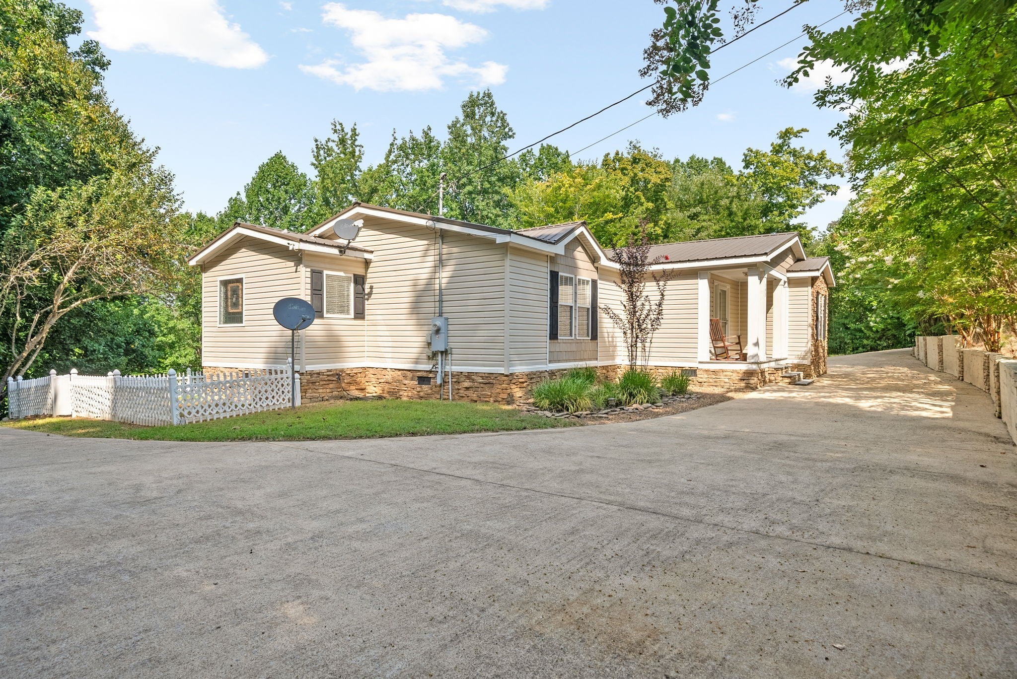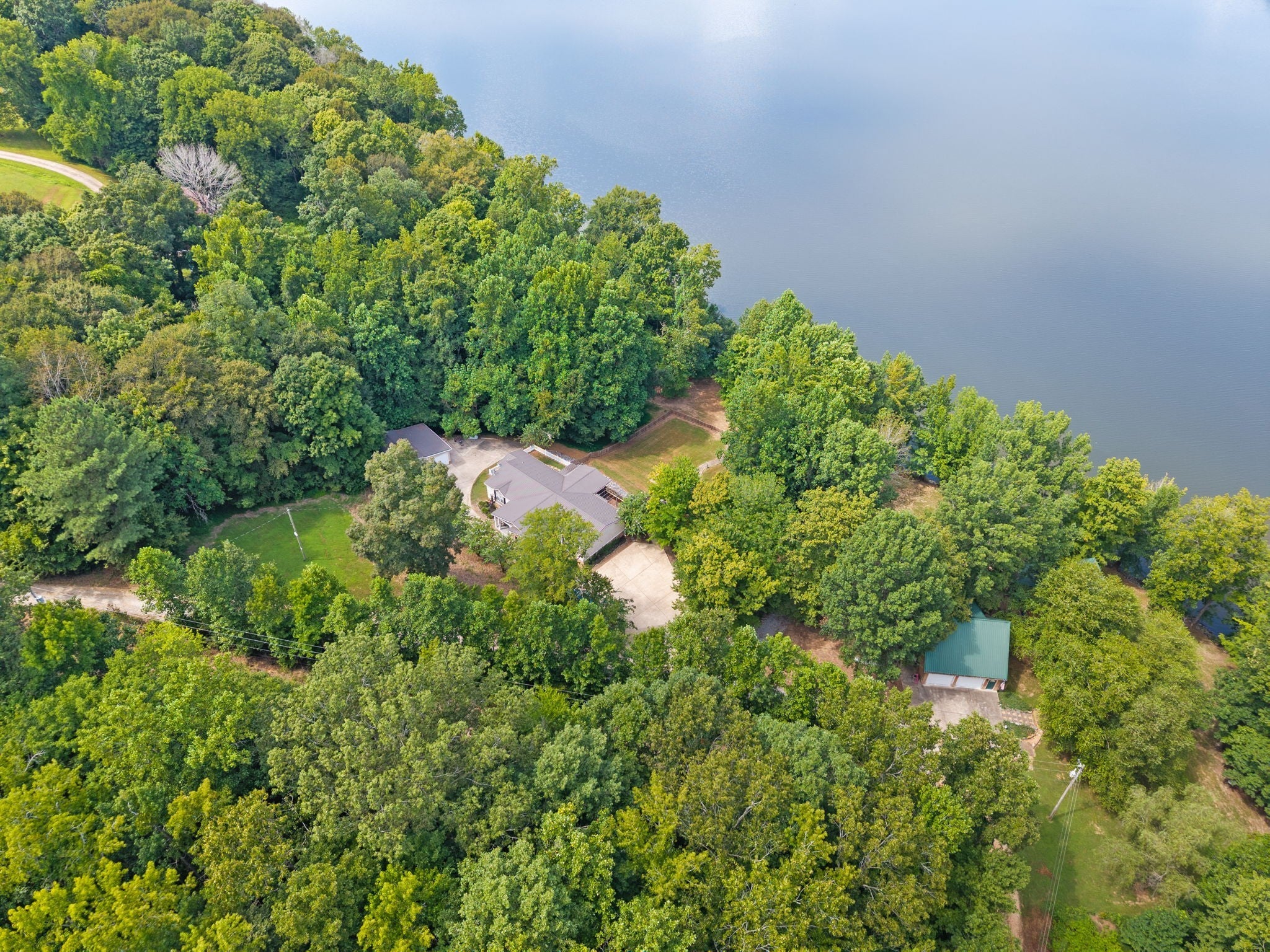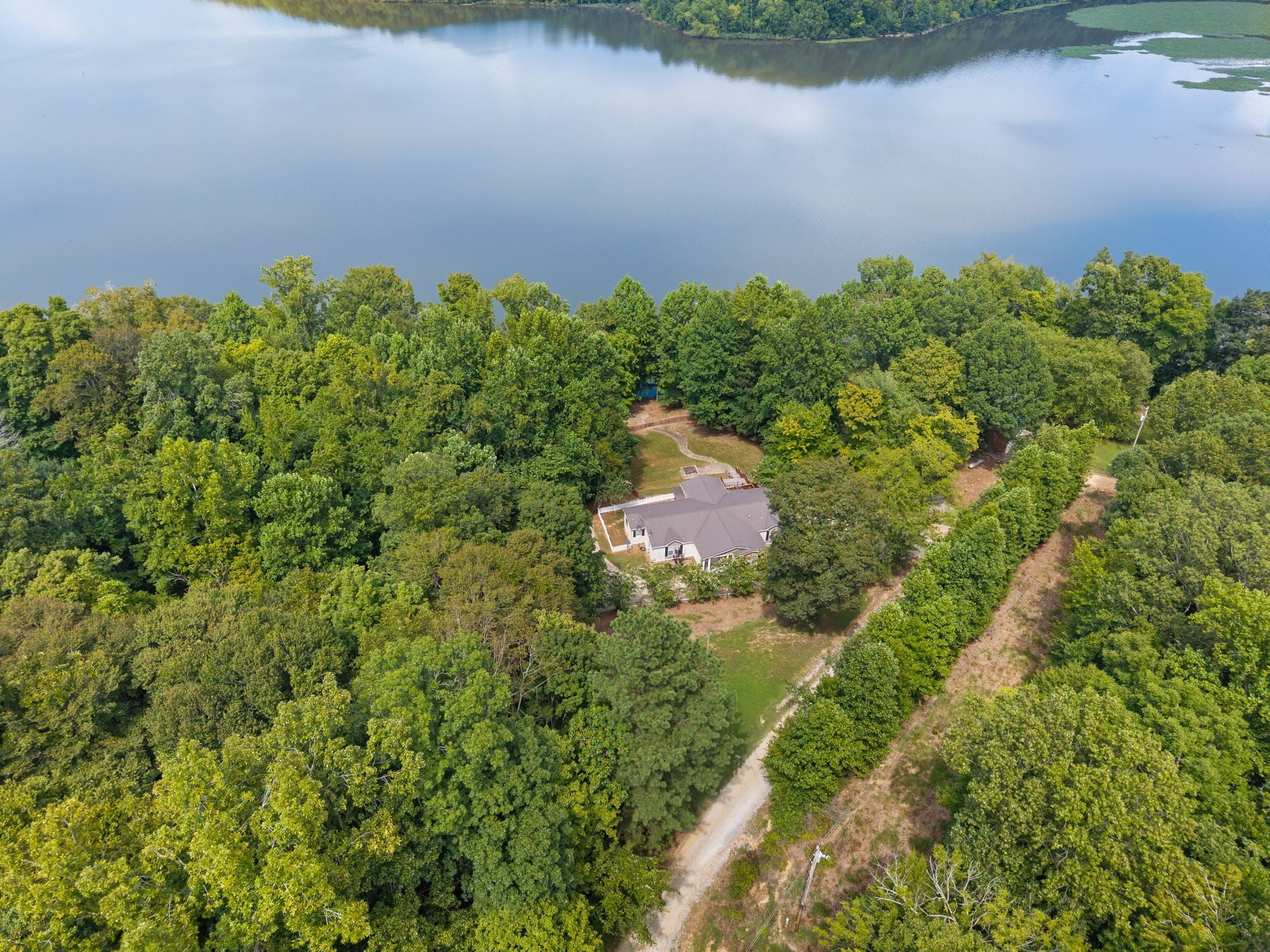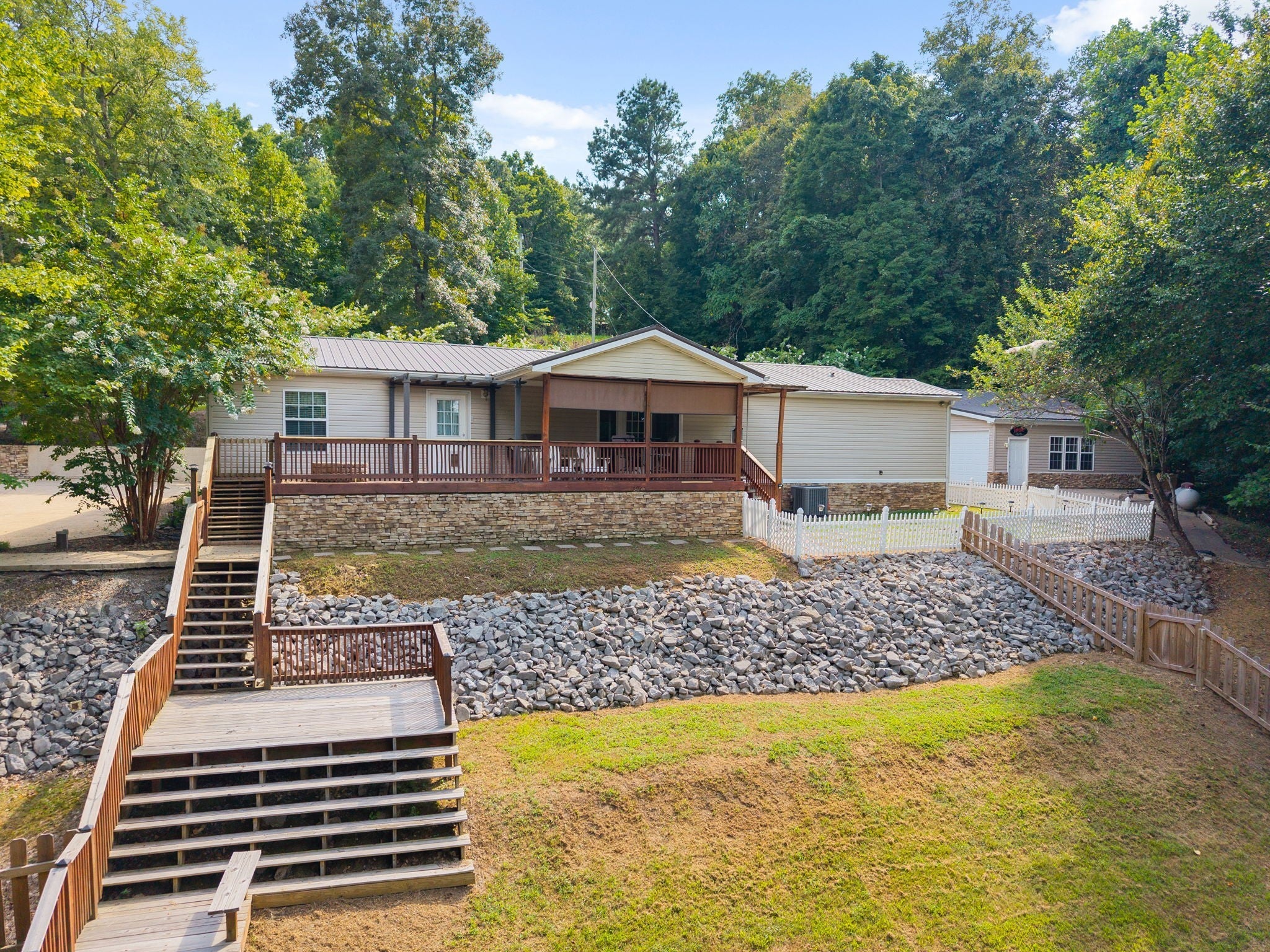 Escape to the tranquility of rural waterfront living! This beautiful home offers an open concept floor plan, precisely placed to enjoy the water view. Gathering room with side built in section with gas logs fireplace-divider bar to the spacious kitchen then leading to the dining room. Master bedroom features a spacious bath and walk in closet. Unique office space in the hallway leading to the 2 guest bedrooms. Laundry room offers a separate door to the back deck. Easy flow floor plan and spacious layout. The back deck is the spot with part covered and part open decking, firepit to the side and steps down to driveway or mid-deck and leading to the back lawn and walkway toward the water. Fenced back lawn is ready for the pets, You find a generous driveway space beyond the front of the home and to the detached garage. Garage is a 2 section connecting setup ; 24 x 11 with back door to additional space and a side 25x16 w/ ample cabinets and storage racks. A storage area is found behind the garage, as well.