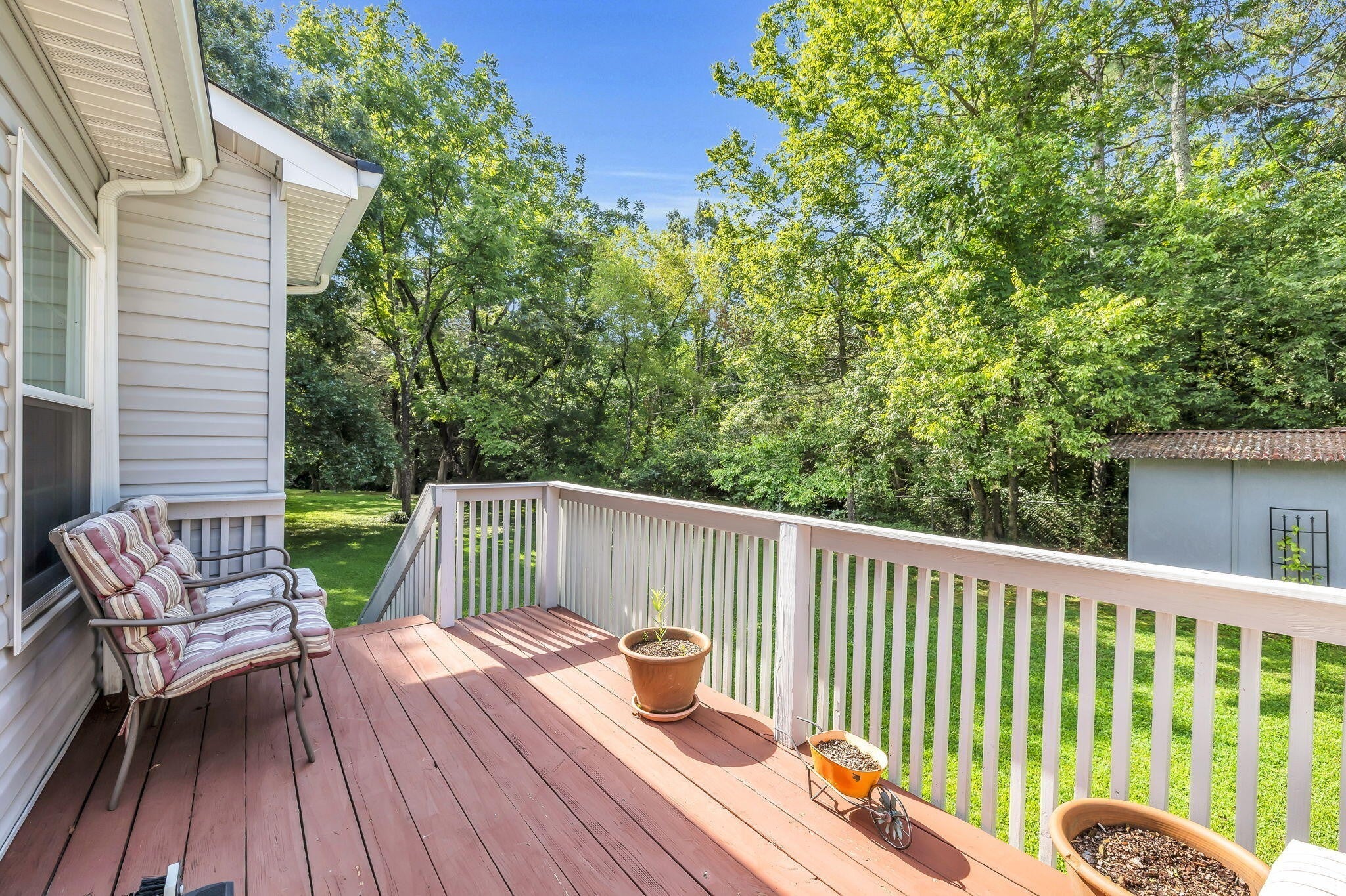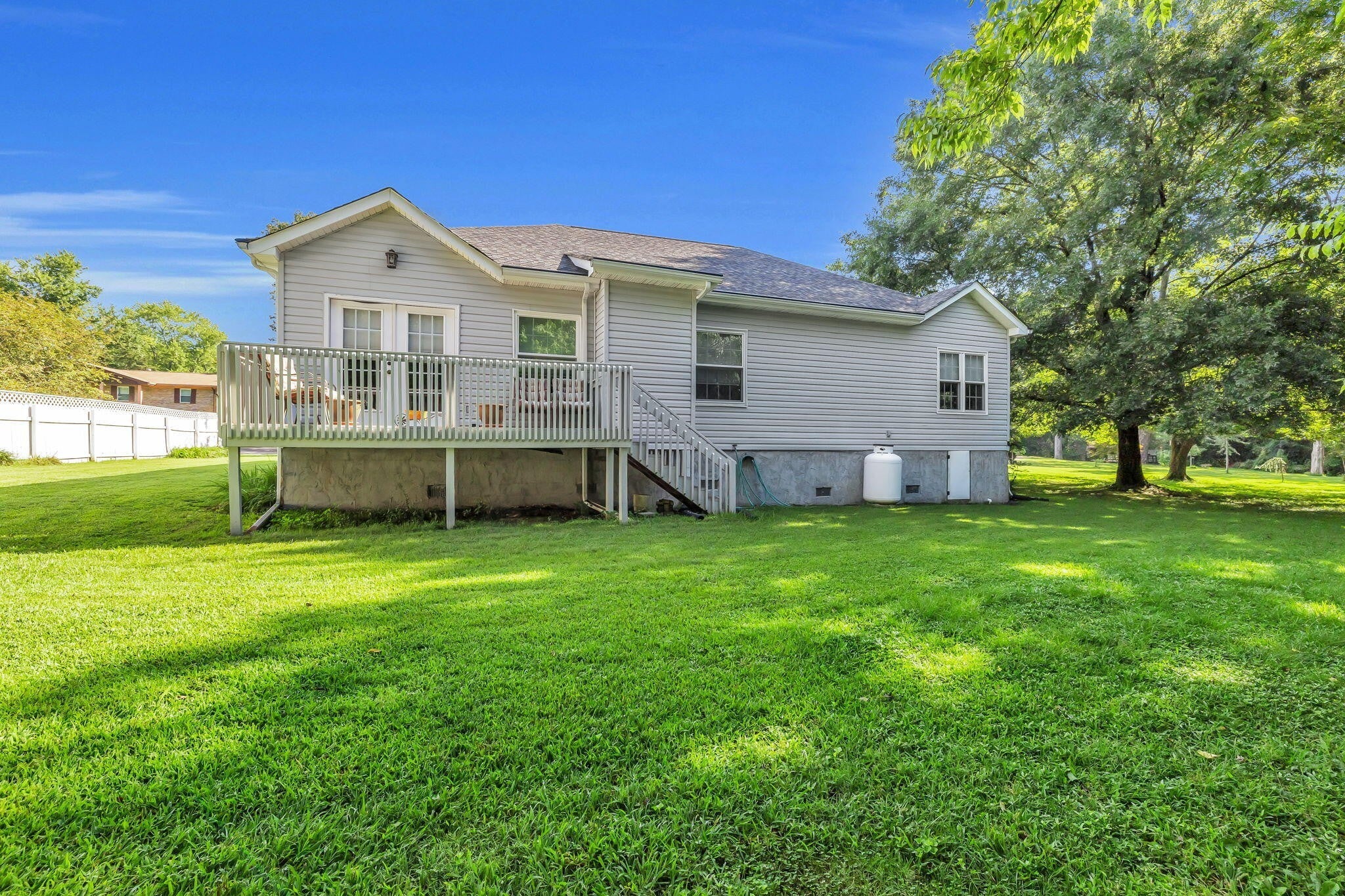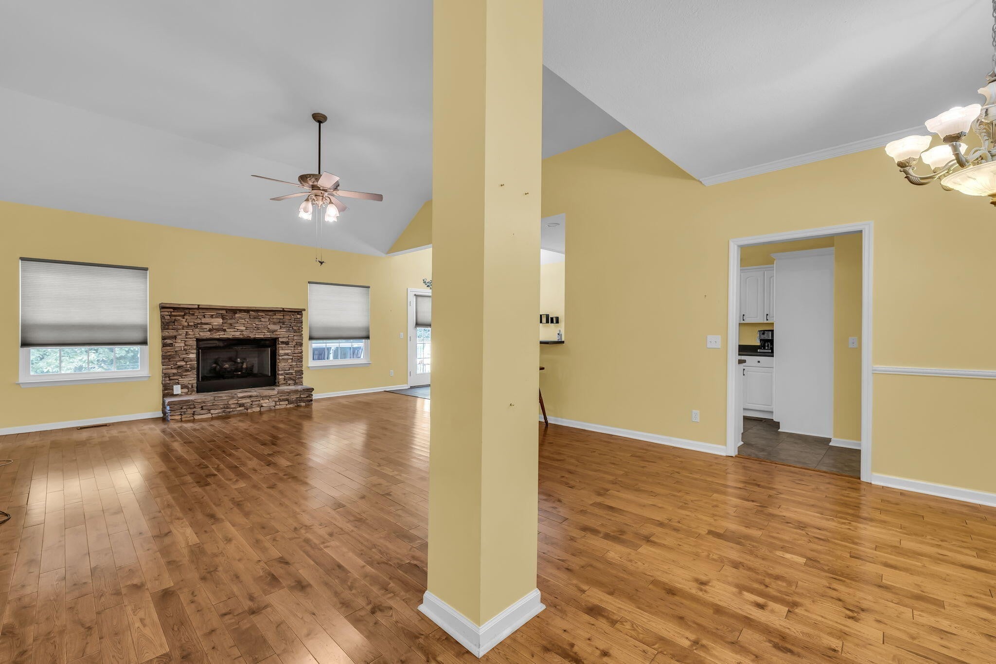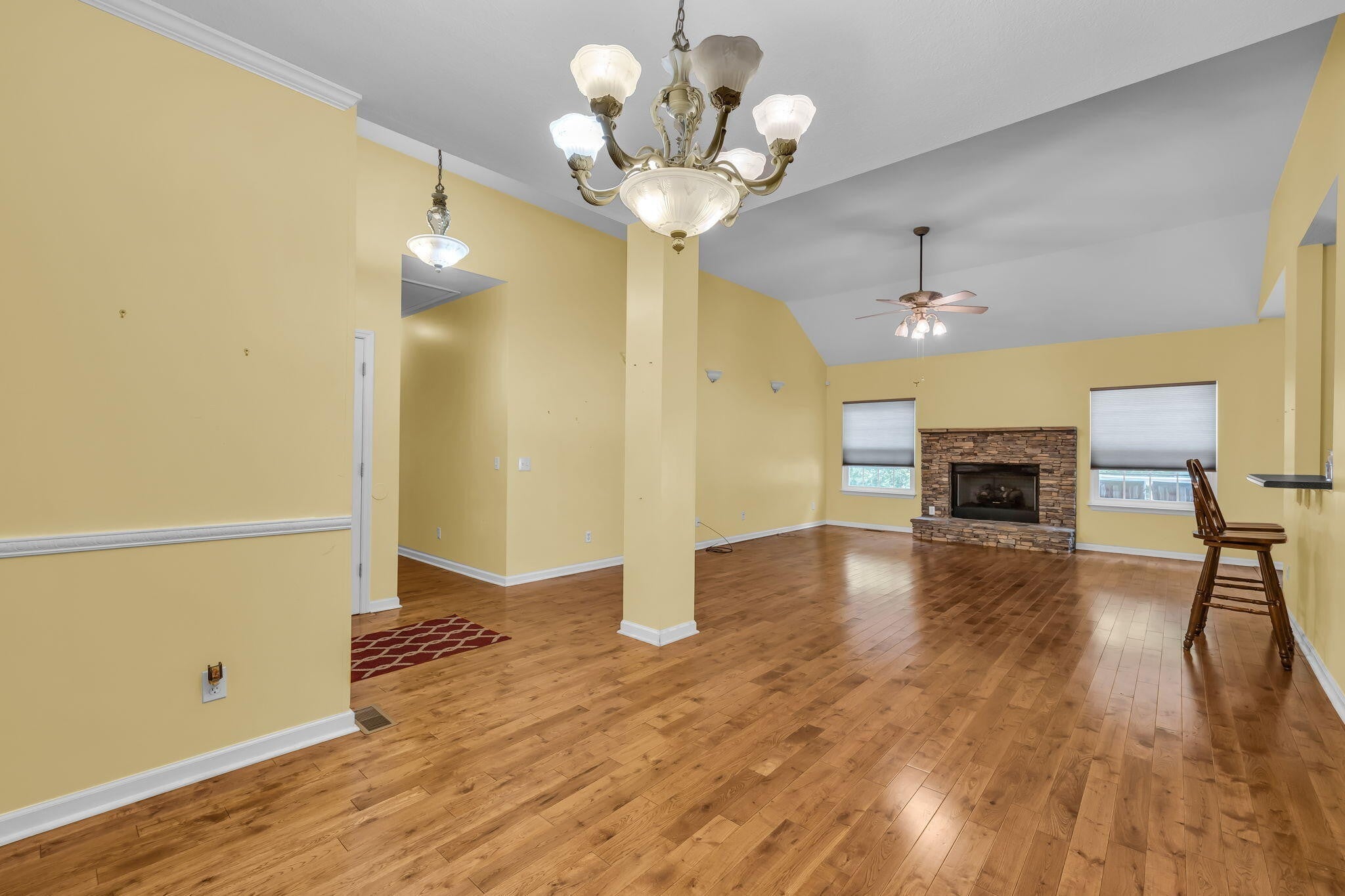 This charming 3-bedroom, 2-bath home offers the perfect blend of comfort and style—all on one level. Step inside to an inviting open layout where hardwood floors, soaring vaulted ceilings, and a distinctive stacked stone fireplace set the tone for relaxed living. The kitchen is designed for both convenience and connection, seamlessly flowing into the eat-in area and formal dining room—ideal for everyday life and entertaining. The spacious primary suite is a true retreat, featuring a double vanity, soaking tub, and generous walk-in closet. Outside, unwind on the deck while enjoying a private, tree-lined backyard that provides the perfect backdrop for quiet mornings or gatherings with friends. This home combines comfort, style, and convenience in a desirable location.