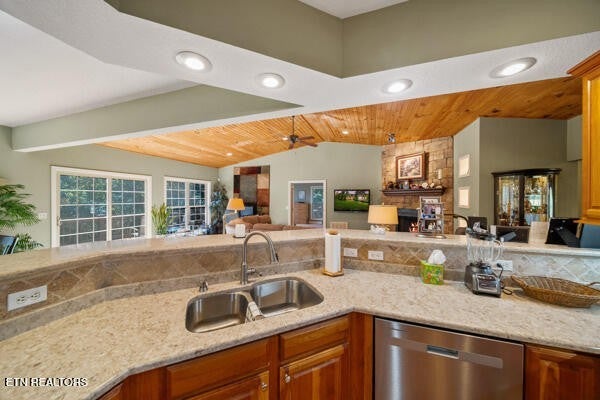 You just found your perfect home with a little hint of cabin feel! This beautiful one owner home is situated on a gorgeous landscaped 1.2 acre corner lot that backs up to the peaceful Creekside community pond and park like setting. But that's not all, it also backs up to Nine Mile creek too. The sellers have spared nothing on this gorgeous brick basement rancher. The elegant stone accents make it pop! As you enter this home from the wrap around front porch you will instantly notice the soaring wood tongue-and-groove ceilings in the open great room complete with an eye-catching wood burning stone fireplace. The open kitchen has lots of cabinets, quartz countertops, and beautiful new stainless steel appliances. The kitchen and great room open up to a large breakfast area overlooking the peaceful back deck. Directly off of the kitchen, this home also features a separate formal dining room providing tons of space to entertain. Off of the kitchen you will also find the laundry / mud room that has access to the garage, back deck, and also leads to the large bonus room over the garage. On the main level you will find the large primary bedroom with an equally large primary ensuite complete with double sinks, jet tub, and separate walk-in shower. The primary bedroom has an impressive walk-in closet too. Also on the main floor are the two additional bedrooms, and full bathroom. Downstairs you will find the massive walkout basement complete with a second great room and huge game room area that leads out through the sliding glass doors to the beautifully manicured lawn looking out over the community pond and park like setting. Off of the downstairs great room you will also find a cozy sitting room that is the perfect area to relax, read a book, and so much more. You could easily add a barn door style door to this room creating a fantastic additional sleeping area. There is also a full bathroom located in this area. But that's not all!
