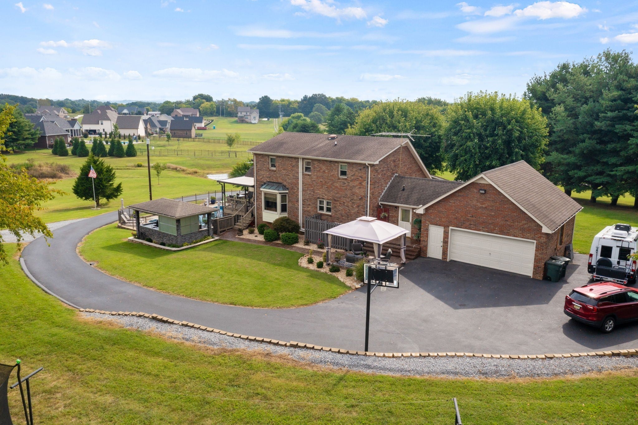Beautiful 1 owner home on 5.31 acres/stocked pond. Features a heated/cooled basement w/bdrm, shop, and storage. The 2 car garage has a handicap lift. Updated custom cedar shutters, hardwood floors, & primary bath w/walk-in shower. The 2nd bathroom is remodeled. Home has a Mitsubishi Ductless heat & air system throughout home & central vacuum, with vac port toe kicks. Updated kitchen w/granite countertops, tiled backsplash, painted cabinets, gas stove & stainless appliances. Front porch has brick flooring & iron railing. Covered back deck w/composite decking, iron railings, ceiling fan, & LED lighting. Includes 24x60 barn w/water/electricity, 32x18 inground pool w/handicap lift and gas heated & a pool house w/an outdoor kitchen, storage room, & partial bathroom. The property has a blacktop driveway, basketball goal, firepit w/swing, & picnic table. An outdoor paradise! Must see to appreciate.
