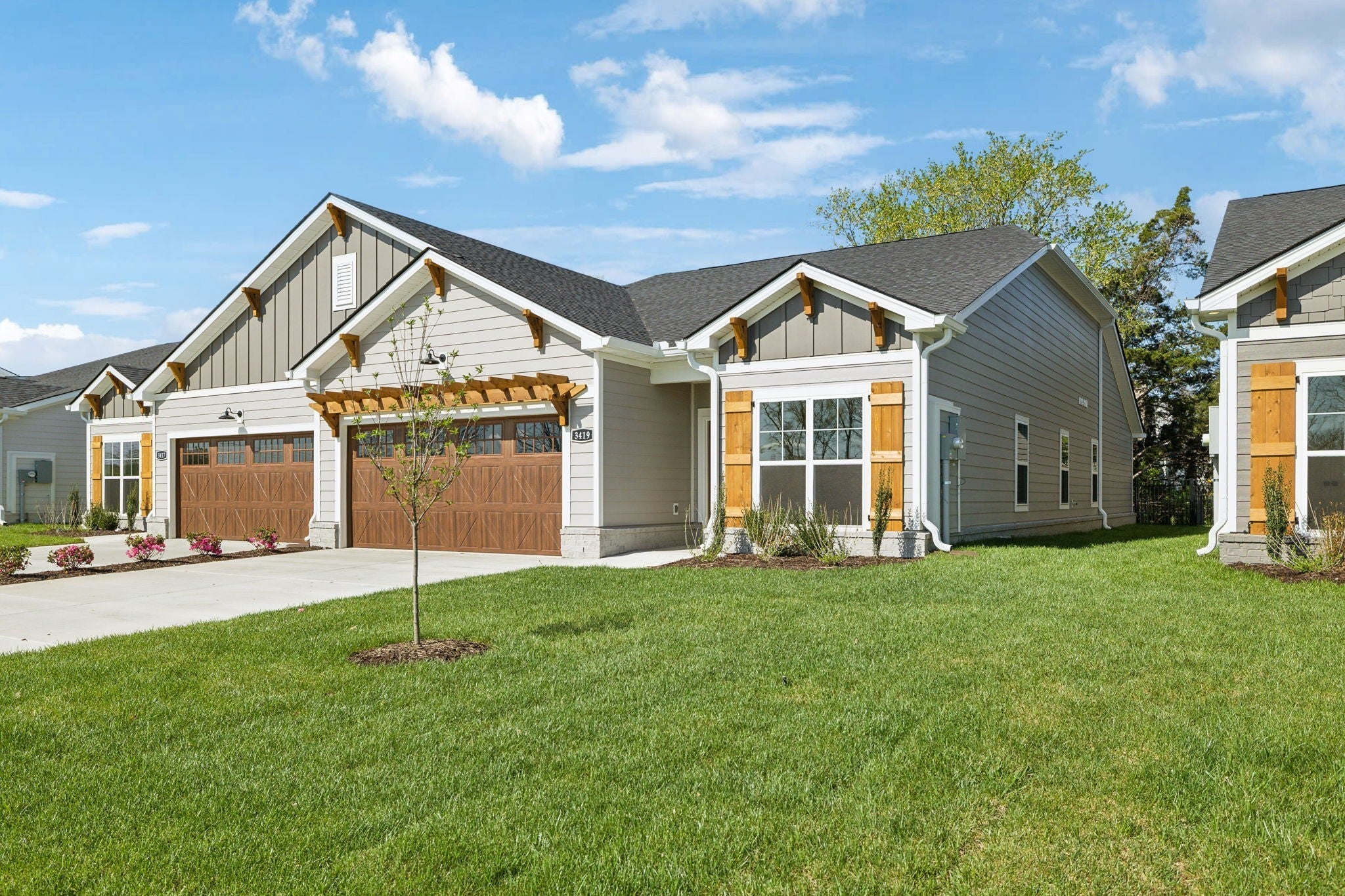 Beautiful New Community Cherry Blossom Downs | The Dogwood Plan A | Interior Package C | 3 Bedroom | 2 Bath | Upgraded Selections Have Been Confirmed See Media Section | Built Ins | Beautiful Cabinets | Quartz Countertops | Laminated Hardwood | Backsplash | Free Standing Tub | Tile Walk in Shower | Board & Batten Shutters | No Steps | Back Porches | Fenced in Yard | HOA Mows Yards | HOA Maintains Landscaping |
