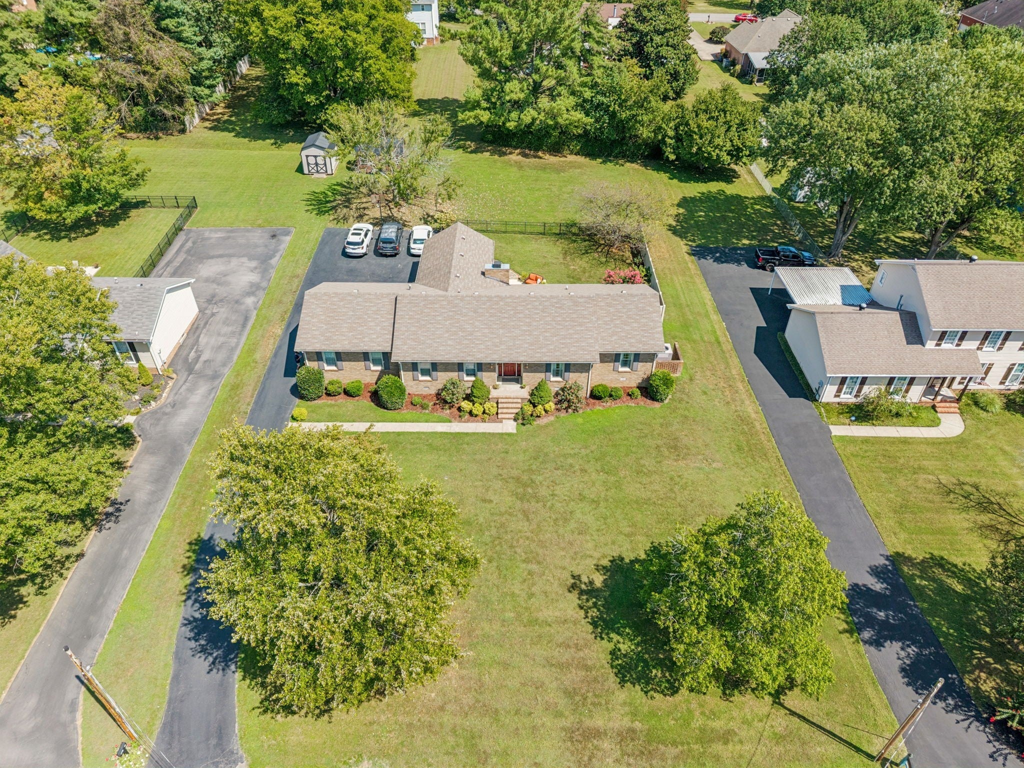 Major Price Improvement! ONE LEVEL ALL BRICK 2300+sq ft home! Move-In Condition! Large 1/2 acre lot! No HOA! Brand NEW HVAC! New 16x10 Storage Building! RING Security System and ALL Appliances including Fridge & Washer/Dryer stay! *Huge Family Room *Separate Den w/Gas Fireplace *Flex Room perfect for Dining or Office *Hardwood Floors *Natural Light *Convenient Location, Location, Location *Established Neighborhood *Mature Landscaping & Trees *Backyard Privacy *Fenced Patio Area *Oversized Garage *Extended Asphalt Driveway *100% Loan Options Available *Preferred Lender Buyer Assistance Available