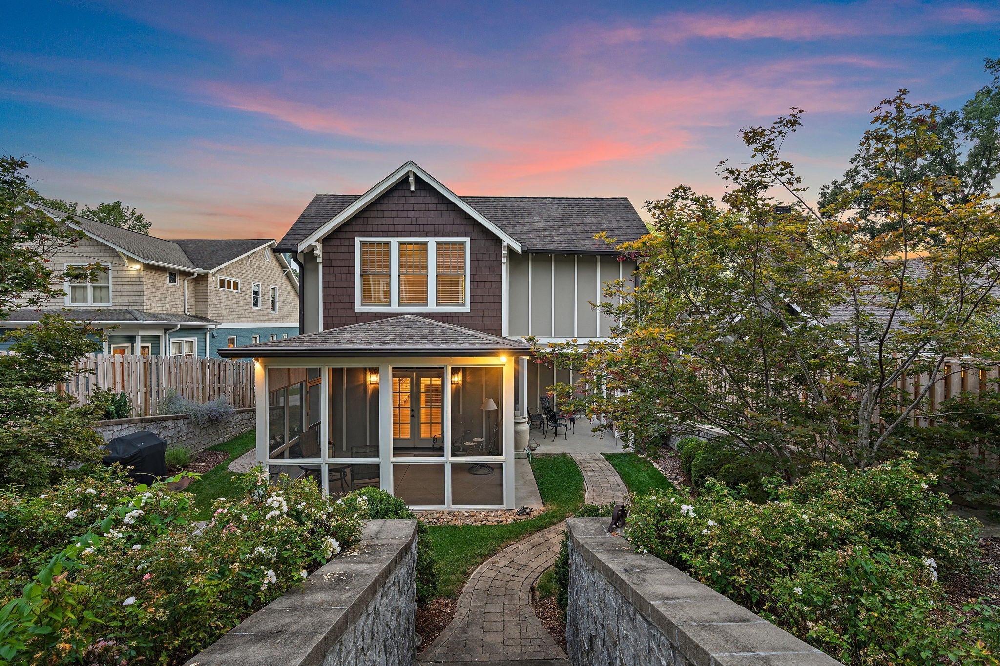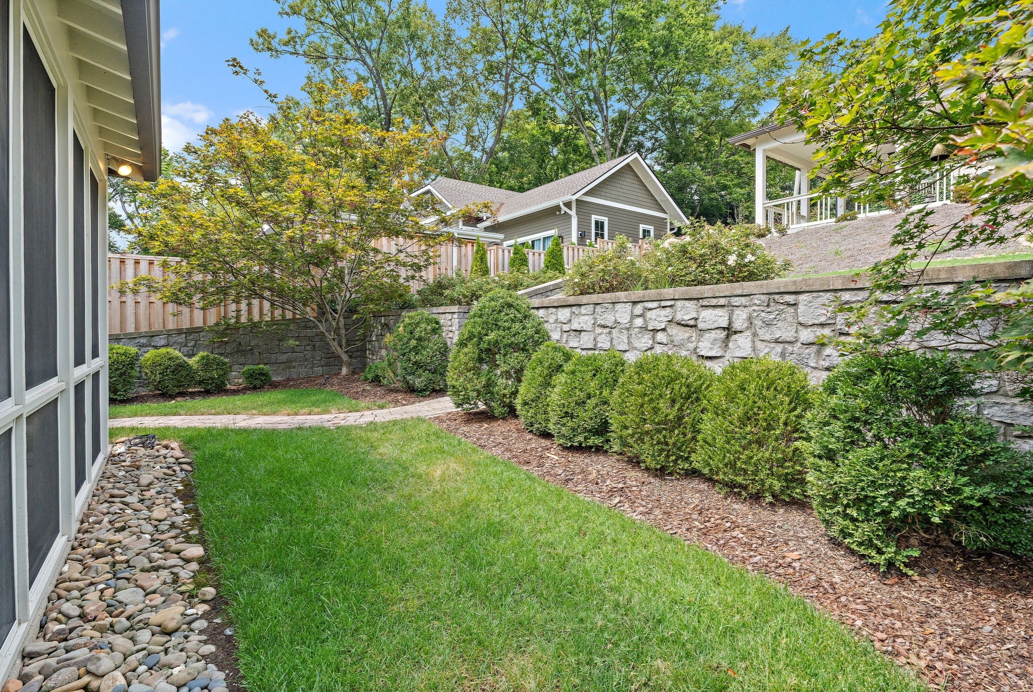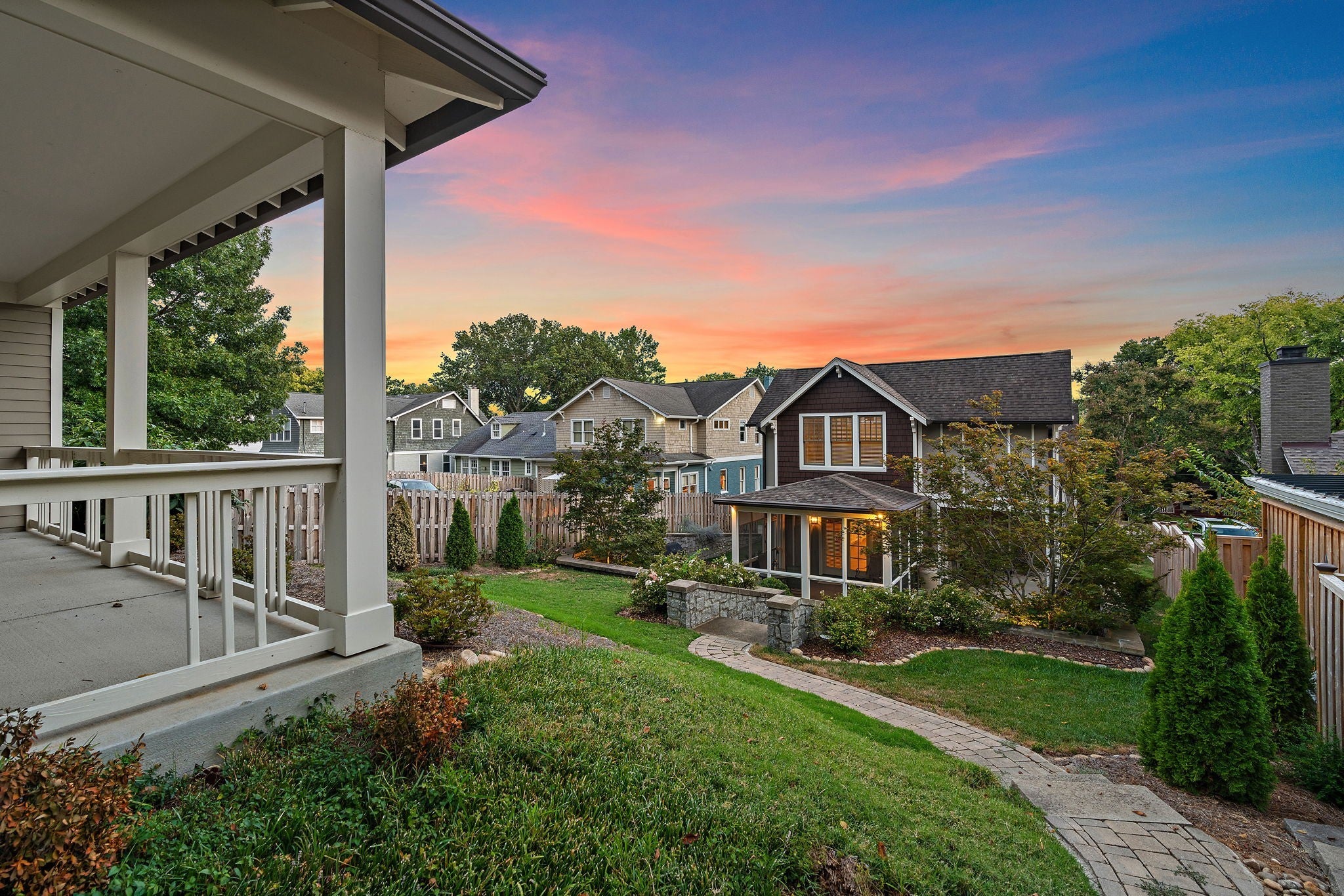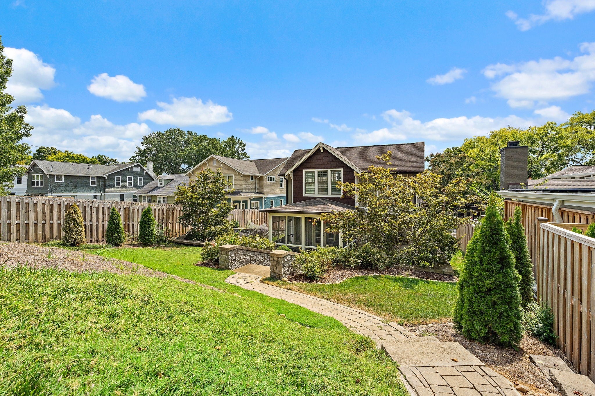 Walkable to 12th South, Hillsboro Village, and so much more, this updated Craftsman style home offers well-planned space with excellent flow and has been meticulously maintained in pristine condition. The main level features a primary suite with a spacious bath including double vanities, a free-standing soaking tub, large shower, and a walk-in closet with natural light. An adjacent room provides flexibility as a study, nursery, or additional living space. The kitchen includes a Dacor 5-burner gas cooktop, KitchenAid double oven and dishwasher, side-by-side refrigerator/freezer, and an oversized island with seating. The kitchen opens to the family room with coffered ceiling and French doors leading to a screened porch and a second covered side porch. A large dining and sitting area, beautiful millwork, and hardwood floors throughout most of the home complete the main level. Upstairs offers three bedrooms, one with en-suite bath, a second full bath, and a spacious flex room that can serve as a bonus room or optional bedroom. An oversized hallway includes an alcove ideal for a home office, plus abundant walk-in attic storage. The beautifully landscaped tiered backyard features a stone path leading to a two-car carport with storage and alley access. Additional off-street parking with step-free entry is also available. If you're looking for the perfect blend of location and charm, this is it. Sidewalks guide you to restaurants, grocery, and shopping. Also, you are minutes from interstate access, Green Hills, Vanderbilt, Belmont and more!