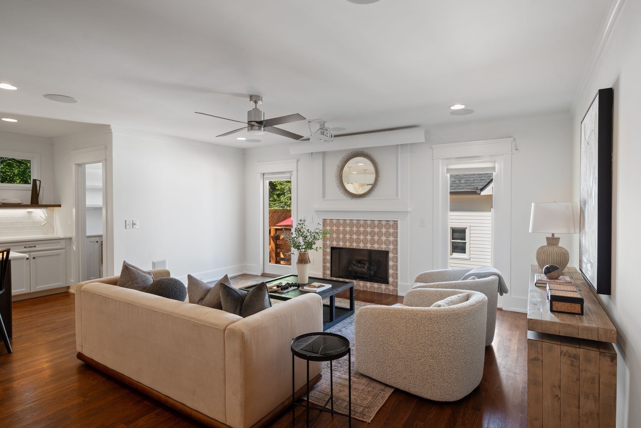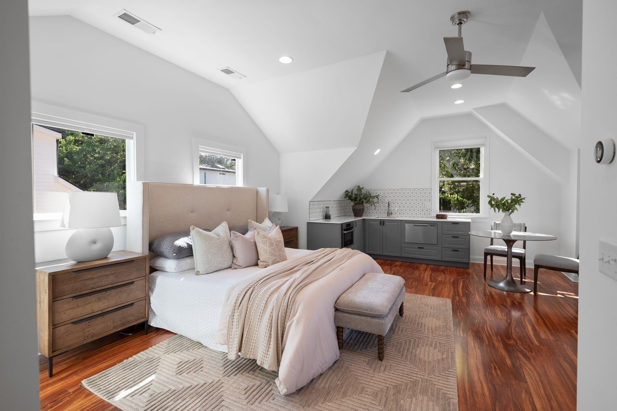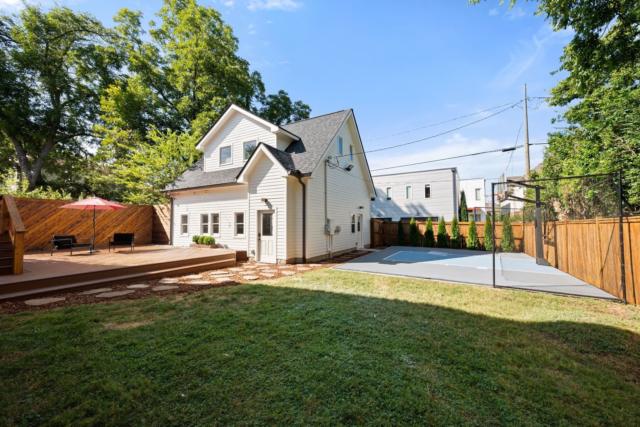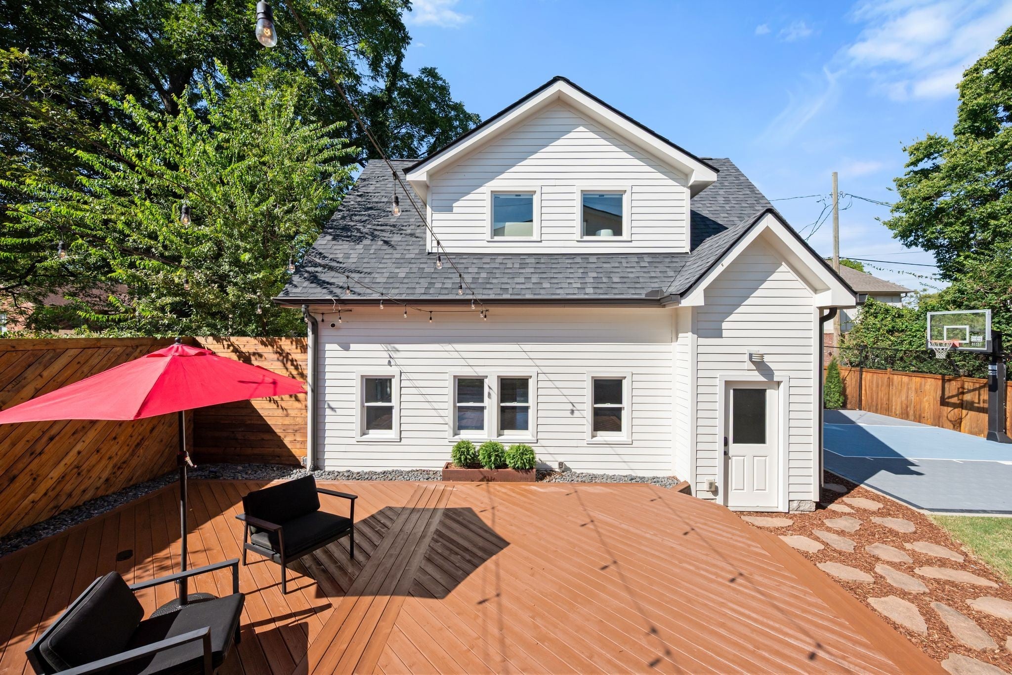 Beautifully renovated historic residence in the heart of walkable Hillsboro West End with that coveted combination of classic charm and contemporary flow.4 bedrooms plus DADU apartment! Front living room with warm hardwood floors leads to an open kitchen, dining, and den area with gas fireplace, thoughtfully designed for casual nights at home or elegant dinner parties. The kitchen sports a large marble island, 36” Bertazzoni range, and a spacious pantry with ample storage. A serene primary suite offers a relaxing retreat with oversized bath complete with a spa-inspired shower, dual separate vanities, and custom walk-in closet. A guest bedroom and full bath are conveniently located on the main level. Upstairs, a flexible bonus room with a wet bar and moveable wall allows for a variety of uses—lounge, home office, or hang space. Two spacious additional bedrooms upstairs, each with walk-in closets and adjoining bath. A versatile hobby room/office includes a Murphy bed and hidden laundry hookups for convenience. Stepping outside the main living area you’ll find a large custom deck with accent fencing, ideal for alfresco entertaining and relaxation. The fully air-conditioned 2 car garage features showroom-quality epoxy flooring, frosted glass garage doors, and a convenient half bath.. and above the garage is a gorgeous, sun splashed apartment with kitchen and luxe bath. The expansive yard provides a sport court with a basketball goal and plenty of room for a pool. Additional amenities include a living room projector with surround sound and retractable screen, whole-home smart lighting, in-ceiling speakers throughout, a spacious basement with extra storage and laundry, landscape lighting, and a delightful side porch with swing!