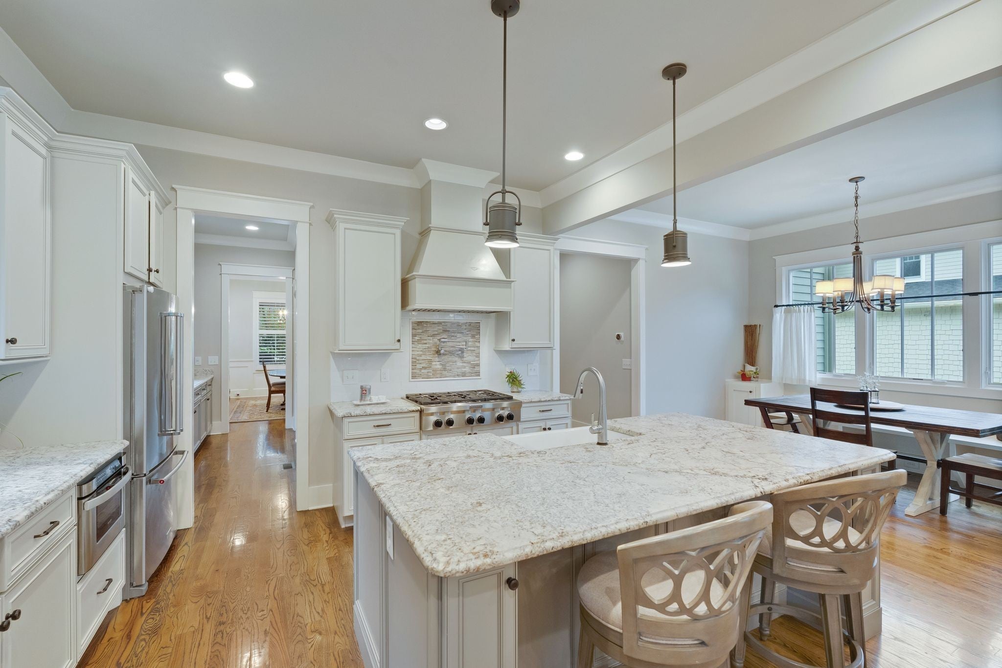 Step into a world where modern elegance meets timeless charm. This stunning home seamlessly blends contemporary design with historic warmth. From vintage inspired fixtures to age-old craftsmanship, every corner tells a story This home is perfectly crrated for those who appreciate the beauty of the past while enjoying the comforts of today! Only a short .5 mile stoll to downtown Franklin this beauty is nestled in Benelli Park, a charming development of 9 unique properties. Relax on the large front porch and recount the days events or enjoy the privacy of the back porch while grilling dinner or entertaining friends. The spacious dining room and the primary suite have lovely bay windows allowing lots of sunshine to brighten the beautiful rooms. Custom moldings and millwork along with the 8 ft doors give will give you a feeling of luxury as you step into the spacious foyer. Fabulous kitchen features leathered granite, double ovens, gas 6 burner cooktop and a built-in microwave. Plenty of workspace for the chef in the family and easy access to a walk-in pantry. The oversized butler's pantry features so many cabinets and an abundance of countertop space! Walk into the great room and enjoy the built-in's on each side of the gas fireplace - from the great room step onto the back-porch and into the level private backyard; perfect for entertaining and backyard barbecues. As you walk upstairs the workspace/home office is centrally located, 3 large bedrooms and a bonus room - which will remind you of a large sleeping porch in a historic home! Don't miss the walk-out storage off the bonus room. Awesome upstairs laundry room - plus there are washer and dryer connections in the large downstairs primary bedroom closet! This home is so captivating and being located in Historic Franklin is just icing on the cake!