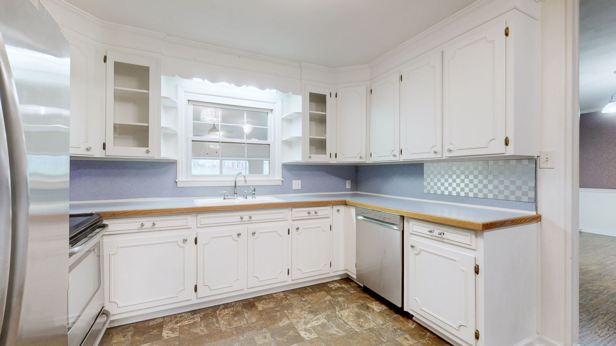 - Electric Range, Dishwasher, Ice Maker, Refrigerator, Stainless Steel Appliance(s)