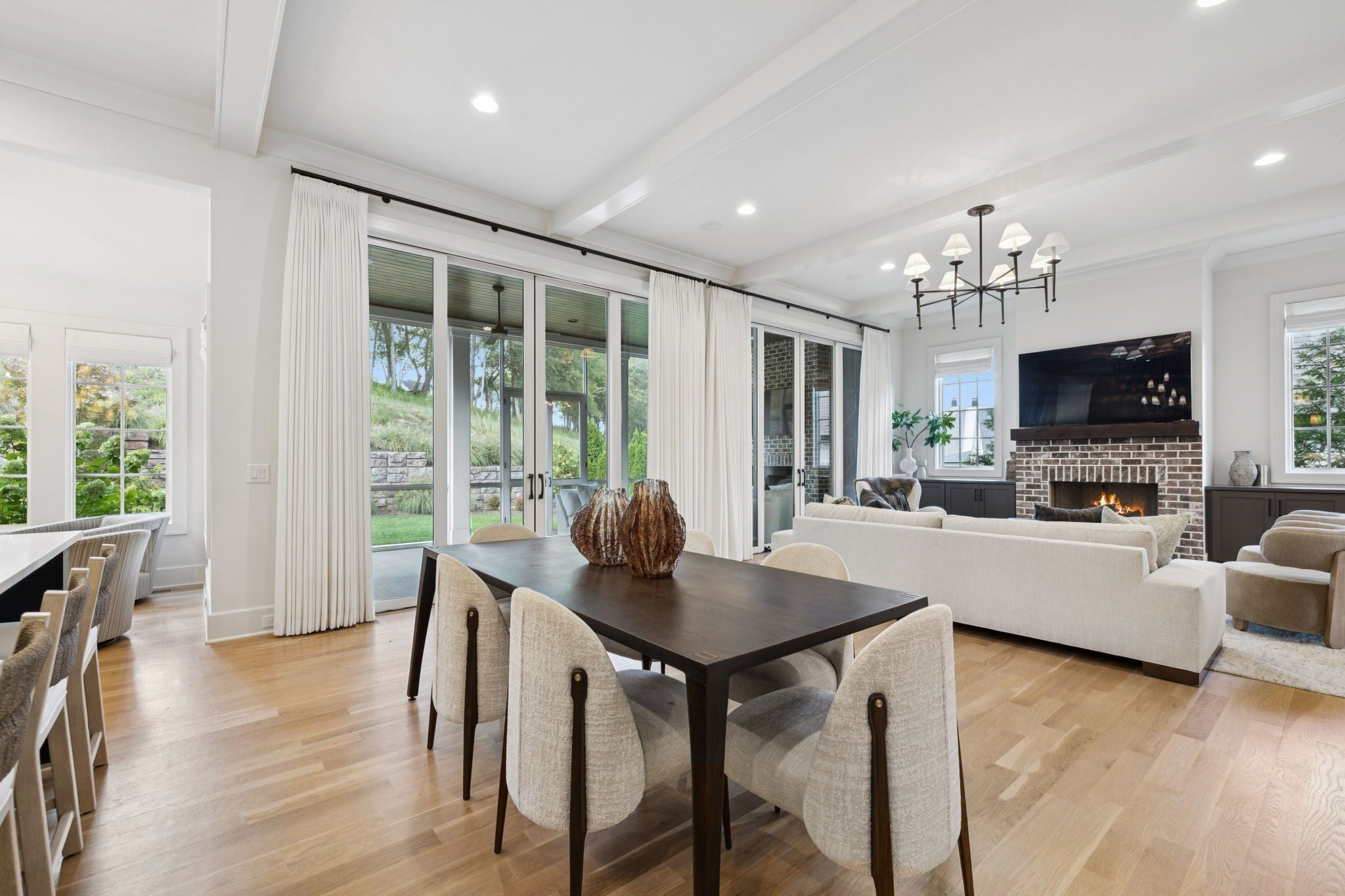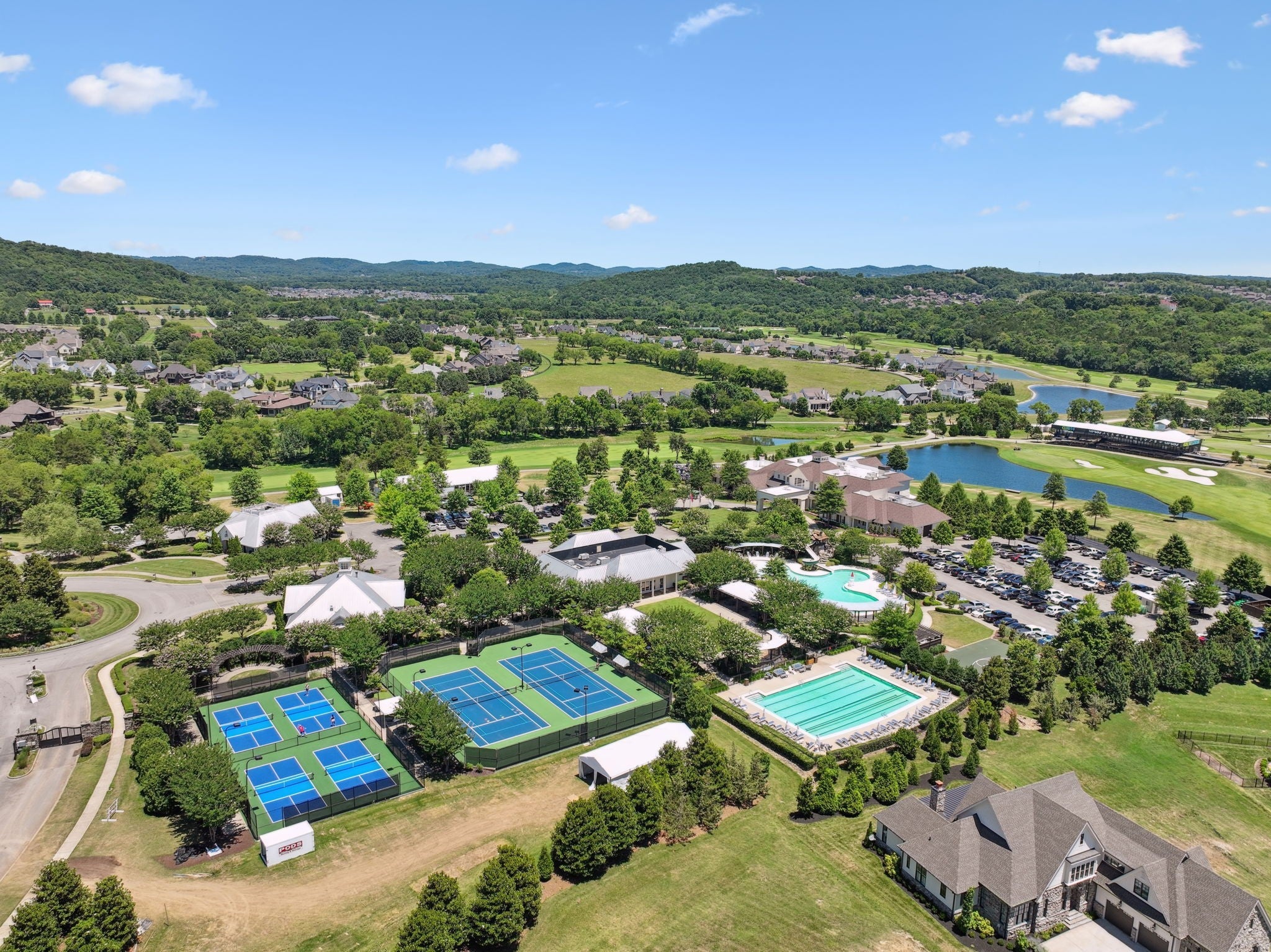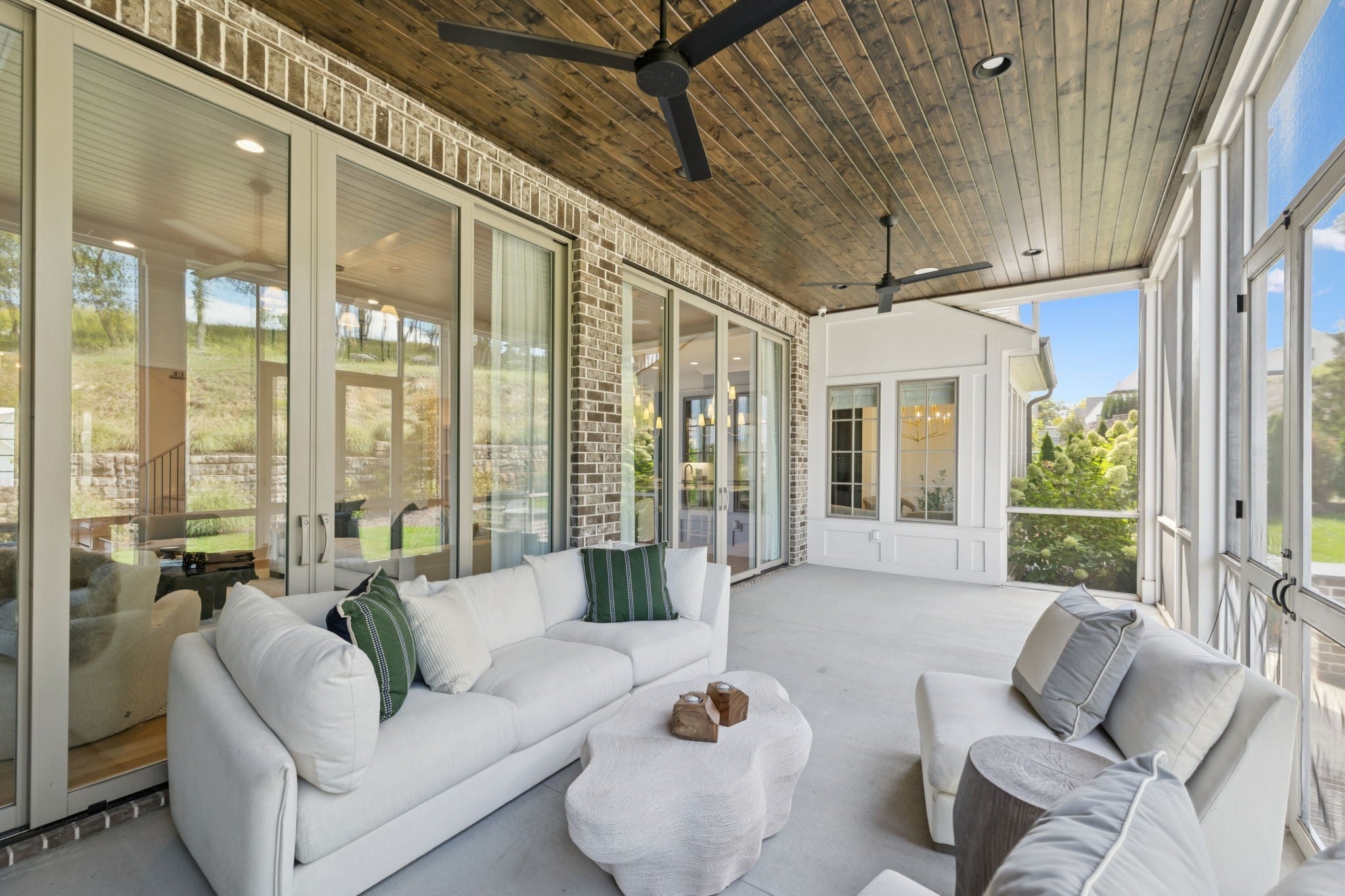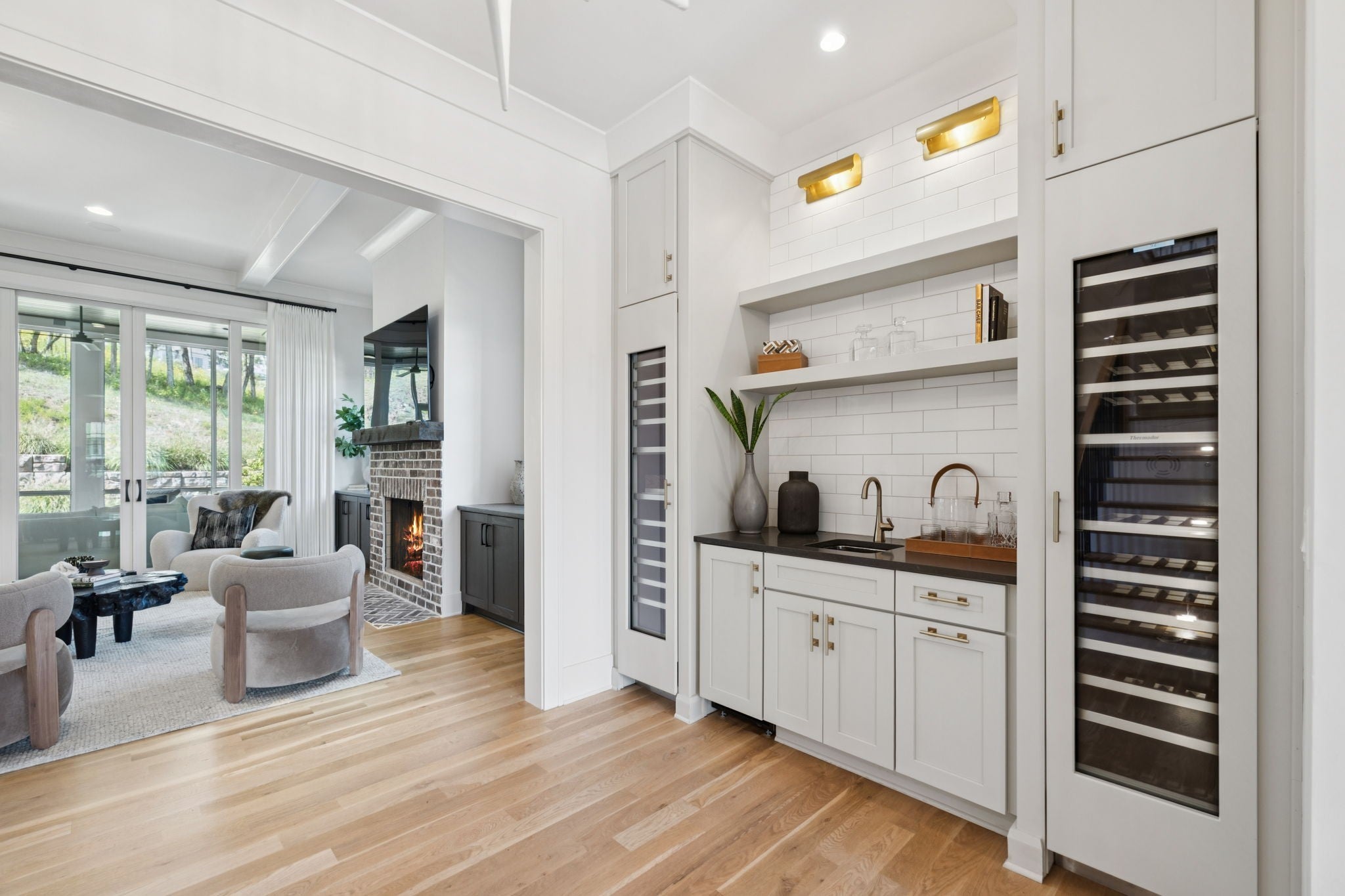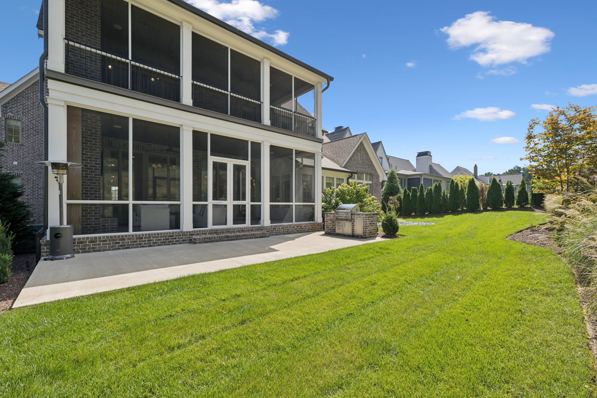 Gorgeous modern Tudor-style brick home in The Grove, one of Middle Tennessee’s most sought-after gated communities. Offering resort-style living, residents enjoy a world-class spa, clubhouse, Greg Norman Signature golf course, fishing lakes, fine and casual dining, racquet courts, equestrian facilities, sports fields, walking trails, and multiple pools. Step inside to a welcoming foyer that leads to a private office with custom built-ins and wainscoting, accented by designer lighting. A stylish wet bar with paneled Thermador wine fridges and an ice maker sets the stage for effortless entertaining. The open-concept living room is anchored by a brick fireplace with custom cabinetry, flowing seamlessly into a chef’s kitchen with custom-panel appliances, pull-out cabinet drawers, and a sink equipped with filtered water and instant hot water. A generous pantry with open shelving and cabinetry provides both storage and prep space. The vaulted primary suite is a retreat with shiplap accents, a spa-like bath featuring a soaking tub, floor-to-ceiling tile shower, checkered tile flooring, and a walk-in closet with center vanity. A guest suite with private bath and powder room complete the main level. Upstairs, a vaulted rec room with surround sound and fireplace opens to a screened porch—perfect for game nights or relaxed evenings. Enjoy Tennessee living year-round with a peaceful backyard featuring a screened porch with wood-burning fireplace, built-in gas grill, and patio with room for a future pool. Additional highlights include custom draperies, a sealed crawl space, and convenient access just two minutes from the back gate. Blending timeless design with modern luxury, this home offers both elegance and comfort in a community where every day feels like a getaway.