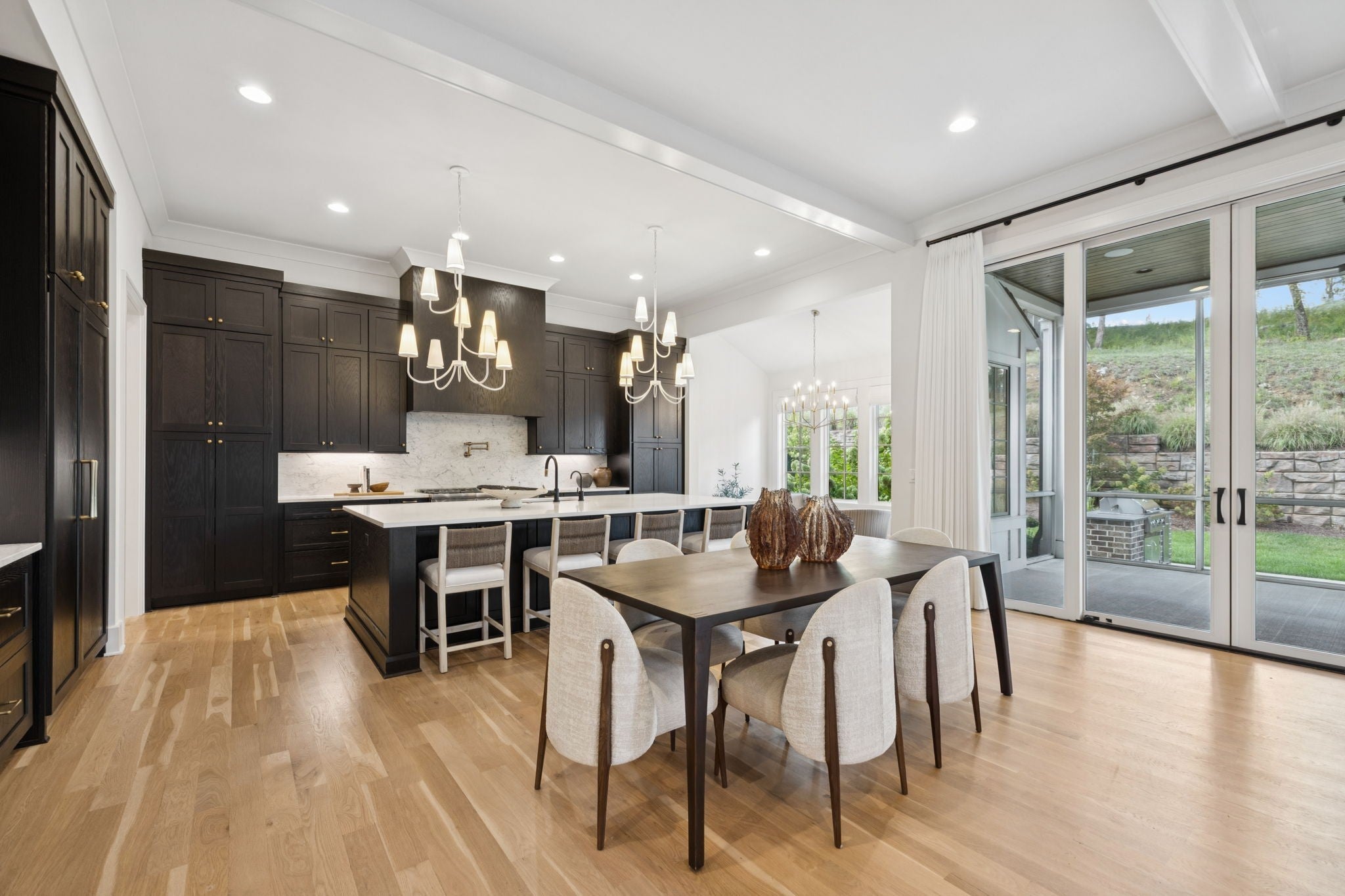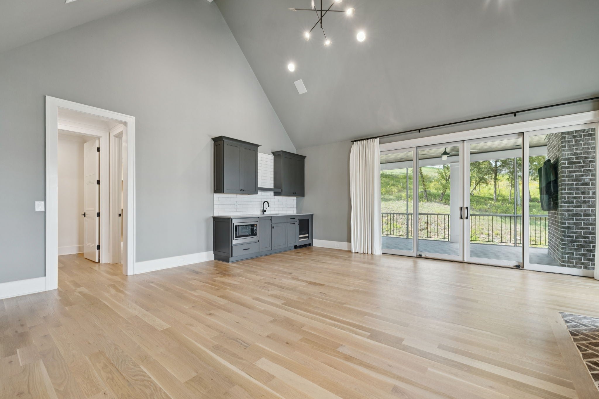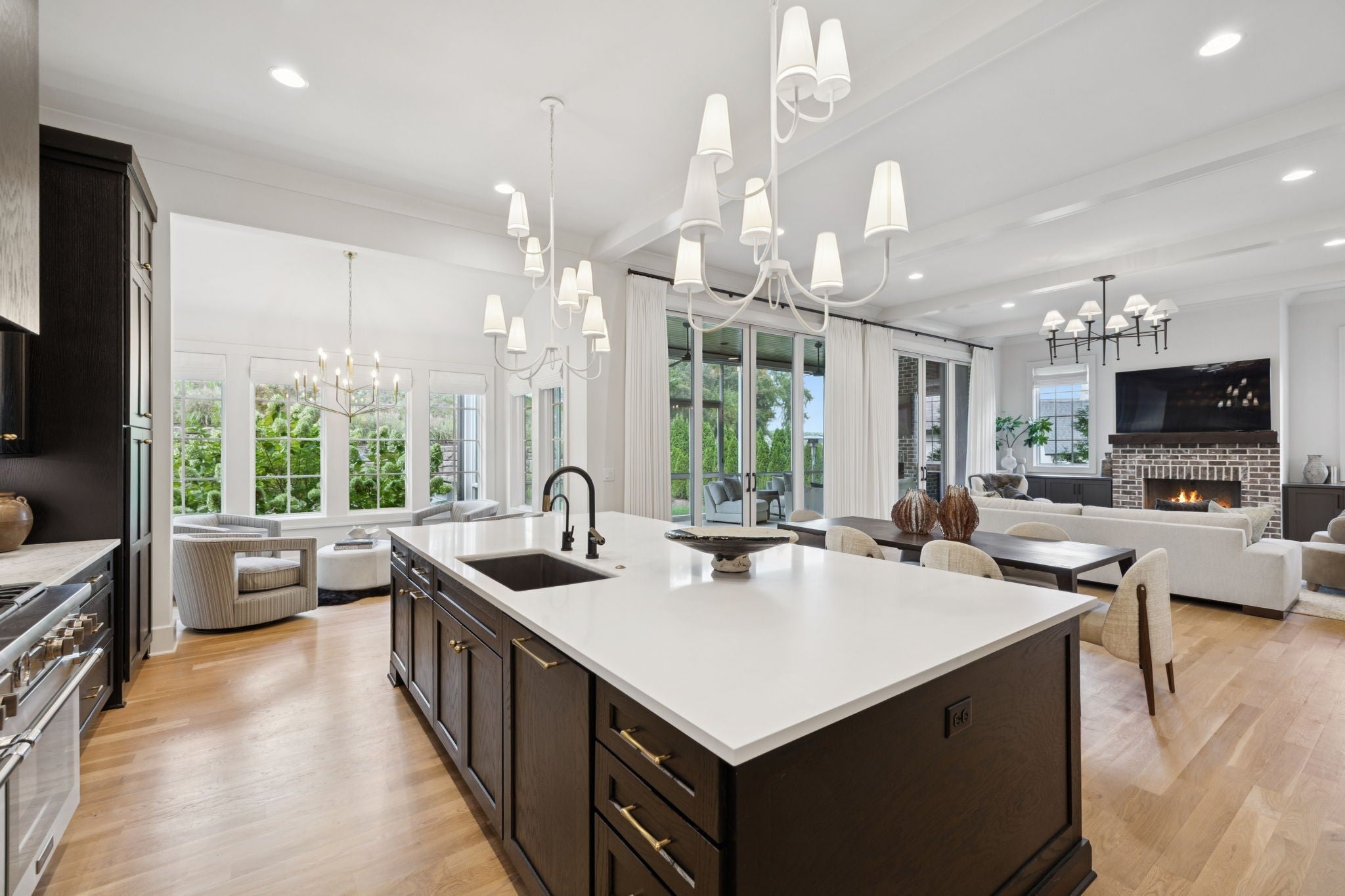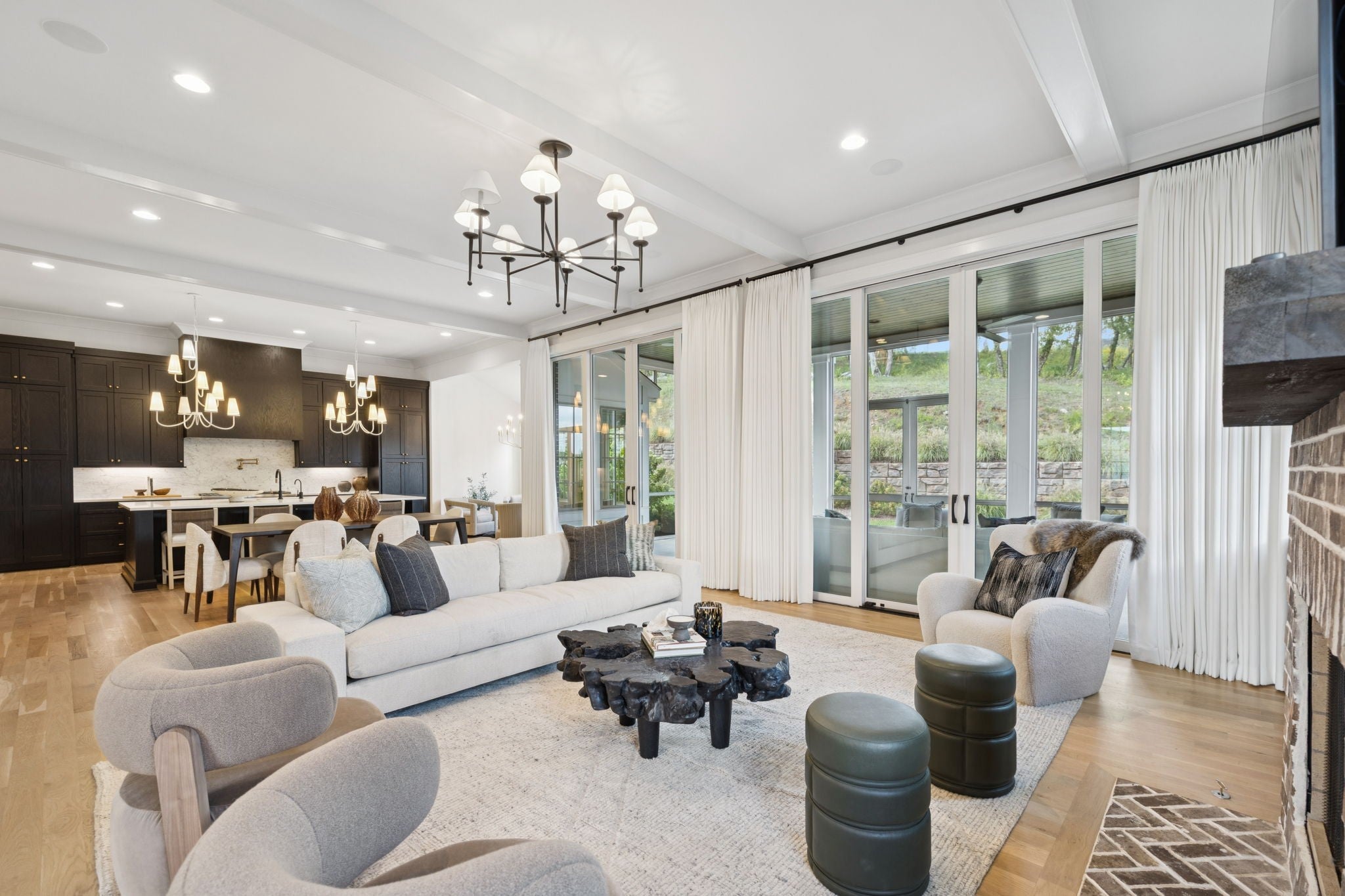 Gorgeous modern Tudor-style brick home in The Grove, one of Middle Tennessee’s most sought-after gated communities. Offering resort-style living, residents enjoy a world-class spa, clubhouse, Greg Norman Signature golf course, fishing lakes, fine and casual dining, racquet courts, equestrian facilities, sports fields, walking trails, and multiple pools. Step inside to a welcoming foyer that leads to a private office with custom built-ins and wainscoting, accented by designer lighting. A stylish wet bar with paneled Thermador wine fridges and an ice maker sets the stage for effortless entertaining. The open-concept living room is anchored by a brick fireplace with custom cabinetry, flowing seamlessly into a chef’s kitchen with custom-panel appliances, pull-out cabinet drawers, and a sink equipped with filtered water and instant hot water. A generous pantry with open shelving and cabinetry provides both storage and prep space. The vaulted primary suite is a retreat with shiplap accents, a spa-like bath featuring a soaking tub, floor-to-ceiling tile shower, checkered tile flooring, and a walk-in closet with center vanity. A guest suite with private bath and powder room complete the main level. Upstairs, a vaulted rec room with surround sound and fireplace opens to a screened porch—perfect for game nights or relaxed evenings. Enjoy Tennessee living year-round with a peaceful backyard featuring a screened porch with wood-burning fireplace, built-in gas grill, and patio with room for a future pool. Additional highlights include custom draperies, a sealed crawl space, and convenient access just two minutes from the back gate. Blending timeless design with modern luxury, this home offers both elegance and comfort in a community where every day feels like a getaway.