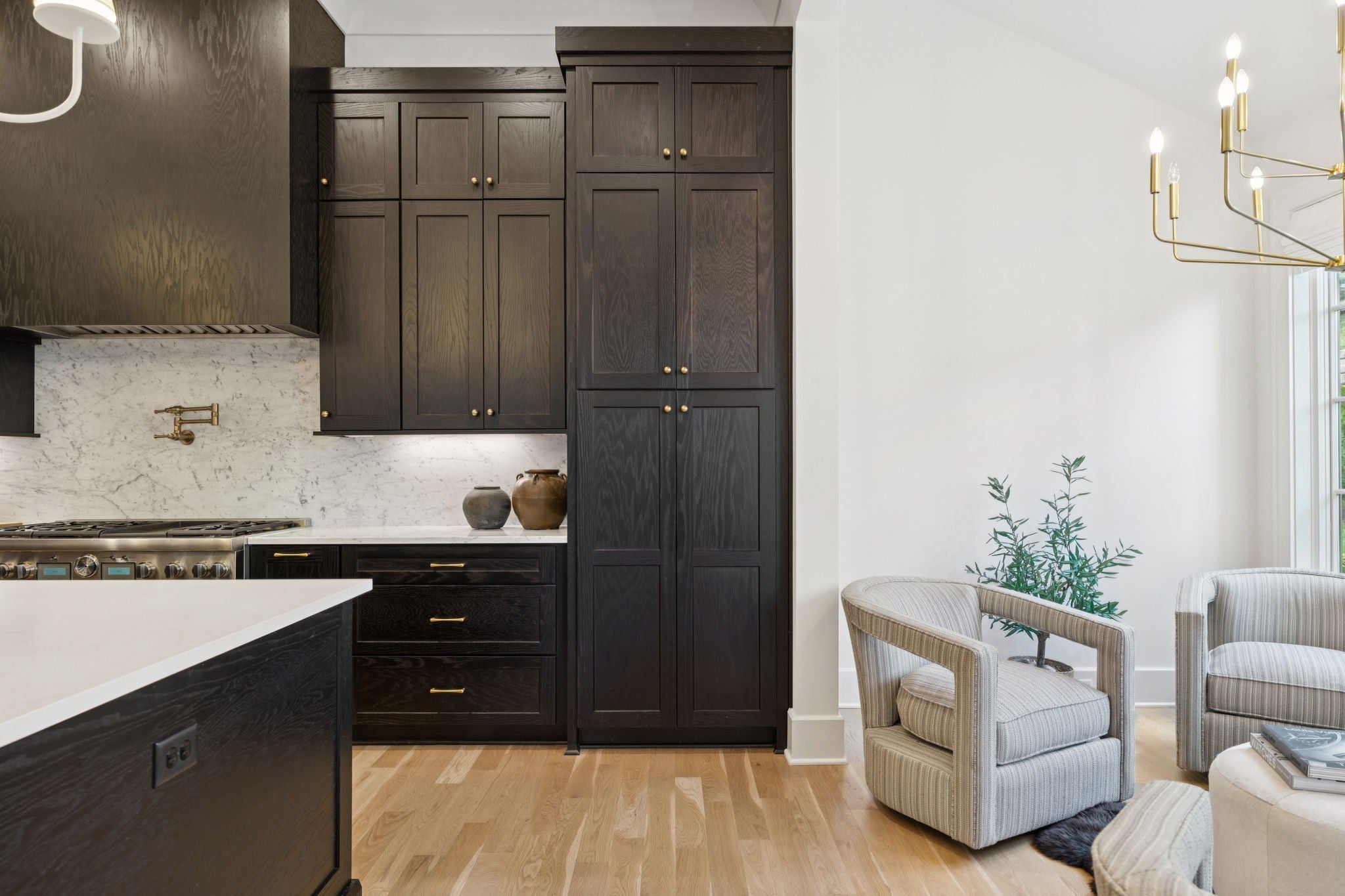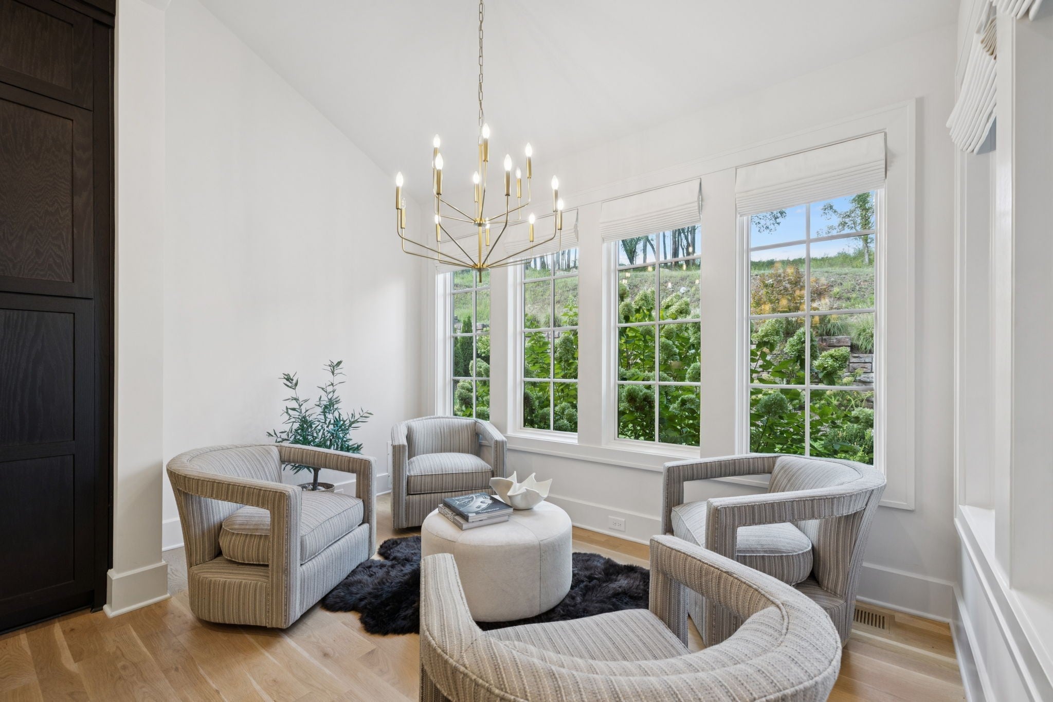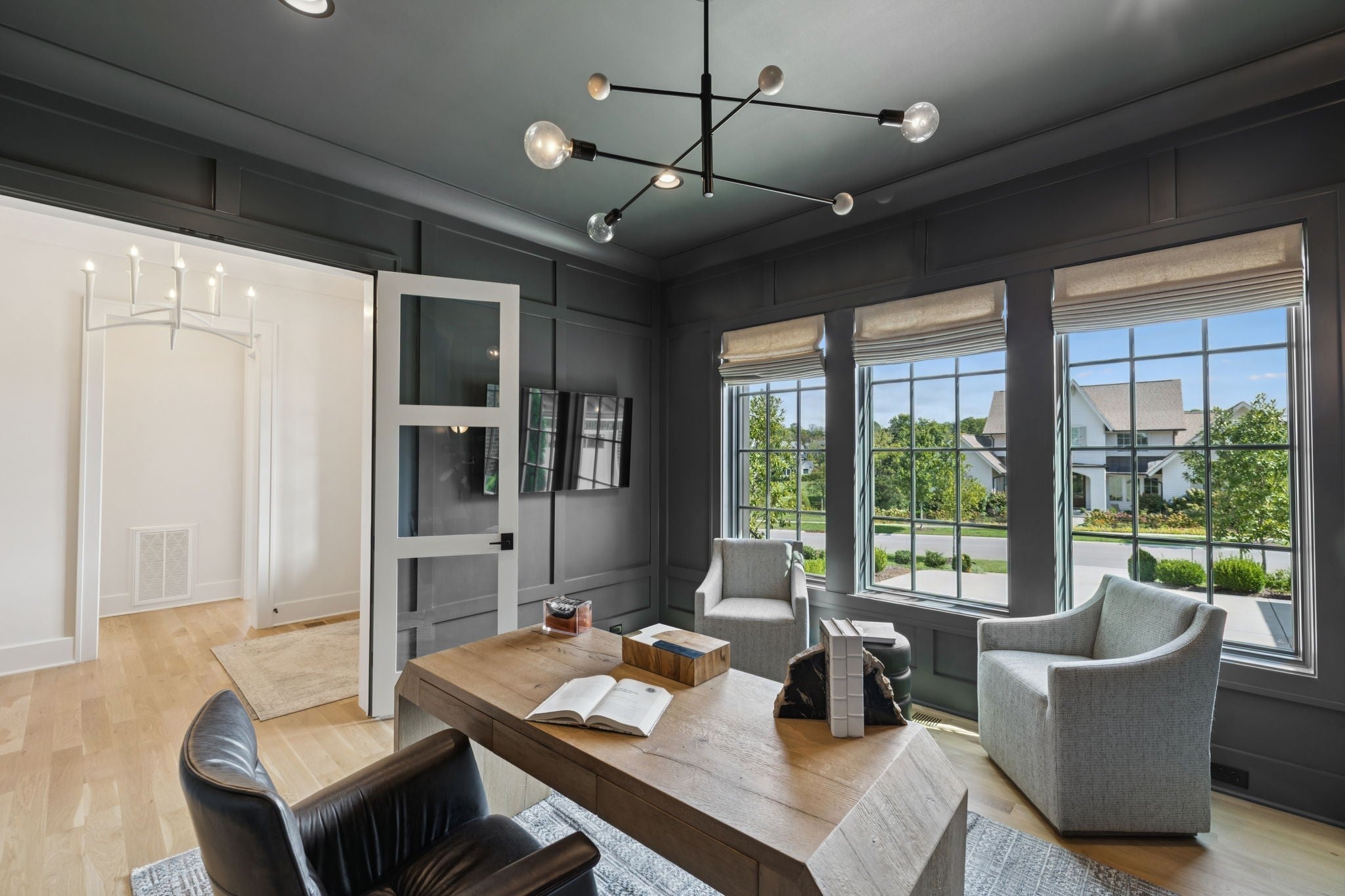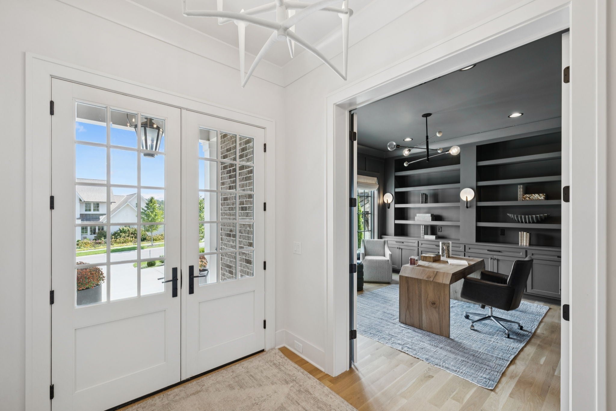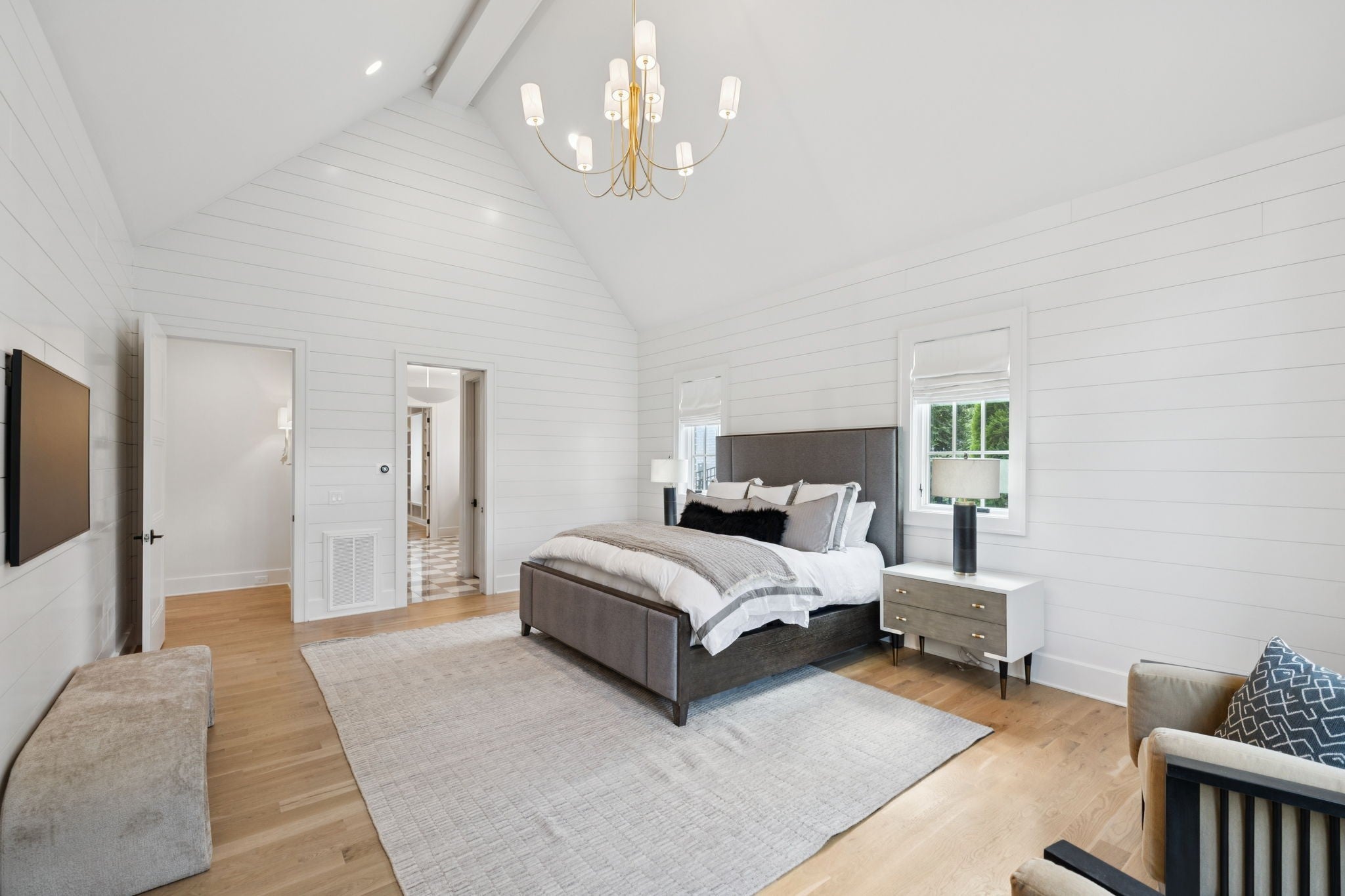 Gorgeous modern Tudor-style brick home in The Grove, one of Middle Tennessee’s most sought-after gated communities. Offering resort-style living, residents enjoy a world-class spa, clubhouse, Greg Norman Signature golf course, fishing lakes, fine and casual dining, racquet courts, equestrian facilities, sports fields, walking trails, and multiple pools. Step inside to a welcoming foyer that leads to a private office with custom built-ins and wainscoting, accented by designer lighting. A stylish wet bar with paneled Thermador wine fridges and an ice maker sets the stage for effortless entertaining. The open-concept living room is anchored by a brick fireplace with custom cabinetry, flowing seamlessly into a chef’s kitchen with custom-panel appliances, pull-out cabinet drawers, and a sink equipped with filtered water and instant hot water. A generous pantry with open shelving and cabinetry provides both storage and prep space. The vaulted primary suite is a retreat with shiplap accents, a spa-like bath featuring a soaking tub, floor-to-ceiling tile shower, checkered tile flooring, and a walk-in closet with center vanity. A guest suite with private bath and powder room complete the main level. Upstairs, a vaulted rec room with surround sound and fireplace opens to a screened porch—perfect for game nights or relaxed evenings. Enjoy Tennessee living year-round with a peaceful backyard featuring a screened porch with wood-burning fireplace, built-in gas grill, and patio with room for a future pool. Additional highlights include custom draperies, a sealed crawl space, and convenient access just two minutes from the back gate. Blending timeless design with modern luxury, this home offers both elegance and comfort in a community where every day feels like a getaway.