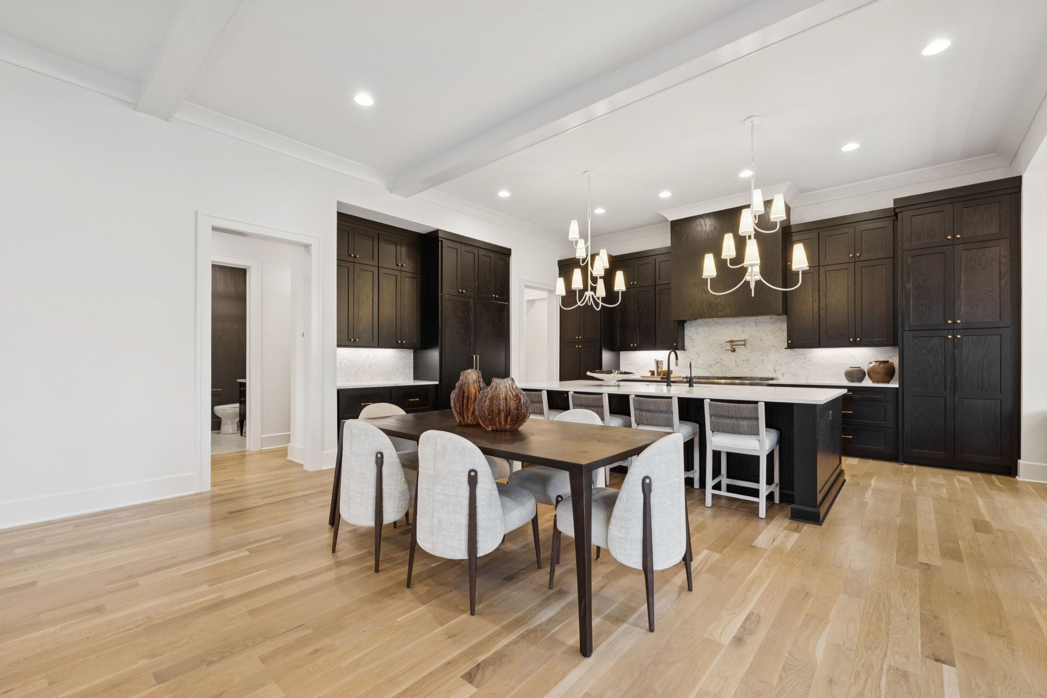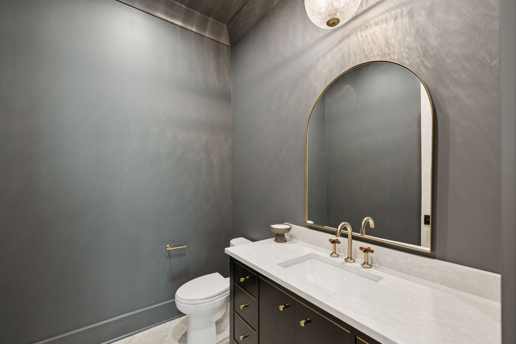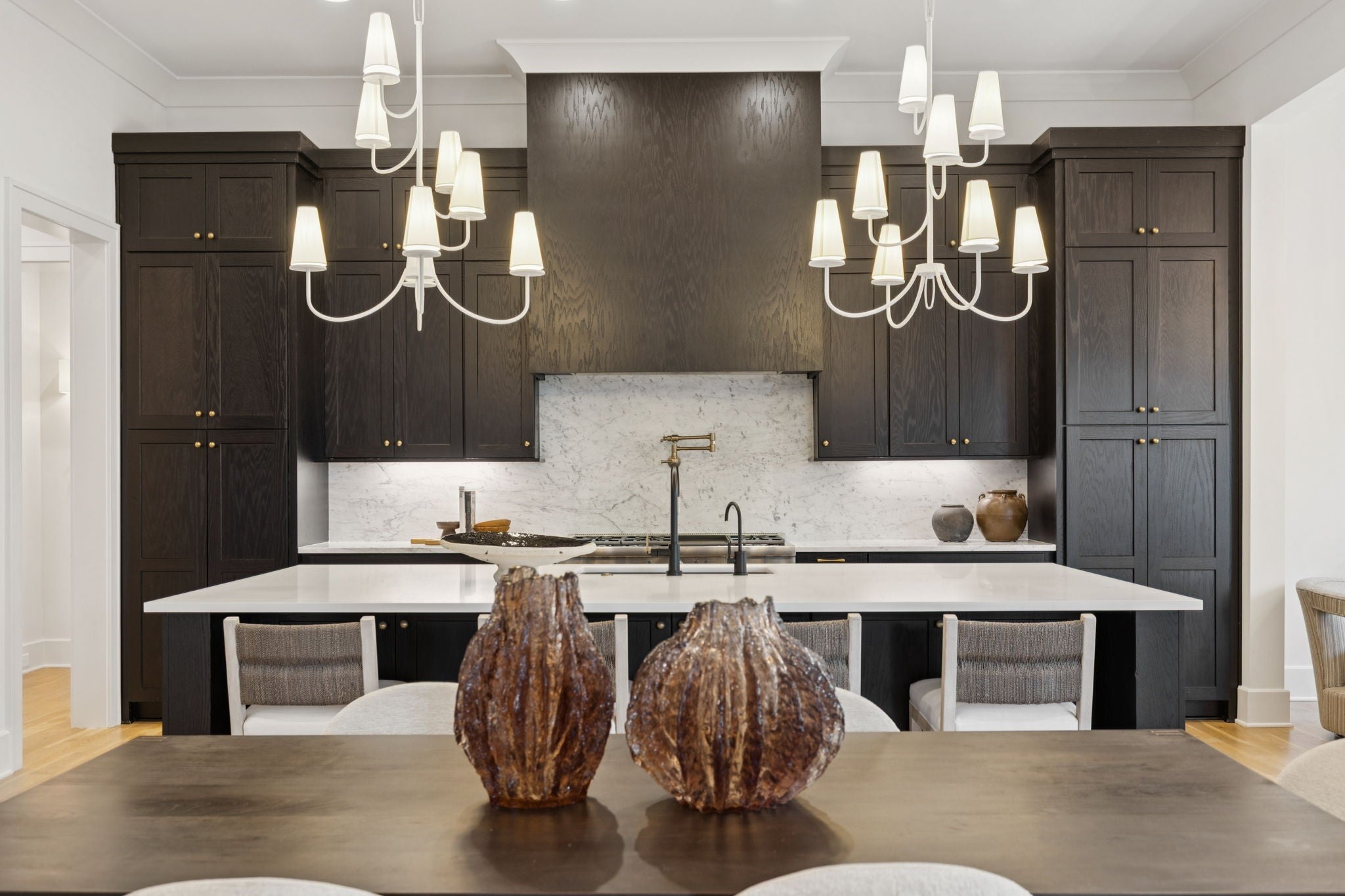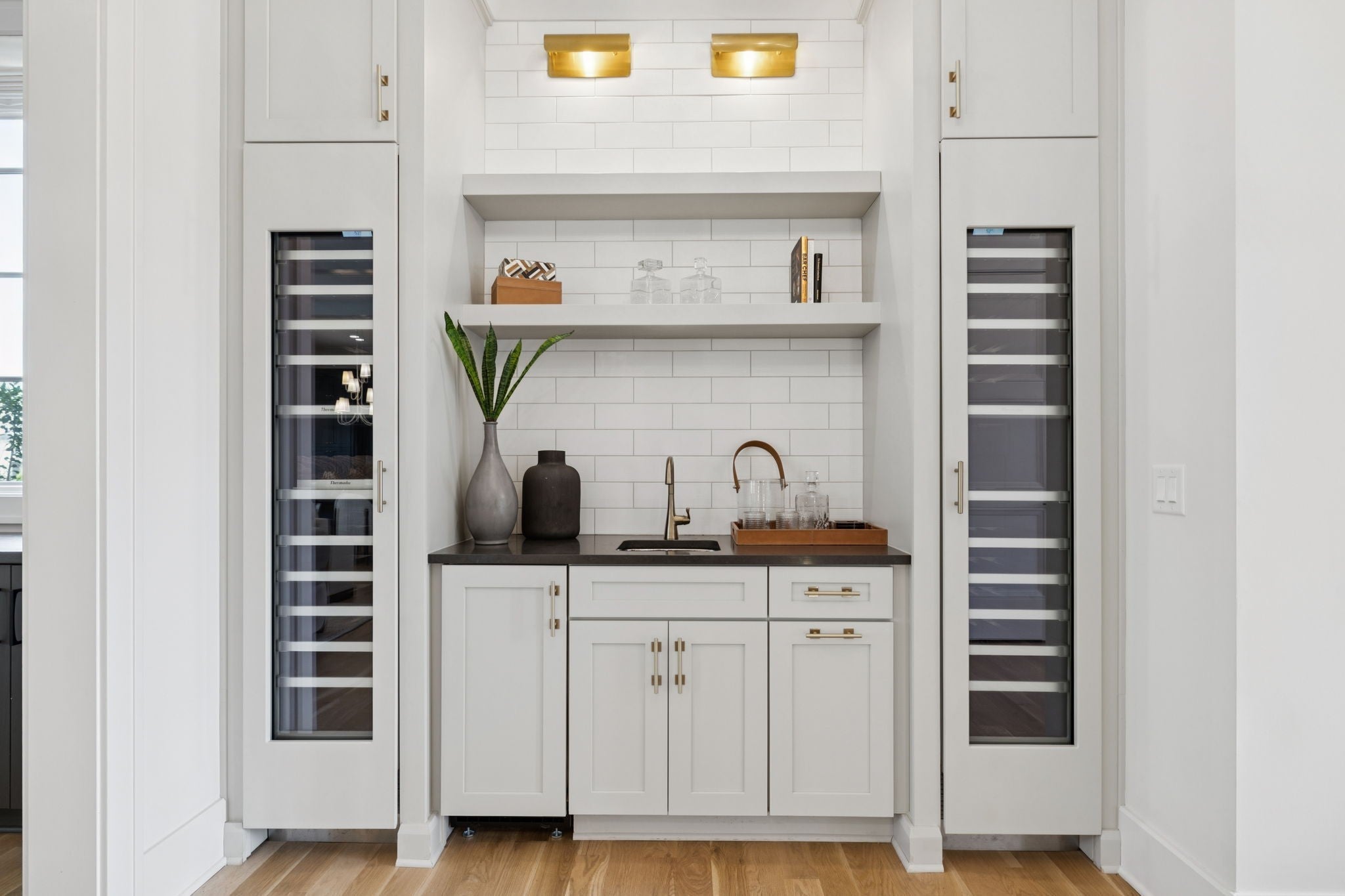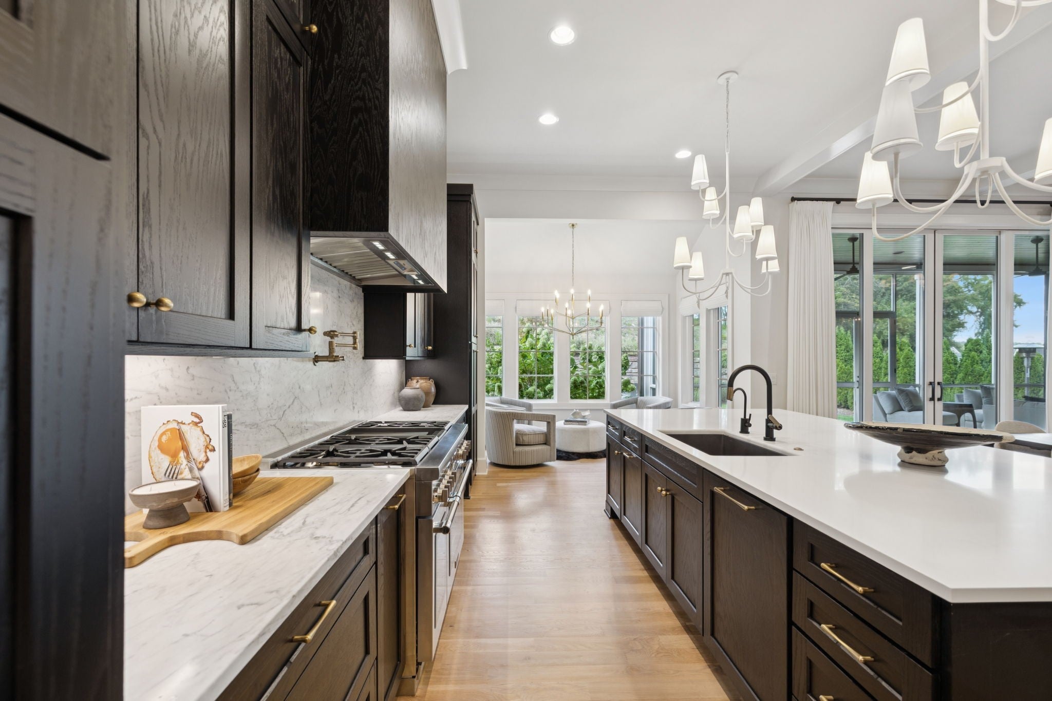 Gorgeous modern Tudor-style brick home in The Grove, one of Middle Tennessee’s most sought-after gated communities. Offering resort-style living, residents enjoy a world-class spa, clubhouse, Greg Norman Signature golf course, fishing lakes, fine and casual dining, racquet courts, equestrian facilities, sports fields, walking trails, and multiple pools. Step inside to a welcoming foyer that leads to a private office with custom built-ins and wainscoting, accented by designer lighting. A stylish wet bar with paneled Thermador wine fridges and an ice maker sets the stage for effortless entertaining. The open-concept living room is anchored by a brick fireplace with custom cabinetry, flowing seamlessly into a chef’s kitchen with custom-panel appliances, pull-out cabinet drawers, and a sink equipped with filtered water and instant hot water. A generous pantry with open shelving and cabinetry provides both storage and prep space. The vaulted primary suite is a retreat with shiplap accents, a spa-like bath featuring a soaking tub, floor-to-ceiling tile shower, checkered tile flooring, and a walk-in closet with center vanity. A guest suite with private bath and powder room complete the main level. Upstairs, a vaulted rec room with surround sound and fireplace opens to a screened porch—perfect for game nights or relaxed evenings. Enjoy Tennessee living year-round with a peaceful backyard featuring a screened porch with wood-burning fireplace, built-in gas grill, and patio with room for a future pool. Additional highlights include custom draperies, a sealed crawl space, and convenient access just two minutes from the back gate. Blending timeless design with modern luxury, this home offers both elegance and comfort in a community where every day feels like a getaway.