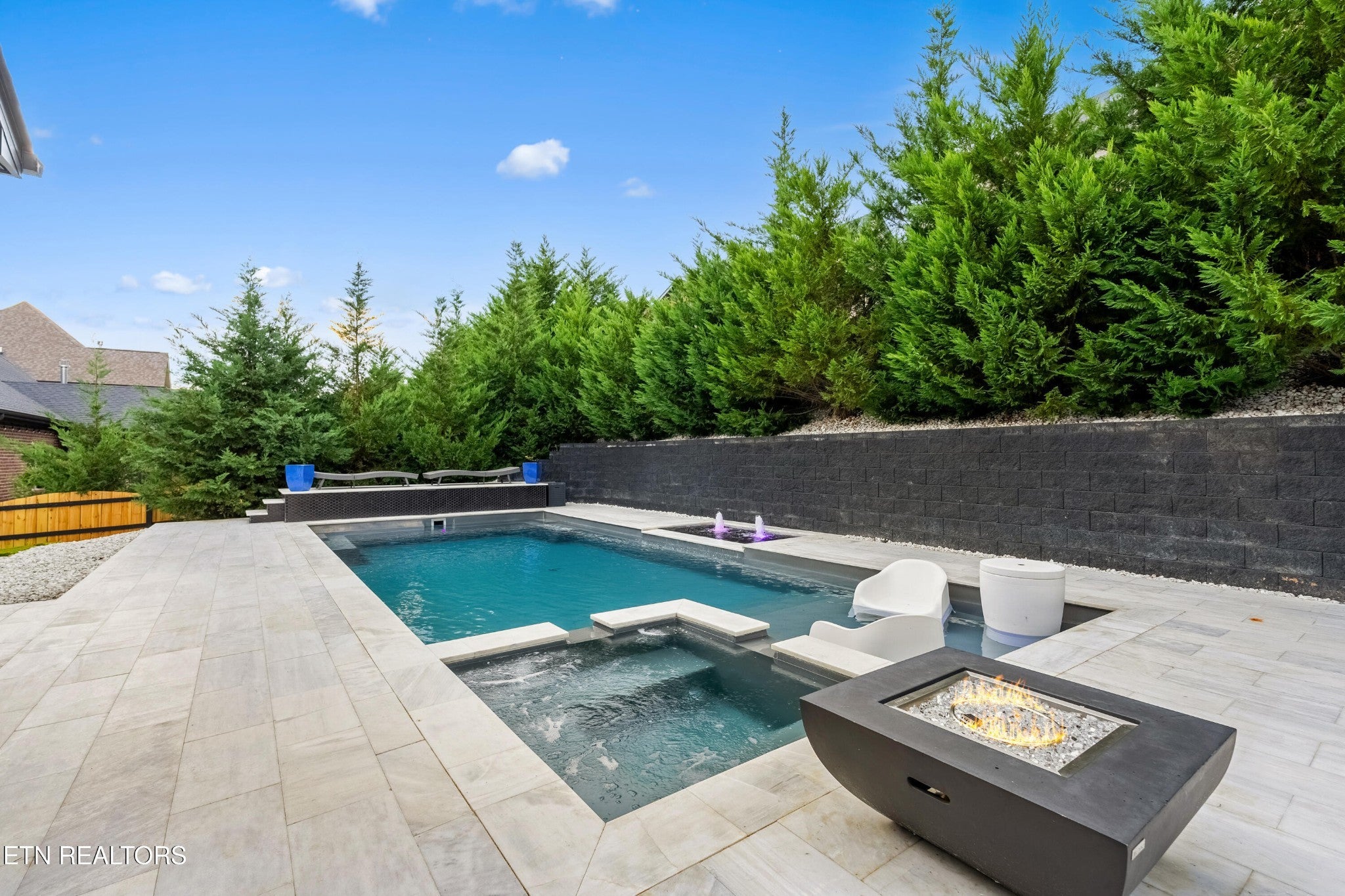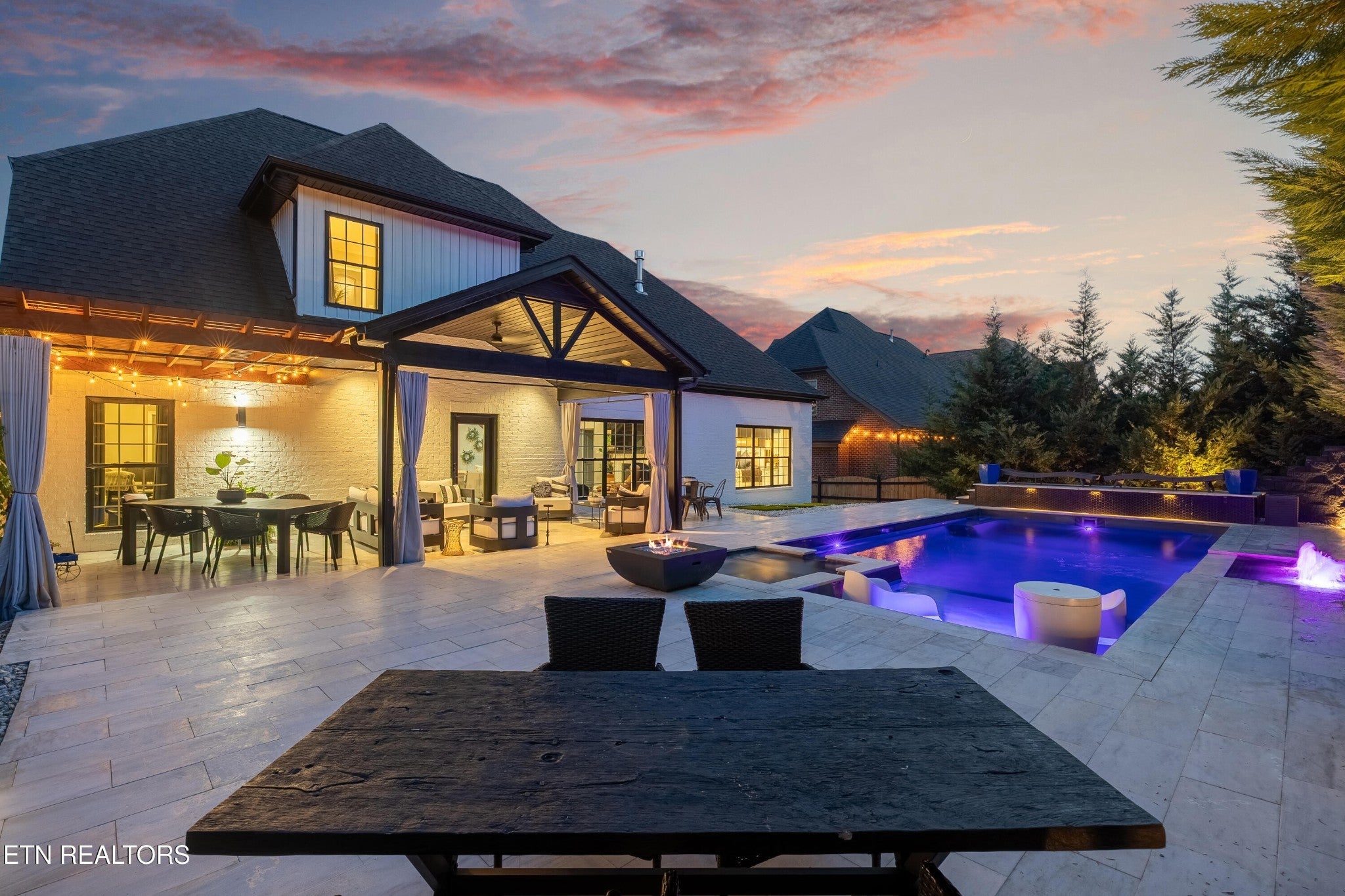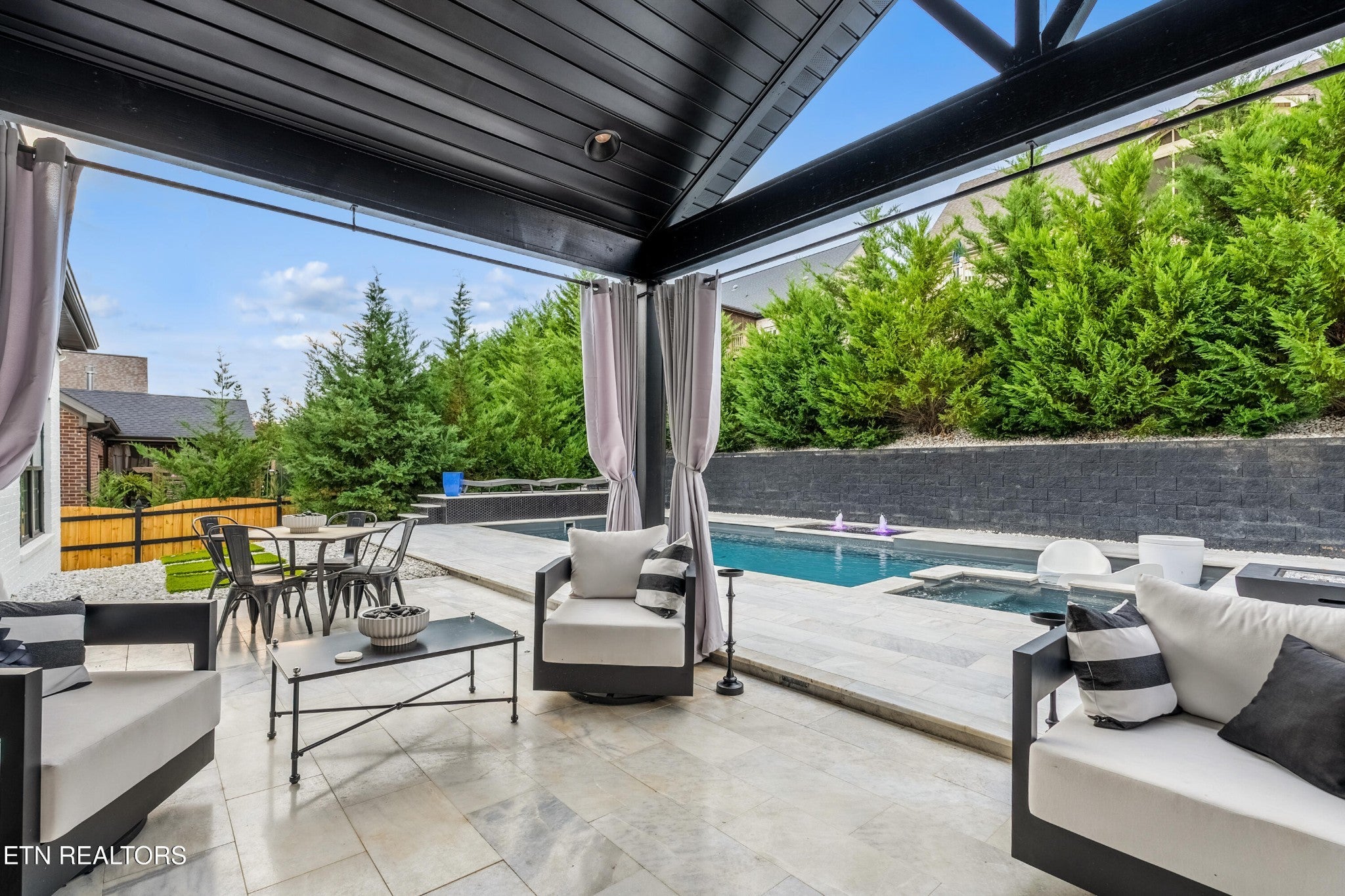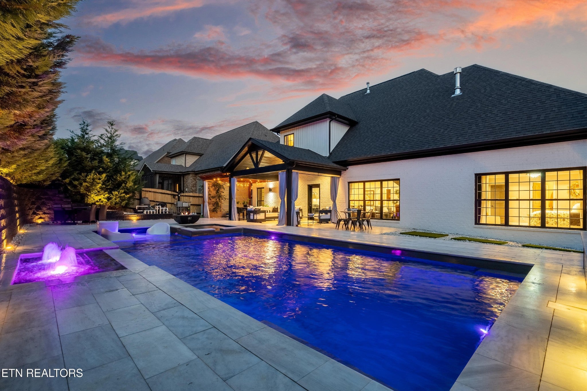 Back on Market! Buyers contingent sale fell through - no fault of seller. Modern, luxurious, and stunning, this home is perfectly situated in the highly sought after Massey Creek subdivision. Thoughtfully designed with upscale finishes and meticulous craftsmanship, this residence delivers an exceptional living experience from the inviting covered front porch to the private backyard retreat. Step inside to an open, light-filled floor plan that showcases refined details at every turn. A chef's kitchen is designed to impress, featuring gleaming marble countertops, 42-inch premium cabinetry, under-cabinet lighting, a spacious island, and high-end appliances. The formal dining room, graced with a sparkling chandelier, sets the stage for unforgettable dinners. The main level primary suite offers a serene escape with a built-in electric fireplace, spa-inspired bath with a glass-enclosed shower, soaking tub, dual vanities, and a custom walk-in closet. The living room combines warmth and sophistication with its marble-tiled gas fireplace and eye-catching custom accent wall. Nine-foot ceilings and designer lighting throughout elevate the home's contemporary style. A second main-level bedroom, currently used as an office, is adjacent to a full bath and thoughtfully placed laundry room with extra storage. The second floor features two additional bedrooms along with a beautifully appointed bath, complete with dual vanities, leathered granite countertops and a tiled tub/shower. Additionally, a spacious bonus room, currently set up as a lavish guest suite, could also serve as a playroom or media room. Outdoors, the professionally landscaped backyard is a true oasis, highlighted by a heated saltwater pool with an integrated spa and lighted fountains. Enhancing the sleek design, the marble pool coping complements a striking covered patio featuring a new privacy-enhancing pergola - perfect for entertaining or unwinding in style.