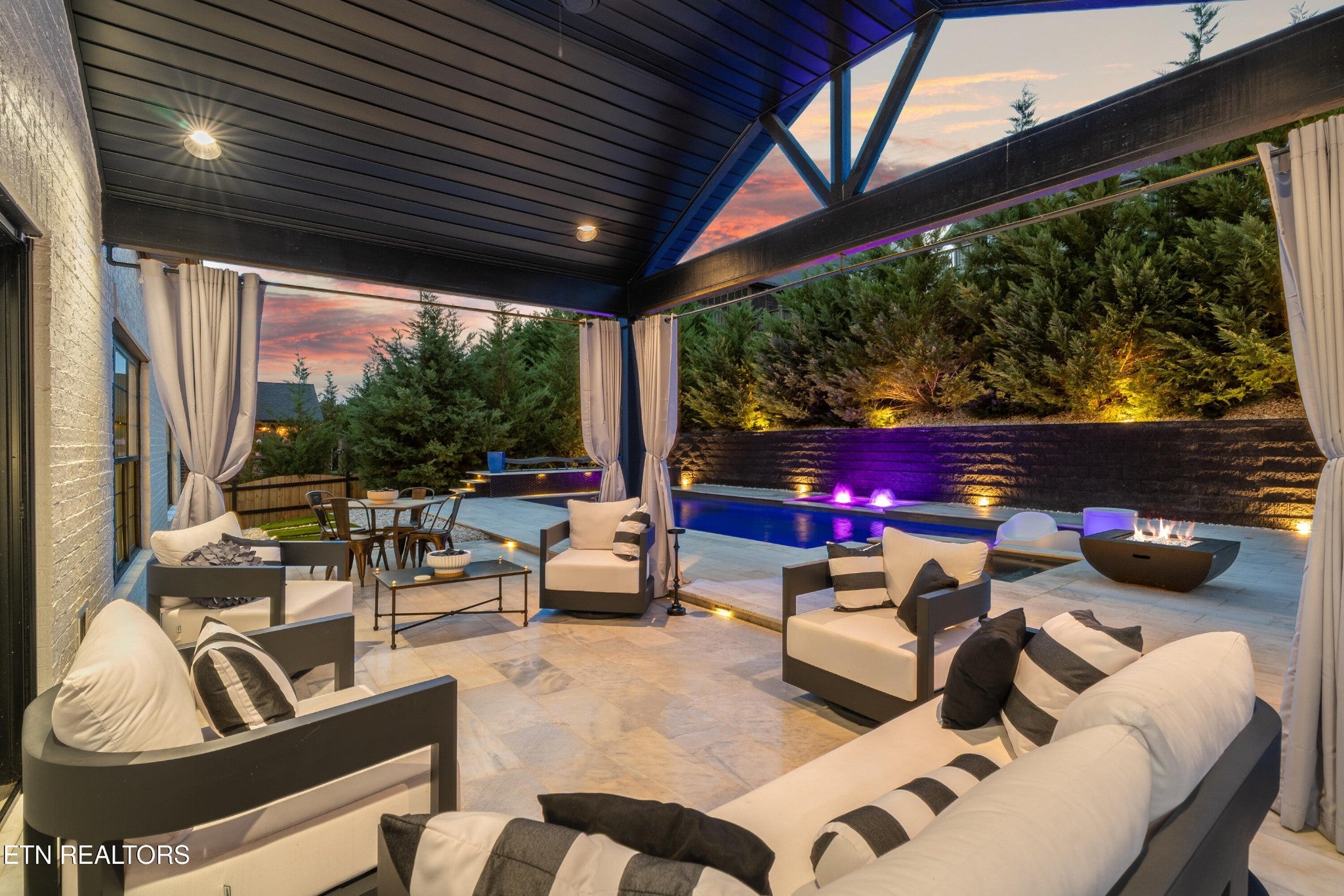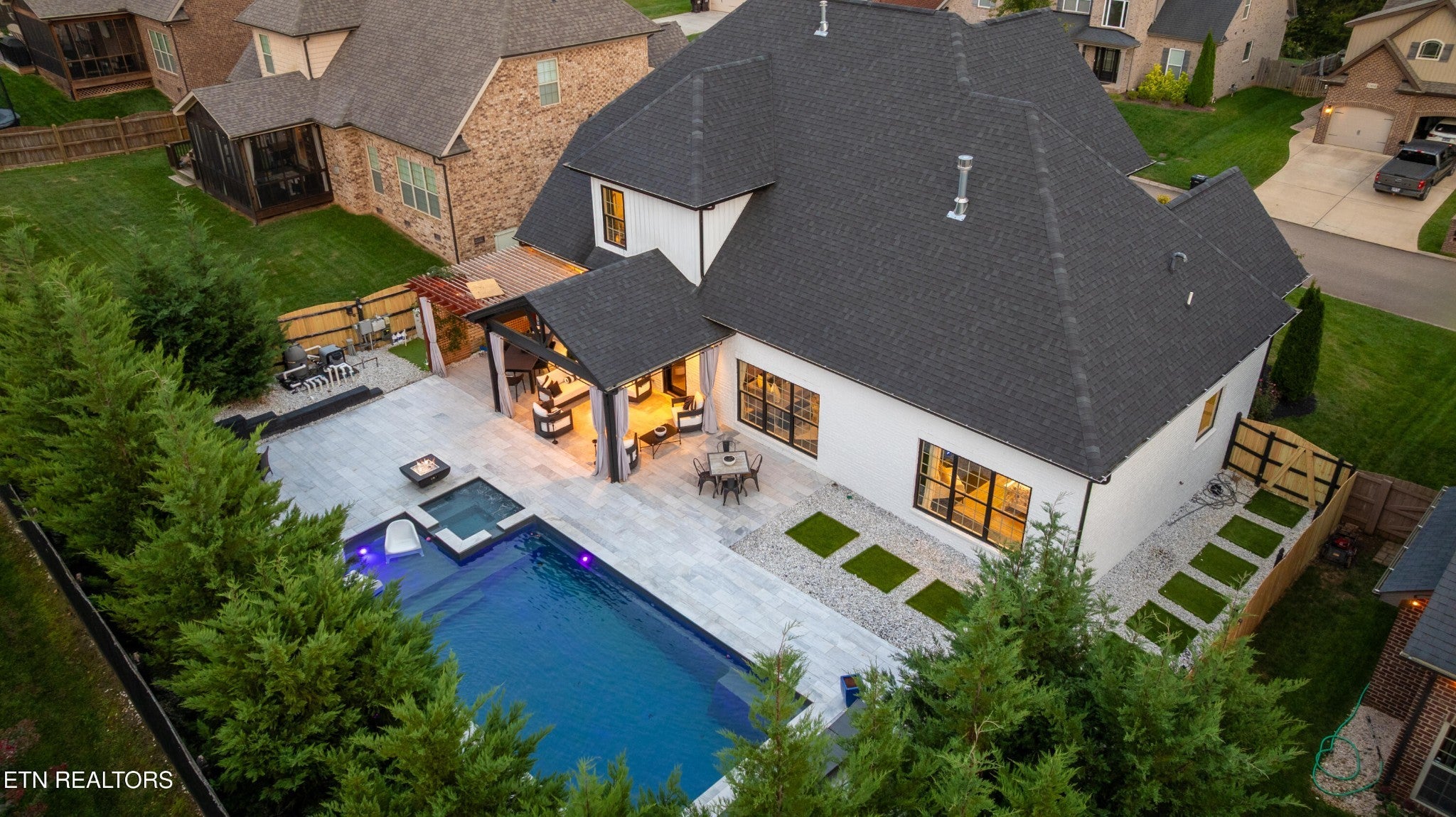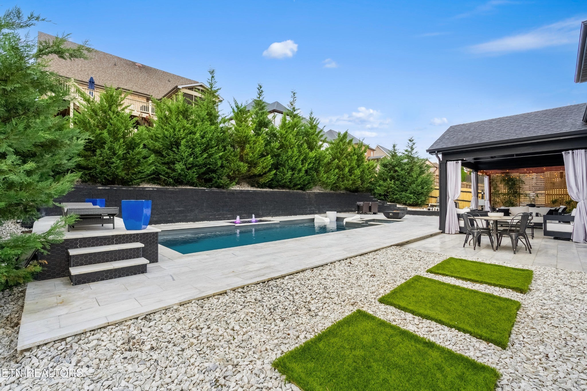 Back on Market! Buyers contingent sale fell through - no fault of seller. Modern, luxurious, and stunning, this home is perfectly situated in the highly sought after Massey Creek subdivision. Thoughtfully designed with upscale finishes and meticulous craftsmanship, this residence delivers an exceptional living experience from the inviting covered front porch to the private backyard retreat. Step inside to an open, light-filled floor plan that showcases refined details at every turn. A chef's kitchen is designed to impress, featuring gleaming marble countertops, 42-inch premium cabinetry, under-cabinet lighting, a spacious island, and high-end appliances. The formal dining room, graced with a sparkling chandelier, sets the stage for unforgettable dinners. The main level primary suite offers a serene escape with a built-in electric fireplace, spa-inspired bath with a glass-enclosed shower, soaking tub, dual vanities, and a custom walk-in closet. The living room combines warmth and sophistication with its marble-tiled gas fireplace and eye-catching custom accent wall. Nine-foot ceilings and designer lighting throughout elevate the home's contemporary style. A second main-level bedroom, currently used as an office, is adjacent to a full bath and thoughtfully placed laundry room with extra storage. The second floor features two additional bedrooms along with a beautifully appointed bath, complete with dual vanities, leathered granite countertops and a tiled tub/shower. Additionally, a spacious bonus room, currently set up as a lavish guest suite, could also serve as a playroom or media room. Outdoors, the professionally landscaped backyard is a true oasis, highlighted by a heated saltwater pool with an integrated spa and lighted fountains. Enhancing the sleek design, the marble pool coping complements a striking covered patio featuring a new privacy-enhancing pergola - perfect for entertaining or unwinding in style.