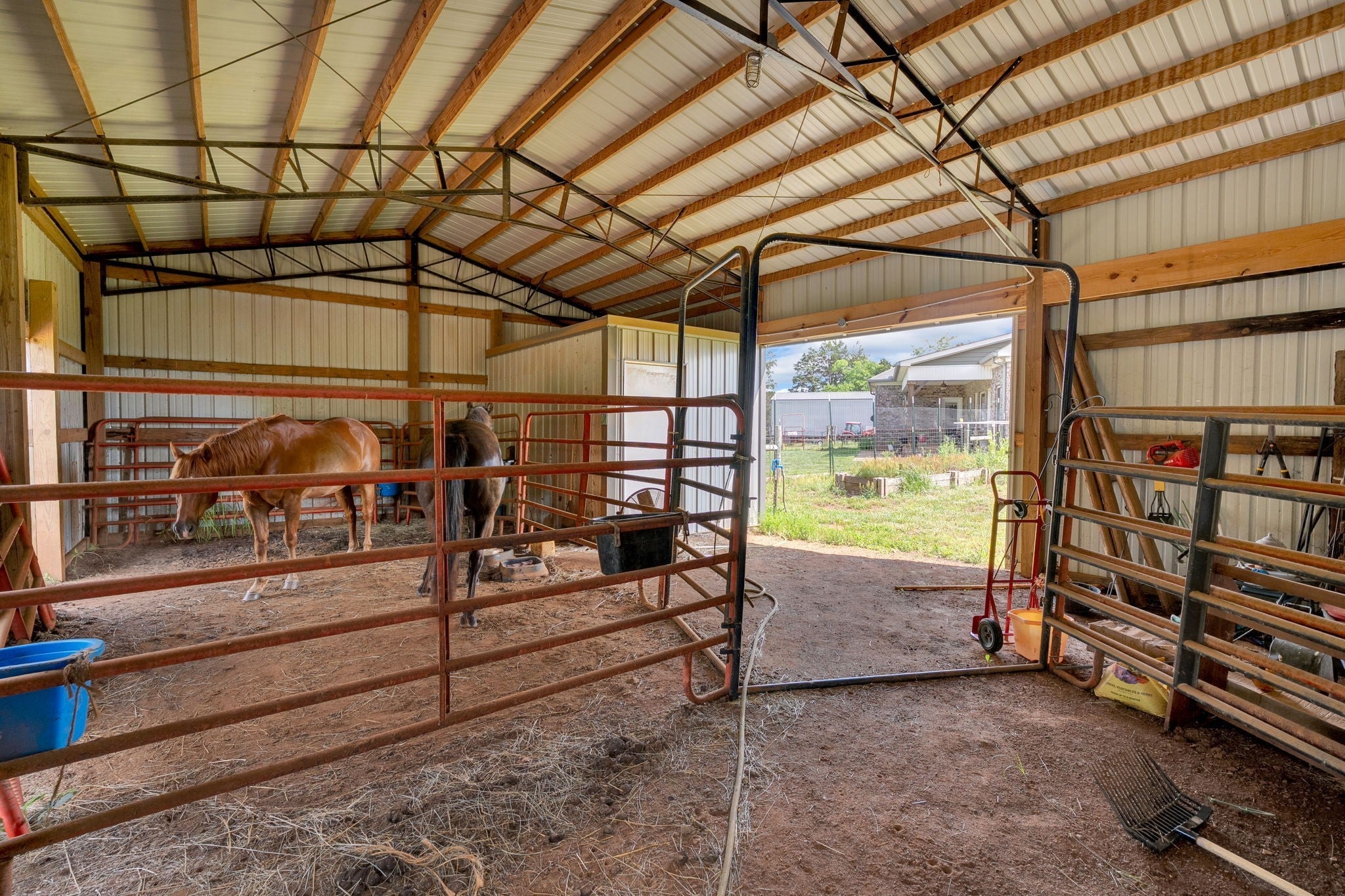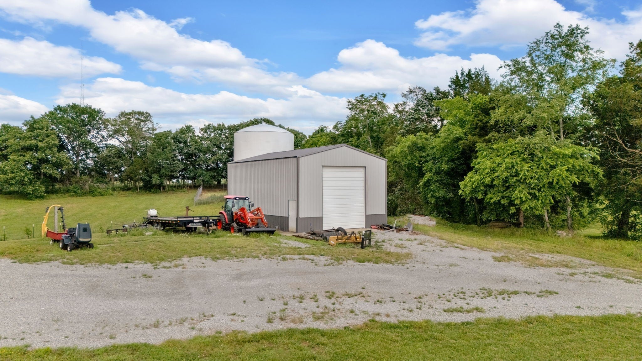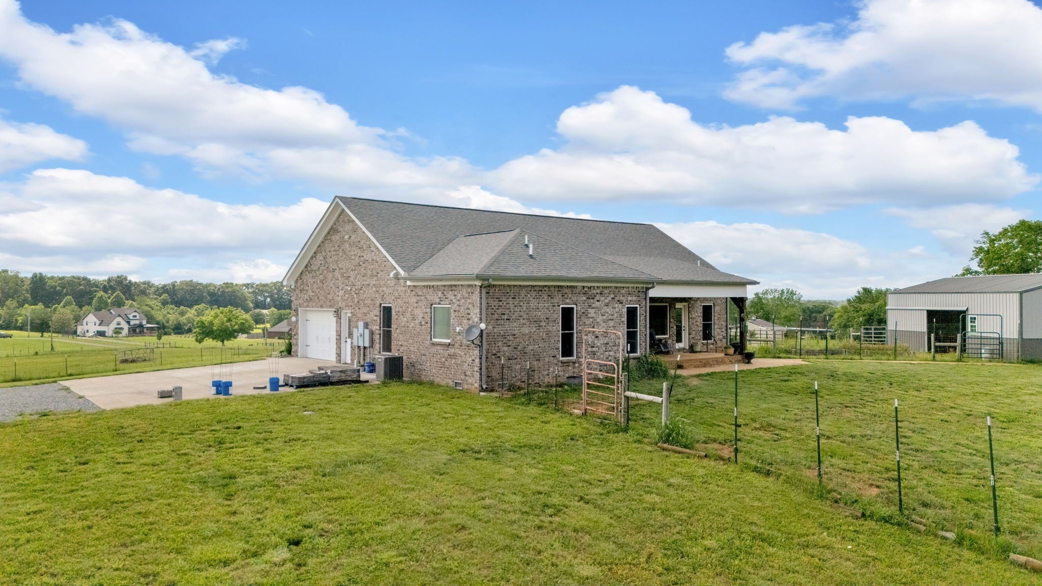 Escape the hustle without giving up convenience! This custom-built, single-story brick home sits on over 40 acres of prime land—a rare blend of open pasture and wooded space, ideal for hunting or casting a line in your own private pond. Designed with comfort and functionality in mind, the home boasts a spacious split floor plan, modern finishes, and serene views in every direction. The luxurious primary suite features private access to the covered back patio, double vanities, and a walk-in closet so large it rivals a bedroom. Each room offers generous space to fit your lifestyle, with two of the three bedrooms opening directly to the covered patio—perfect for enjoying quiet country mornings or evening sunsets. Bring your livestock and your vision—this property is fully equipped with fenced pastures, a tranquil pond, a classic barn ready for horses or cattle, and a massive workshop that can accommodate a dump truck or RV. Whether you're after a peaceful retreat, a functional ranch, or a forever family homestead, this exceptional estate delivers. Enjoy the best of both worlds: wide-open country living with city amenities just minutes away. Don’t miss the chance to make this one-of-a-kind property yours! Kitchen Fridge and Air Compressor to remain with the home.