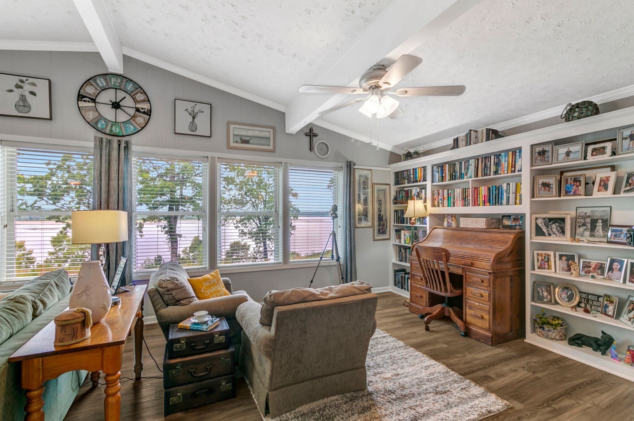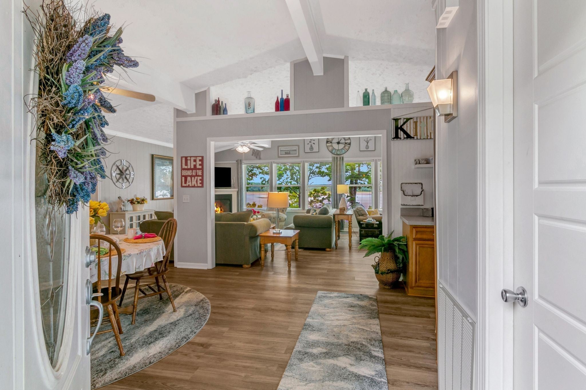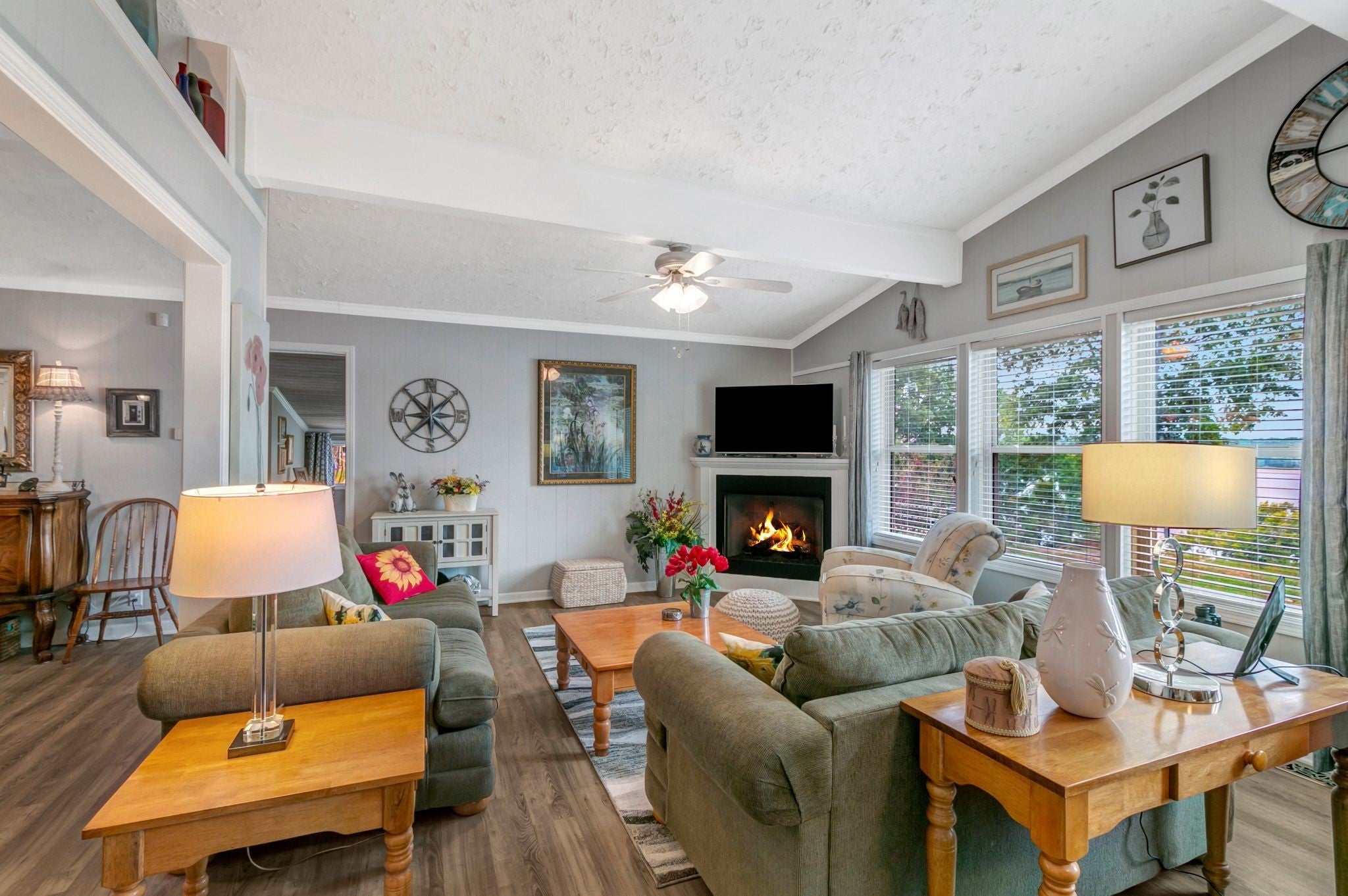 Water Views! Water Access! Kentucky Lake!! Two houses! Two lots! One price! The million-dollar water vistas from this home on the bluff are spectacular. The main house 1532 sq ft boasts scenery of the water from every room, including the owner’s retreat with tongue & groove cathedral ceilings, the living room with gas fireplace, cathedral ceilings, built-in book cases and high niche shelves, the open dining room with cathedral ceilings, the gourmet kitchen has custom cabinets in maple finish, and the private 23x13 Florida room with windows galore and white tongue & groove cathedral ceilings. The Florida room which can be used as sleeping quarters has black-out blinds on each window & a black-out curtain on the doors. The Florida room easily accommodates two twin or one double bed, a living area with TV and a secondary dining area for friendly gather. The owner's retreat has two walk-in closets, two vanities, and an elegant tile shower for two to enjoy. The half bathroom is conveniently located and houses the laundry closet. For easy cleaning, luxury vinyl floors are throughout the home and the owner’s retreat has plush carpet and beautiful tile bathroom floors. In addition, there is a private detached 437 sq ft guest house with a comfortable living room, a quiet bedroom, and a full bathroom. The separate detached oversized 40x36 three car tandem garage fits cars, boats, campers, toys & tools and has an enclosed 21x10 heated & cooled office with storage. The 2 lots total 1.20 acres. This bird lover's paradise has White Pelicans, Eagles & Egrets living in the backyard foliage and soothing waters. The views include miles of TWRA land and nearby land of the National Wildlife Refuge overseen by the U.S. Fish and Wildlife Services. Lot #22 septic system is approved for 1 bedroom, and lot #23 is approved for 3 bedrooms. For a dock permit, the new owner may apply to the TVA for a section 26a permit. Most furnishings convey making this turn key home ready for your pleasure.