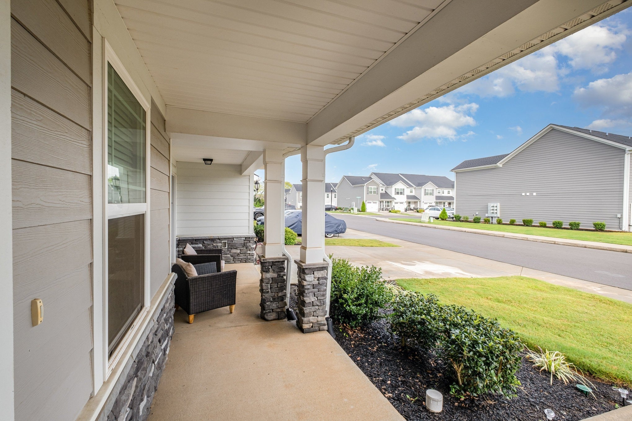 OWNER FINANCING available! Bedroom and full bath on the main level! This home offers a very practical floorplan with two 3 Full Baths and 2 living areas. The upgraded kitchen includes granite countertops, custom tile backsplash, stainless steel appliances, a large island, and a sunny breakfast nook—perfect for morning coffee or casual dining. Upstairs, you'll find the oversized primary suite with a trey ceiling, walk-in closet, double vanity, soaking tub, and separate shower. A third bedroom and another full bath are also upstairs, along with a huge bonus room—ideal for a playroom, home office, or movie nights. Enjoy outdoor living on the fenced-in back patio that offers privacy and a great space for grilling or relaxing. This unit backs up to peaceful farmland, with the playground and mail kiosk just steps from your covered front porch. All this, just minutes from I-24 and 840 for an easy commute!