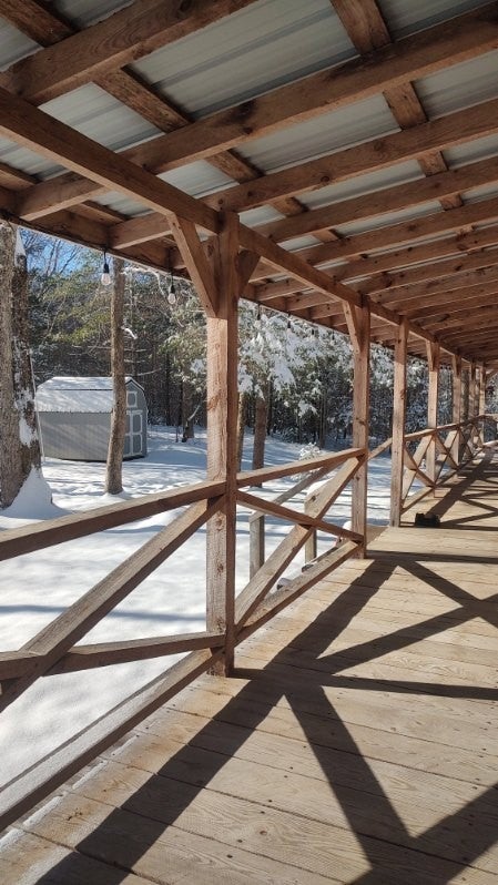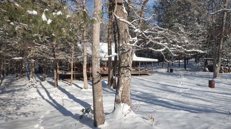 Discover this beautifully updated cabin on 10 serene acres with tranquil creekside views from the inviting wraparound porch. This 1,344 sq. ft. home offers 2 bedrooms, a spacious loft that could be a third bedroom, and 1 modern bath. Fully remodeled in 2019, it features a new kitchen with stainless Whirlpool appliances, granite counters, and soft-close cabinets. The updated bath includes a stackable washer & dryer. Enjoy cozy evenings by the wood-burning fireplace on a stone hearth, with durable LVP flooring throughout and a low-maintenance metal roof. Relax on the 8-ft-wide wraparound porch overlooking the front creek and rear waterway. Modern comforts include central AC, ceiling fans in every room, built-in door blinds, steel pan windows, and two utility closets. Fully furnished and move-in ready, this cabin perfectly blends rustic charm with modern updates.
