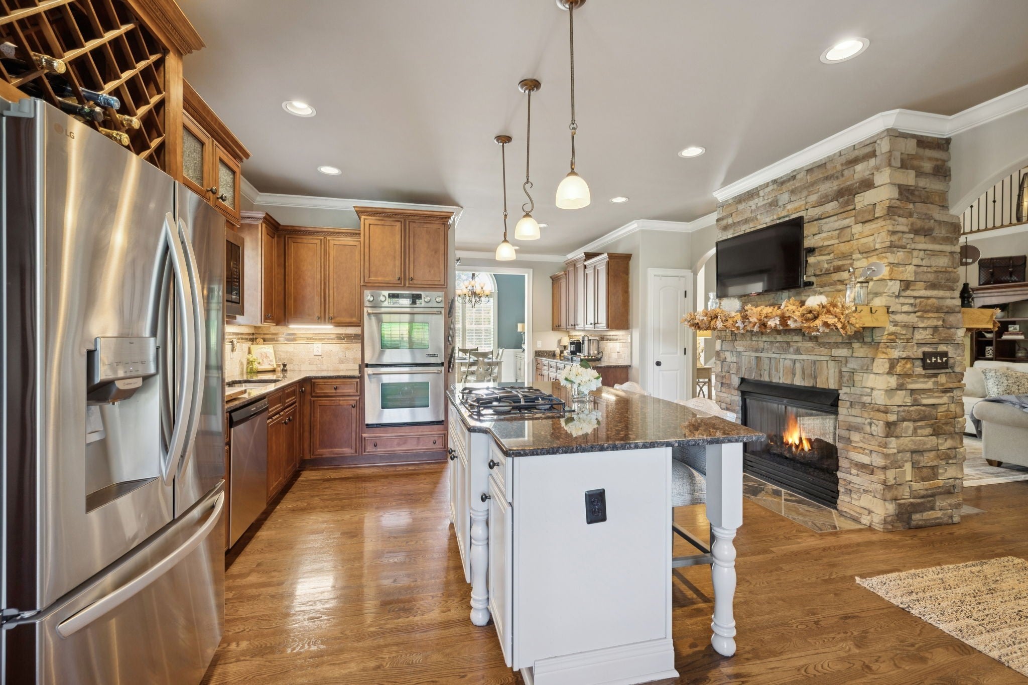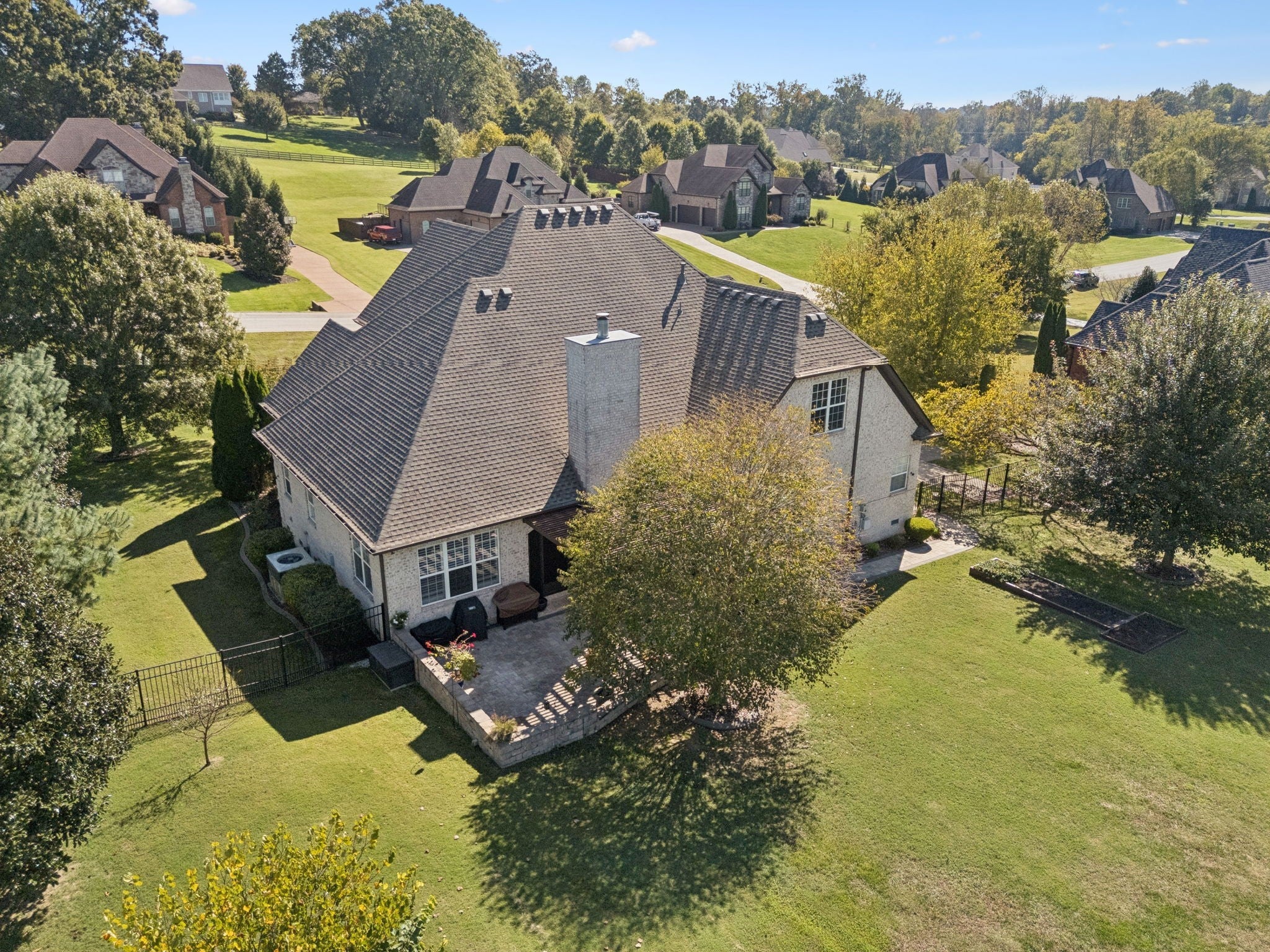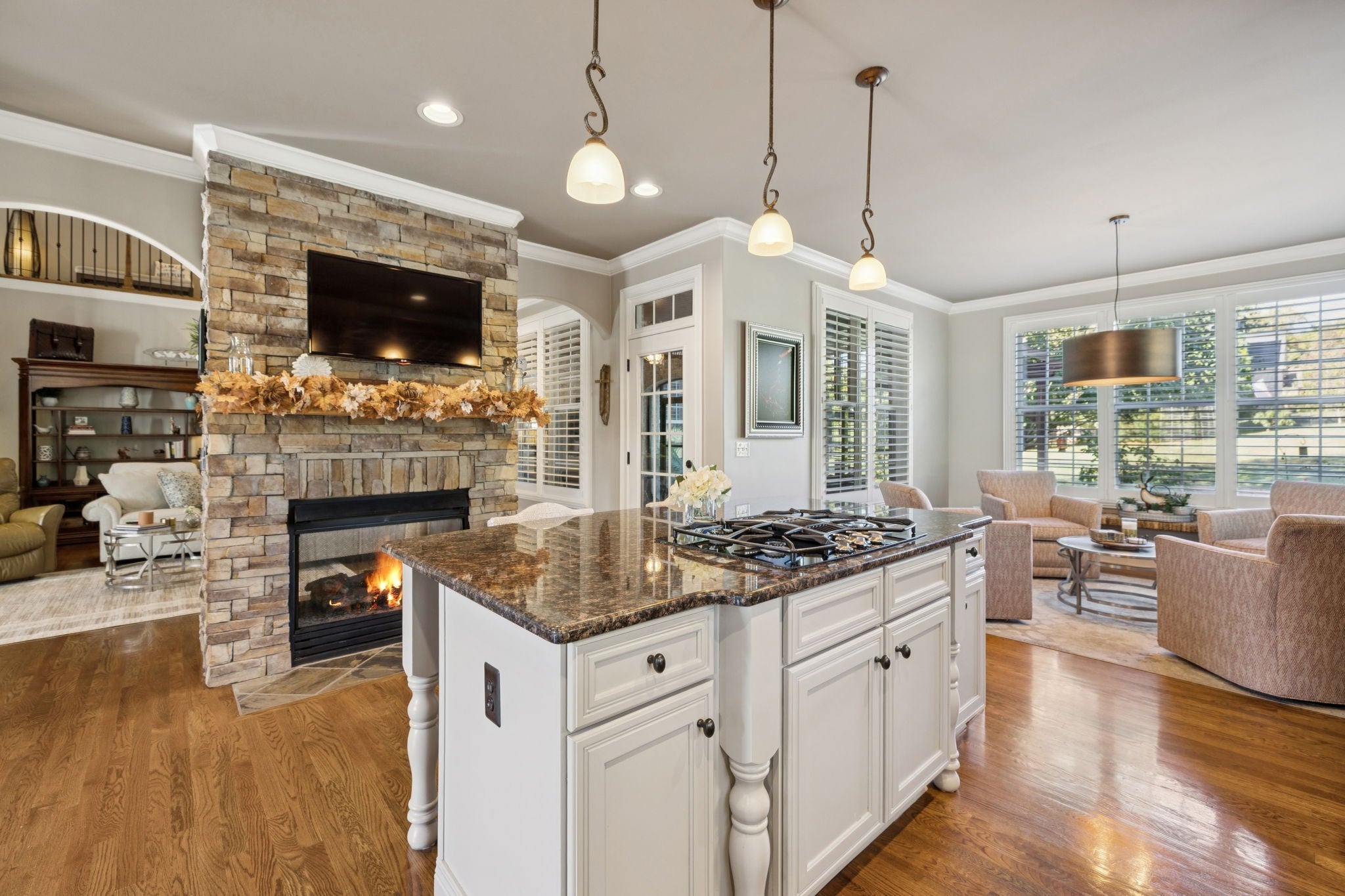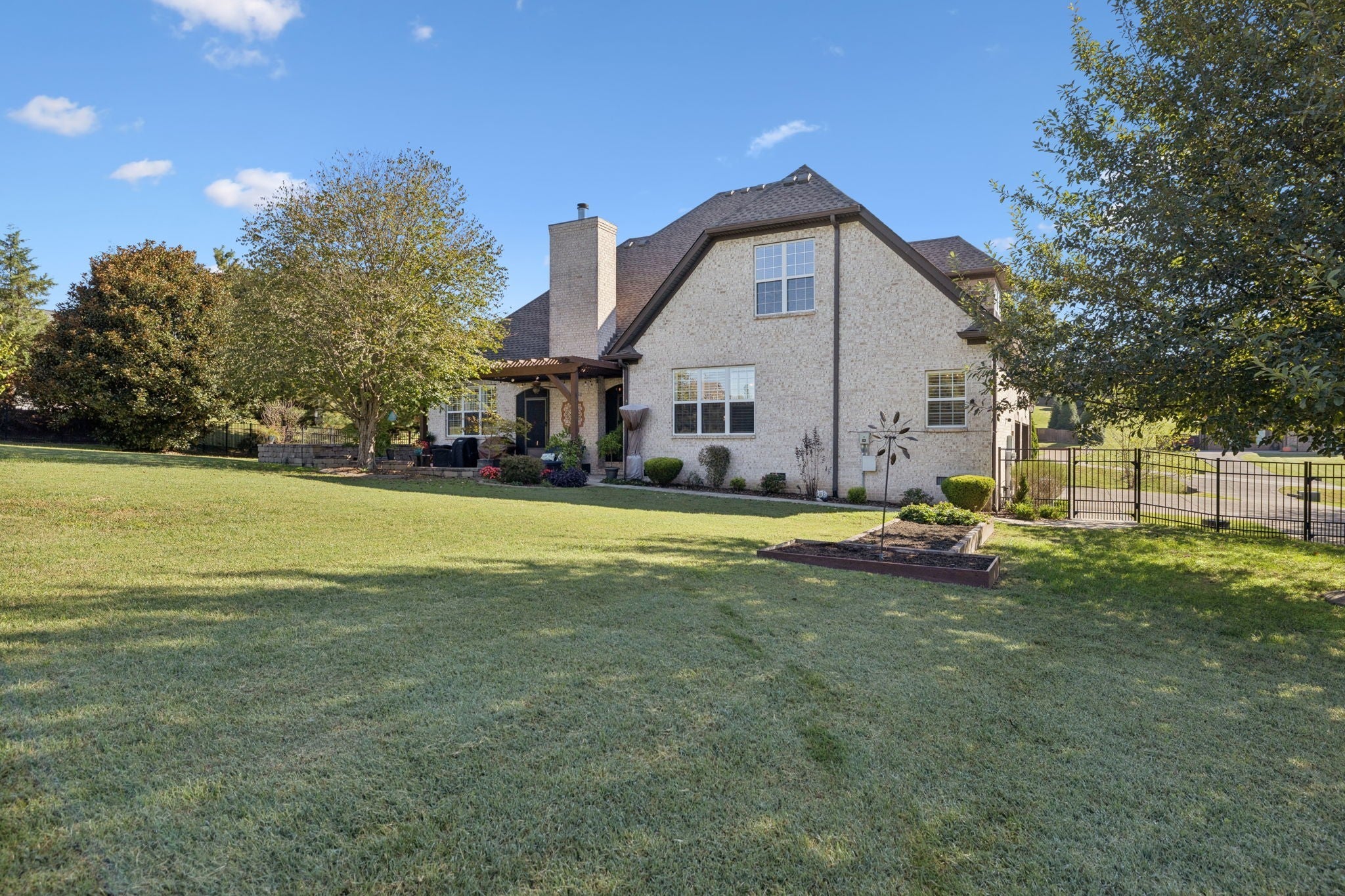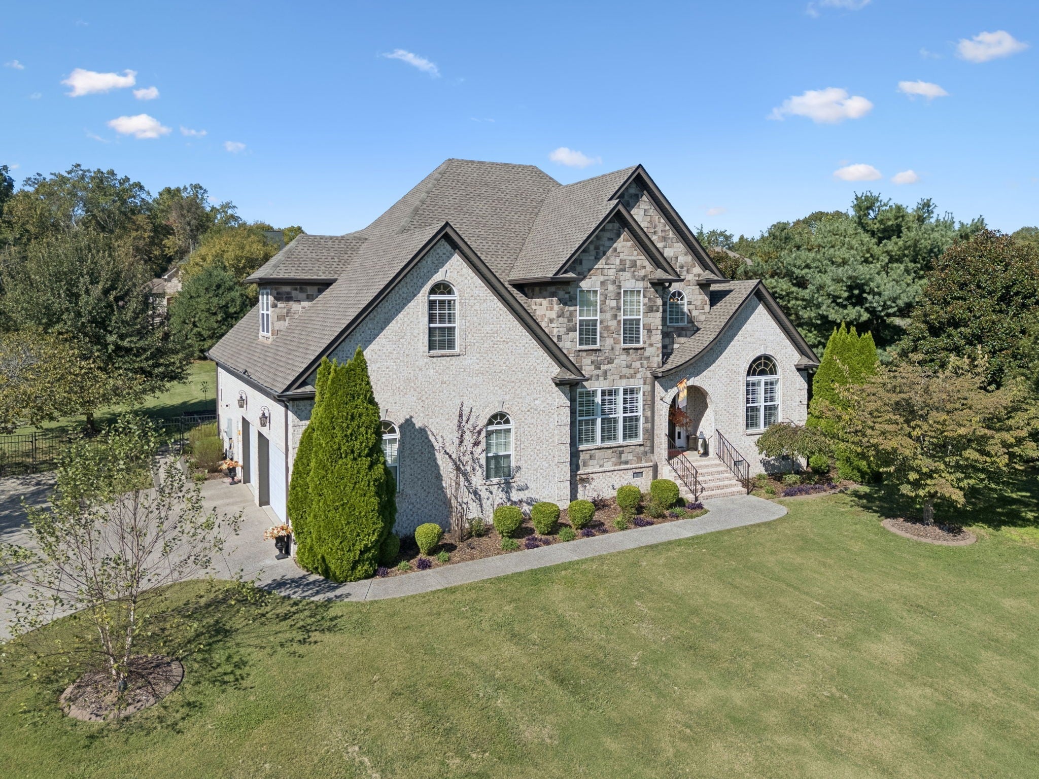 Experience timeless elegance in this exquisite French Country estate offering 3861 sq. ft. of refined living. Thoughtfully designed with 4 bedrooms and 3.5 baths, this residence blends architectural beauty with modern sophistication. The first-floor primary suite is a private retreat with a spa-inspired ensuite. A dedicated space for a home office offers the perfect work-from-home sanctuary. The heart of the home features soaring spaces, a warm fireplace, gleaming hardwood floors, and plantation shutters throughout the main level. The gourmet kitchen is designed for both culinary artistry and entertaining, with granite countertops, double ovens, and custom finishes. Upstairs, a media room and expansive bonus room provide the ultimate spaces for leisure and entertainment. An oversized three-car garage is a luxury in itself, offering built-in cabinetry, heavy-duty shelving, a storm shelter, and an RV plug outside for convenience. Additional high-end features include a central vacuum system and a whole-home circuit breaker designed to protect valuable electronics. Outdoors, sophistication continues with a screened patio and fireplace overlooking the property, as well as an inviting courtyard-style patio with pergola and tranquil water features—perfect for gatherings or quiet evenings. Blending European-inspired architecture with modern amenities, this remarkable residence offers a lifestyle of luxury, comfort, and peace of mind.