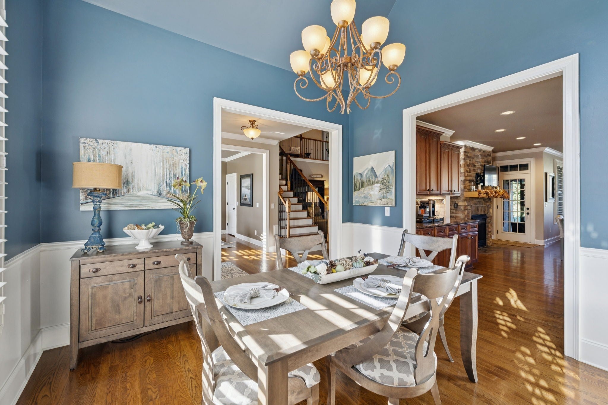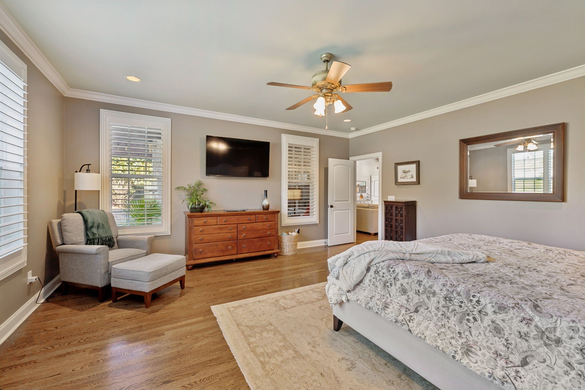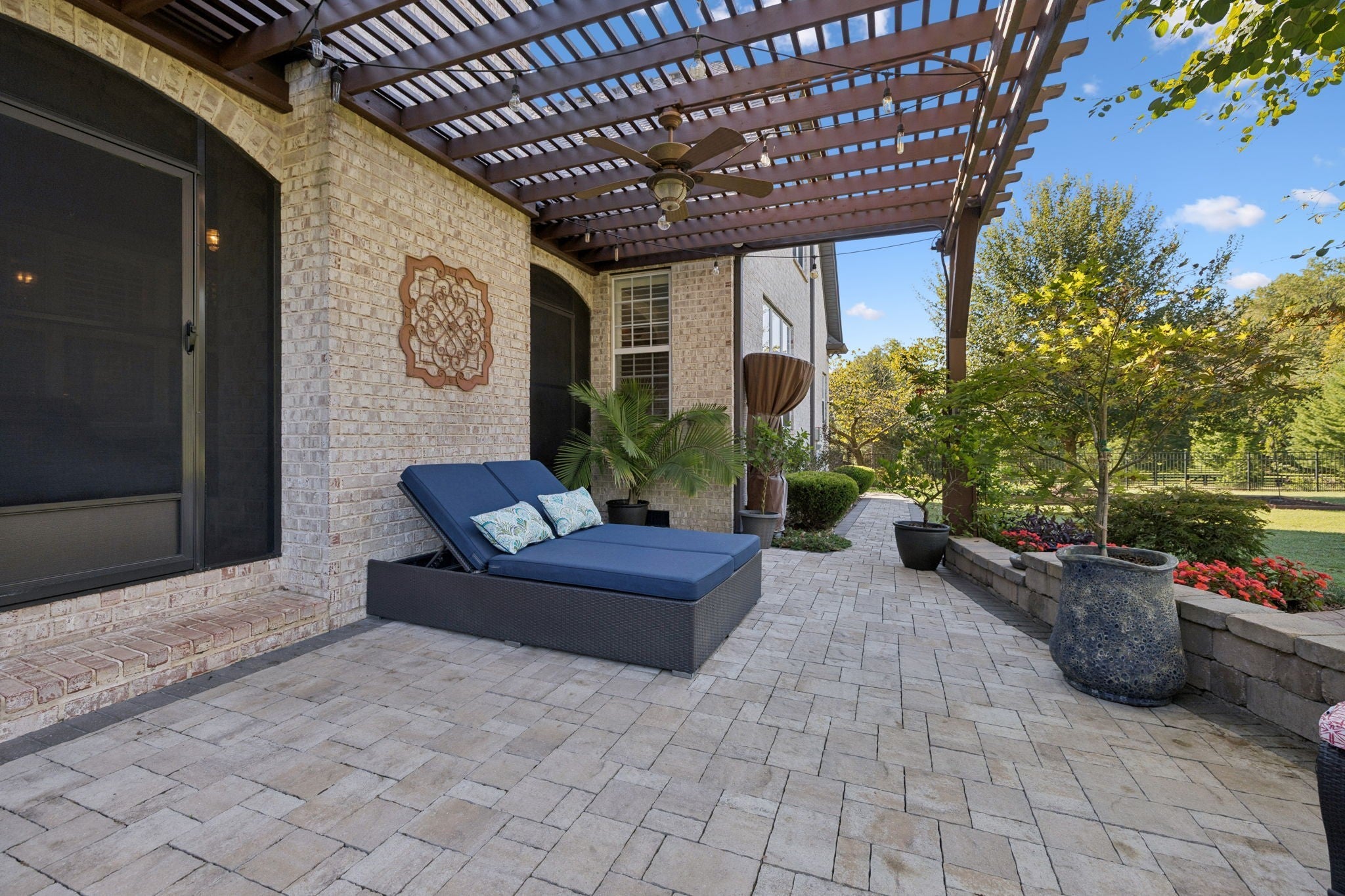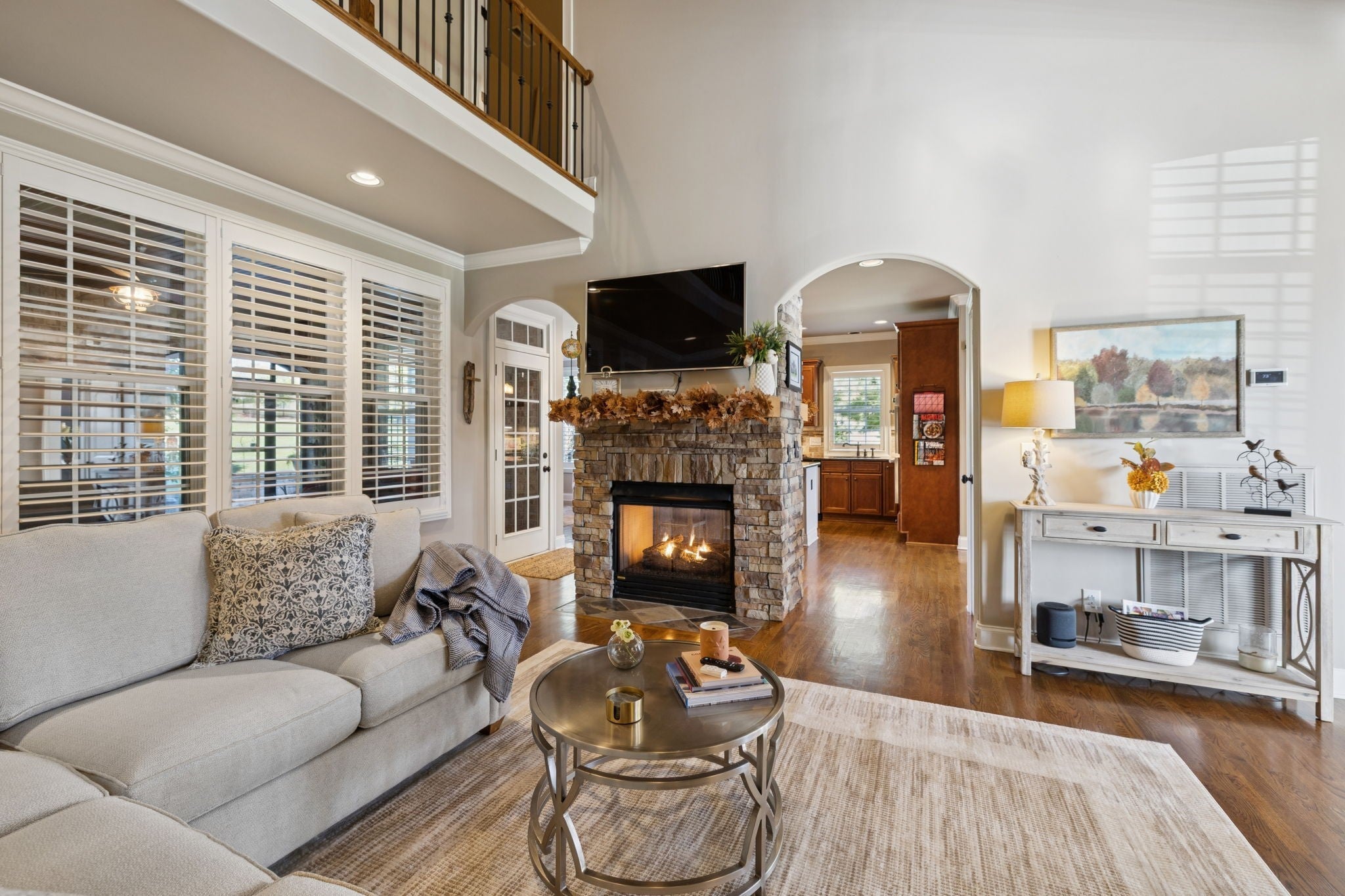 Experience timeless elegance in this exquisite French Country estate offering 3861 sq. ft. of refined living. Thoughtfully designed with 4 bedrooms and 3.5 baths, this residence blends architectural beauty with modern sophistication. The first-floor primary suite is a private retreat with a spa-inspired ensuite. A dedicated space for a home office offers the perfect work-from-home sanctuary. The heart of the home features soaring spaces, a warm fireplace, gleaming hardwood floors, and plantation shutters throughout the main level. The gourmet kitchen is designed for both culinary artistry and entertaining, with granite countertops, double ovens, and custom finishes. Upstairs, a media room and expansive bonus room provide the ultimate spaces for leisure and entertainment. An oversized three-car garage is a luxury in itself, offering built-in cabinetry, heavy-duty shelving, a storm shelter, and an RV plug outside for convenience. Additional high-end features include a central vacuum system and a whole-home circuit breaker designed to protect valuable electronics. Outdoors, sophistication continues with a screened patio and fireplace overlooking the property, as well as an inviting courtyard-style patio with pergola and tranquil water features—perfect for gatherings or quiet evenings. Blending European-inspired architecture with modern amenities, this remarkable residence offers a lifestyle of luxury, comfort, and peace of mind.