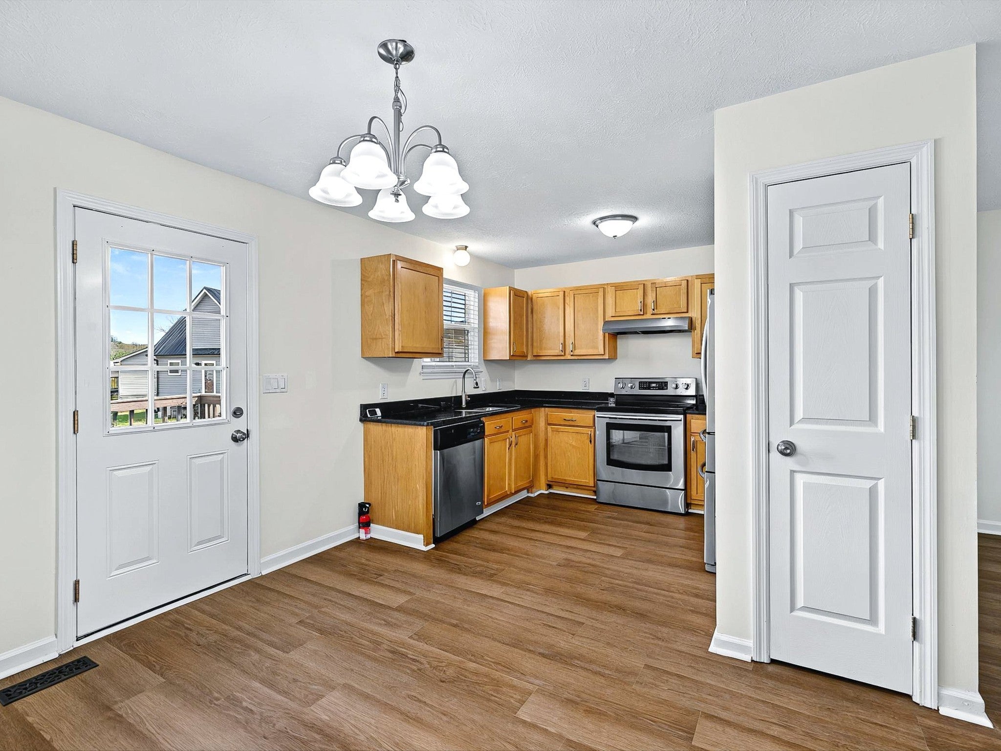 - Electric Range, Dishwasher, Refrigerator, Stainless Steel Appliance(s)