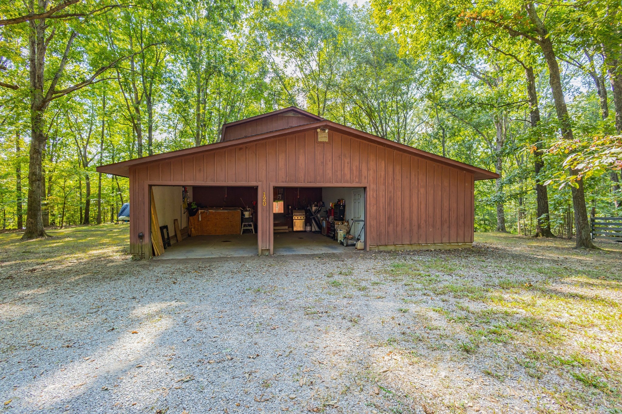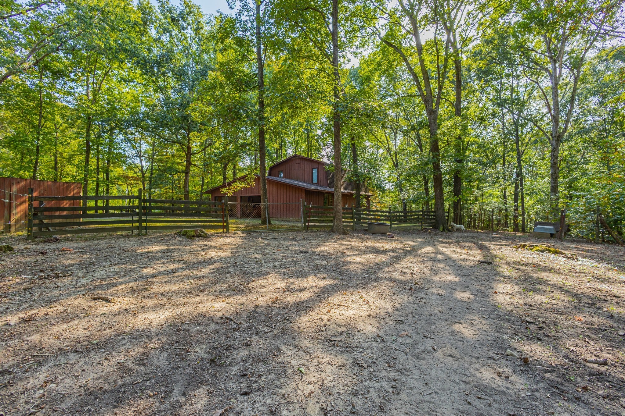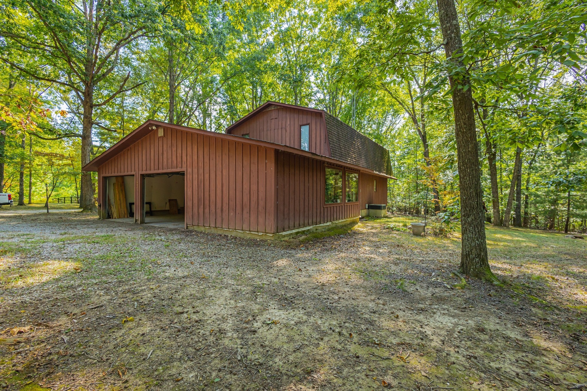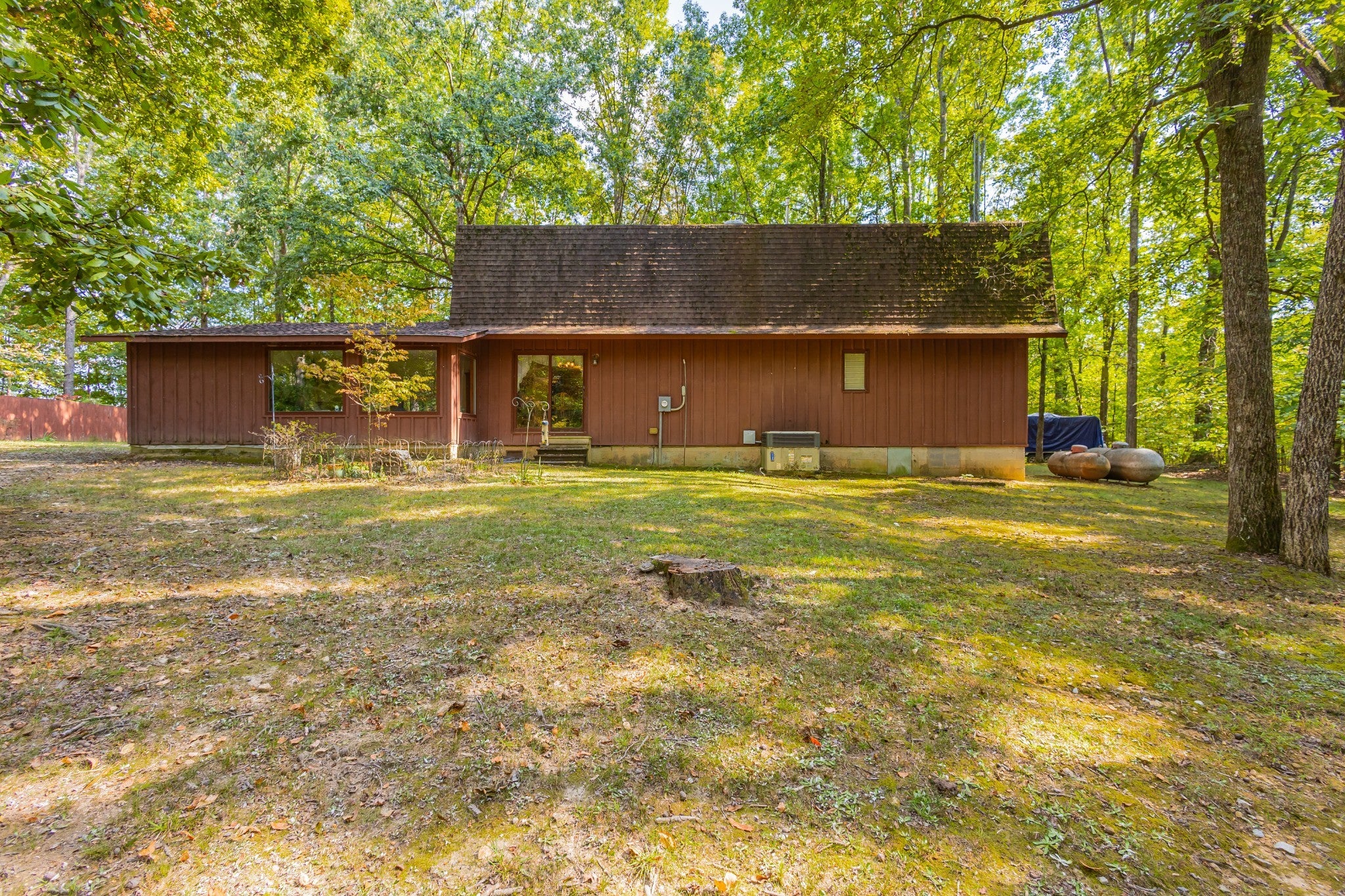 An amazing find! This secluded home is on approximately 6 acres featuring mature shade trees, oval in-ground pool measuring 20x40 feet, three-stall barn, and fenced pasture ideal for any type livestock. This peaceful country property is in an ideal location! It offers convenient walking or a short drive on a golf cart to Holiday Landing with easy boat dock access and good food at the Bluegill Grill restaurant. The first floor consists of authentic red and white oak hardwood flooring throughout main living areas, a large living room with a gas fireplace, a sunroom perfect for relaxation, a spacious bedroom with a walk-in closet, a roomy utility room, full bathroom, and two-car attached garage with an additional storage room! And that is only the downstairs! The upstairs features two extremely large bedrooms with large closet space and a second full sized bathroom. Property includes fiber internet, natural gas access, a storage shed, and a charming garden area. In addition to being within walking distance of the lake, this home is located minutes from Tim's Ford State Park and Bear Trace Golf Course, offering excellent recreational opportunities for boating, fishing, golfing, and hiking. There is abundant wildlife viewing on the property itself from the luxury of your own sunroom and the well-established shade trees create a private sanctuary while maintaining proximity to modern-day amenities and conveniences. This rare find combines rural tranquility with accessibility to waterfront activities and local dining. The house, inground pool and approximately 1 acre can be sold separately. However, the house must sell before the 5 acres if splitting. Just think, no HOA, unrestricted property, great location! Will divide but home must sell primary before any other split. Homestaeders this unrestrited property has it all. Hunters and fishermen use this as your homebase paradise can be seen in the pictures.