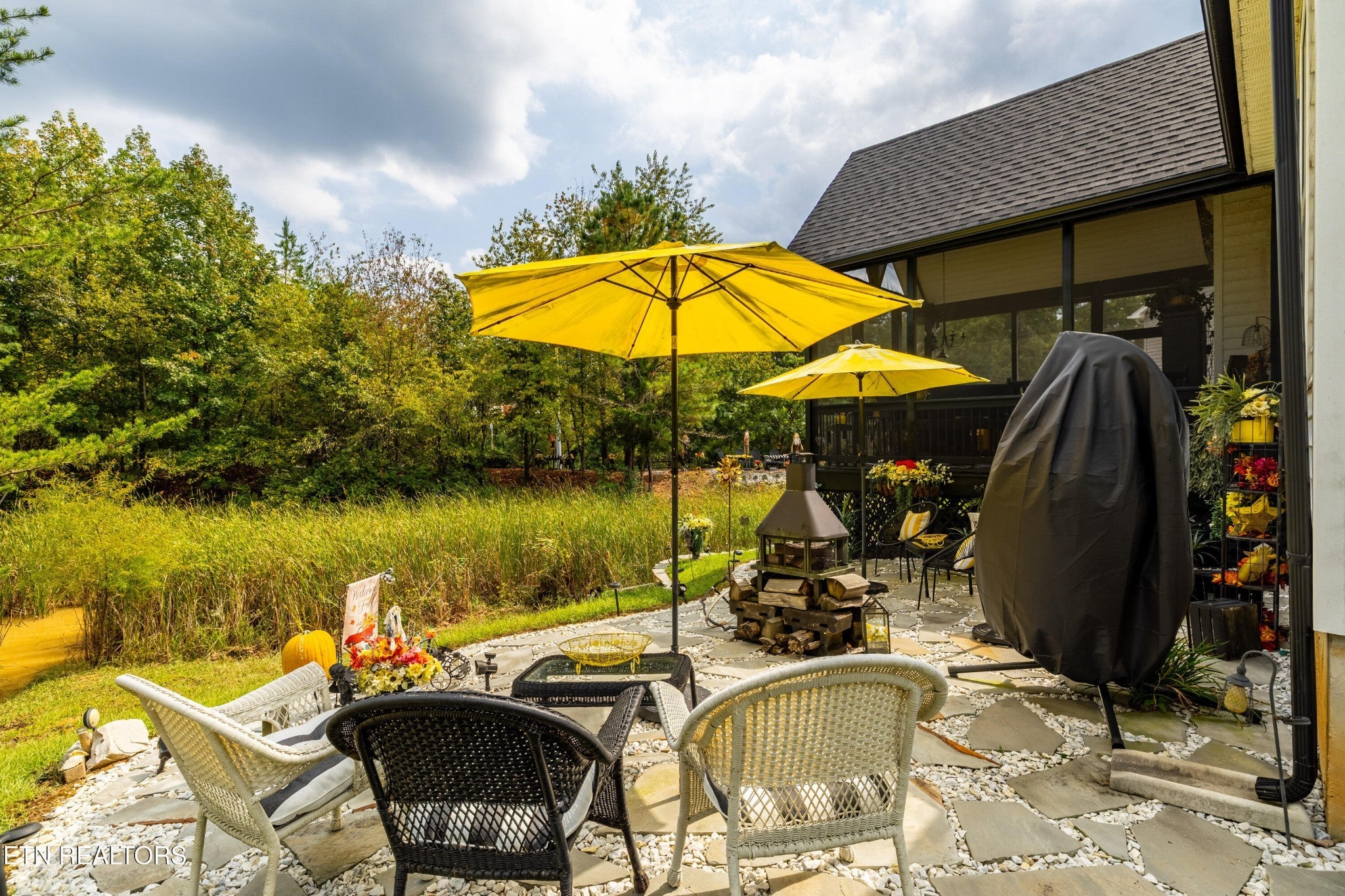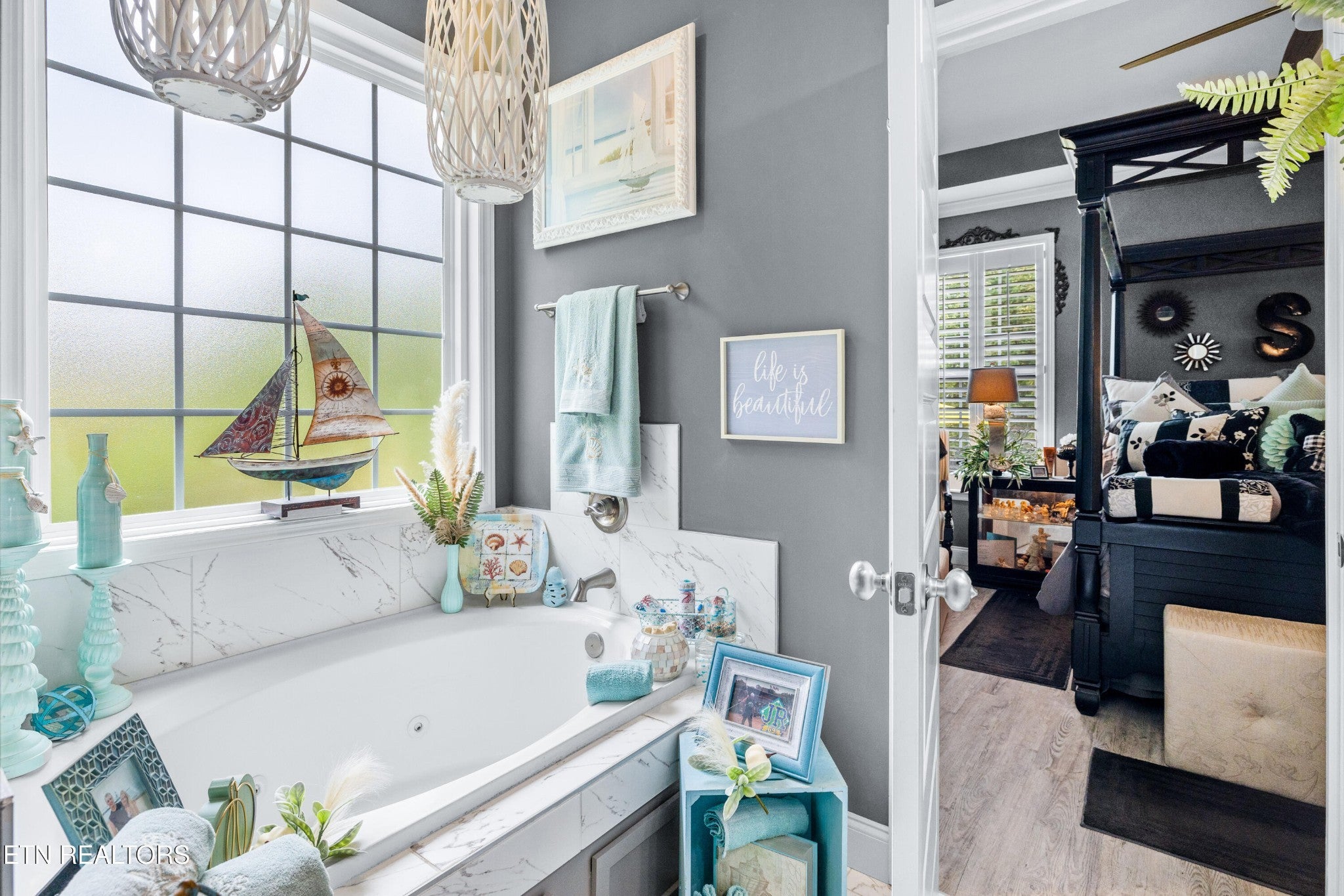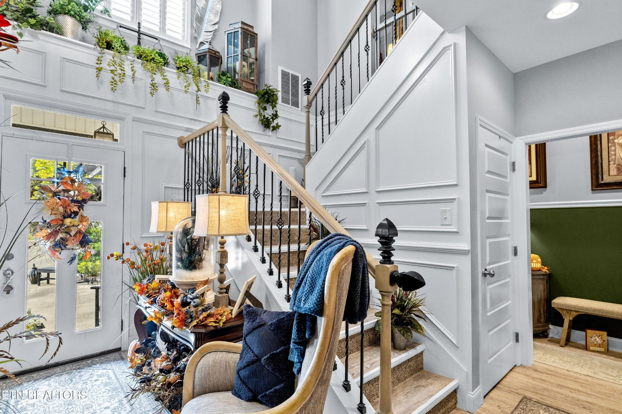 Welcome to this beautiful Lenoir City home, featuring thoughtfully designed finishes and plenty of living space. Inside you will find interior trim details that include crown molding, wainscoting, 5-panel molded doors, decorative beams in the living room and a coffered ceiling in the eat-in kitchen. The main-level primary suite features a grand trey ceiling with crown molding, a jetted tub, walk-in tile shower and walk-in closet. The kitchen is open to the living room with a large island, perfect for entertaining. Stainless steel appliances, including the refrigerator and wine fridge, complete the kitchen. Custom shutters and blinds accent every room including the garage. All bedrooms including the great room and bonus room have ceiling fans. Cable is hardwired in all rooms and the garage. The dining room can also serve as a sitting area or home office. Upstairs offers two additional bedrooms and one bath, plus a large bonus room with a walk-in closet, giving flexibility for guests or hobbies. Outdoor spaces include a screened deck overlooking the retention pond, where summer cattails create a beautiful natural backdrop. The screened deck features additional screening installed beneath the deck boards, plus a vaulted tongue-and-groove ceiling accented by a beam and ceiling fan. It is also pre-wired for cable, making it easy to enjoy TV outdoors. There are multiple flagstone patio areas in the backyard and around the retention pond which are perfect for relaxing and entertaining. Located at the end of the street and within city limits, this home combines comfort, style, and privacy. Buyer to verify all information including square footage.