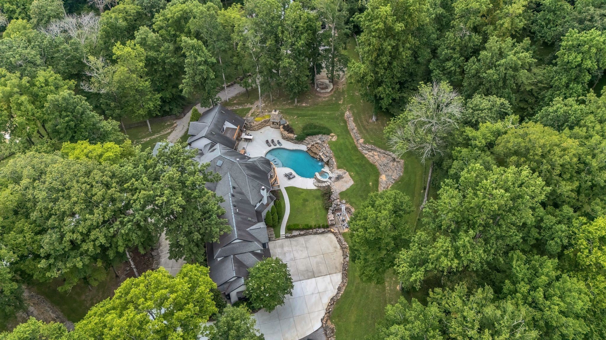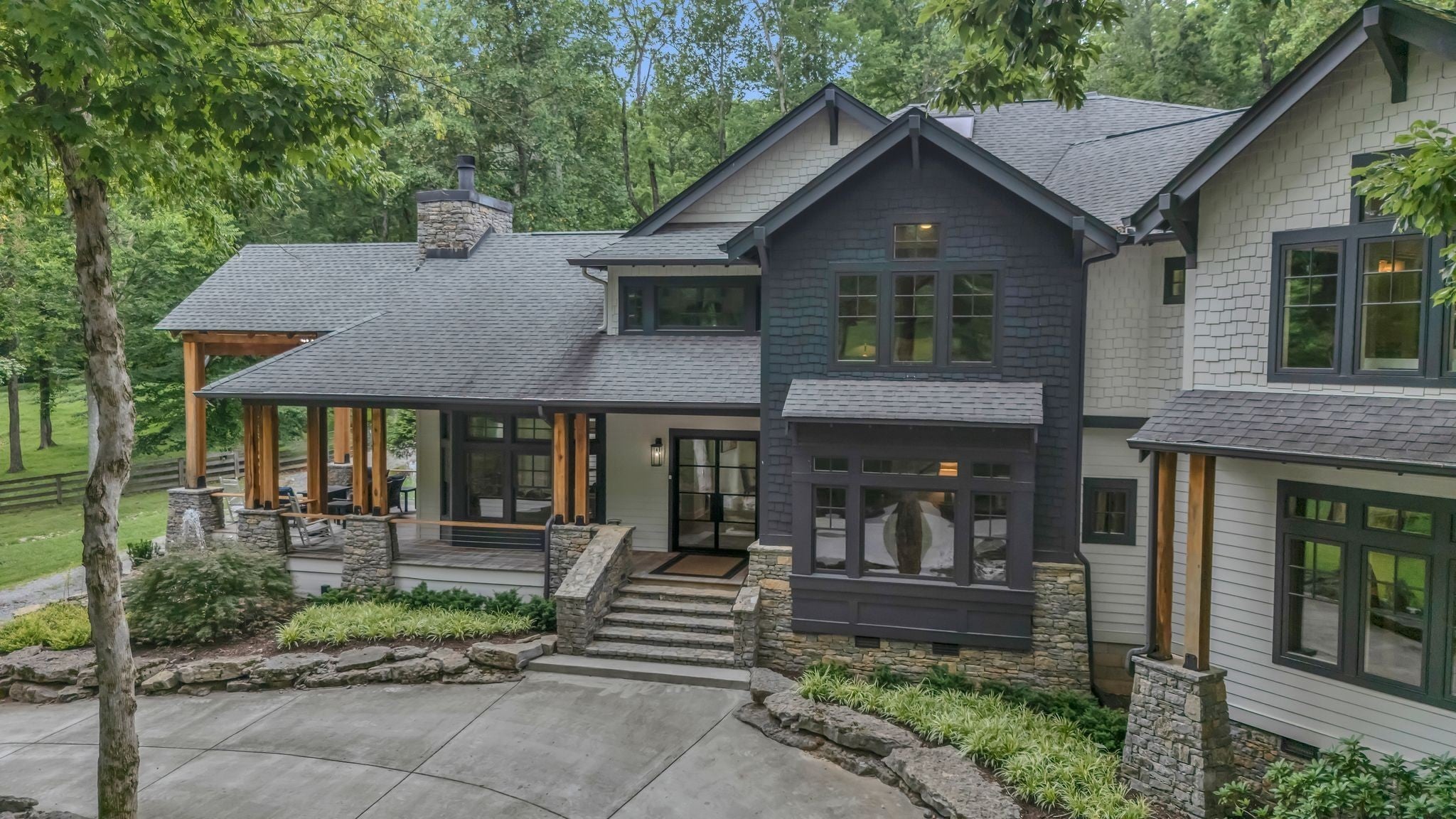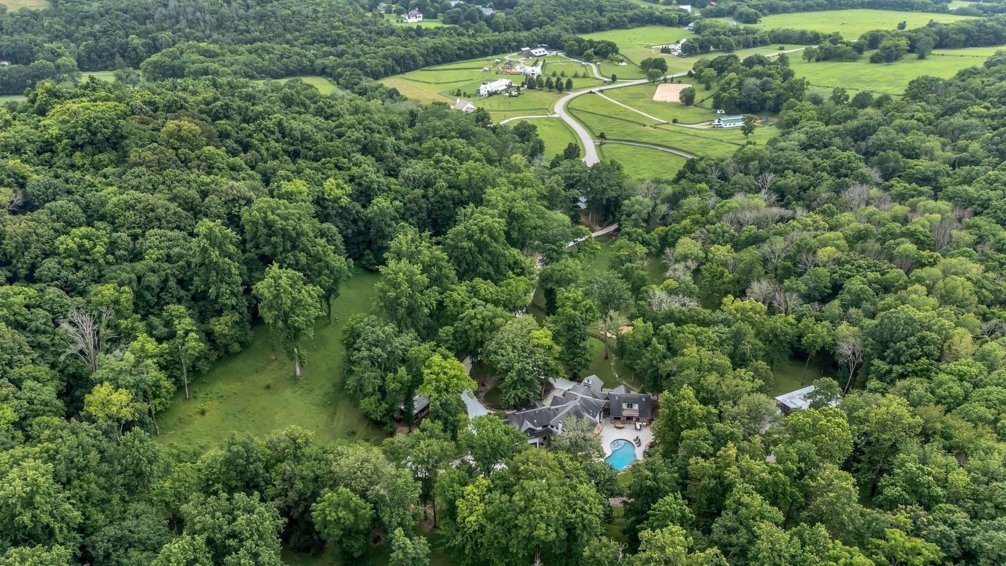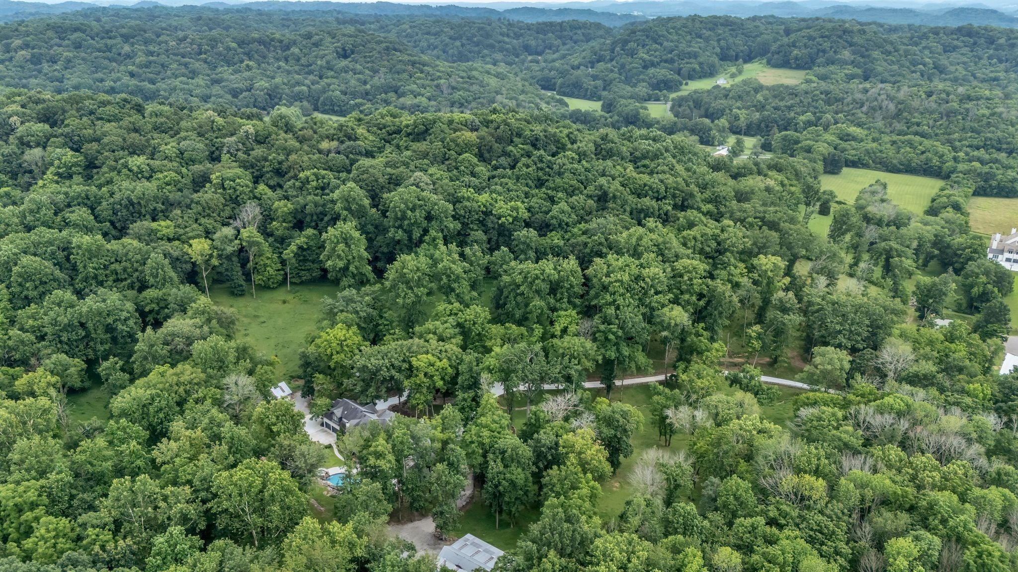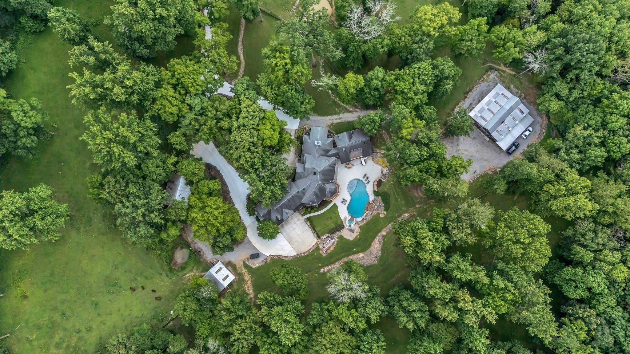 Tucked away in total privacy yet just minutes from the charm of Franklin and Leiper's Fork, this extraordinary estate blends natural beauty with refined living. Enrolled in the Greenbelt program, the acreage is suited for animals or simply enjoying the rolling pastures, wooded ridges, entertainment barn and tranquil pond. At its center rests a 5,748 sq ft custom 5 bedroom home, thoughtfully built with native wood harvested from the property and hand-selected stone. Expansive windows invite the outdoors in, highlighting soaring forest views while the great room’s stone fireplace open-concept design and chef’s kitchen create a perfect gathering place. The primary suite offers a spa-inspired retreat with expansive custom closet. Outside enjoy a resort-style pool with cascading waterfall, covered patio, outdoor kitchen and fireplace elevating your everyday living. Completing the estate is a 1,700 sq ft guest house and a 3,500 sq ft barn with horse stalls, entertaining space and a bar. This is truly rare Tennessee property of remarkable versatility and beauty.