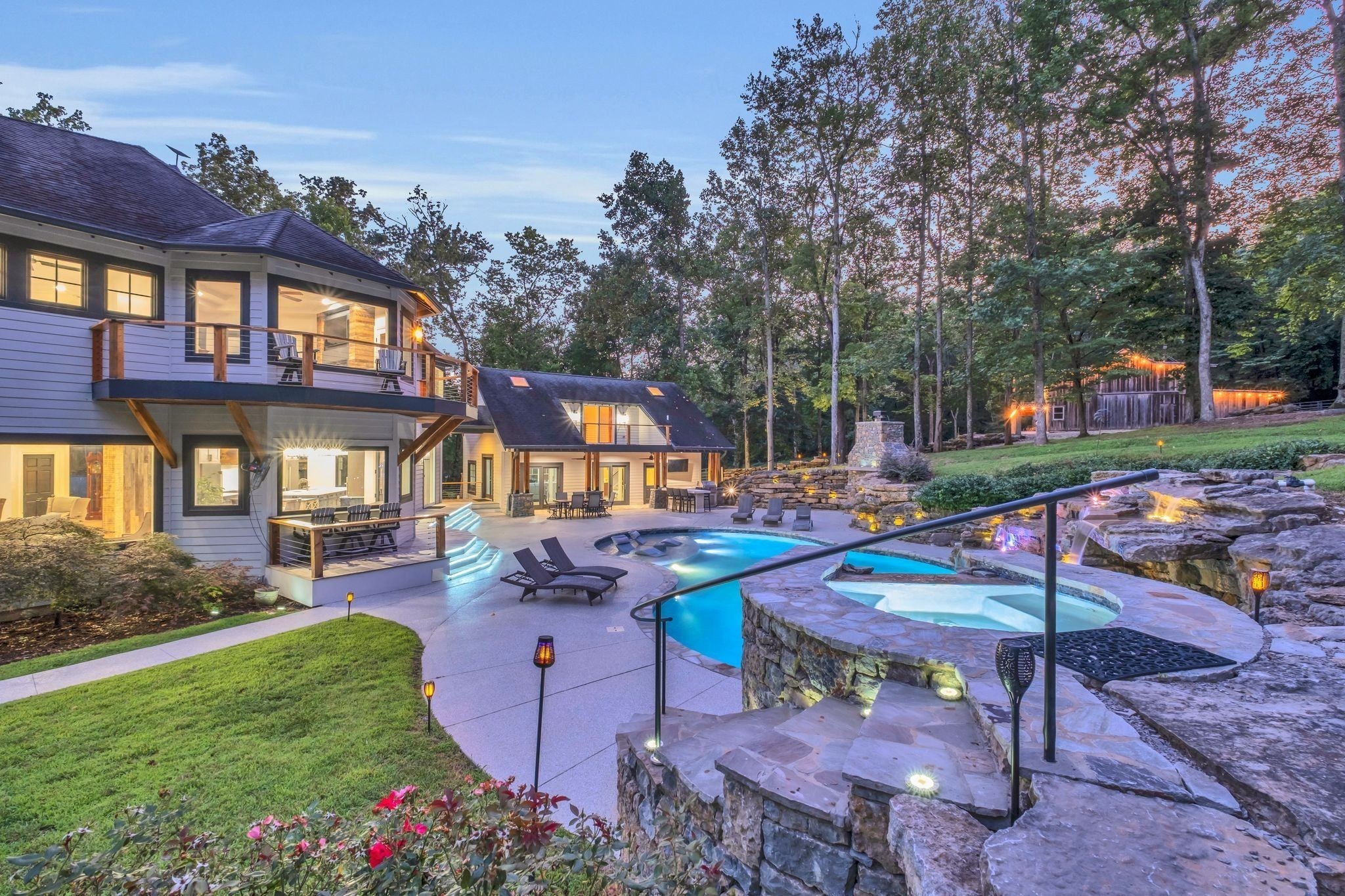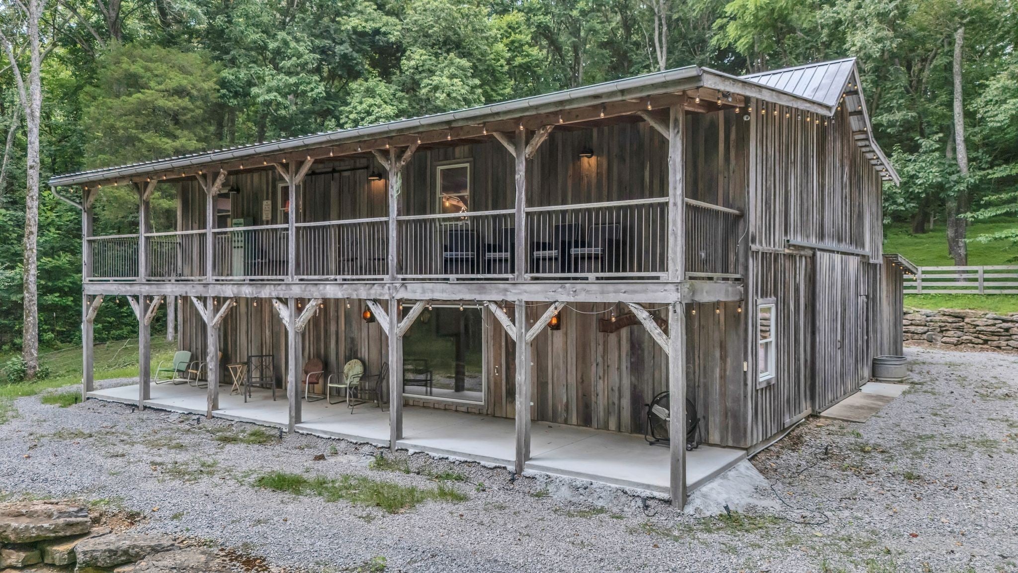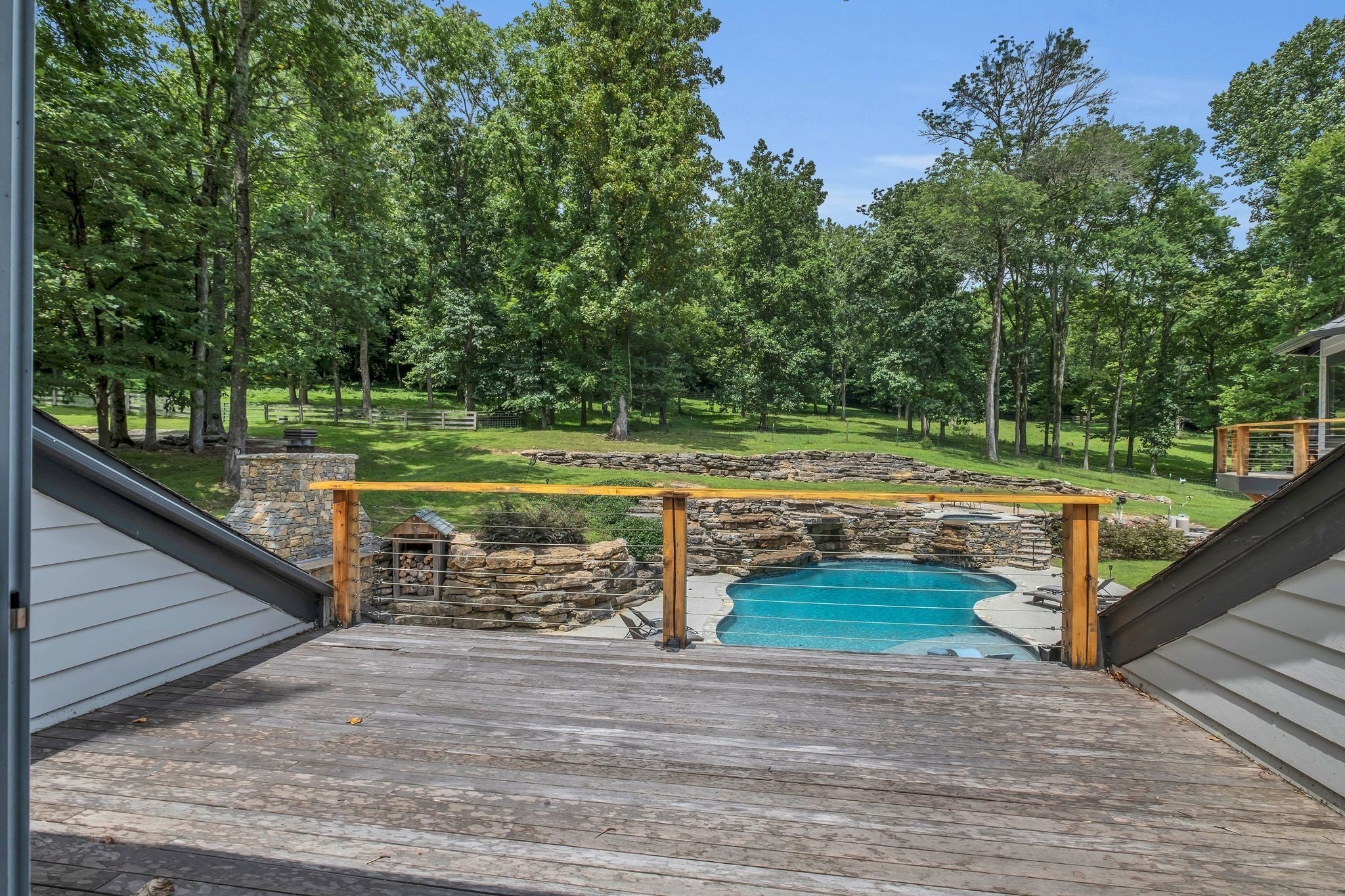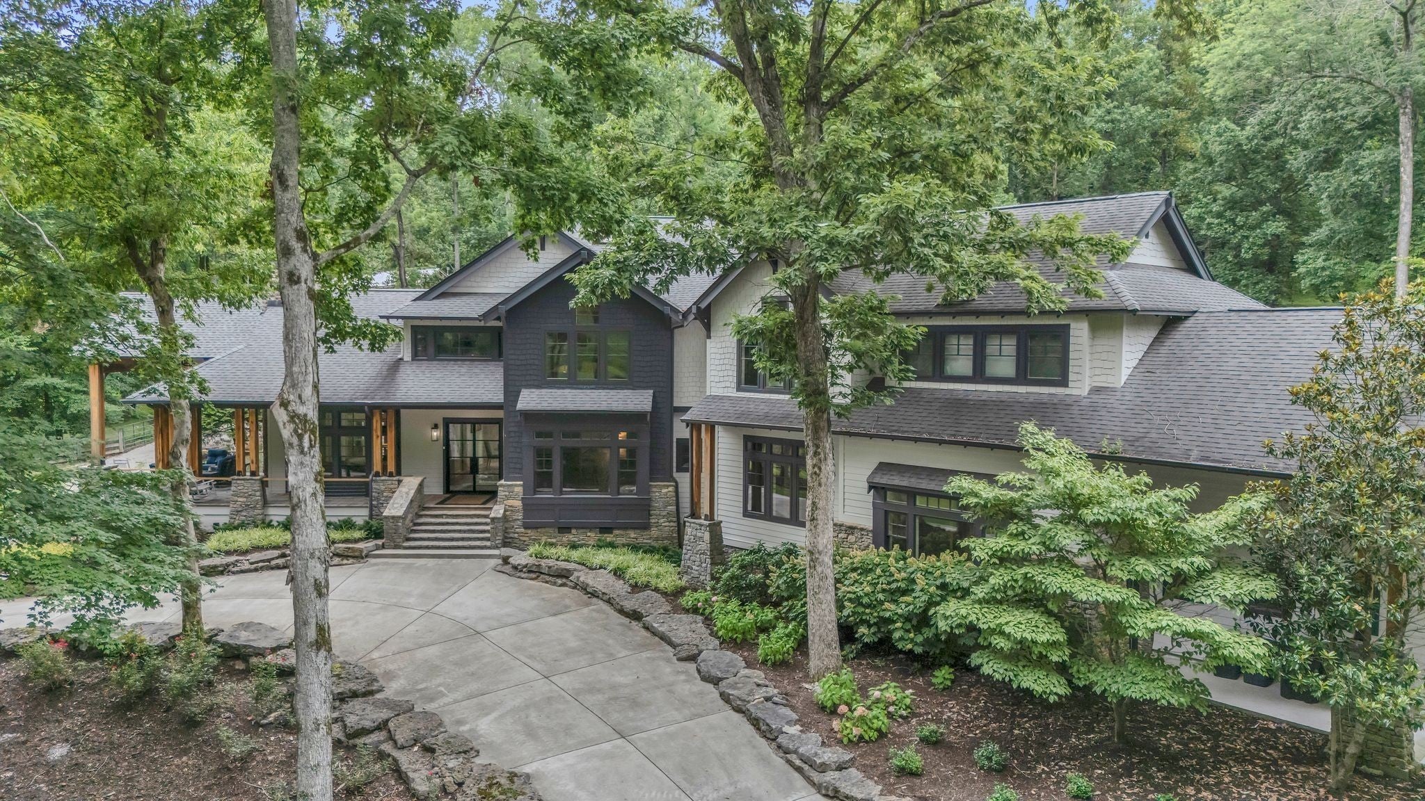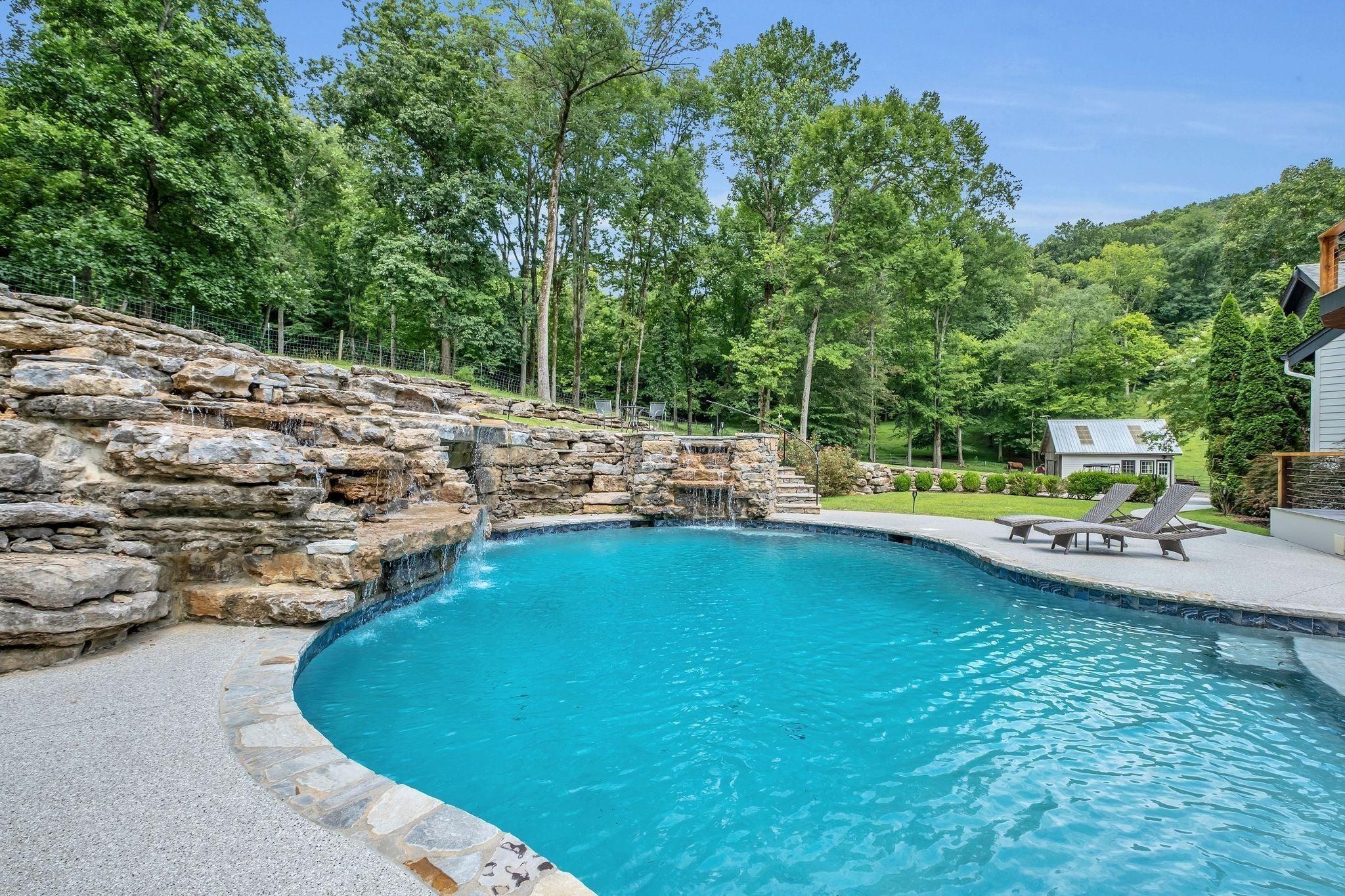Tucked away in total privacy yet just minutes from the charm of Franklin and Leiper's Fork, this extraordinary estate blends natural beauty with refined living. Enrolled in the Greenbelt program, the acreage is suited for animals or simply enjoying the rolling pastures, wooded ridges, entertainment barn and tranquil pond. At its center rests a 5,748 sq ft custom 5 bedroom home, thoughtfully built with native wood harvested from the property and hand-selected stone. Expansive windows invite the outdoors in, highlighting soaring forest views while the great room’s stone fireplace open-concept design and chef’s kitchen create a perfect gathering place. The primary suite offers a spa-inspired retreat with expansive custom closet. Outside enjoy a resort-style pool with cascading waterfall, covered patio, outdoor kitchen and fireplace elevating your everyday living. Completing the estate is a 1,700 sq ft guest house and a 3,500 sq ft barn with horse stalls, entertaining space and a bar. This is truly rare Tennessee property of remarkable versatility and beauty.
