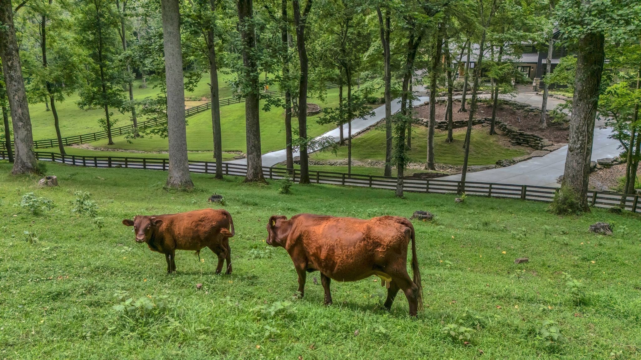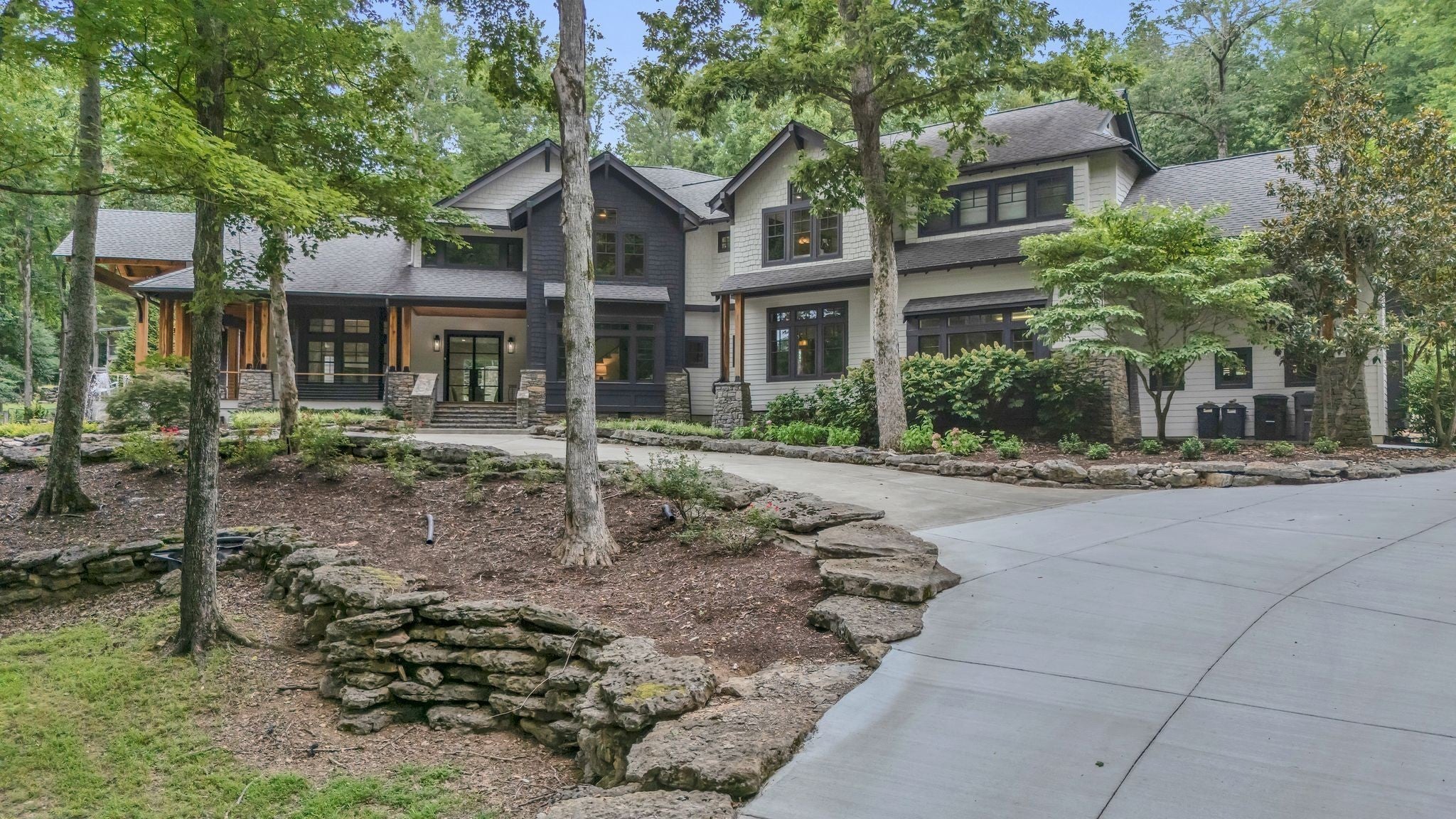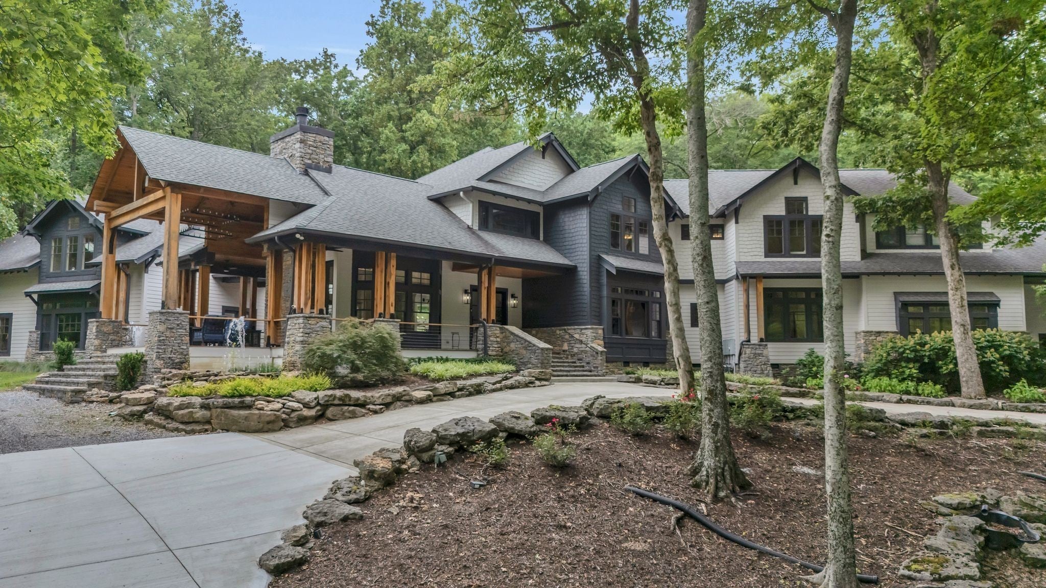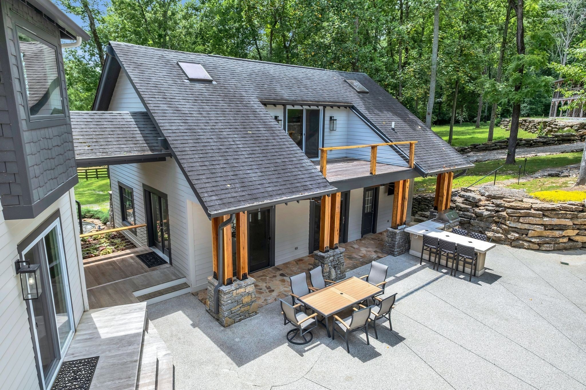 Tucked away in total privacy yet just minutes from the charm of Franklin and Leiper's Fork, this extraordinary estate blends natural beauty with refined living. Enrolled in the Greenbelt program, the acreage is suited for animals or simply enjoying the rolling pastures, wooded ridges, entertainment barn and tranquil pond. At its center rests a 5,748 sq ft custom 5 bedroom home, thoughtfully built with native wood harvested from the property and hand-selected stone. Expansive windows invite the outdoors in, highlighting soaring forest views while the great room’s stone fireplace open-concept design and chef’s kitchen create a perfect gathering place. The primary suite offers a spa-inspired retreat with expansive custom closet. Outside enjoy a resort-style pool with cascading waterfall, covered patio, outdoor kitchen and fireplace elevating your everyday living. Completing the estate is a 1,700 sq ft guest house and a 3,500 sq ft barn with horse stalls, entertaining space and a bar. This is truly rare Tennessee property of remarkable versatility and beauty.