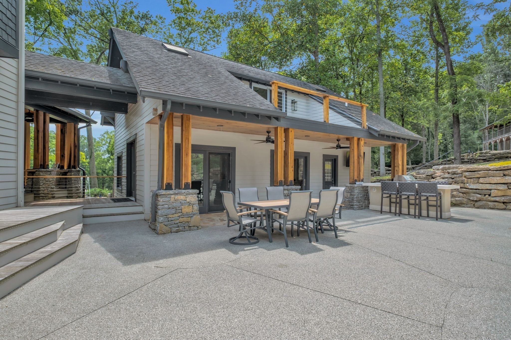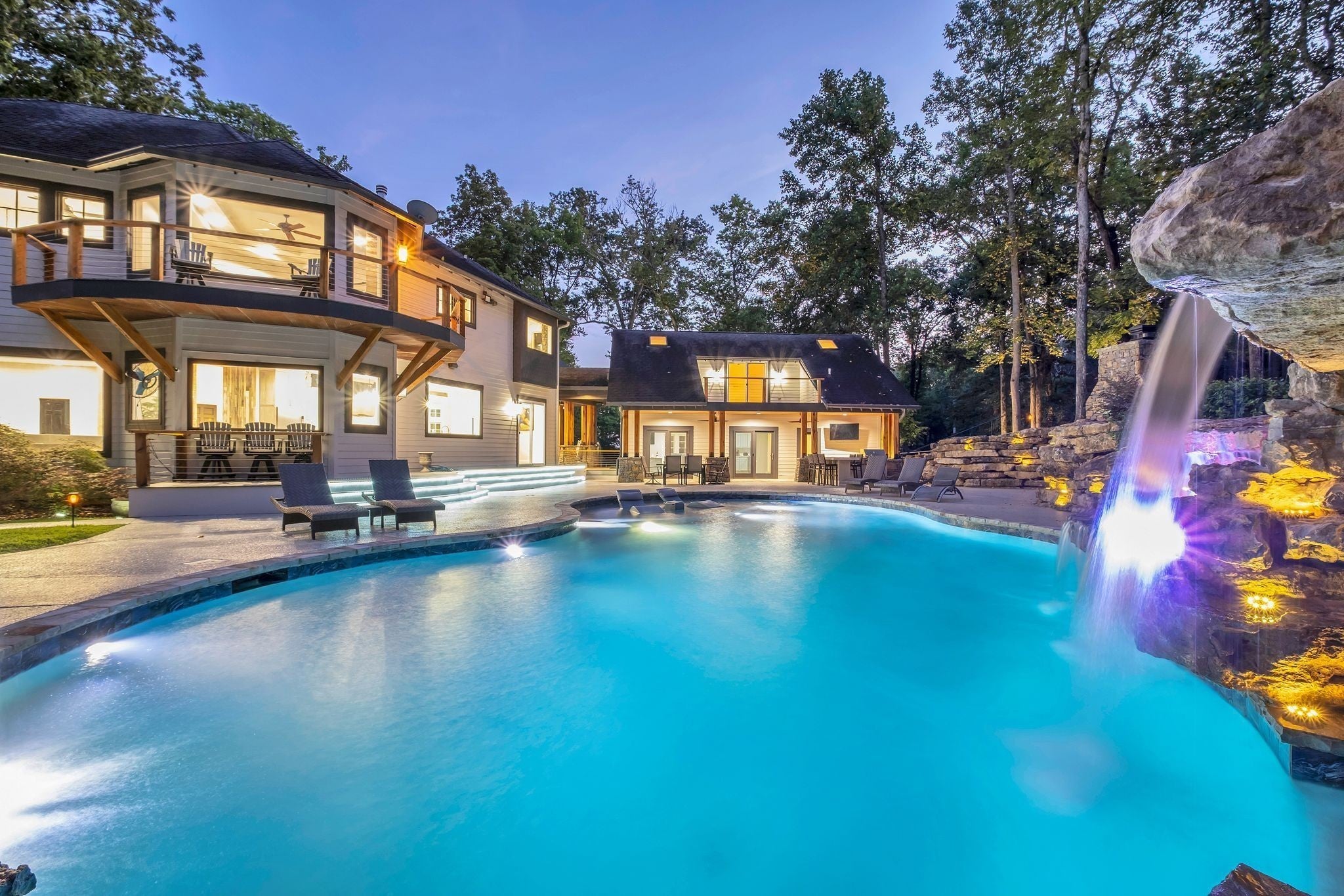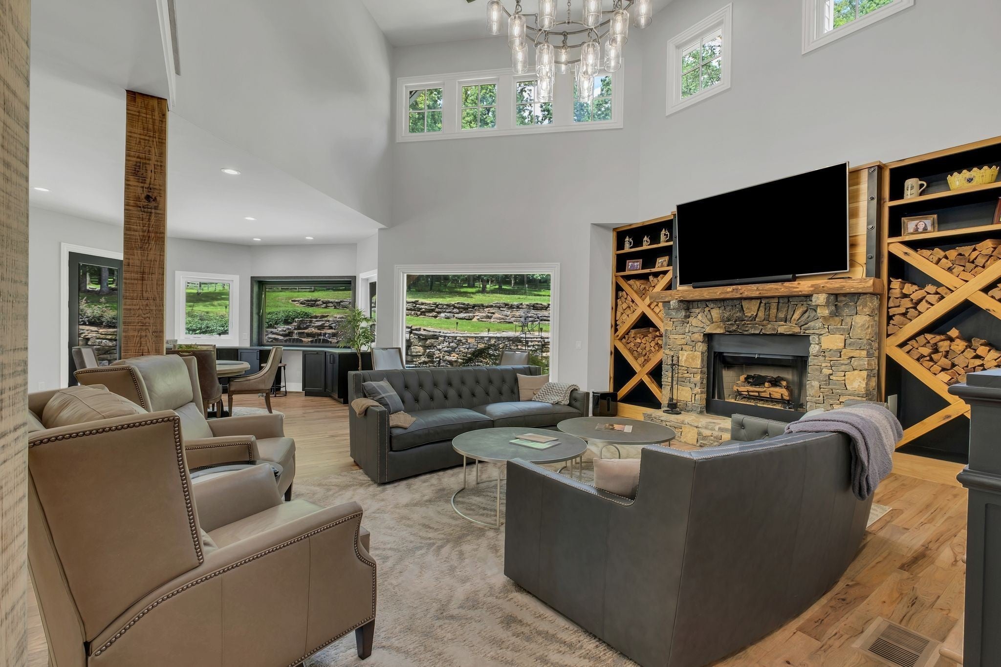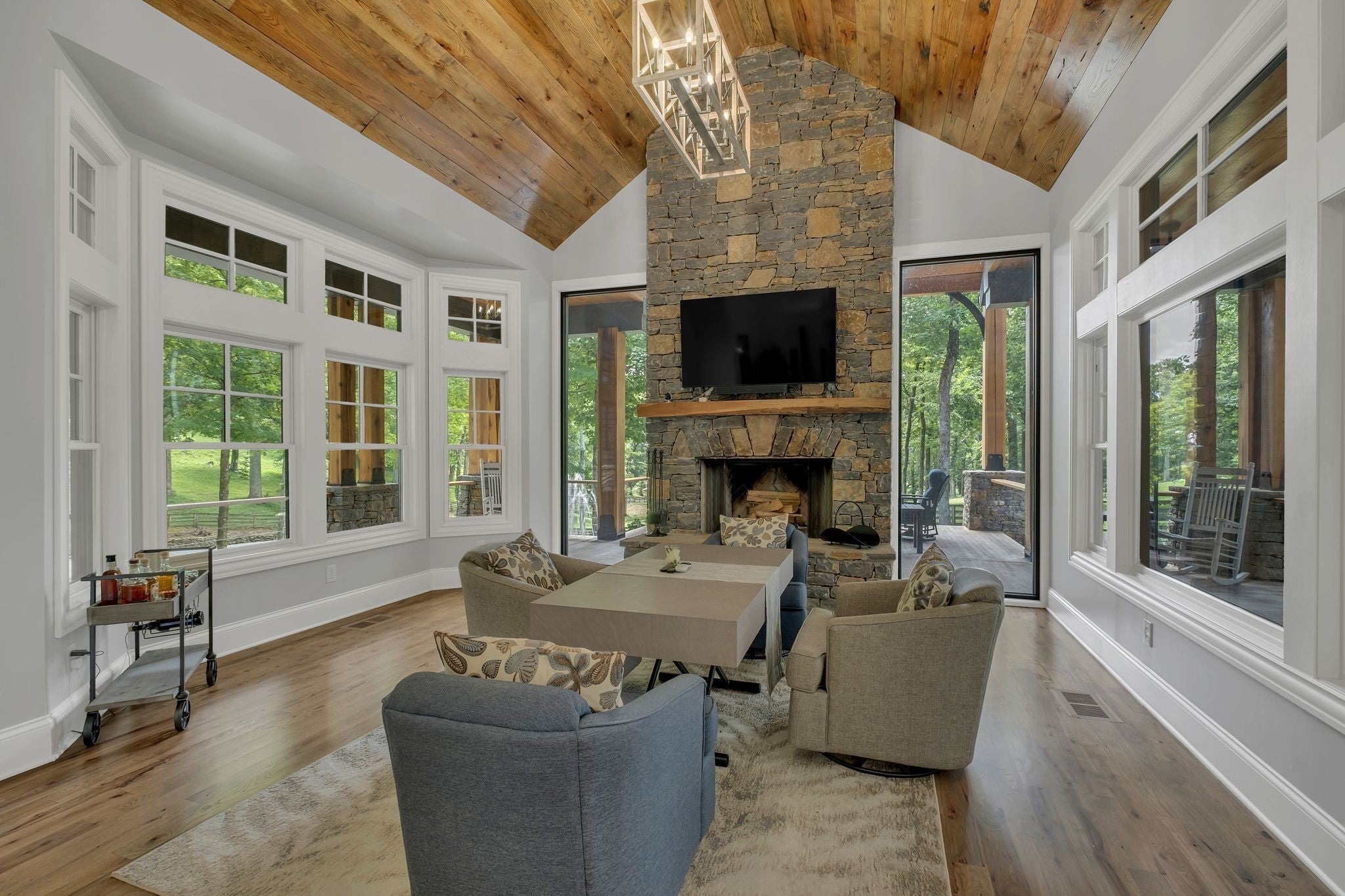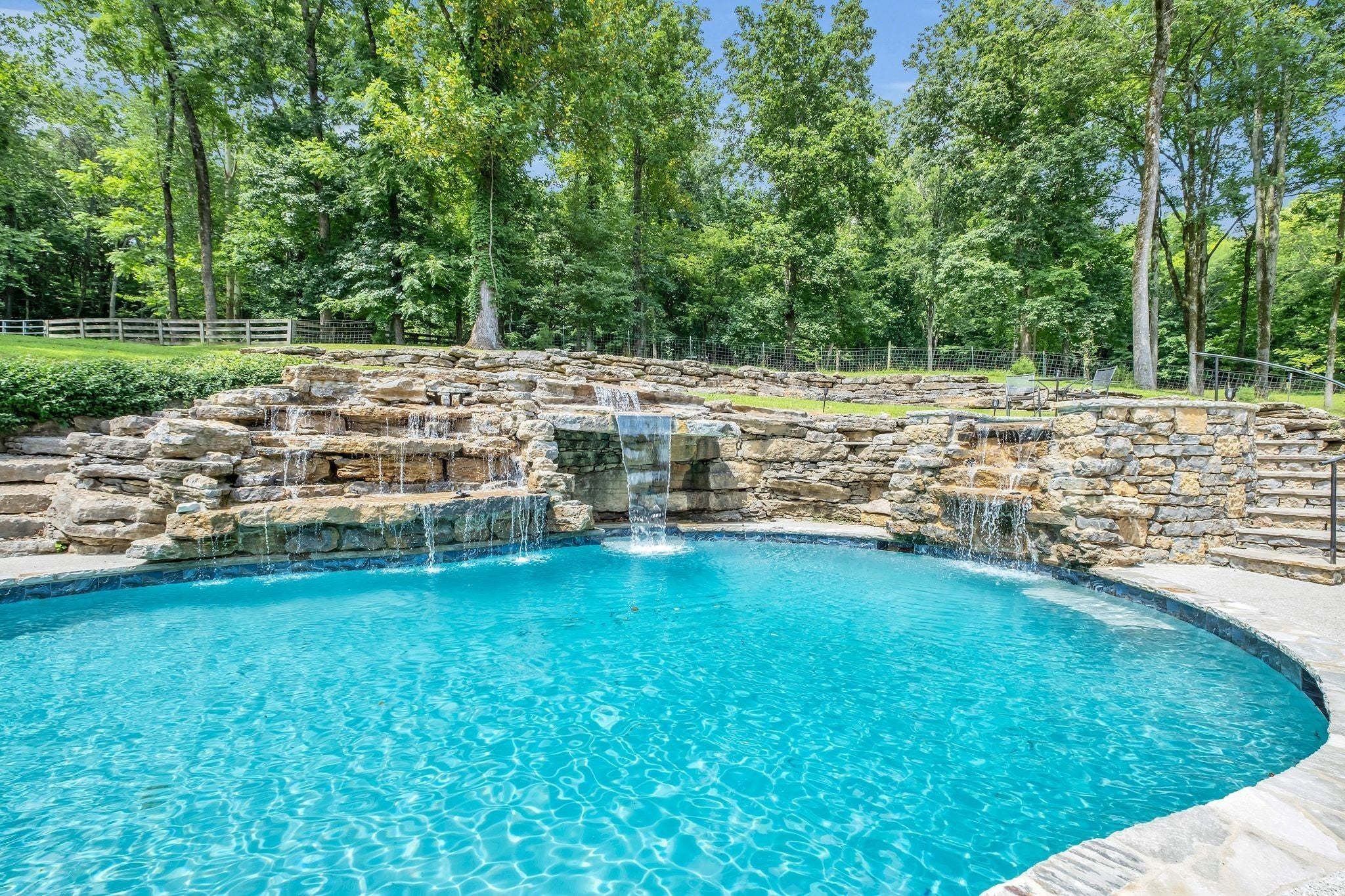 Tucked away in total privacy yet just minutes from the charm of Franklin and Leiper's Fork, this extraordinary estate blends natural beauty with refined living. Enrolled in the Greenbelt program, the acreage is suited for animals or simply enjoying the rolling pastures, wooded ridges, entertainment barn and tranquil pond. At its center rests a 5,748 sq ft custom 5 bedroom home, thoughtfully built with native wood harvested from the property and hand-selected stone. Expansive windows invite the outdoors in, highlighting soaring forest views while the great room’s stone fireplace open-concept design and chef’s kitchen create a perfect gathering place. The primary suite offers a spa-inspired retreat with expansive custom closet. Outside enjoy a resort-style pool with cascading waterfall, covered patio, outdoor kitchen and fireplace elevating your everyday living. Completing the estate is a 1,700 sq ft guest house and a 3,500 sq ft barn with horse stalls, entertaining space and a bar. This is truly rare Tennessee property of remarkable versatility and beauty.