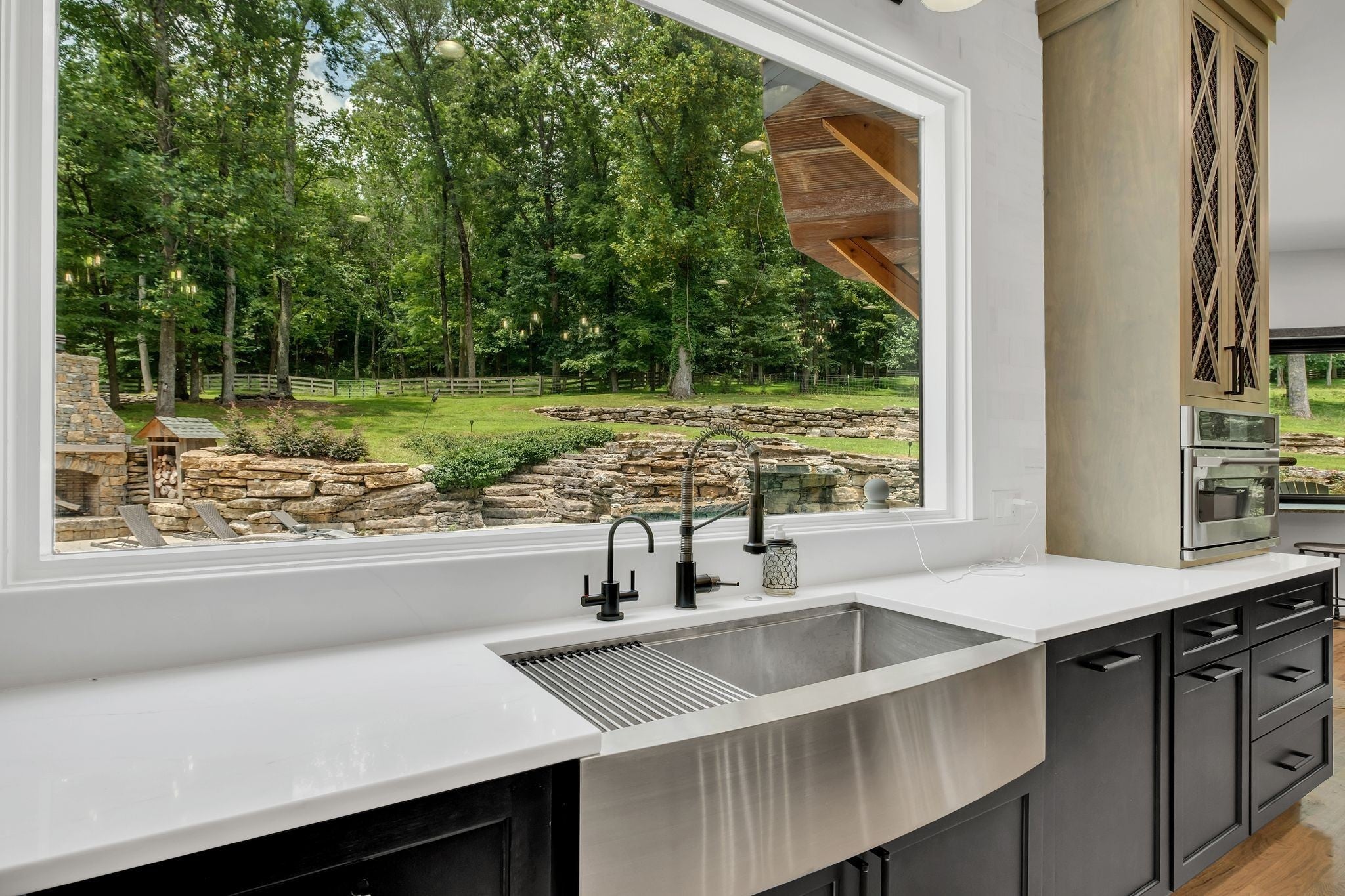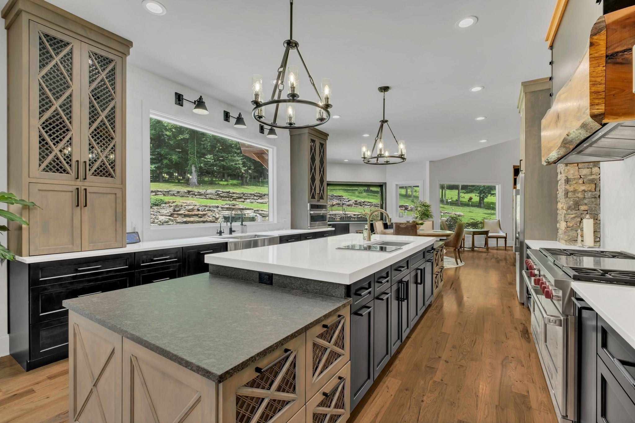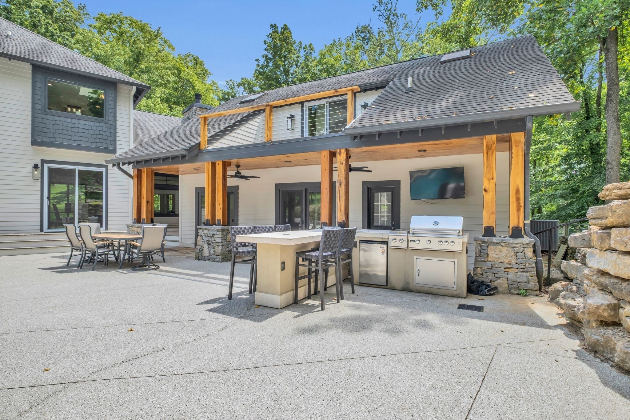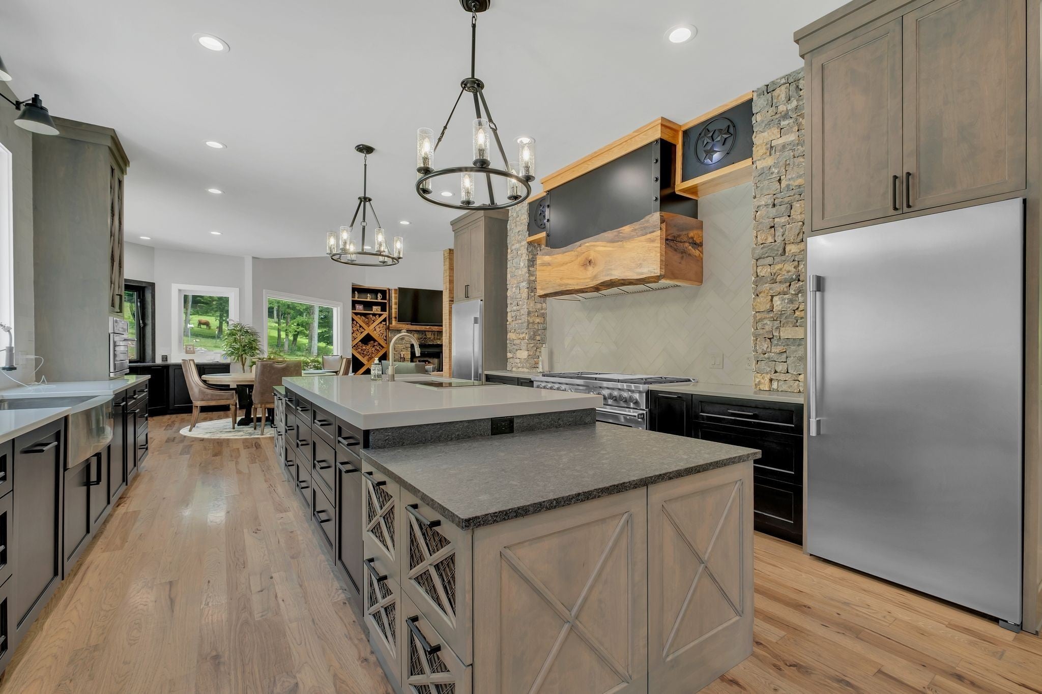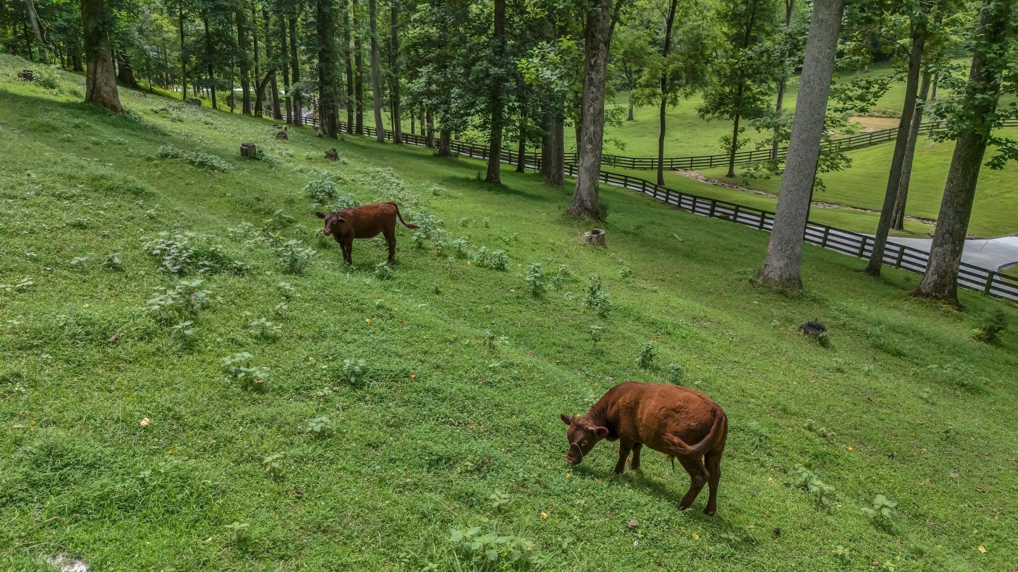 Tucked away in total privacy yet just minutes from the charm of Franklin and Leiper's Fork, this extraordinary estate blends natural beauty with refined living. Enrolled in the Greenbelt program, the acreage is suited for animals or simply enjoying the rolling pastures, wooded ridges, entertainment barn and tranquil pond. At its center rests a 5,748 sq ft custom 5 bedroom home, thoughtfully built with native wood harvested from the property and hand-selected stone. Expansive windows invite the outdoors in, highlighting soaring forest views while the great room’s stone fireplace open-concept design and chef’s kitchen create a perfect gathering place. The primary suite offers a spa-inspired retreat with expansive custom closet. Outside enjoy a resort-style pool with cascading waterfall, covered patio, outdoor kitchen and fireplace elevating your everyday living. Completing the estate is a 1,700 sq ft guest house and a 3,500 sq ft barn with horse stalls, entertaining space and a bar. This is truly rare Tennessee property of remarkable versatility and beauty.