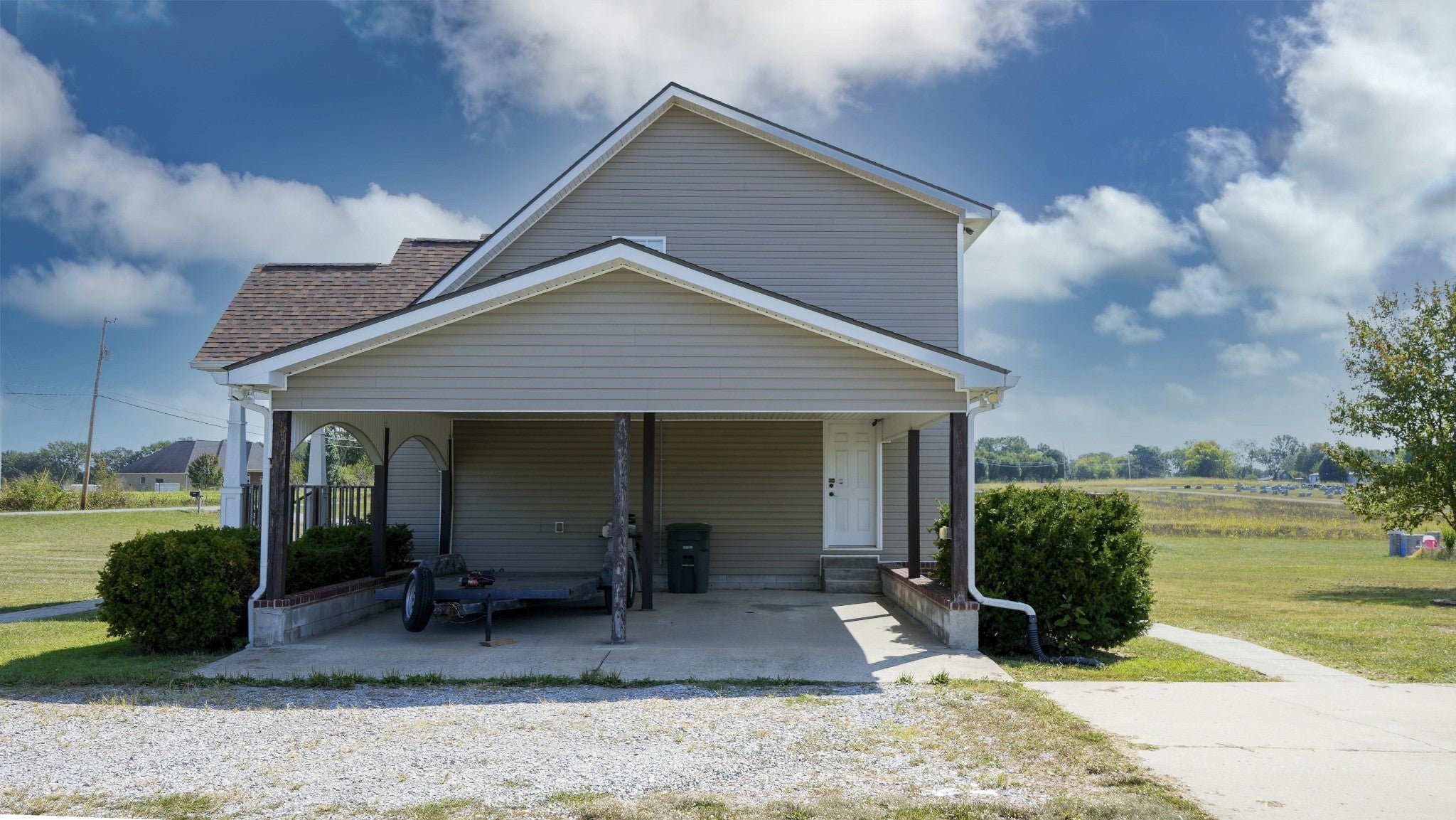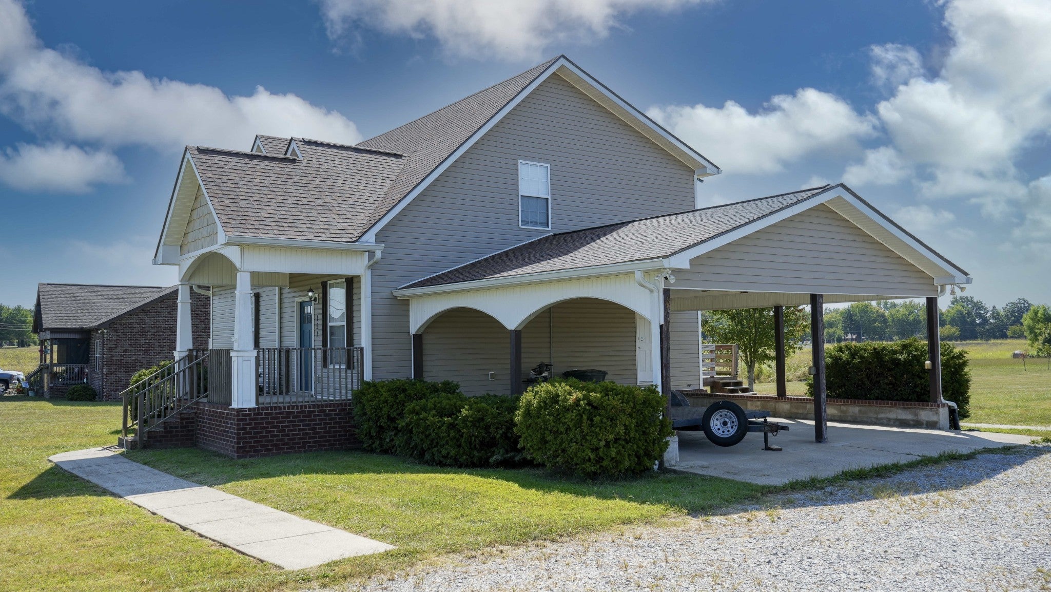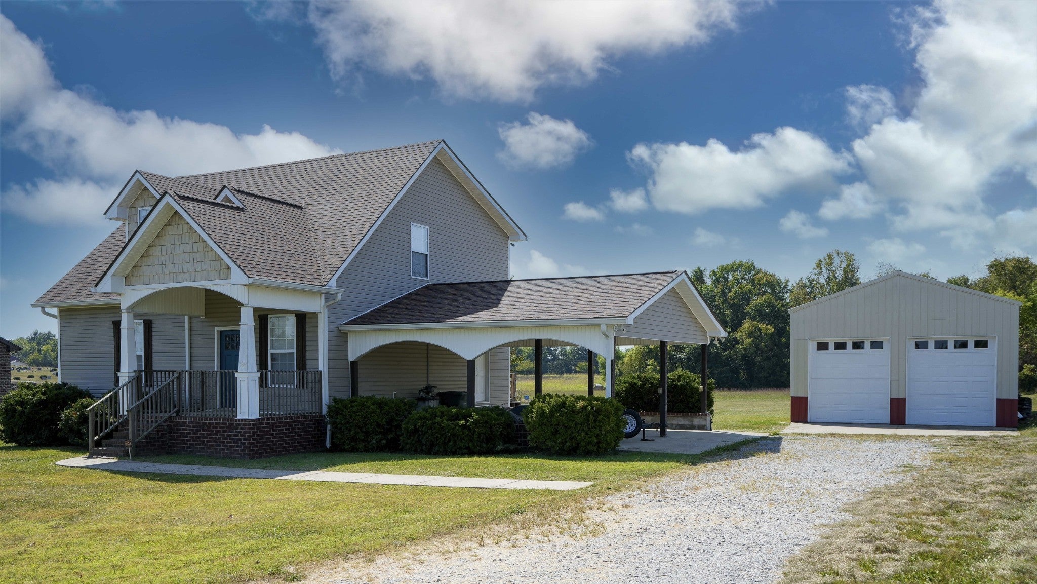 Welcome to your future home nestled on 1.96 serene acres- a perfect blend of convenience, community, and countryside... breathe deeply and live freely... this home offers the perfect blend of modern style and country living. A covered porch with stylish arches andclassic white painted columns invites you inside, where the open floorplan feels warm and welcoming. The kitchen is bright and modern with farmhouse style. The large glass door to wide open spaces and natural surroundings of the acreage beckon you to relax and dream.The first floor master bedroom and bath feature dual walk-in closets, ensuite and custom tile shower. The upstairs bonus room provides a lovely versatile space for home office or second living area. On the upper floor are two oversized bedrooms and smartly thought out jack/Jill style bathroom. A graceful carport repeats the classic lines of the front entry arches and columns while the large detached pole barn adds versatility ideal for hobbies, workshop or even horses, mini Highland cows or chickens! Air compressor in detached 35x24 pole barn/garage remains.
