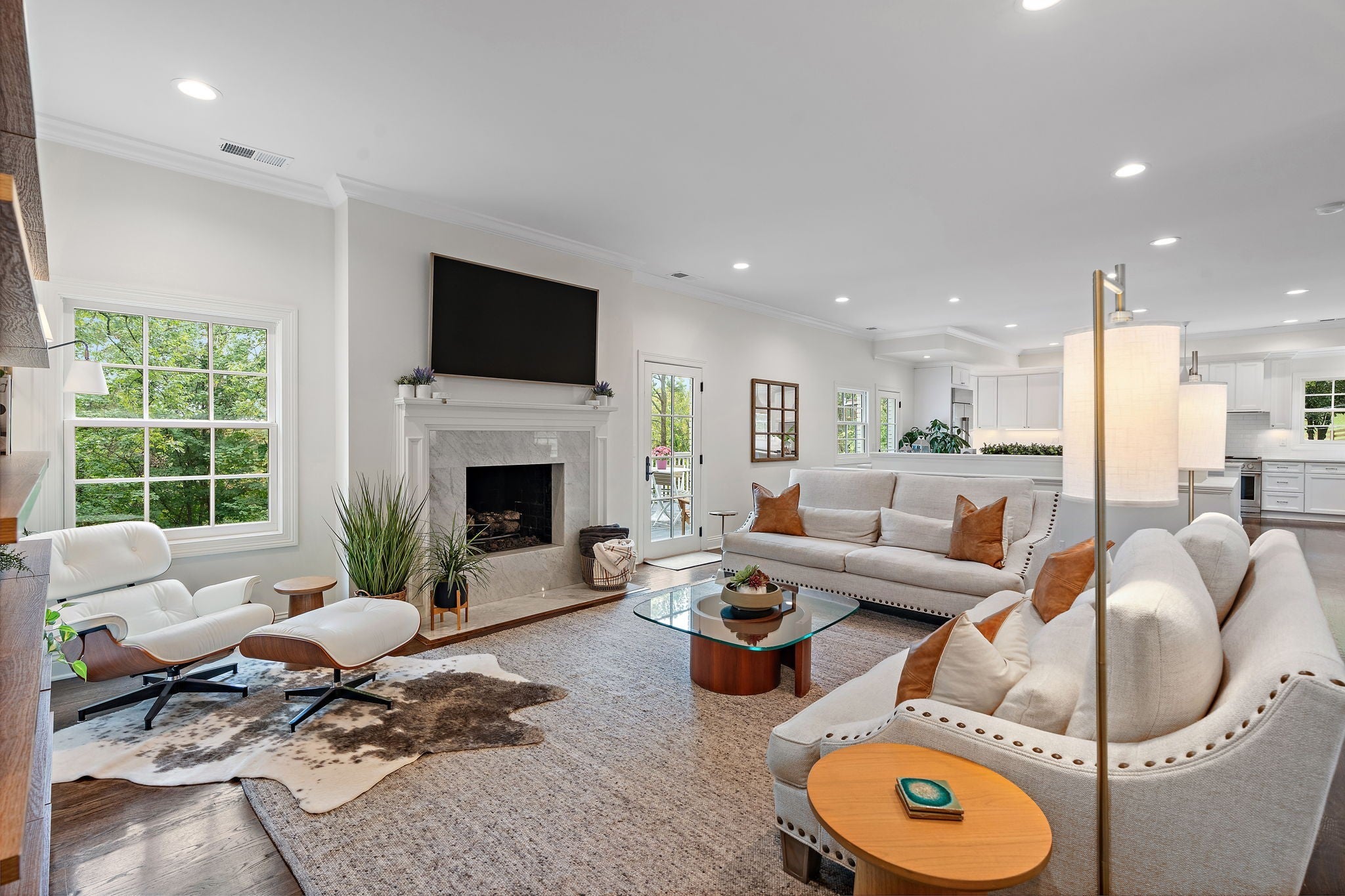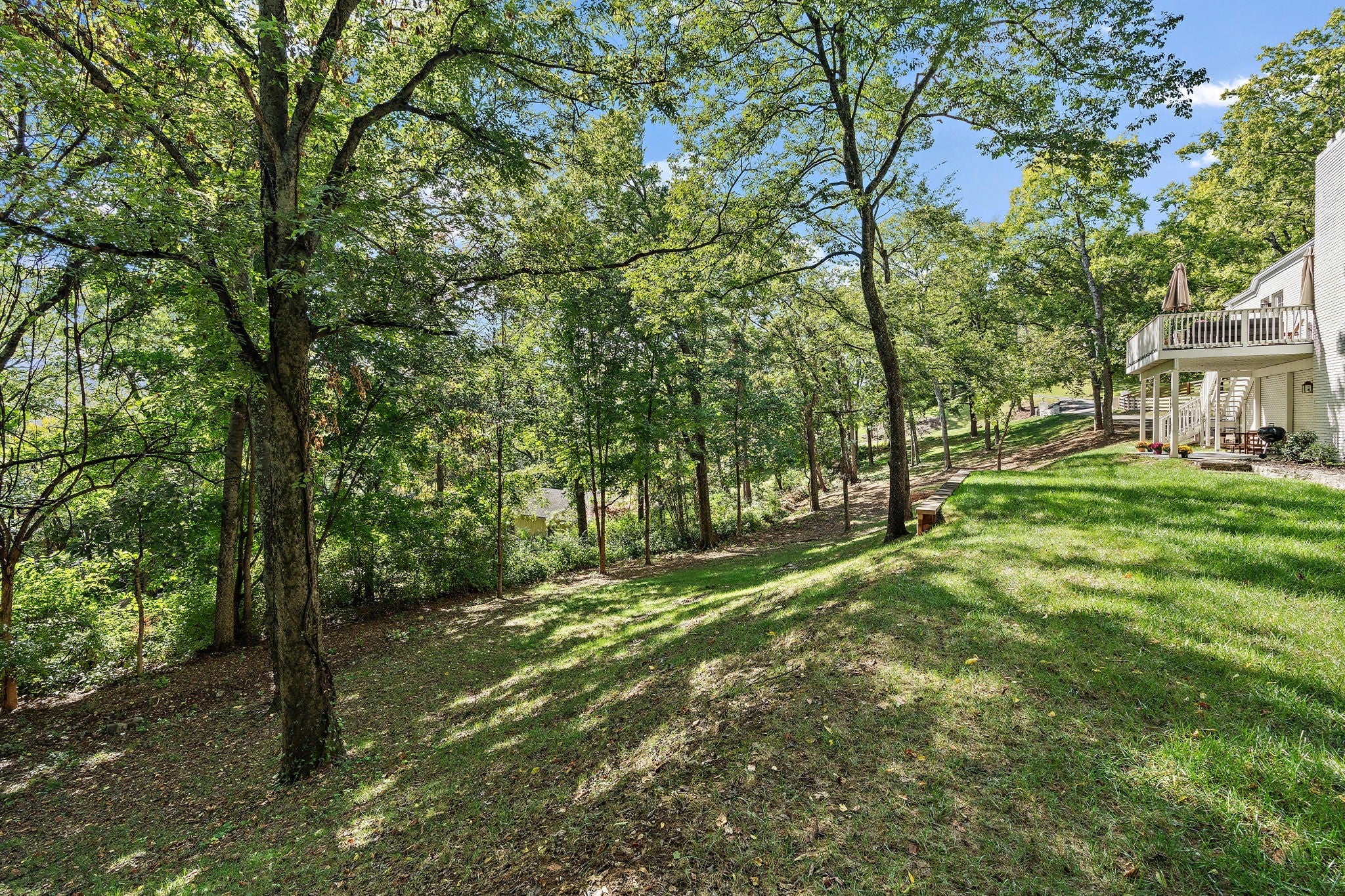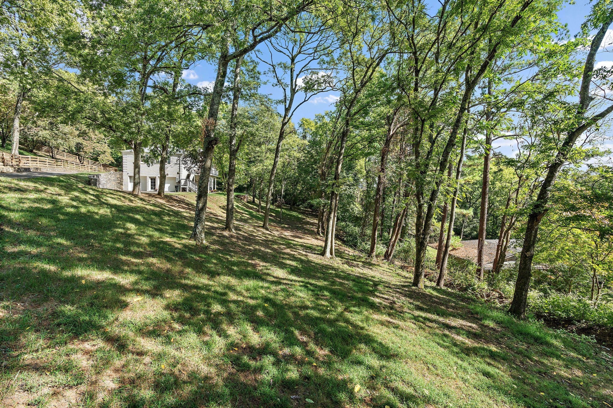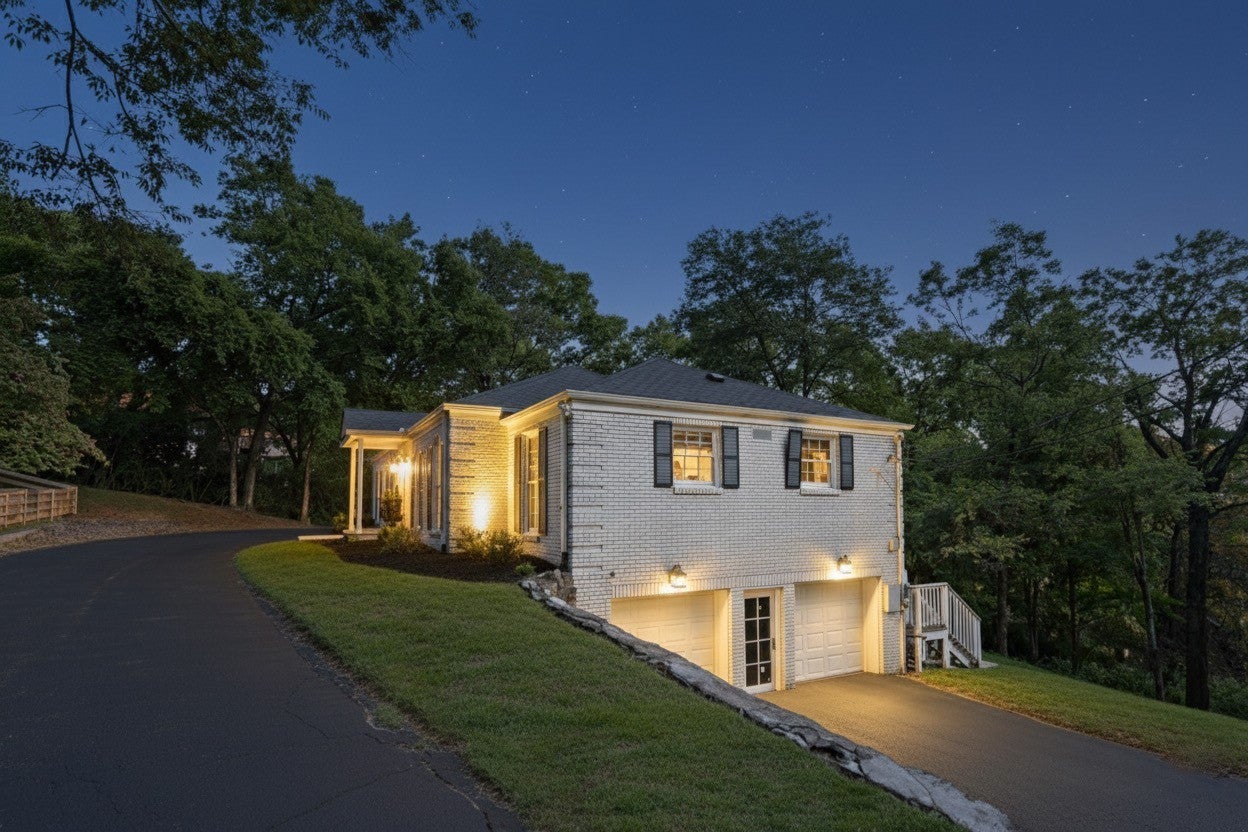Set above the street on a private, wooded 1.1-acre rise, 5622 Hillview delivers estate privacy with true in-town convenience. Fully renovated and move-in ready, the home lives bright and open with sightlines to trees from every room. Main level features a generous primary suite, a guest bedroom, formal dining, a custom kitchen built for daily use and entertaining, and a large living room with fireplace. The lower level adds a second living room with fireplace and wet bar, two additional bedrooms and full baths, plus an office, ideal for guests or an in-law suite. Ten-foot ceilings on the main, wide-plank hardwoods, custom built-ins, and quality finishes throughout. Outside, the setting feels quiet and protected, with a fully fenced front lawn and mature canopy. Location puts you minutes to Brentwood’s Hill Center, Maryland Farms, schools, and daily amenities. Seclusion without the sacrifice, privacy without the commute.