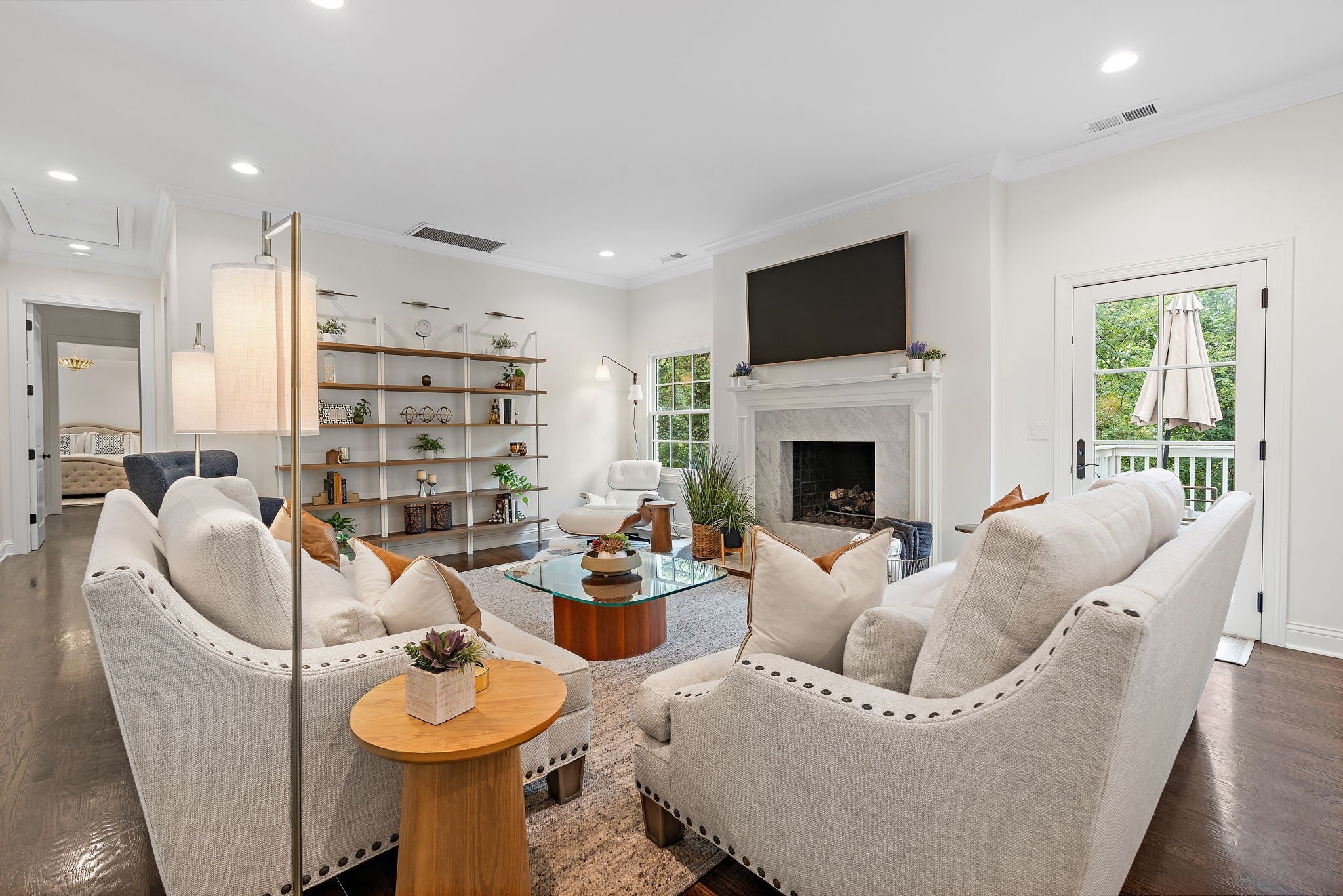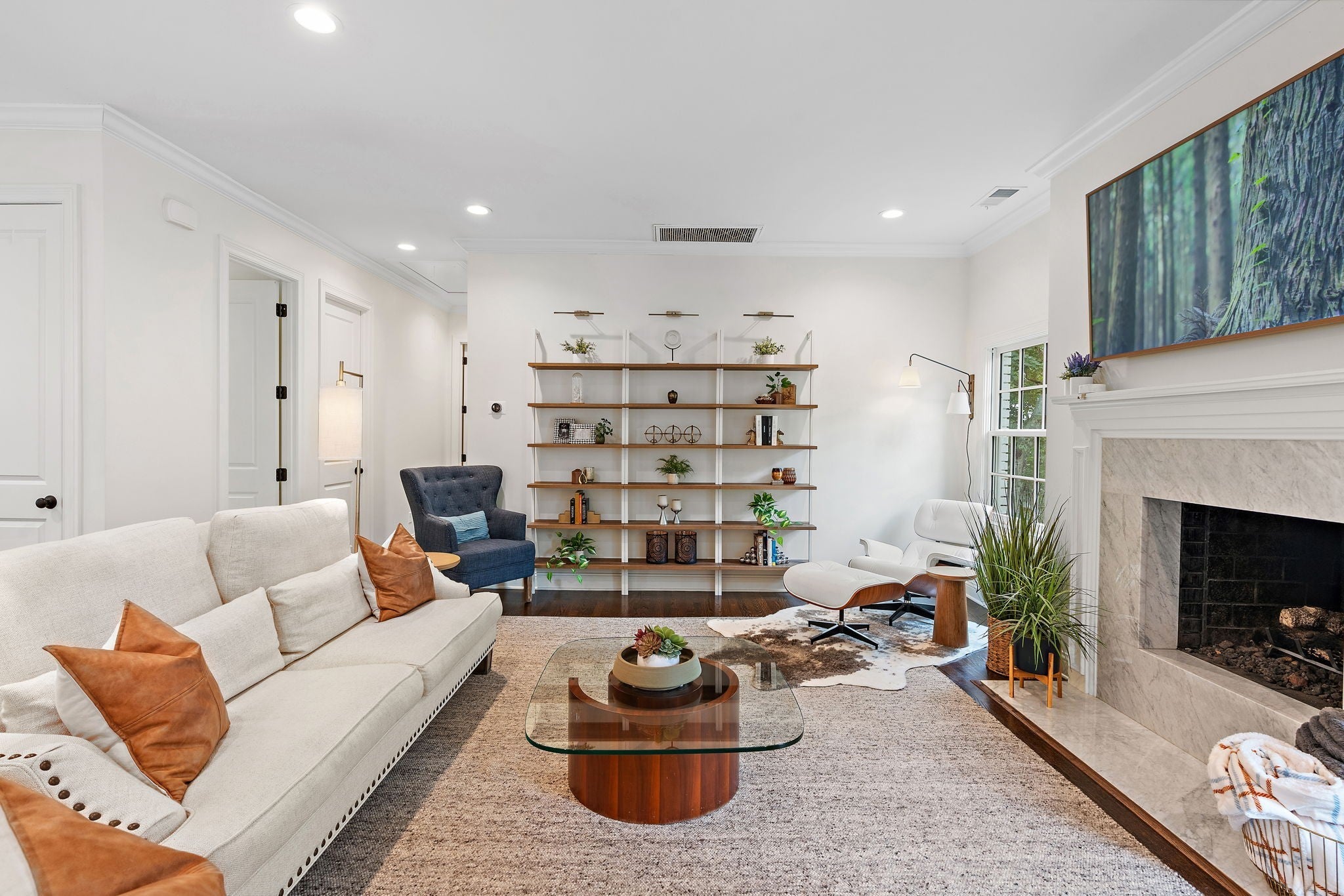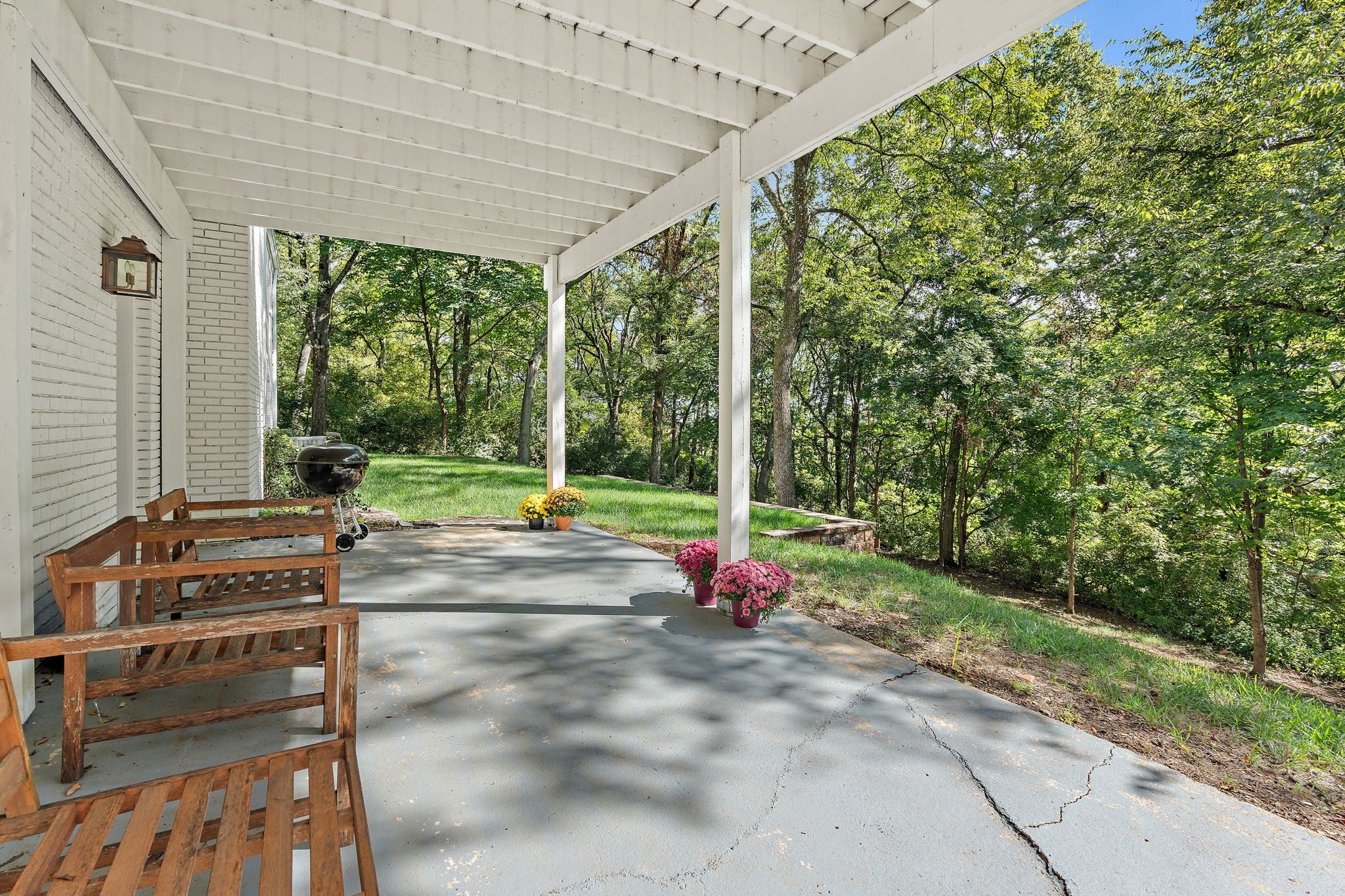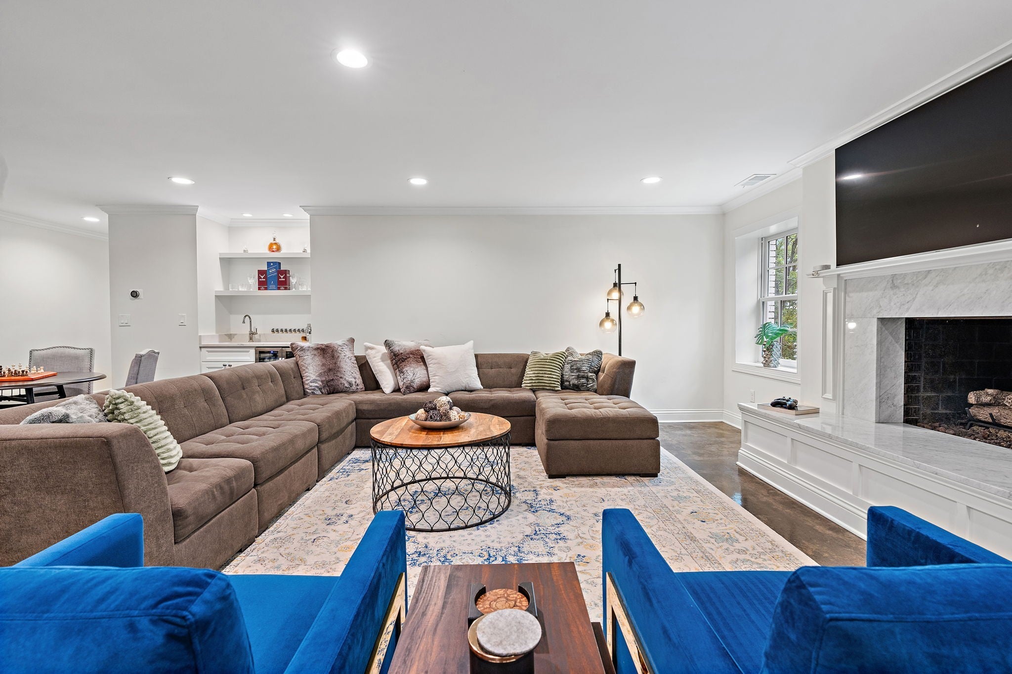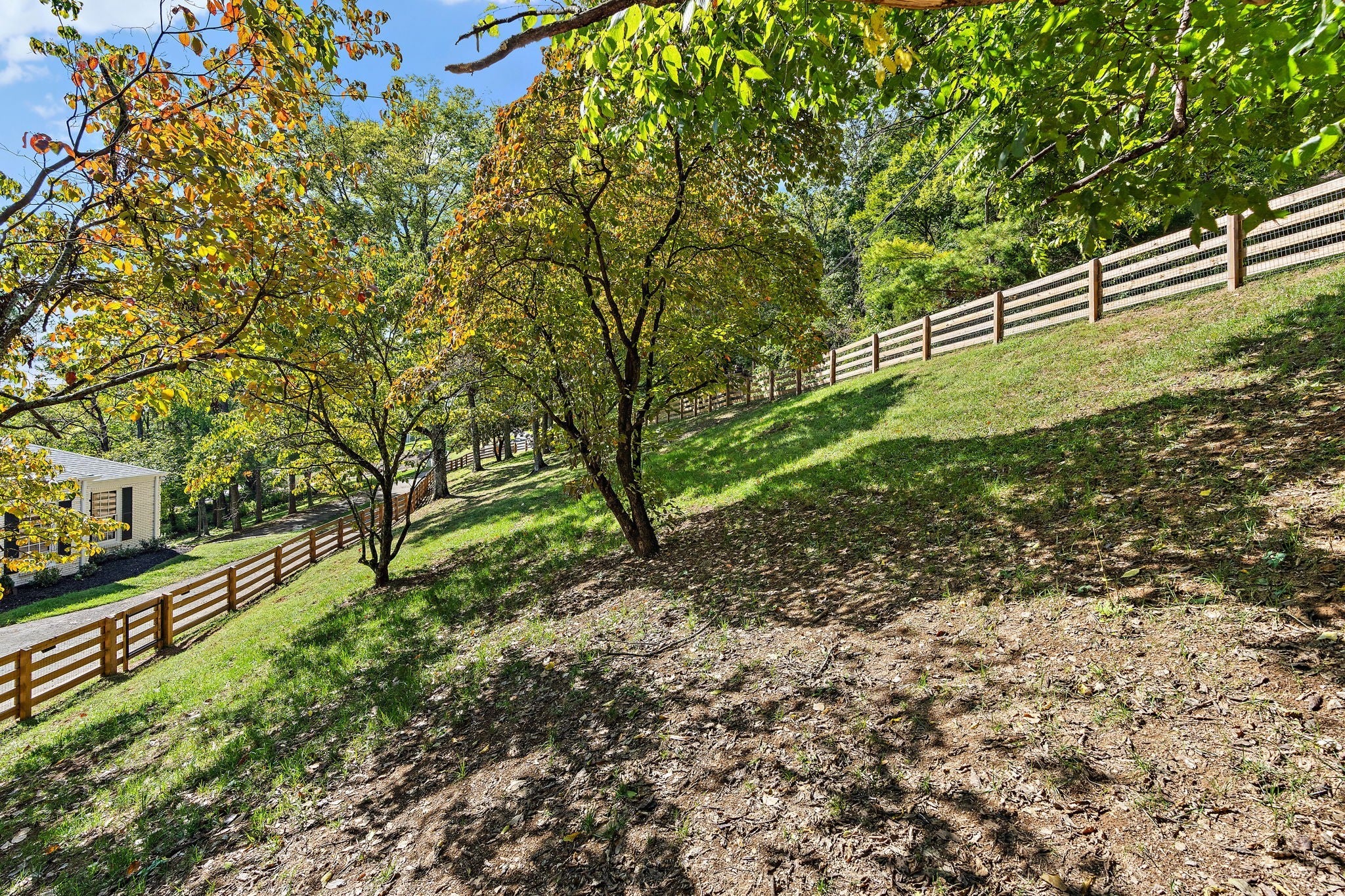 Set above the street on a private, wooded 1.1-acre rise, 5622 Hillview delivers estate privacy with true in-town convenience. Fully renovated and move-in ready, the home lives bright and open with sightlines to trees from every room. Main level features a generous primary suite, a guest bedroom, formal dining, a custom kitchen built for daily use and entertaining, and a large living room with fireplace. The lower level adds a second living room with fireplace and wet bar, two additional bedrooms and full baths, plus an office, ideal for guests or an in-law suite. Ten-foot ceilings on the main, wide-plank hardwoods, custom built-ins, and quality finishes throughout. Outside, the setting feels quiet and protected, with a fully fenced front lawn and mature canopy. Location puts you minutes to Brentwood’s Hill Center, Maryland Farms, schools, and daily amenities. Seclusion without the sacrifice, privacy without the commute.