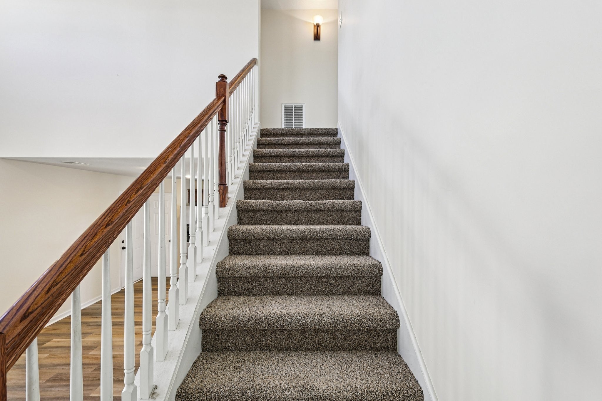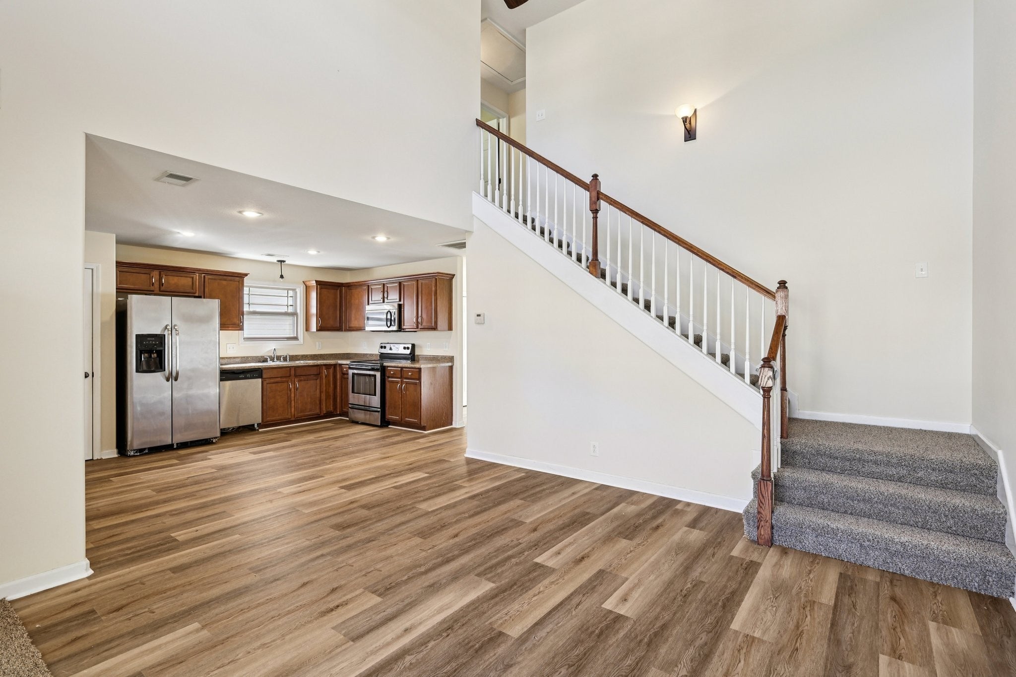 Move-in ready Clarksville home with new flooring throughout. The main level features a bright living room with a vaulted ceiling, an open eat-in kitchen with a pantry, a first-floor laundry, and a convenient first-floor bedroom and full bathroom. The second floor offers a spacious primary bedroom with an ensuite bathroom and an additional bedroom. Outside you'll find a covered front porch, 1-car garage, and concrete patio overlooking a private fenced yard with a fire pit. Enjoy a low-maintenance lifestyle- the HOA maintains the front and backyard lawn care, trash and community landscaping. The community offers playgrounds, sidewalks, and underground utilities. Excellent location with easy access to I-24 and Fort Campbell. Schedule a tour to see this home in person today!