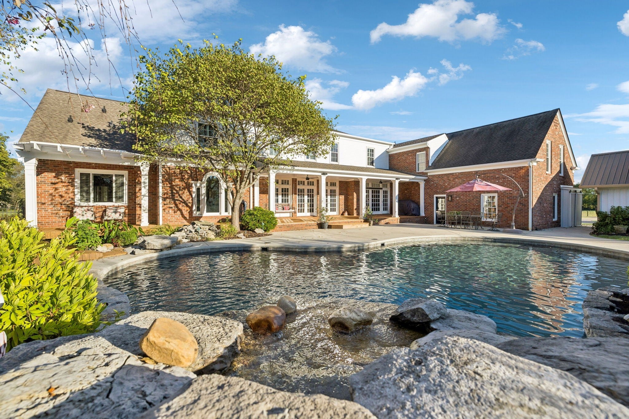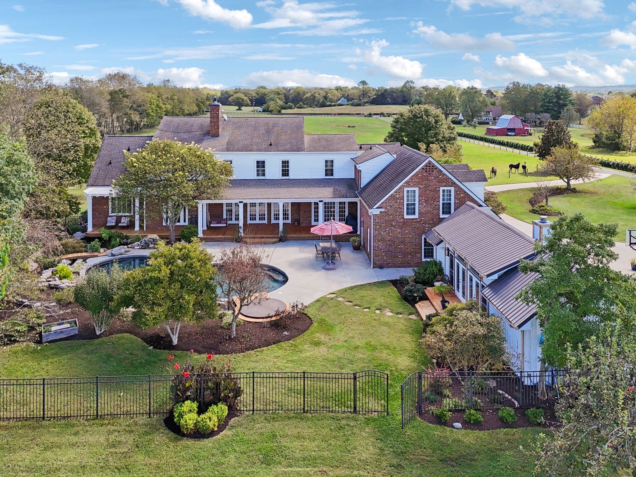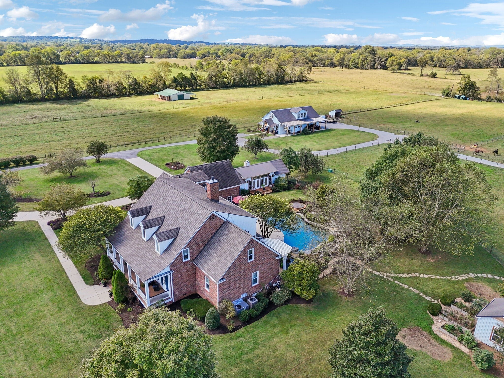 This exceptionally appointed horse farm is perfect for the equine enthusiast! The beautifully laid out 14 acres is completely utilized as well as fenced and cross fenced for your horses and livestock. There is water and shelter in almost every pasture as well as a three stall horse barn with wash stall, hay storage, tack and feed room and office w/kitchen 1/2 bath as well as an 80x180 deep sand arena. The expansive home is a timeless colonial design. This well built brick home has not only 5 bedrooms but an additional workout room, small crafting room and bonus room. Master on the main floor with 4 additional bedrooms and a workout room/ office upstairs. This home has lots of options for a large family, entertaining guests and working from home. The attached two car garage even has a built in underground storm shelter. The roomy kitchen has an ample sized island for eating at as well as a breakfast nook that overlooks the pool. There is also a formal dining room equipped with it's own fireplace. The bright and roomy master bedroom is on the main floor and has a door that walks out to the amazing pool area complete with hot tub and coy pond! Among these features there is picturesque landscaping and a stone waterfall that flows into the pool. Adorable pool house has a bathroom, shower and quaint sitting area with a small kitchen and stone fireplace where you can overlook your amazing poolside oasis. On the East side of the house you'll find the recently completed two bedroom two bath apartment. This living space is well appointed and has a beautiful modern/rustic design. In that same structure you find a lean to large enough to park your truck and trailer, motor home or boat. Behind the apartment is a shop area for all of your farm necessities. This property is has been exceptionally thought out and completed with every detail in mind with high quality materials and workmanship. It has been well maintained and is ready for it's new owners to enjoy it!