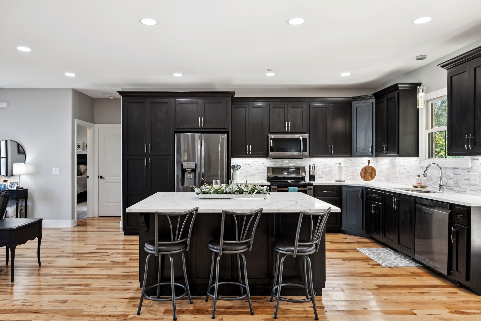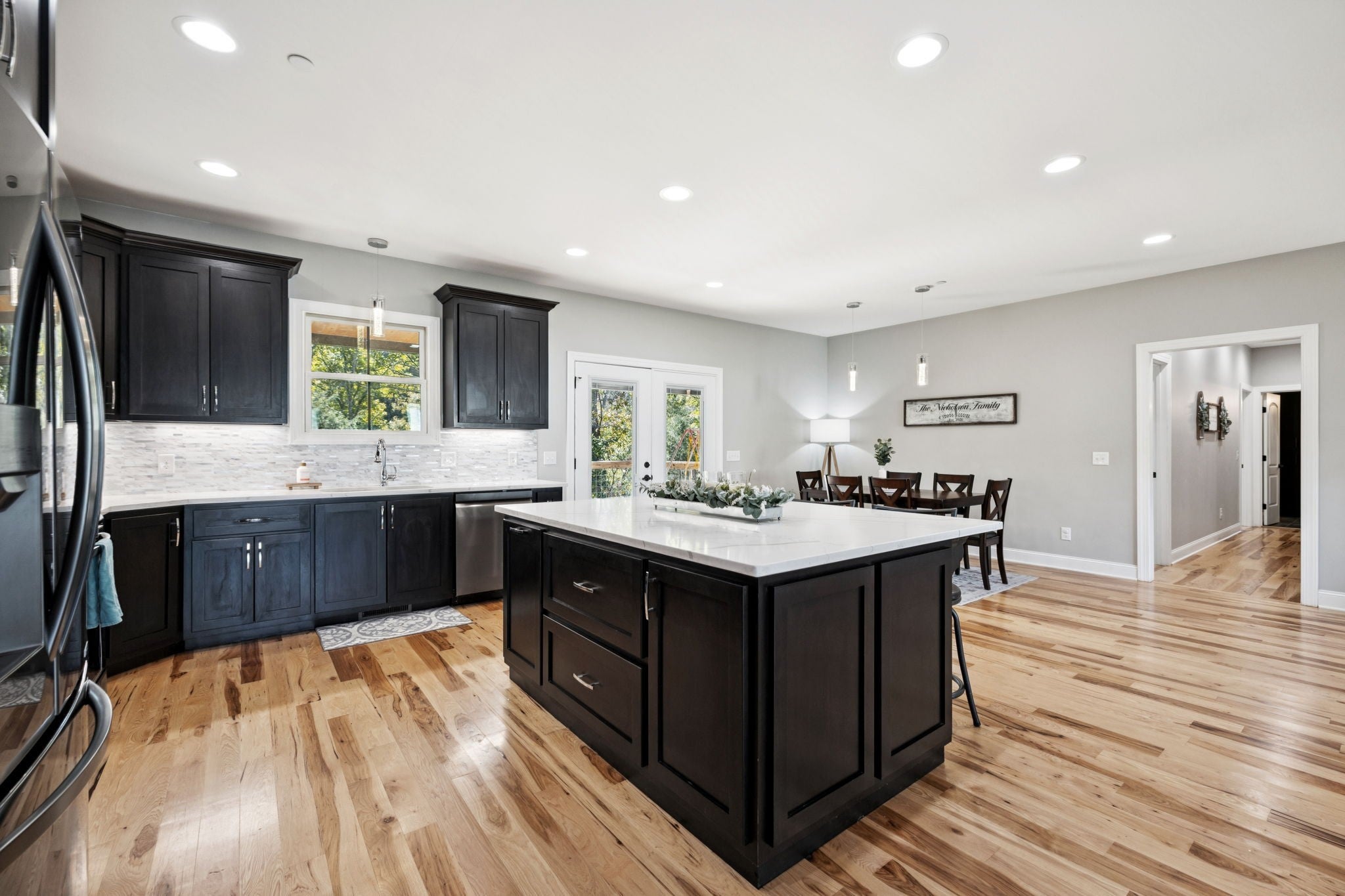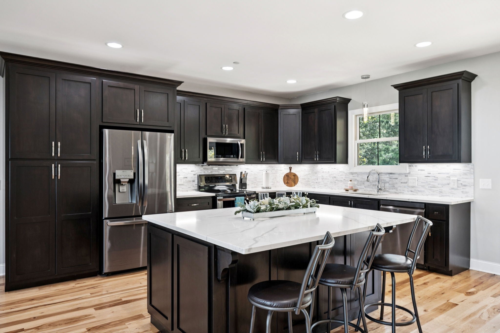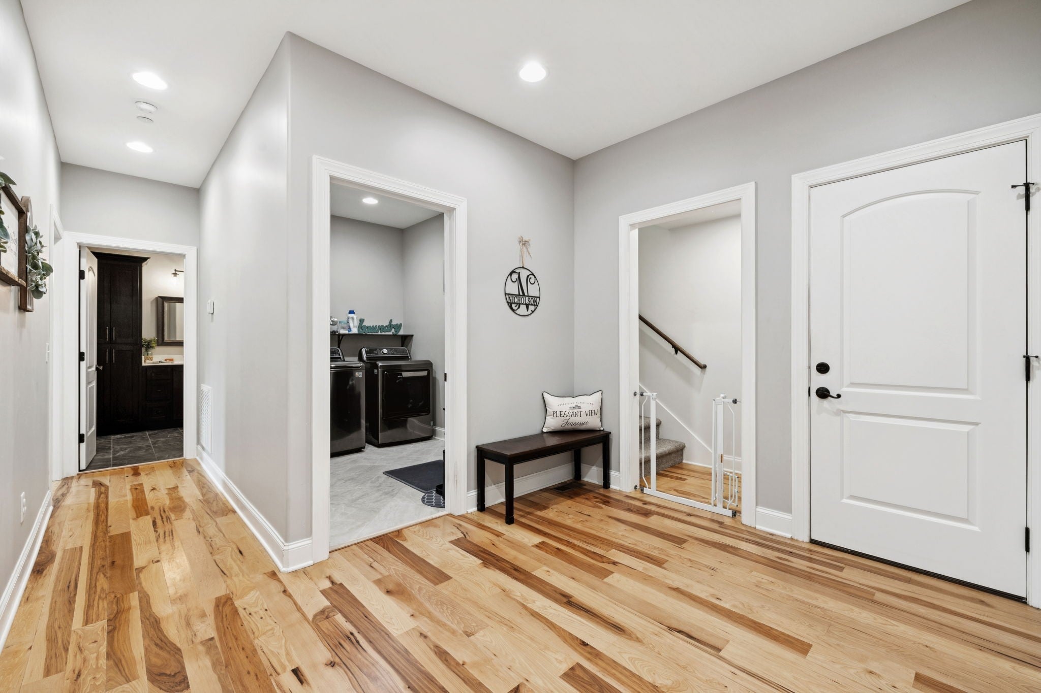 One of the newest homes in Town Pride Subdivision on one of the best lots that is bordered by the creek~one level of PURE HAPPINESS~this custom, one owner home feels like new the minute you walk in~beautiful brick on the exterior just gives a glimpse of the attractive interior that awaits! Real Hickory hardwood floors throughout~an open living/kitchen/dining concept with a large island topped with gorgeous quartz for plenty of cabinet and counter space~all stainless appliances and all remain~make the fireplace the center attraction just in time for the Christmas decorating to begin (or at least that is what IG is showing)~recessed lighting throughout~large master suite with a bath to die for and yes you can faint right on the heated tiled floors and never worry about getting chilled~tankless water heater and natural gas which is a rarity these days even in new construction~nice laundry room~walk-in attic great for storage~covered deck with a tongue and groove ceiling in rear where you can see the creek~pool table remains for all you pool sharks