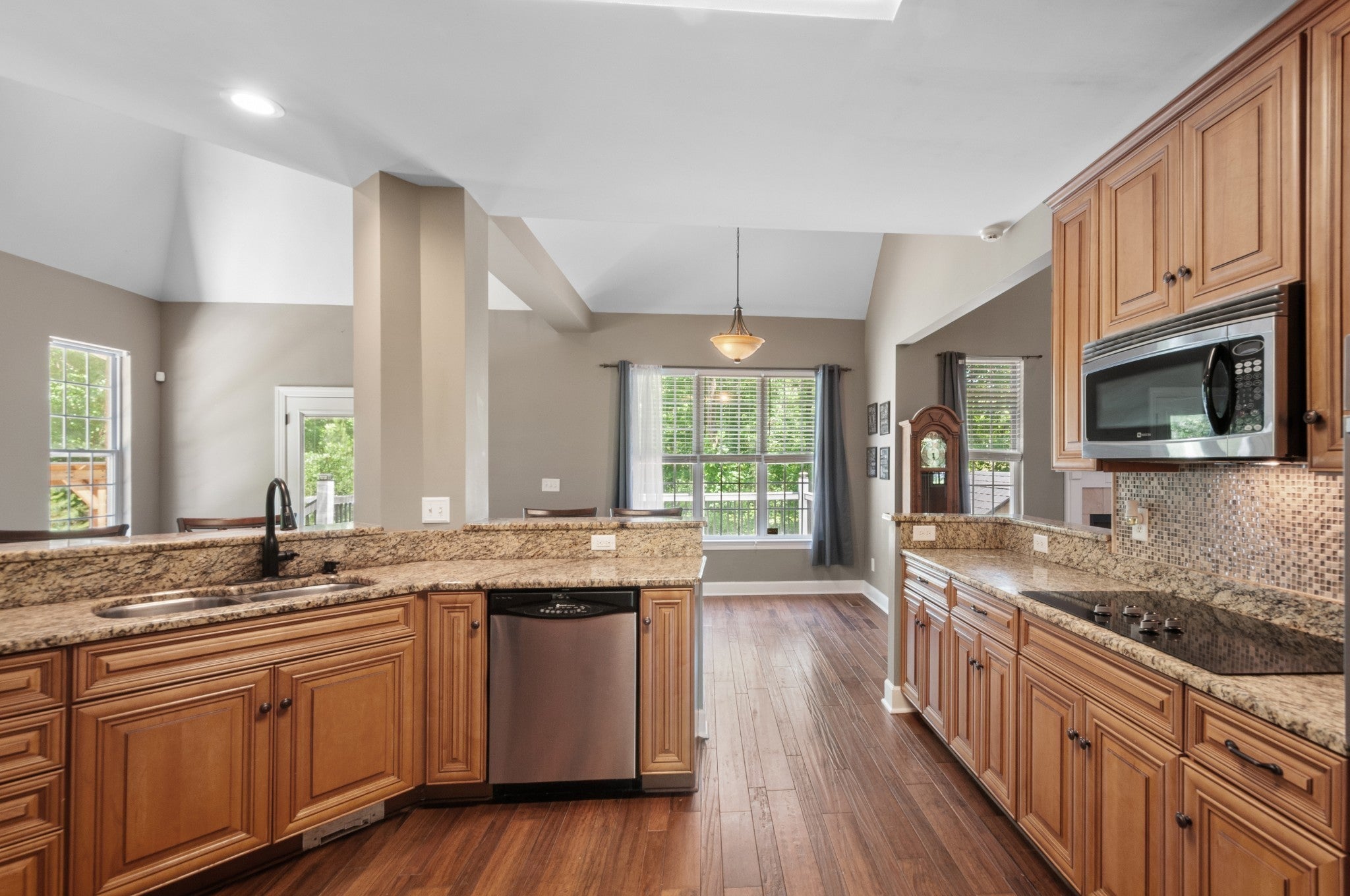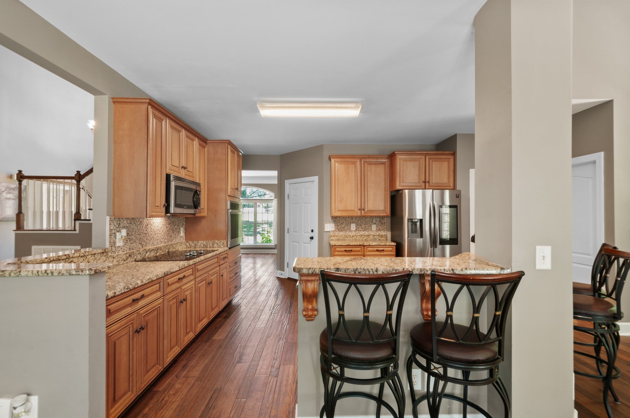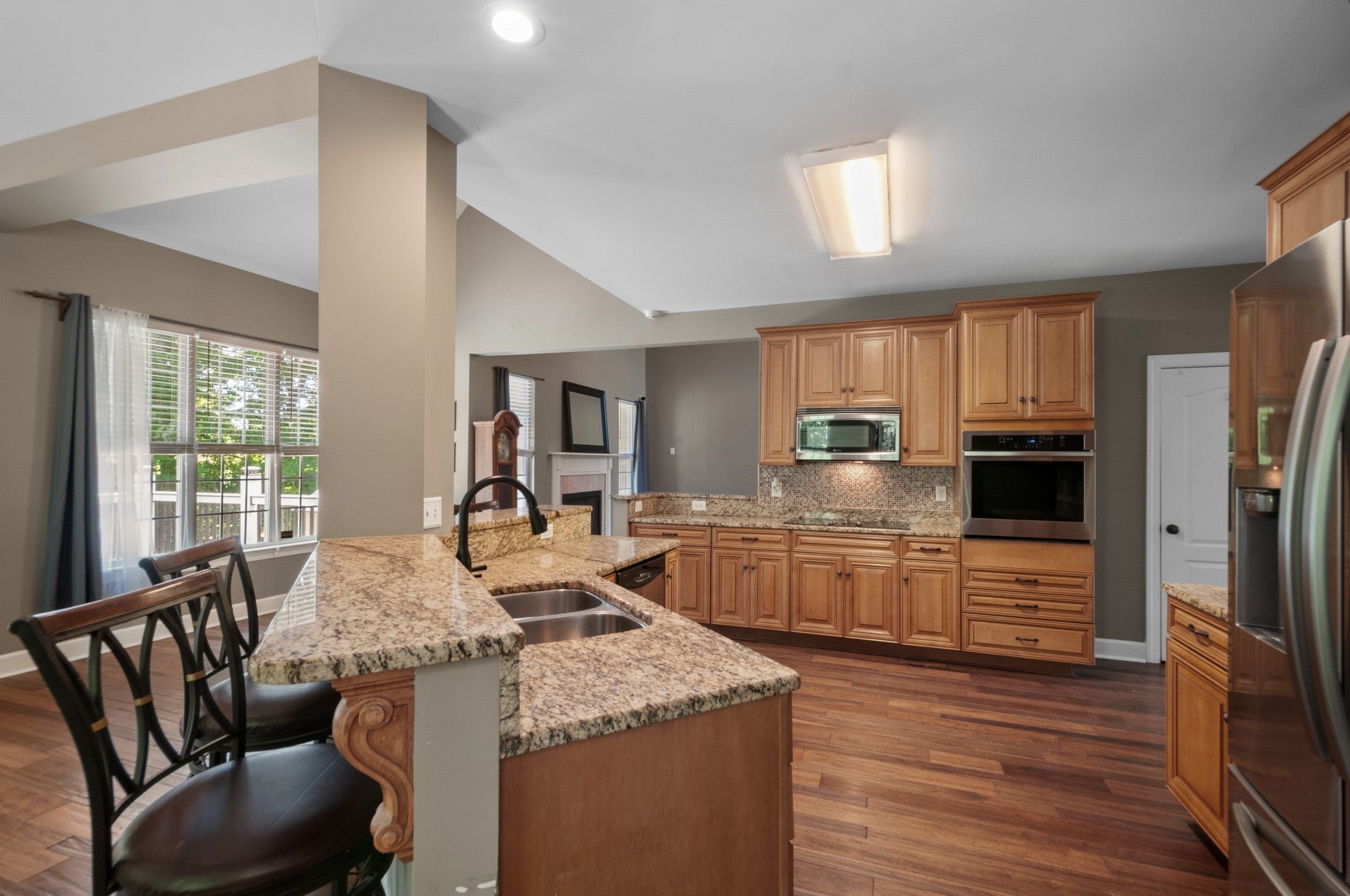 - Built-In Electric Oven, Cooktop, Dishwasher, Disposal, Microwave, Refrigerator, Stainless Steel Appliance(s)