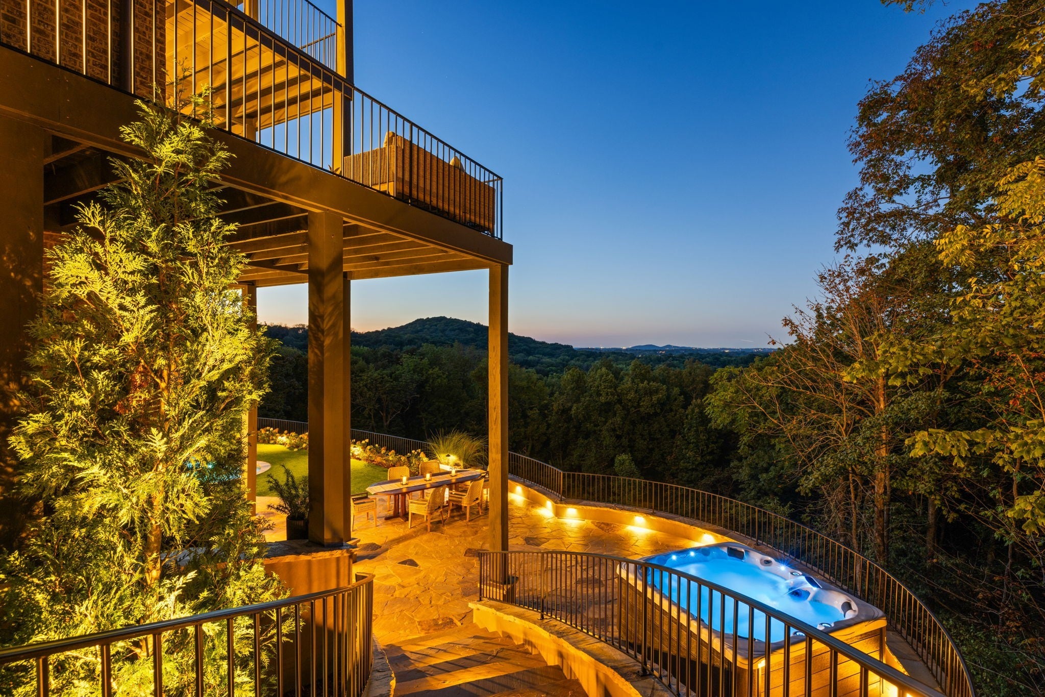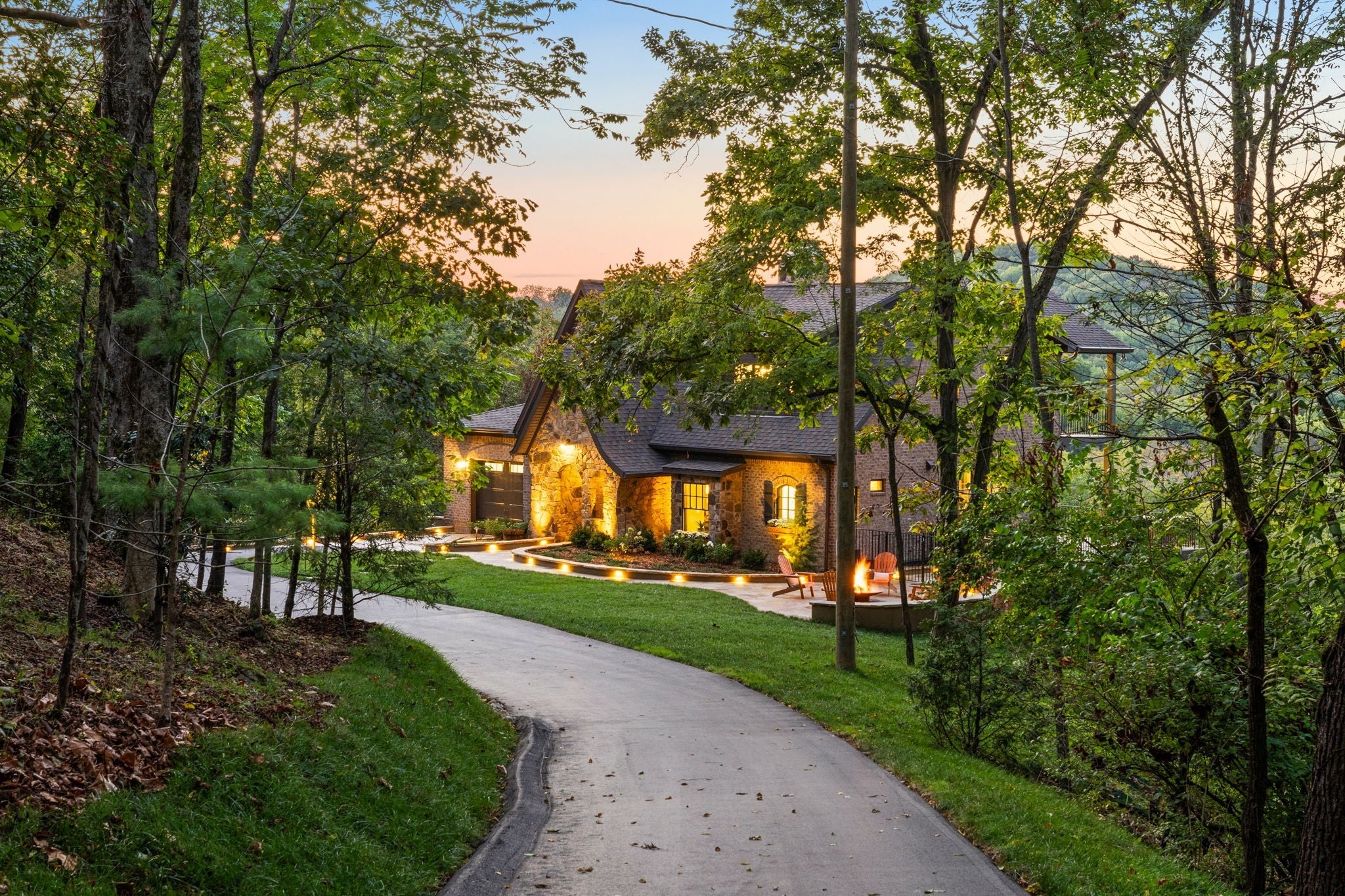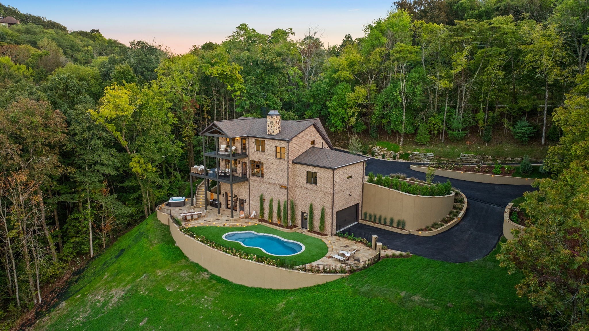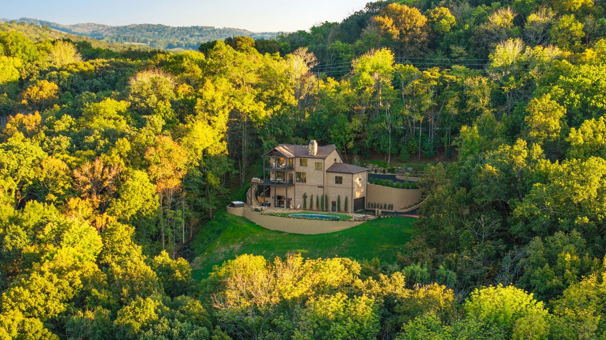 Nestled within the treasure of unexpected, hidden hills in Williamson County, this custom estate rests at the peak of highly sought-after Burke Hollow Road, unfolding across over eight acres of beautiful Tennessee landscape. It offers the charm of a private mountain lodge with the elegance of a luxury retreat- inspired by the timeless beauty of the Grove Park Inn. From its elevated vantage point, enjoy sweeping, unobstructed views, including Music City’s distant lights, creating a setting that feels both peaceful and extraordinary. Here, grandeur is defined by the way the home lives—flowing effortlessly with its breathtaking surroundings, so deeply connected to the natural landscape that it feels as though it has no end. Across three levels of living, you’ll find four bedrooms and four and a half baths, where thoughtful design meets everyday comfort. The main level showcases an expansive covered and uncovered wraparound deck off the kitchen and living room—perfect for entertaining large gatherings or enjoying retreat-like seclusion with panoramic views. The lower level impresses with soaring ceilings over grand living and dining areas, recreational spaces, full bath and secondary laundry, with adjoining oversized 2-car garage- all seamlessly connecting to multiple natural stone patios, heated resort-style pool, and hot tub. An entertainer’s dream that effortlessly blends luxury indoor and outdoor living. Upstairs, the primary suite opens to a private covered deck, a tranquil perch for quiet mornings or sunset views. On Independence Day, the property transforms into its own celebration, as fireworks spanning multiple towns and counties illuminate the horizon—an unrivaled experience from your private hillside haven. Whether envisioned as a personal, secluded estate or luxury Airbnb, this property embodies refined Tennessee living—where craftsmanship, comfort, and natural beauty meet in perfect harmony.
