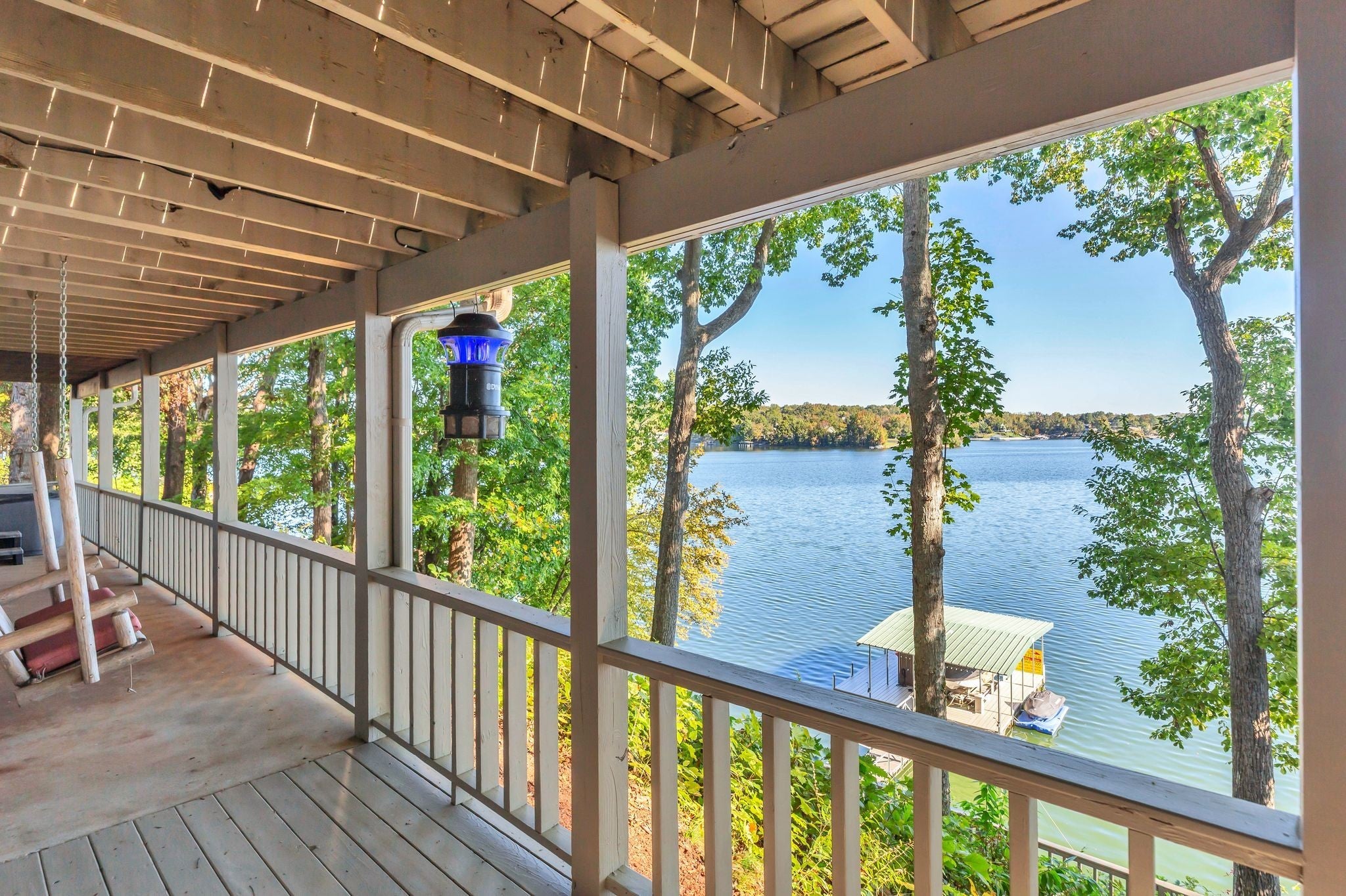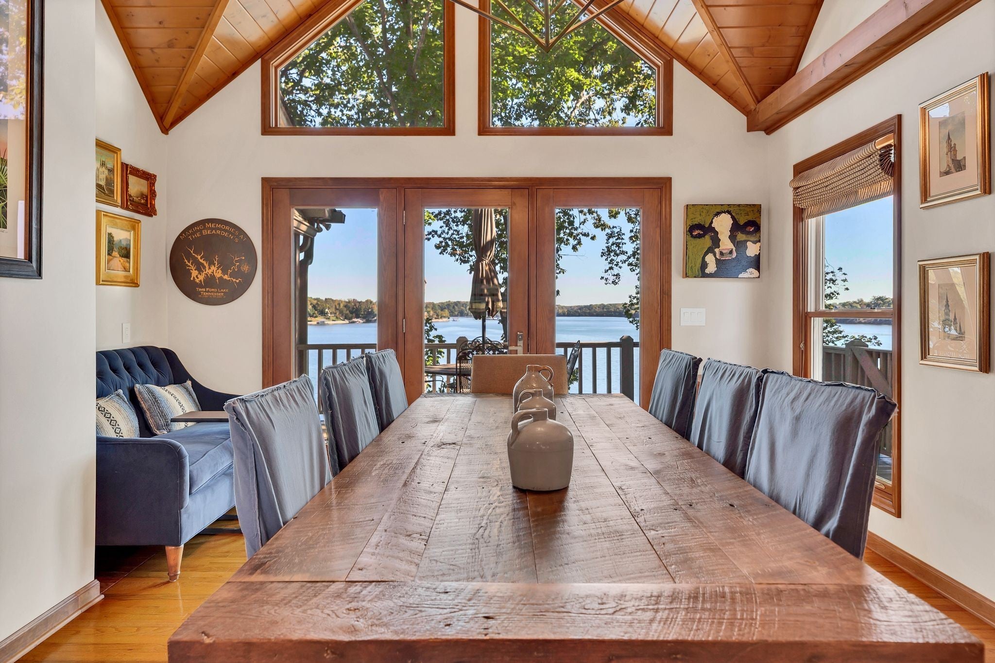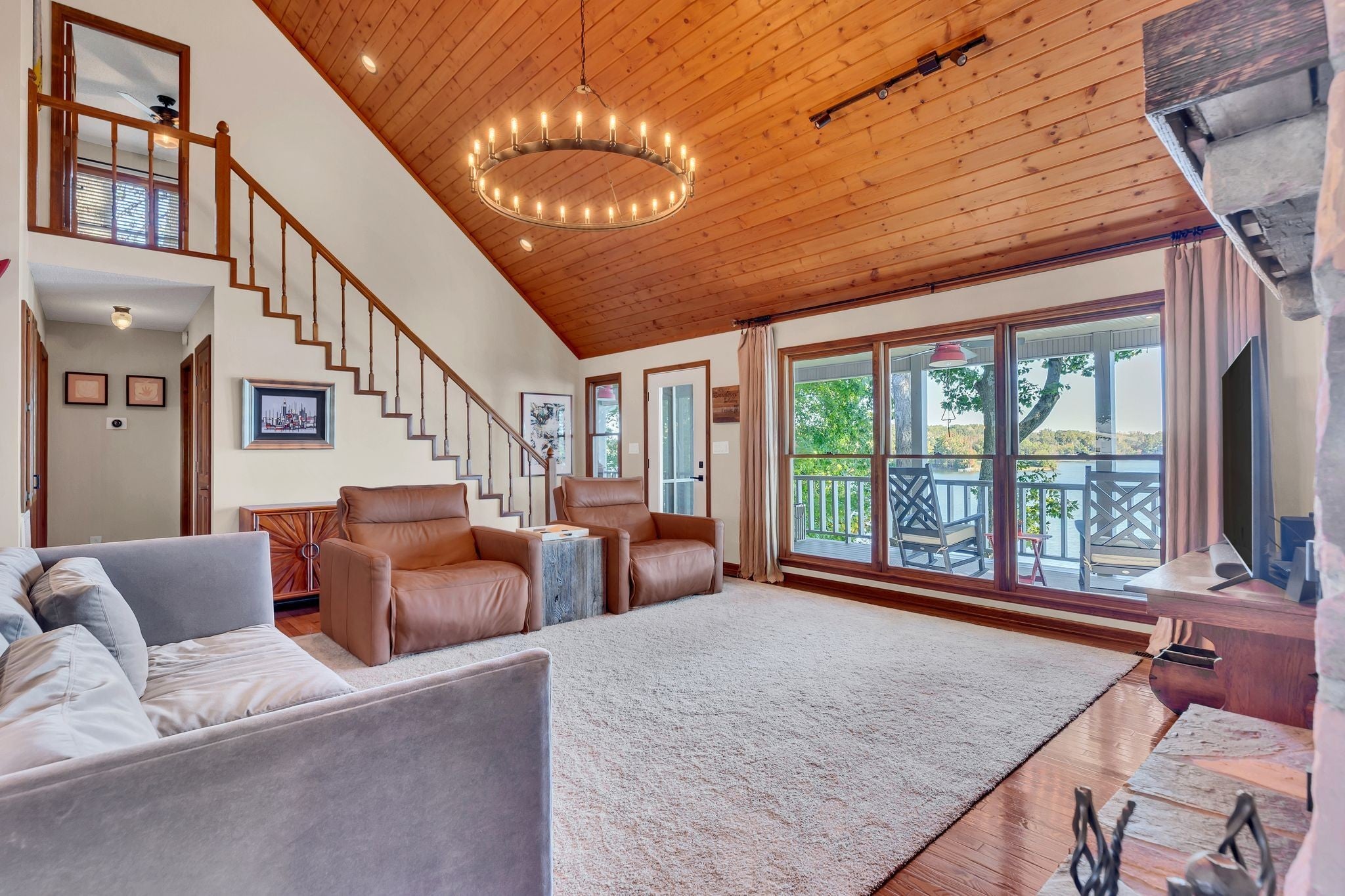 Beautiful home in Hopkins Point Sub. - Div. Lots of glass for breathtaking views of Tims Ford Lake. Year-round water, w/covered dock on property. This home offers stone entrance w/space for entertaining, top of the line appliances in kitchen w/lots of cabinet space. Wood, tile, carpet floors thru out the home. Living room w/wood burning fireplace, 4BR's/3BA's, 2 car-garage. Screen in back porch & deck for setting and enjoying the views. Downstairs a large rec room for entertaining/game room.